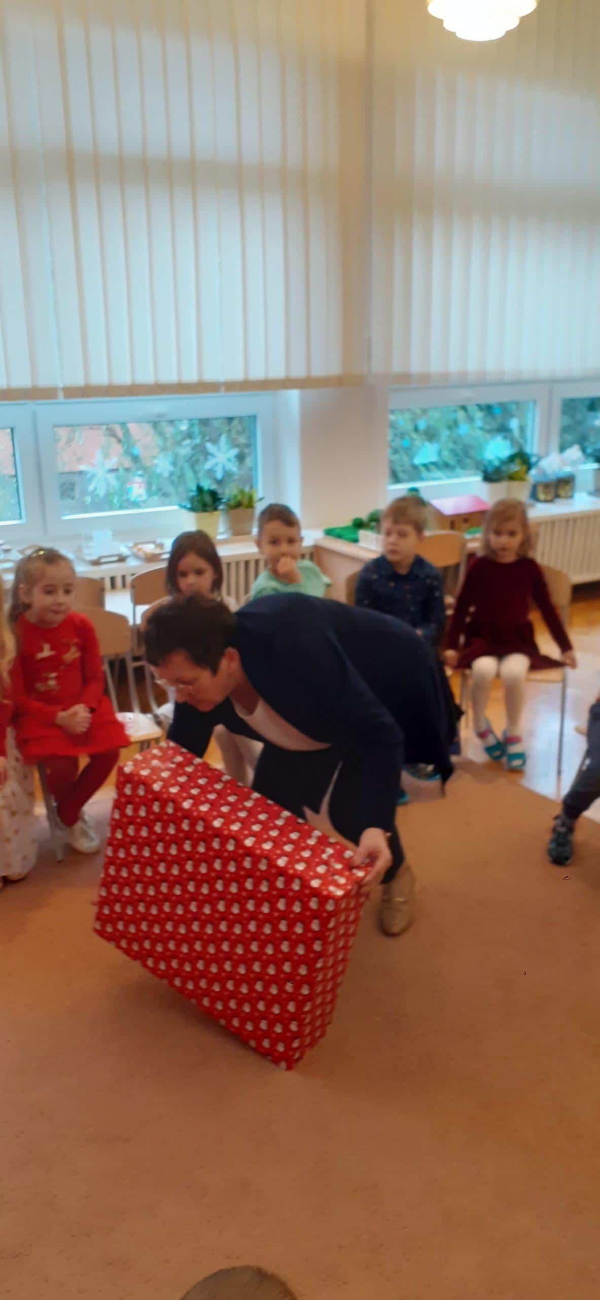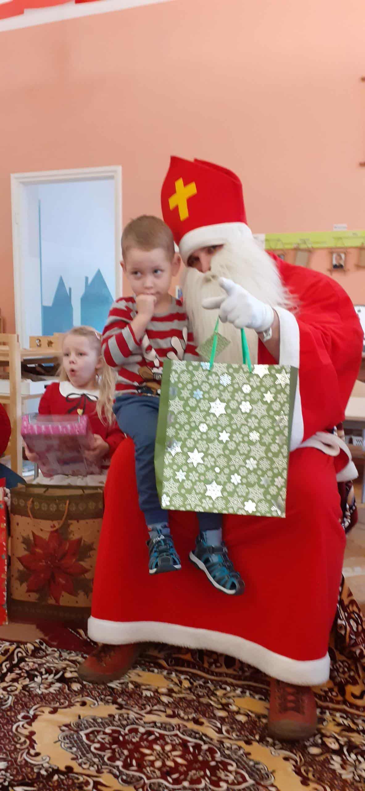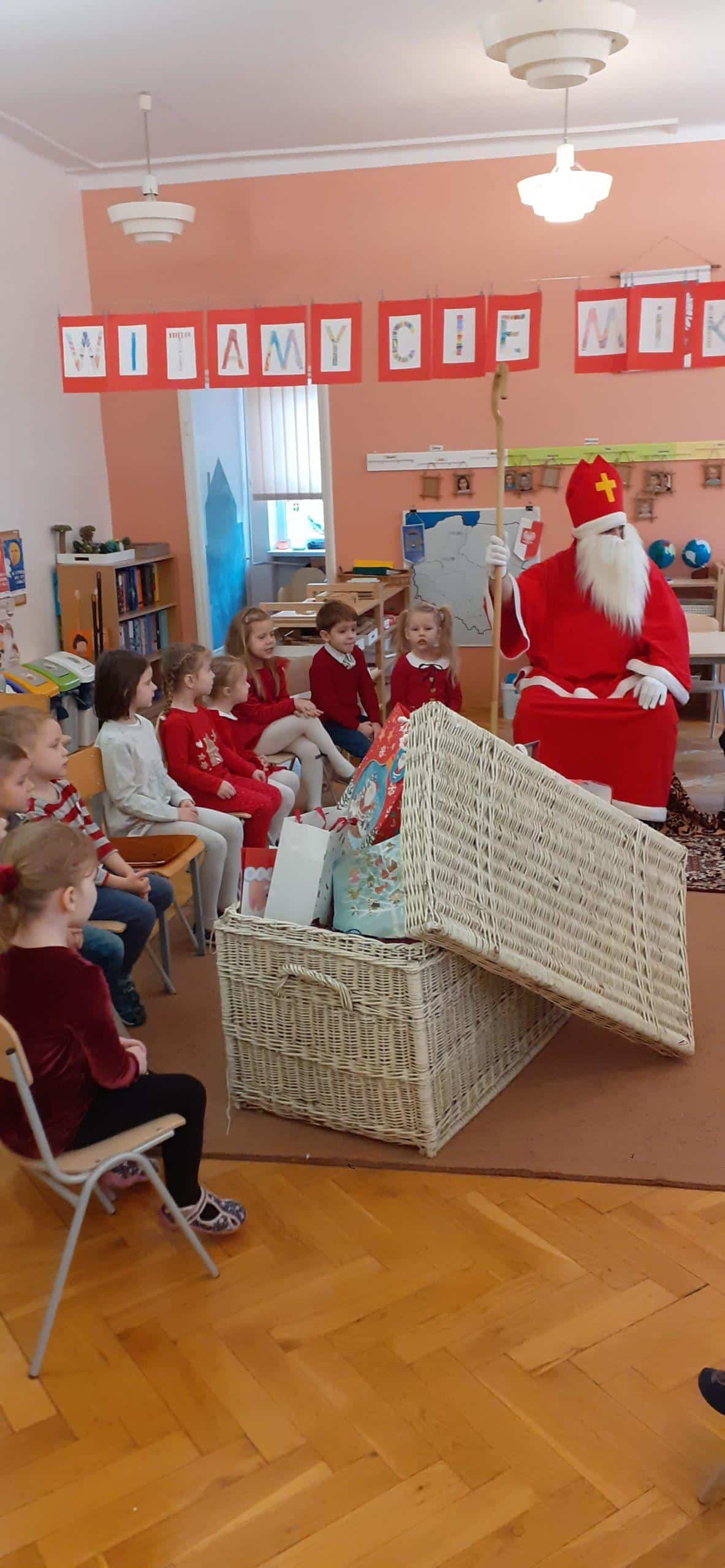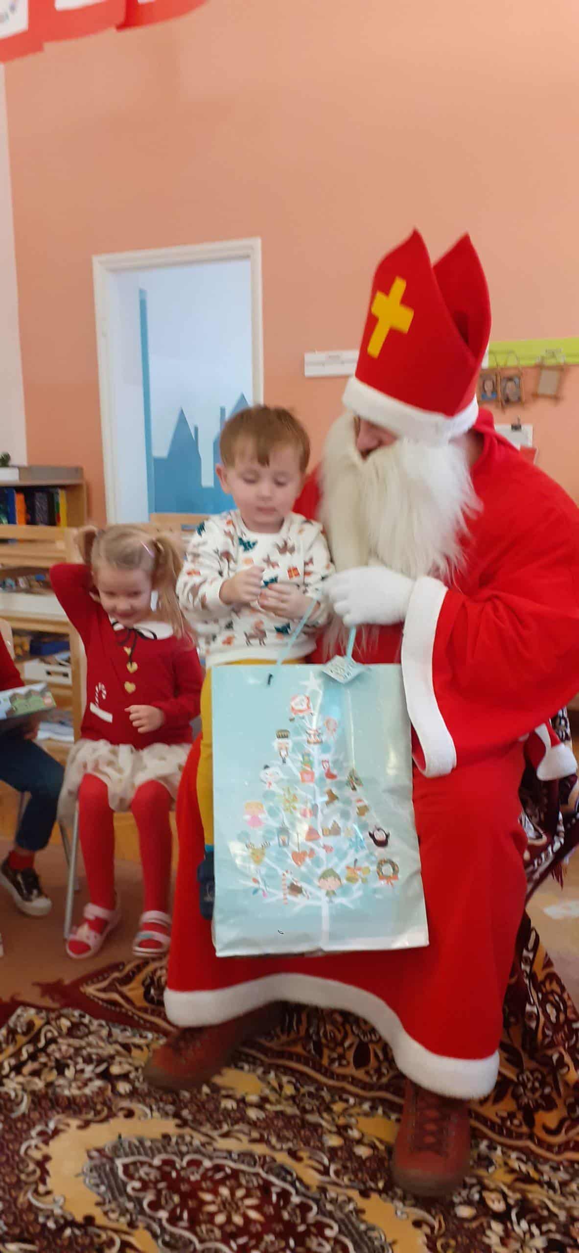 Od rana w całym przedszkolu ogromne poruszenie, wszyscy czekali na wizytę świętego Mikołaja. W odświętnych ubraniach dzieci oczywiście dominował kolor czerwony. Dzień wcześniej dzieci przygotowały piękny powitalny napis „Witamy Cię święty Mikołaju” oraz przygotowały wygodny tron. Zaraz po śniadaniu rozległ się dźwięk dzwoneczka- wszystkie dzieci zareagowały na niego bardzo emocjonalnie. Zaśpiewały powitalną piosenkę. Pojawienie się Mikołaja w sali zajęć zaparło dzieciom dech w piersiach, nastała chwilowa cisza, wszyscy przyglądali się jemu z uwagą. Wyglądał bardzo dostojnie i dość szybko nawiązał z dziećmi serdeczny kontakt. Każde dziecko otrzymało wymarzony prezent, wszyscy byli zachwyceni. Iga w imieniu całej grupy razem z babcią upiekła przepyszne pierniczki i obdarowała nimi nie tylko Mikołaja, ale także inne dzieci. To bardzo serdeczny gest. Na koniec wykonano pamiątkowe zdjęcia indywidualnie i grupowo. A po południu kolejna niespodzianka, wizyta pani Dyrektor i mikołajkowy prezent – ogromny zestaw klocków „Lego Coding Ekspress”do nauki kodowania. Dzieci również były zachwycone. To kolejny wspaniały dzień w naszym przedszkolu. Dziękujemy mamusi Łukasza- pani Milenie za pomoc w organizacji wizyty świętego Mikołaja. To było fantastyczne spotkanie.