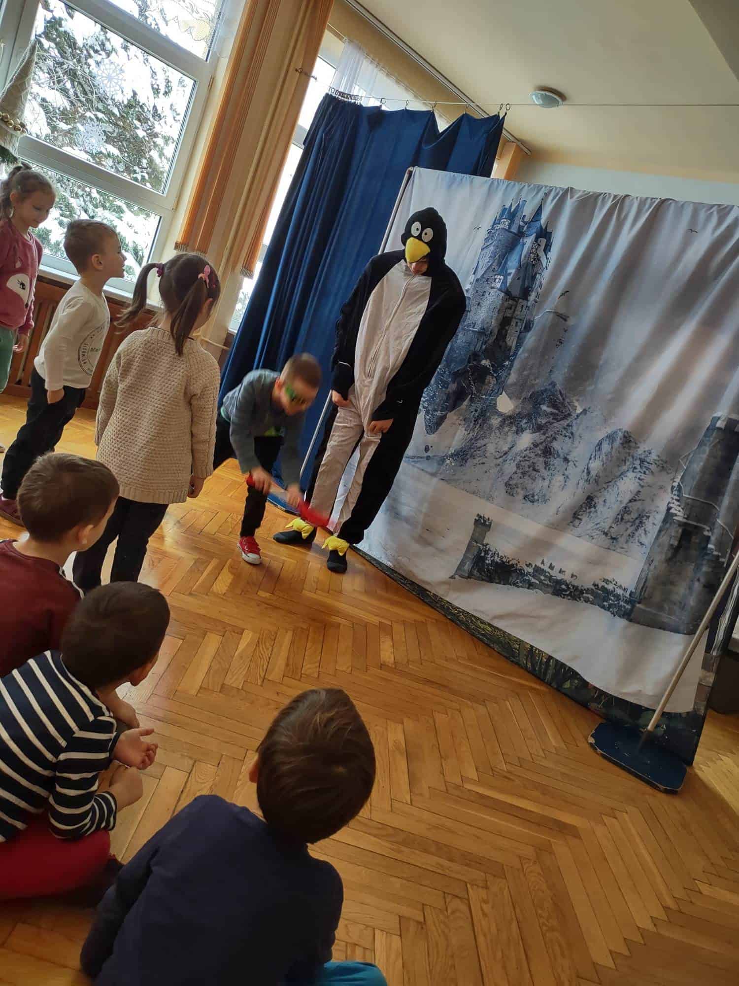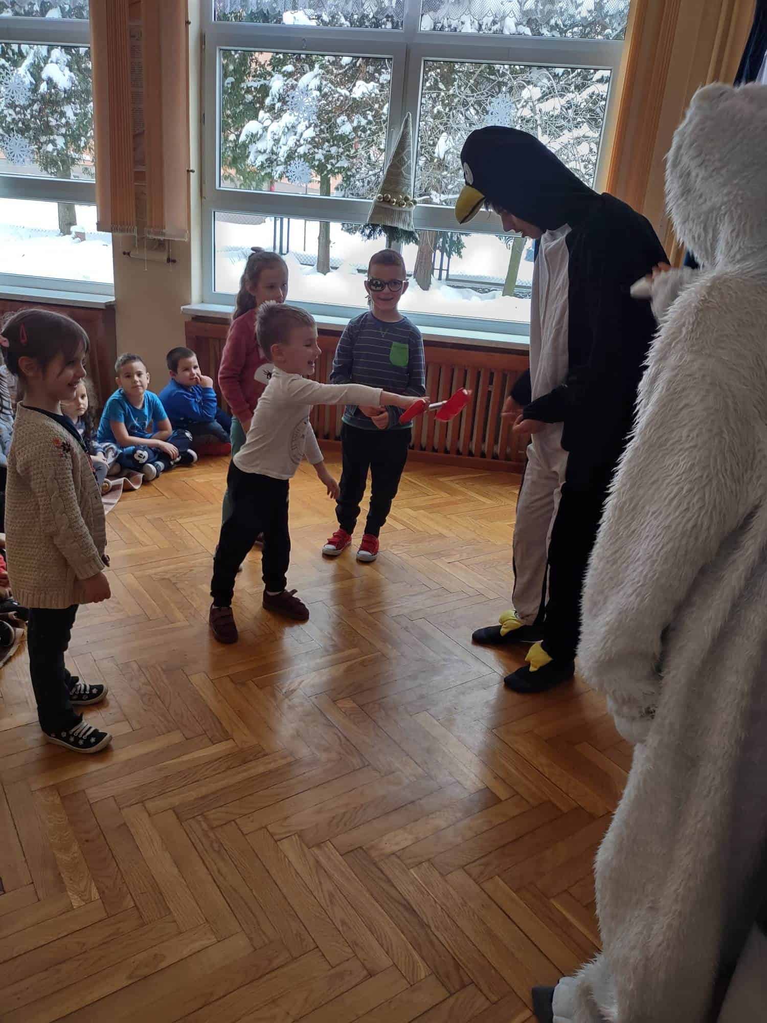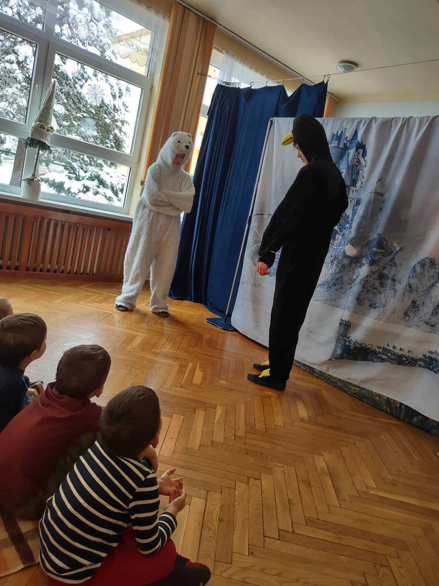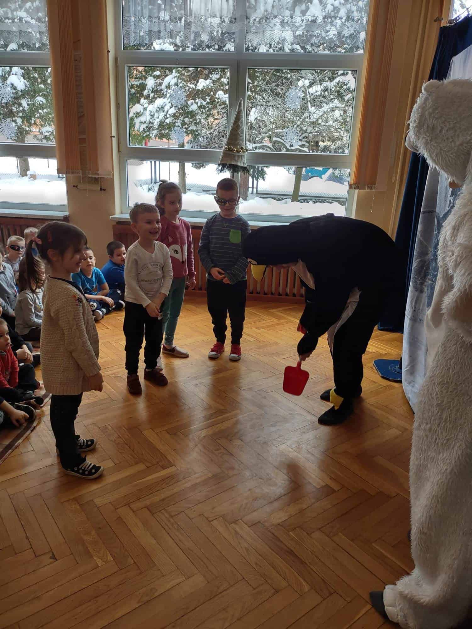 Dzisiaj do naszego przedszkola przyjechał Teatr “Krak-Art” z Krakowa ze spektaklem pt. „Zimowa opowieść”. Najwięcej uśmiechu i radości na twarzach dzieci wywołał Elf Chichotek, jeden z głównych bohaterów przedstawienia. Chichotek uwielbiał robić sobie z innych żarty. Mieszkańcy magicznej krainy ciągle na niego narzekali. Robił wszystkim psikusy, uważając to za doskonałą zabawę. Któregoś razu zabrał wróżce różdżkę i to był wybryk, po którym miarka psot Elfa Chichotka się przebrała. Za ten czyn Wróżka zamieniła go w śmiesznego, niezdarnego pingwina i wysyła do Lodowej Krainy. Tam rządziła Śnieżna Królowa, która niestety nie była zbyt miła i kazała wszystkim mieszkańcom ciężko pracować, żeby zbudować dla niej wielki pałac. Chichotek nie za dobrze radził sobie z tymi zadaniami, ale w tym wszystkim miał ogromne szczęście, bo w tych ciężkich i wymagających czynnościach pomagały mu nasze dzieci z widowni 🙂 W Lodowej Krainie poznaje też uwięzionego renifera, który bardzo tęskni za domem. Nasz bohater robi bardzo wiele dobrych rzeczy, by w ten sposób pomóc reniferowi.