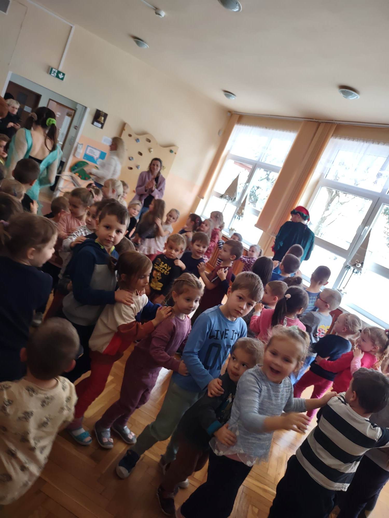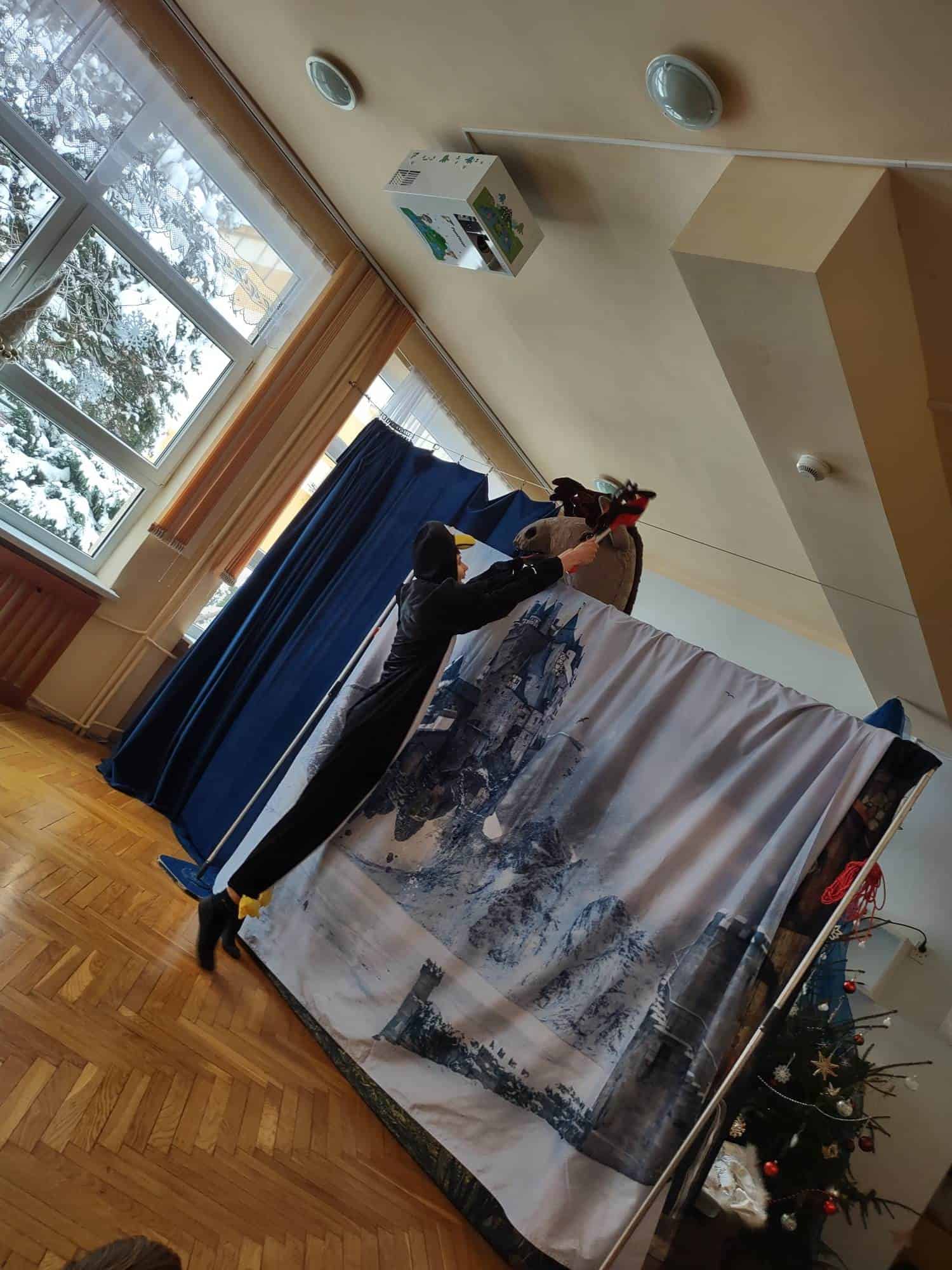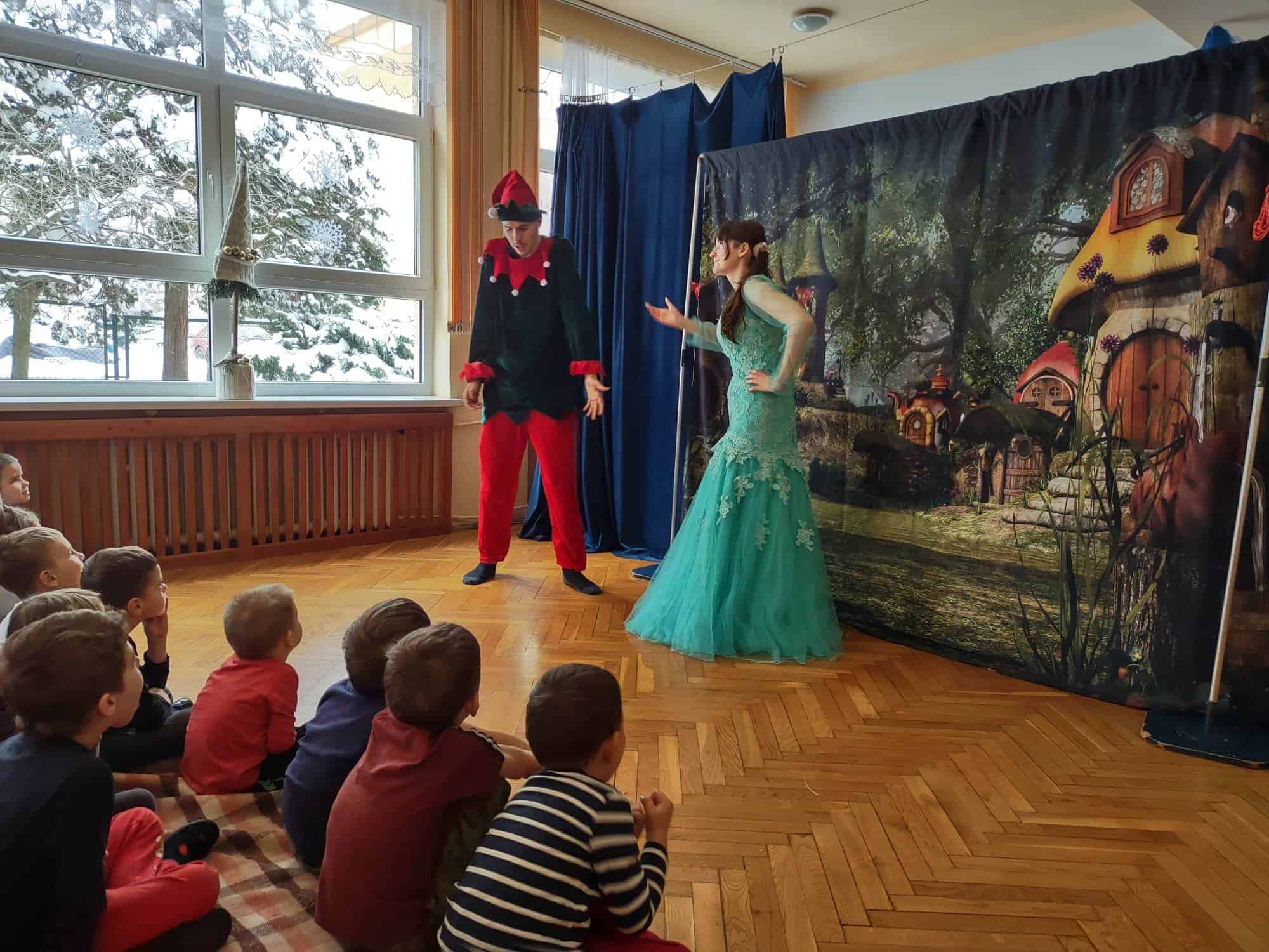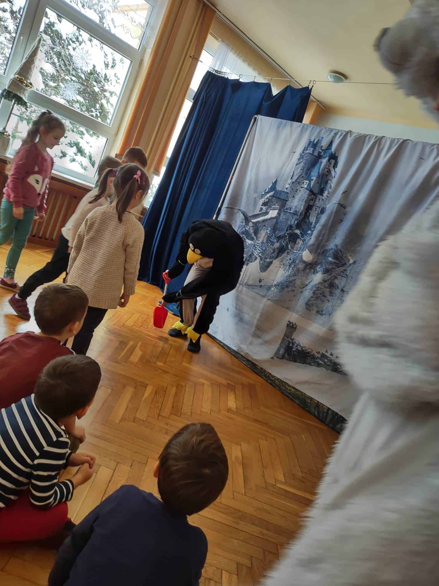 Dzisiaj do naszego przedszkola przyjechał Teatr “Krak-Art” z Krakowa ze spektaklem pt. „Zimowa opowieść”. Najwięcej uśmiechu i radości na twarzach dzieci wywołał Elf Chichotek, jeden z głównych bohaterów przedstawienia. Chichotek uwielbiał robić sobie z innych żarty. Mieszkańcy magicznej krainy ciągle na niego narzekali. Robił wszystkim psikusy, uważając to za doskonałą zabawę. Któregoś razu zabrał wróżce różdżkę i to był wybryk, po którym miarka psot Elfa Chichotka się przebrała. Za ten czyn Wróżka zamieniła go w śmiesznego, niezdarnego pingwina i wysyła do Lodowej Krainy. Tam rządziła Śnieżna Królowa, która niestety nie była zbyt miła i kazała wszystkim mieszkańcom ciężko pracować, żeby zbudować dla niej wielki pałac. Chichotek nie za dobrze radził sobie z tymi zadaniami, ale w tym wszystkim miał ogromne szczęście, bo w tych ciężkich i wymagających czynnościach pomagały mu nasze dzieci z widowni 🙂 W Lodowej Krainie poznaje też uwięzionego renifera, który bardzo tęskni za domem. Nasz bohater robi bardzo wiele dobrych rzeczy, by w ten sposób pomóc reniferowi.