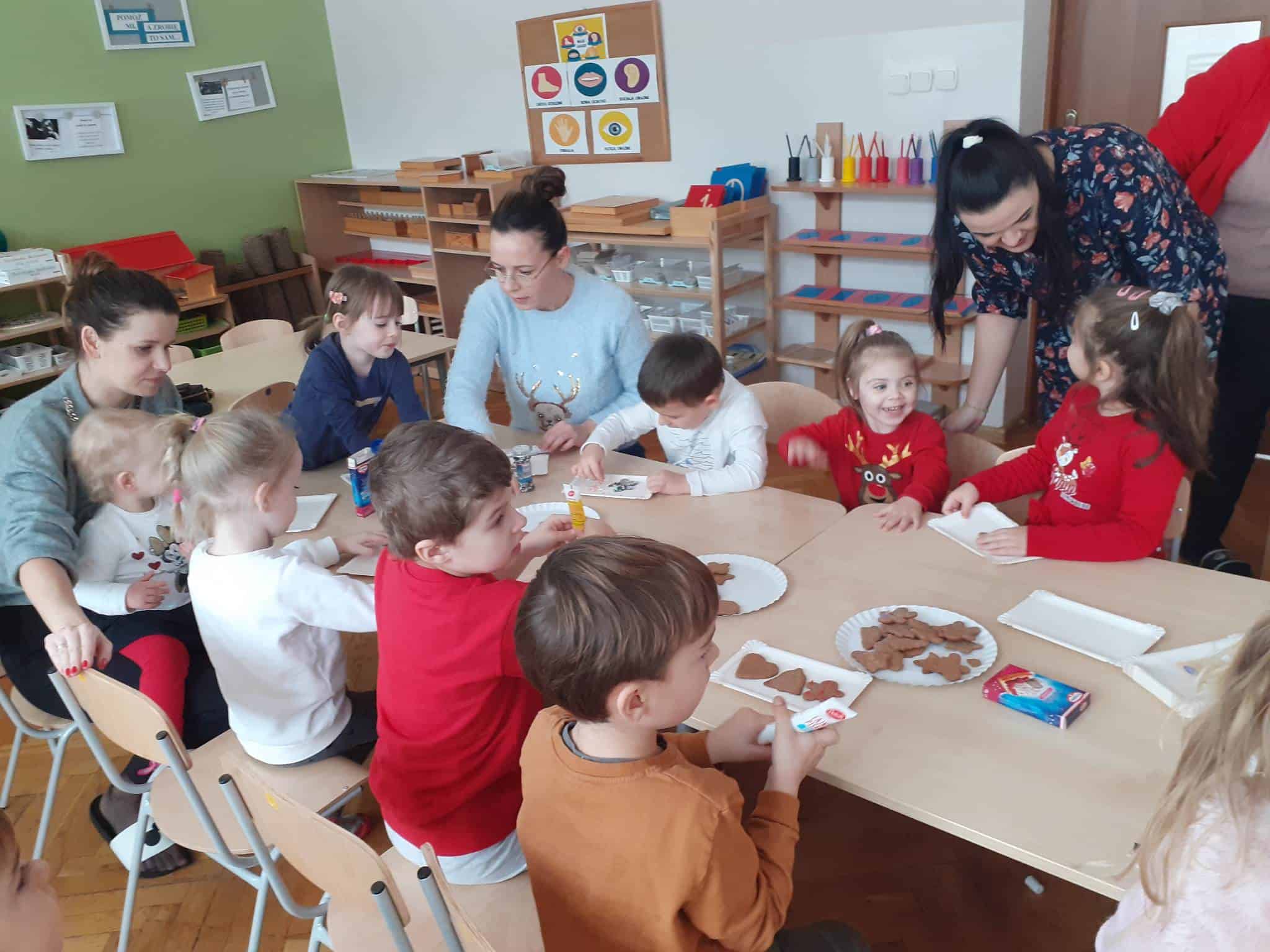 13 grudnia odwiedziły nas Mamusie Mii, Laury, Kubusia i Oli, dzięki którym dzieci mogły osobiście doświadczać świątecznych przygotowań, podczas dekorowania pierniczków. Było radośnie i miło, a rąk do pracy nie brakowało, gdyż do grona świątecznych pomocników dołączyły także siostrzyczka Oli, Mii i Laury 🙂 Przy dźwiękach kolęd zaczęliśmy swoje działania. Na stołach pojawił się kolorowy lukier, różnobarwne posypki, rysiki dekoracyjne oraz pisaki cukrowe, które pomogły nam w samodzielnym dekorowaniu pierników. Każdy wyglądał inaczej, był wyjątkowy i niepowtarzalny.