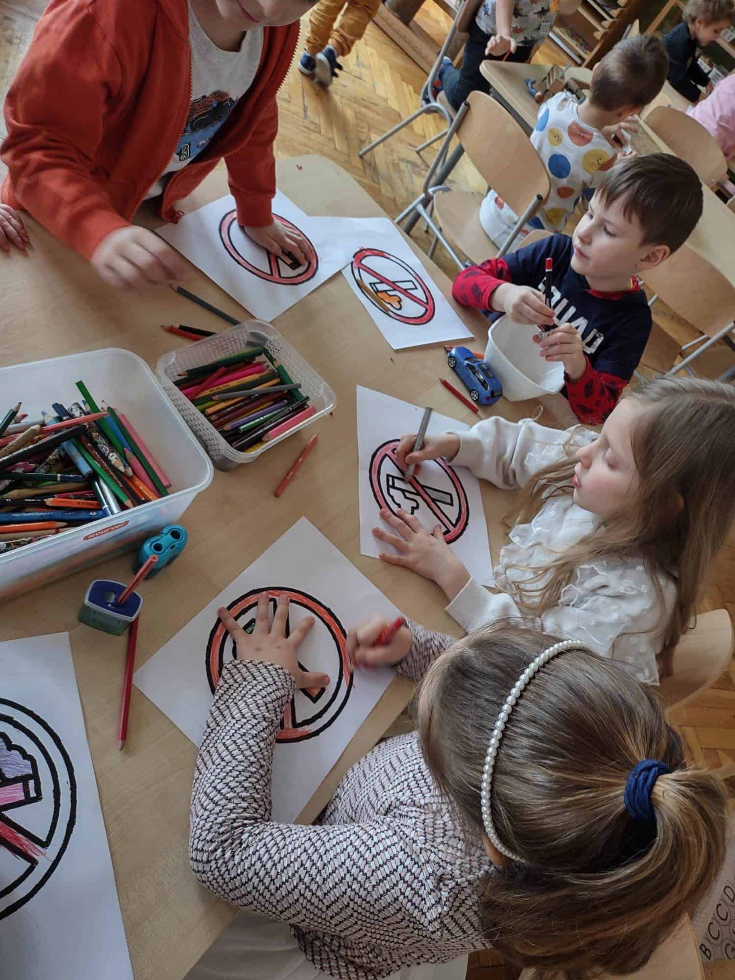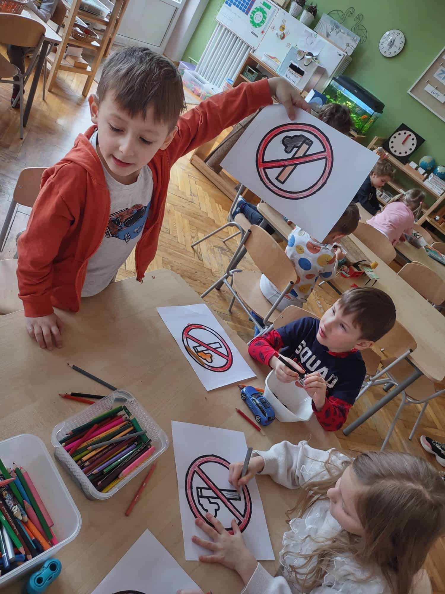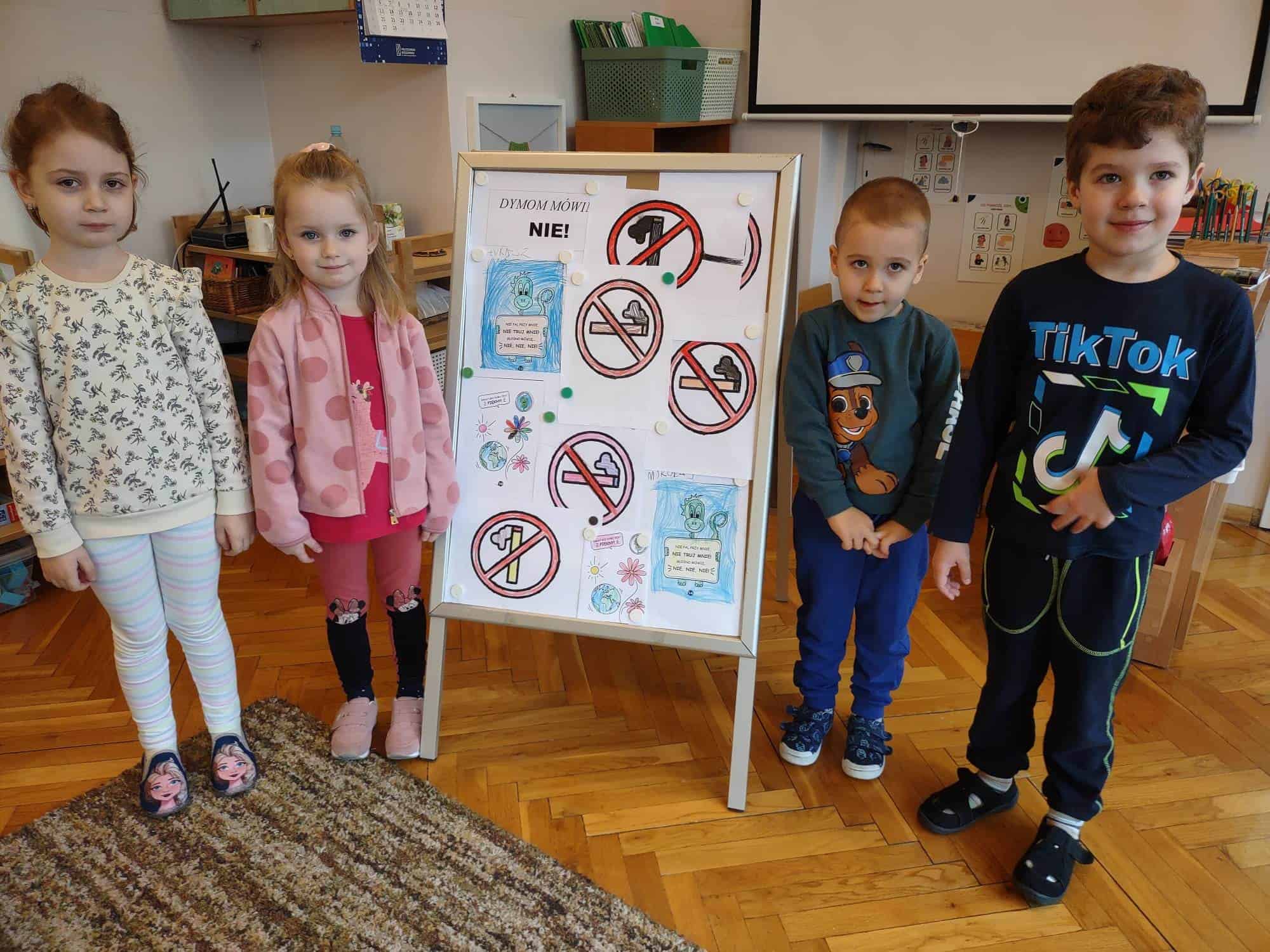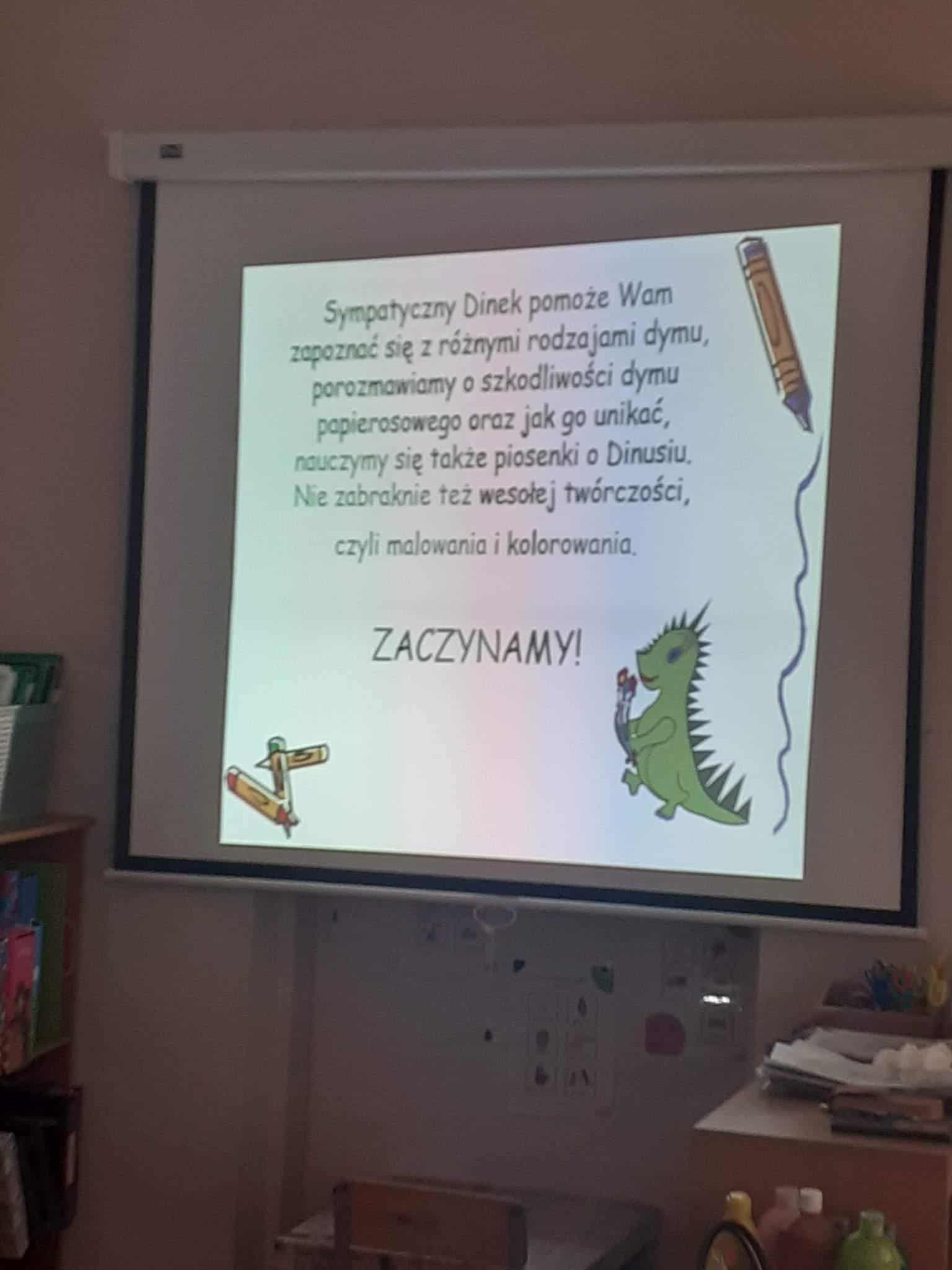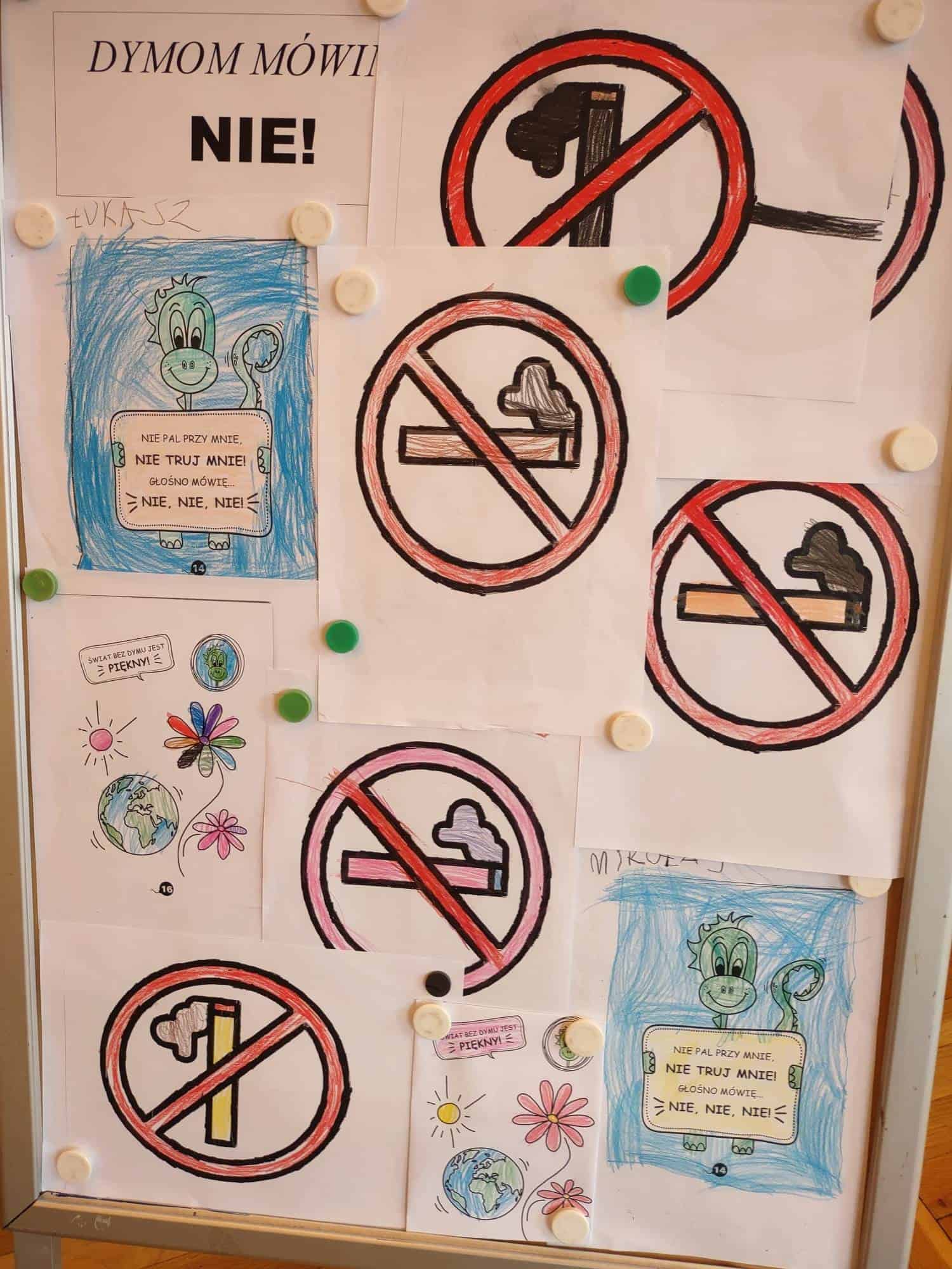 Poszczególne zajęcia, rozłożone na kilka dni, były skoncentrowane na pobudzeniu różnych form aktywności dzieci. Nasze przedszkolaki wykonywały odpowiednie rysunki na temat szkodliwości dymu papierosowego, były również ćwiczenia oddechowe i relaksacyjne przy akompaniamencie muzycznym, uświadamiające, iż oddychanie świeżym powietrzem jest zdrowe. Na zakończenie działań dzieci projektowały własne znaczki zakazu mówiące o szkodliwości palenia tytoniu. Zajęciom towarzyszyła sylwetka dinozaura „Dinusia”, która pomagała dzieciom w rozwiązywaniu stawianych zadań, uczyła współdziałania w zespole i odpowiedzialności za wykonanie wspólnych prac.