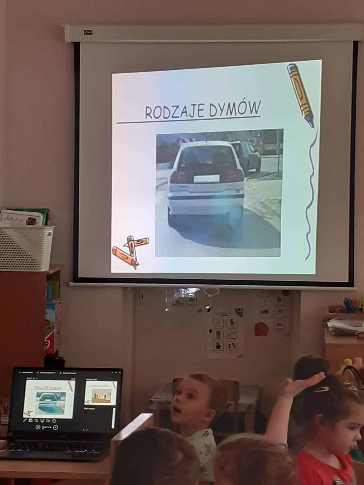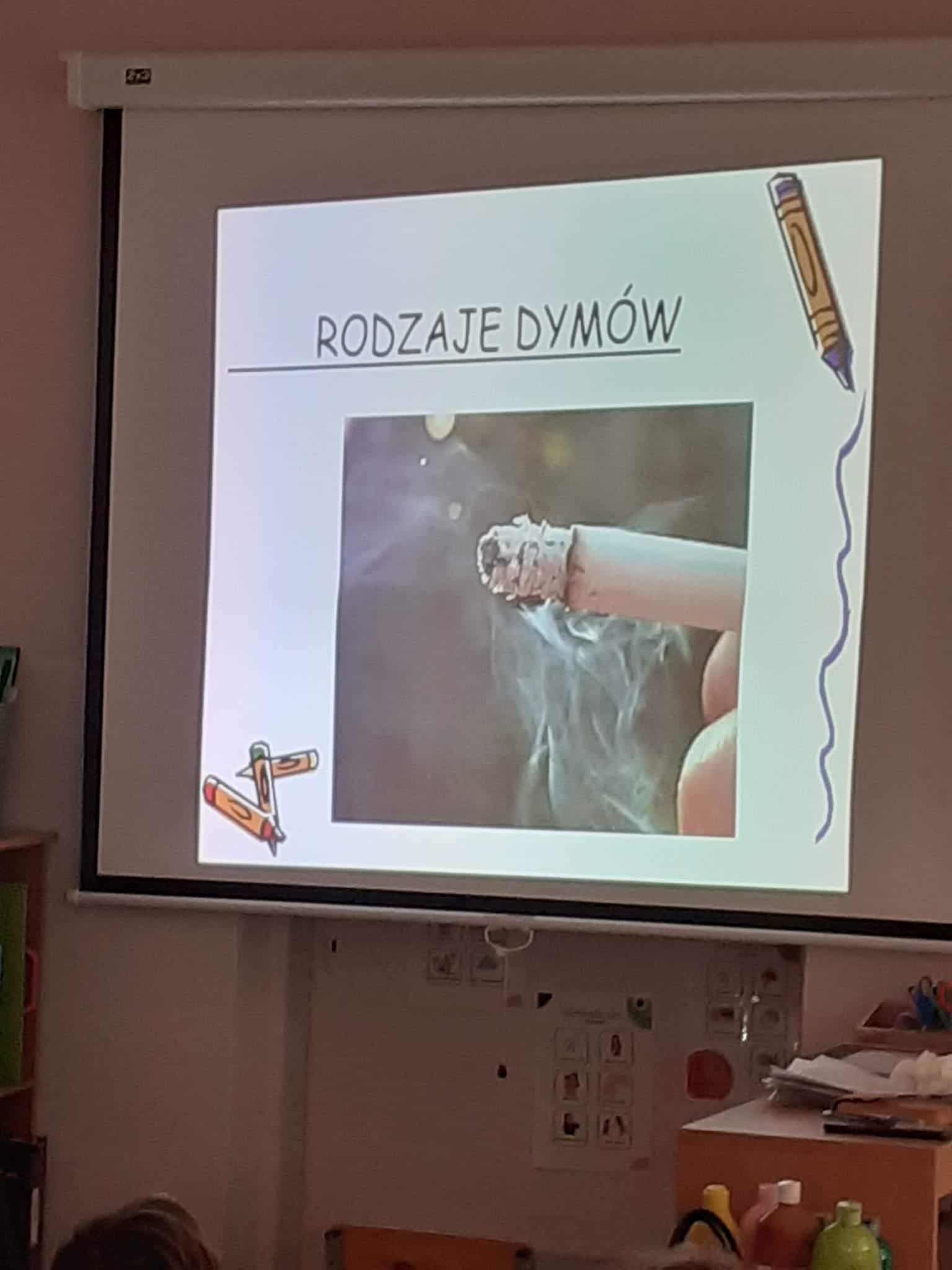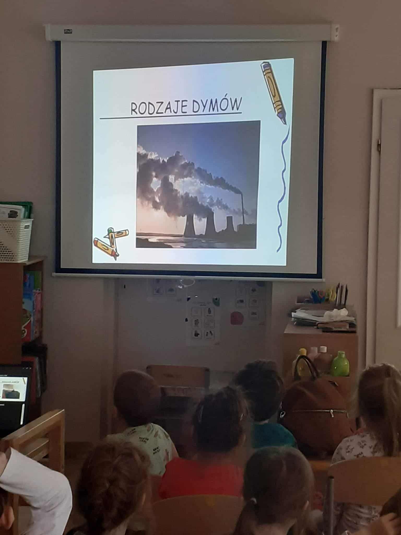 Zajęcia realizowane w naszej grupie miały charakter warsztatowy. Przy pomocy prezentacji multimedialnej mogliśmy, krok po kroku, nabywać wiadomości na temat źródeł dymu, ich szkodliwości i zagrożeń jakie niosą ze sobą (zanieczyszczenia, choroby itp.). Dzieci z chęcią odnosiły się do prezentowanych treści, podając różnorodne przykłady ze swojego najbliższego otoczenia. Wspólnie zastanawialiśmy się jak przeciwdziałać szkodliwości dymów. Dzieci i na tym polu wykazały się dużą dojrzałością i wiedzą. Chciały zamienić samochód na rower lub spacer i codziennie tłumaczyć dorosłym, jak szkodliwe i niebezpieczne dla nich i dla najbliższego otoczenia jest palenie papierosów.