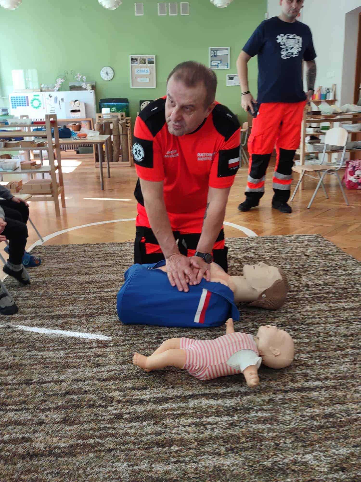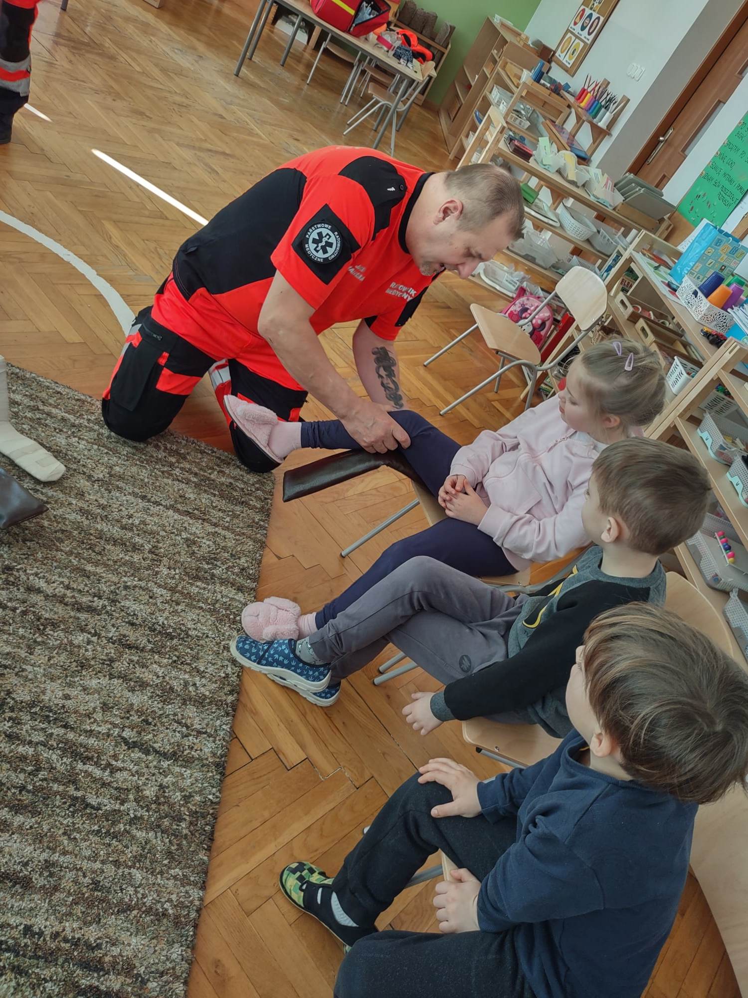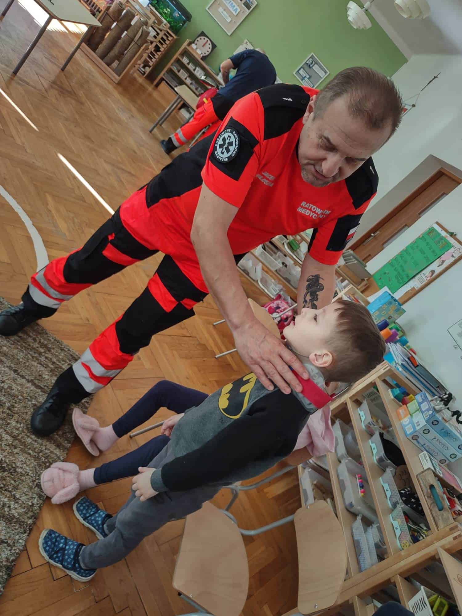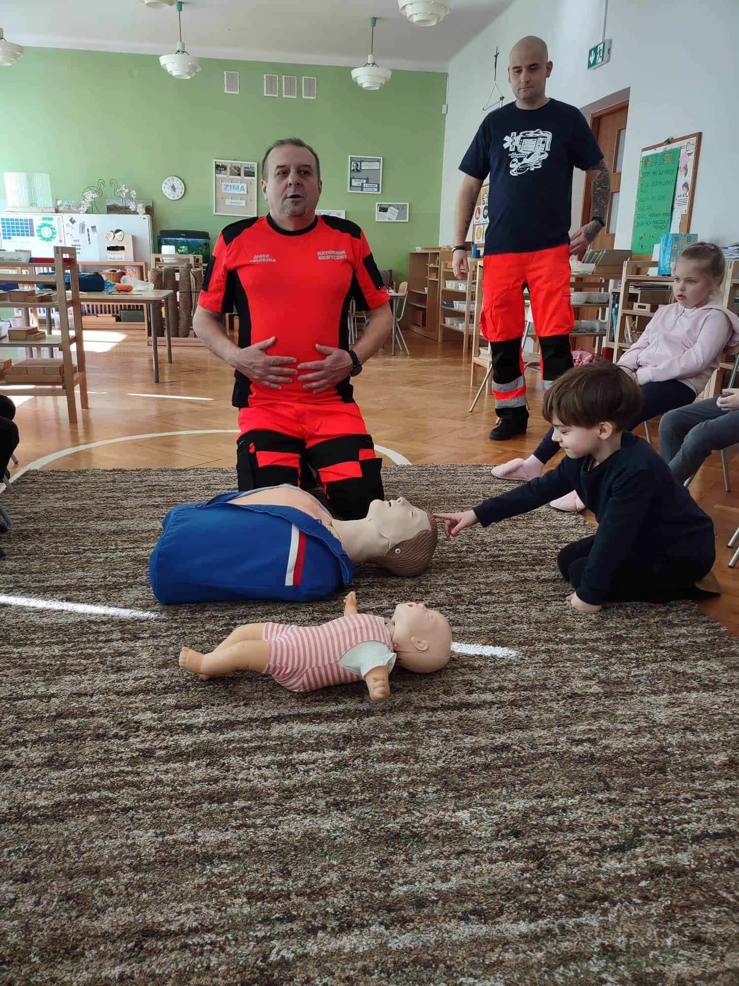 To było nie tylko bardzo miłe, ale przede wszystkim bardzo ważne spotkanie! Dzieci zostały przeszkolone z zakresu wykonywania prostych czynności udzielania pierwszej pomocy oraz prawidłowego zachowania się w czasie wypadku lub w innych sytuacjach zagrożenia życia i zdrowia. Panowie pokazali dzieciom jak wygląda strój ratownika – wytłumaczyli dlaczego ma on właśnie pomarańczowy kolor, wyjaśnili nam również na czym polega ich praca oraz czym zajmują się poszczególne służby ratunkowe. Następnie przedszkolaki miały okazję wysłuchać informacji na temat udzielania pierwszej pomocy w przypadku zadławienia lub zatrzymaniu akcji serca. Dzieci uczyły się jak należy sprawdzać przytomność osoby poszkodowanej. Ważną rzeczą było także utrwalenie sobie numerów alarmowych służb ratowniczych oraz zasad bezpiecznej zabawy. Dzieci dowiedziały się także w jaki sposób rozmawiać przez telefon z dyspozytorem oraz jak można udzielić komuś pierwszej pomocy, zanim przyjedzie pogotowie ratunkowe. Zdobyta wiedza i ćwiczenia praktyczne sprawiły, że poczuliśmy się „małymi ratownikami”, bo właśnie takie znaczki na koniec otrzymaliśmy od Pana Patryka 🙂