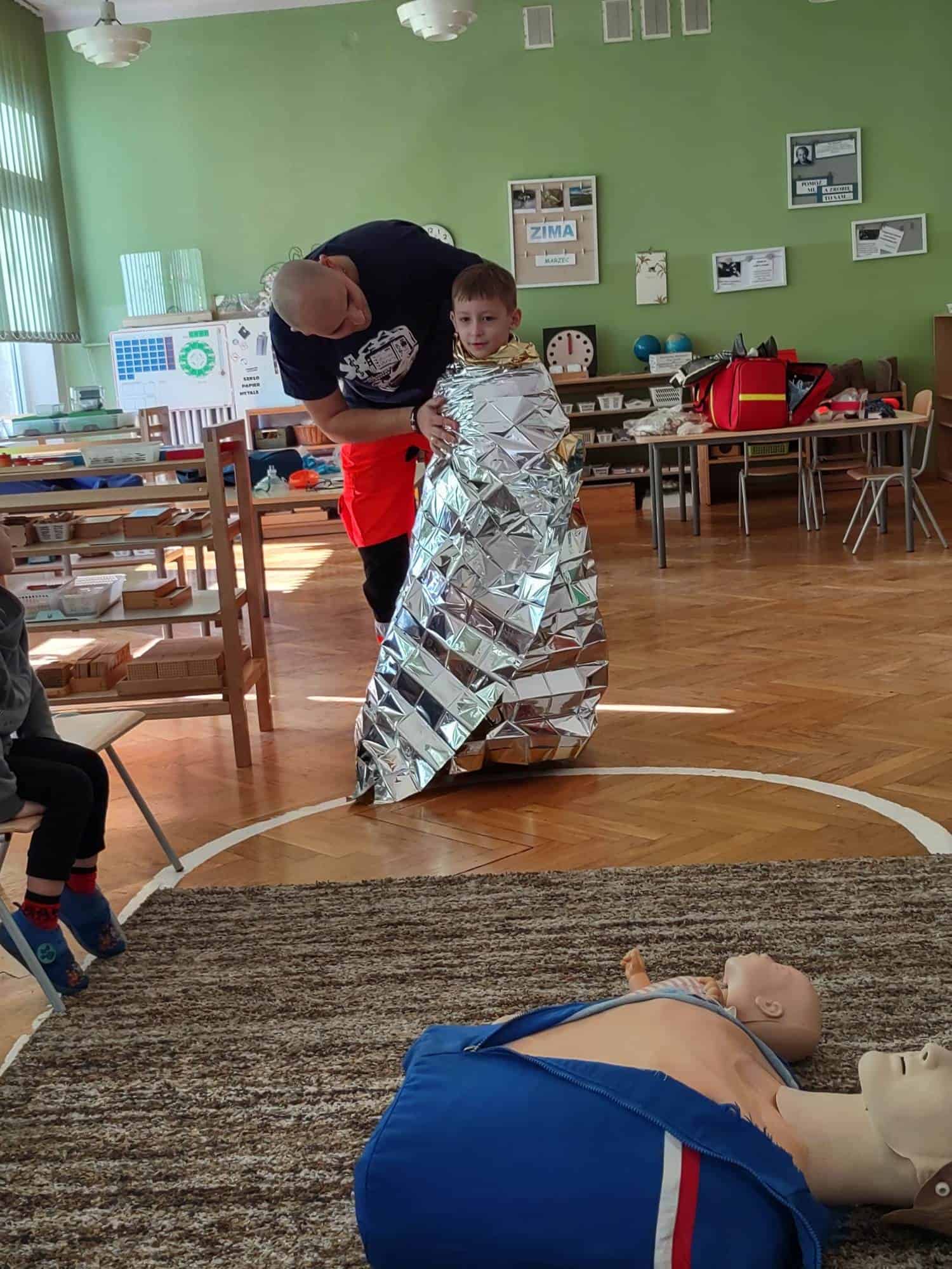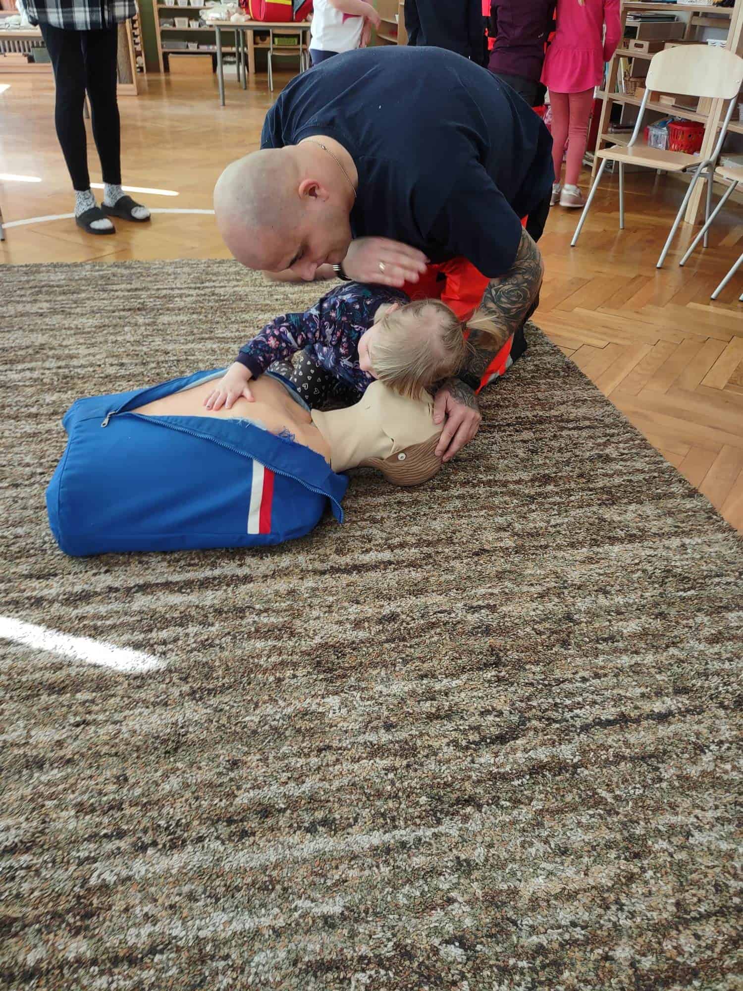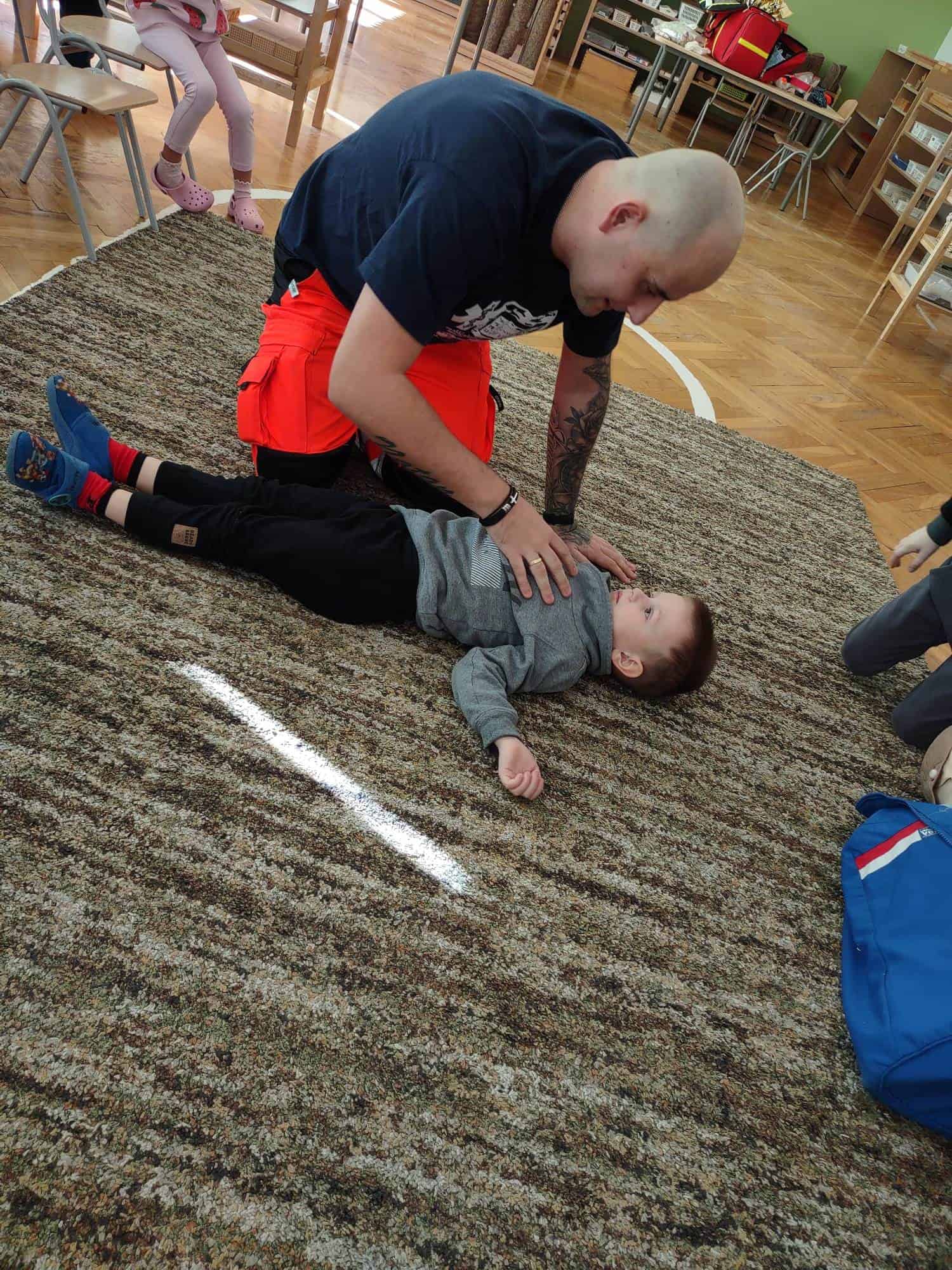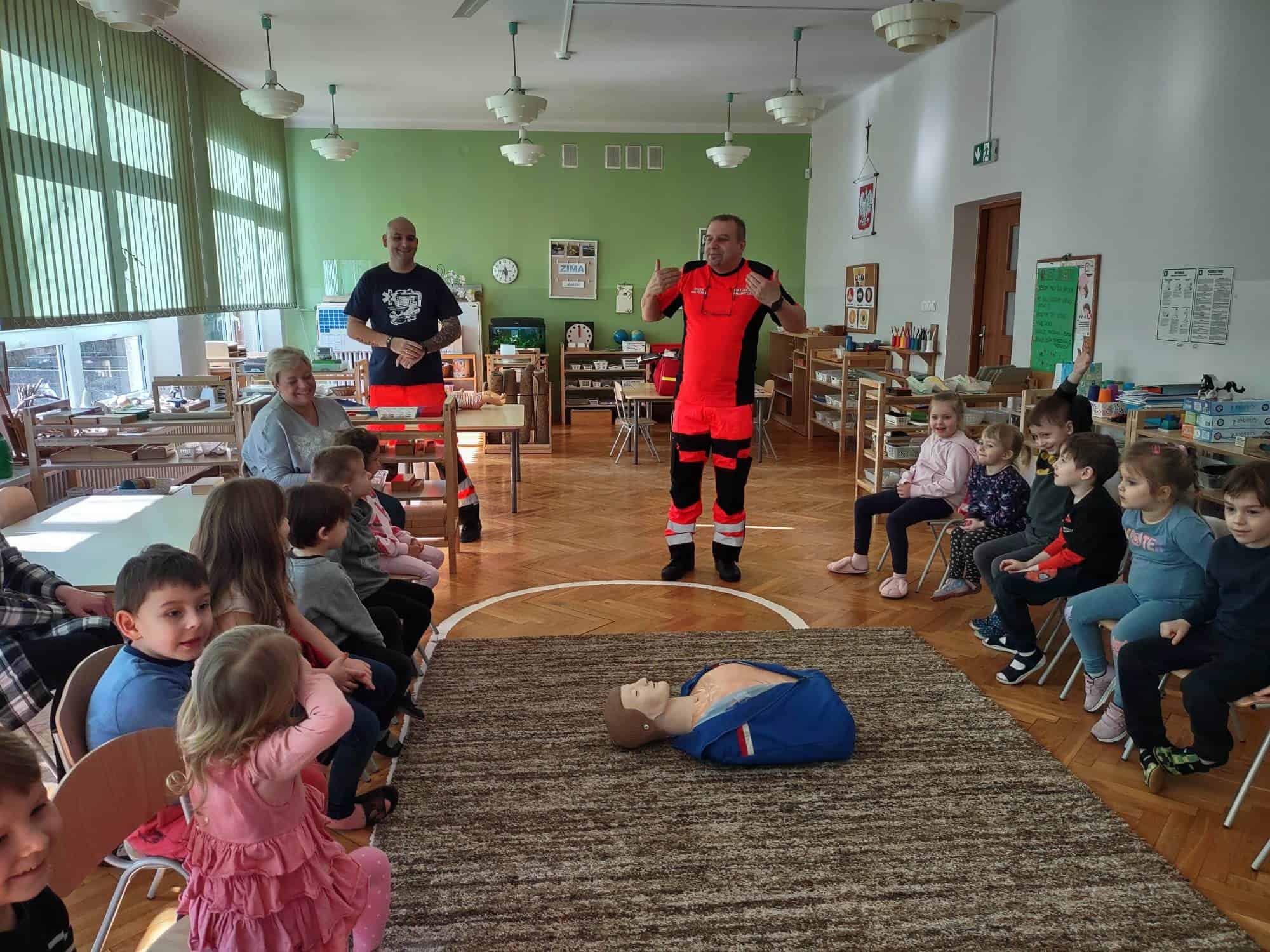 To było nie tylko bardzo miłe, ale przede wszystkim bardzo ważne spotkanie! Dzieci zostały przeszkolone z zakresu wykonywania prostych czynności udzielania pierwszej pomocy oraz prawidłowego zachowania się w czasie wypadku lub w innych sytuacjach zagrożenia życia i zdrowia. Panowie pokazali dzieciom jak wygląda strój ratownika – wytłumaczyli dlaczego ma on właśnie pomarańczowy kolor, wyjaśnili nam również na czym polega ich praca oraz czym zajmują się poszczególne służby ratunkowe. Następnie przedszkolaki miały okazję wysłuchać informacji na temat udzielania pierwszej pomocy w przypadku zadławienia lub zatrzymaniu akcji serca. Dzieci uczyły się jak należy sprawdzać przytomność osoby poszkodowanej. Ważną rzeczą było także utrwalenie sobie numerów alarmowych służb ratowniczych oraz zasad bezpiecznej zabawy. Dzieci dowiedziały się także w jaki sposób rozmawiać przez telefon z dyspozytorem oraz jak można udzielić komuś pierwszej pomocy, zanim przyjedzie pogotowie ratunkowe. Zdobyta wiedza i ćwiczenia praktyczne sprawiły, że poczuliśmy się „małymi ratownikami”, bo właśnie takie znaczki na koniec otrzymaliśmy od Pana Patryka 🙂