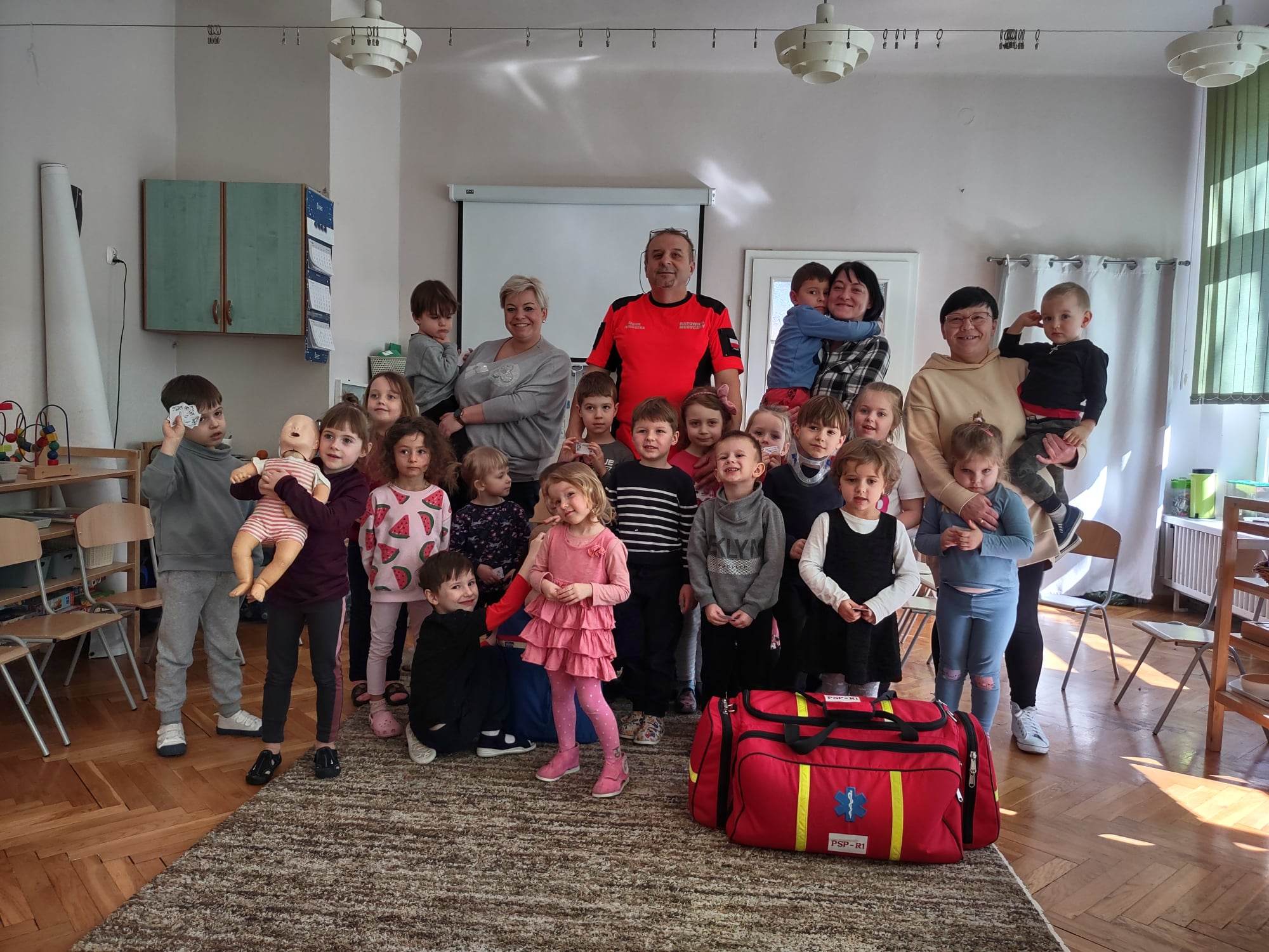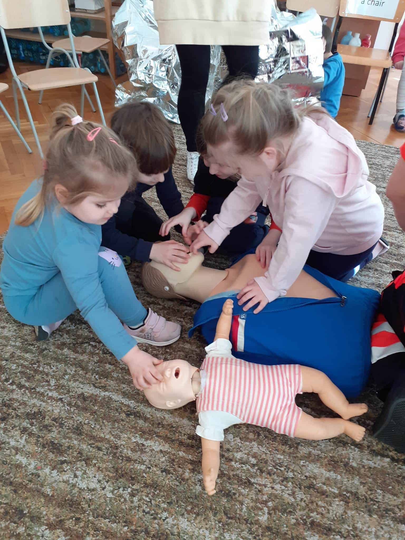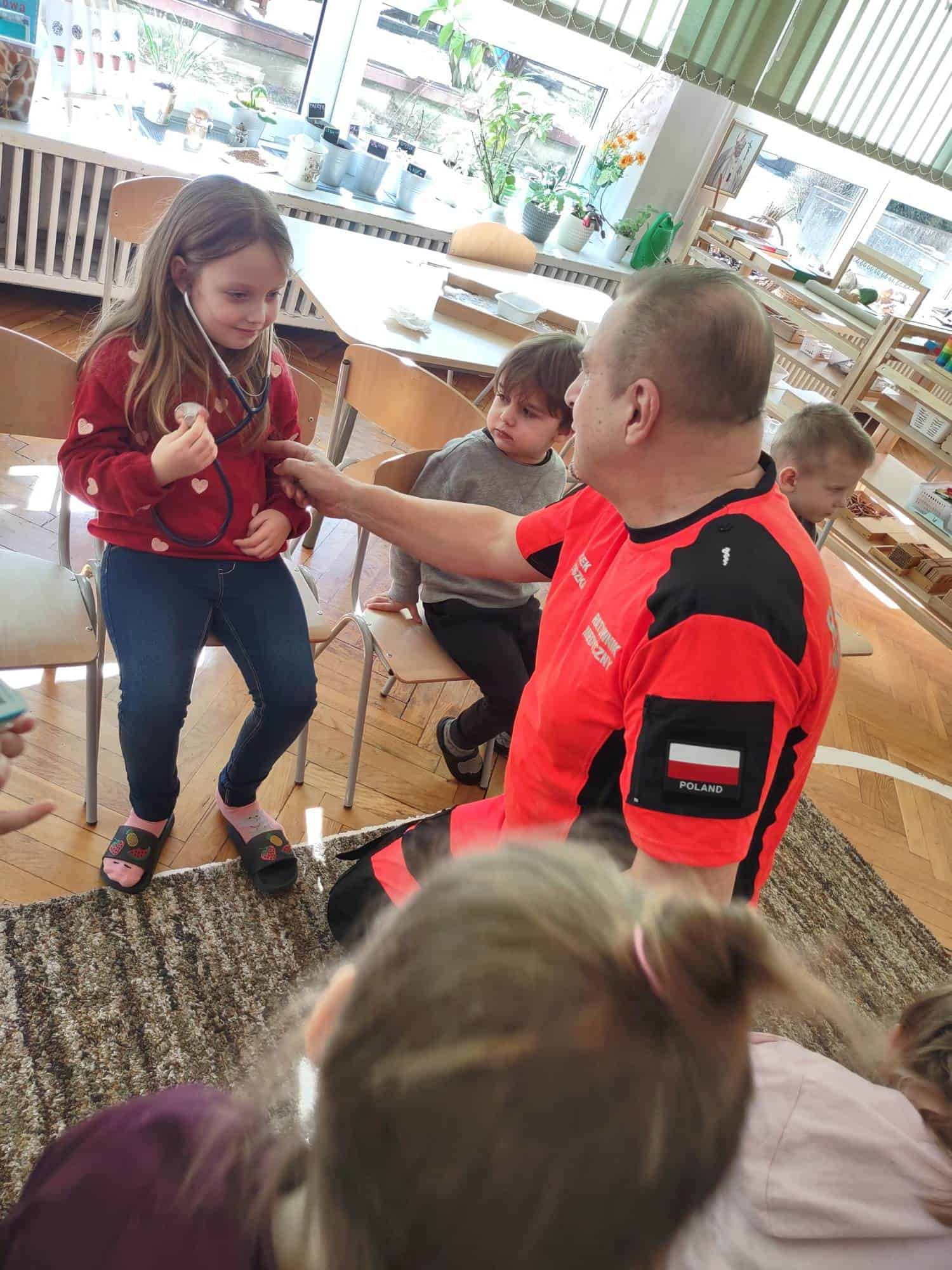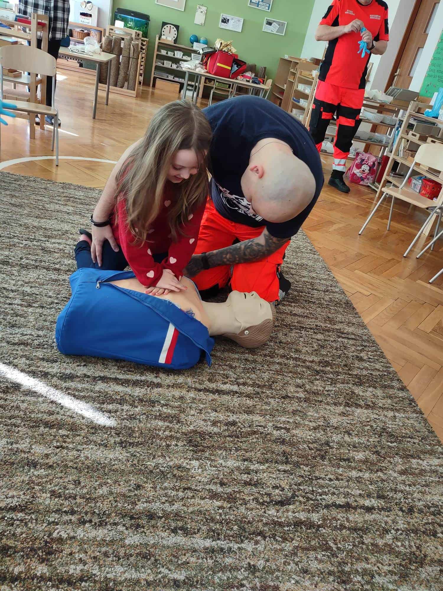 To było nie tylko bardzo miłe, ale przede wszystkim bardzo ważne spotkanie! Dzieci zostały przeszkolone z zakresu wykonywania prostych czynności udzielania pierwszej pomocy oraz prawidłowego zachowania się w czasie wypadku lub w innych sytuacjach zagrożenia życia i zdrowia. Panowie pokazali dzieciom jak wygląda strój ratownika – wytłumaczyli dlaczego ma on właśnie pomarańczowy kolor, wyjaśnili nam również na czym polega ich praca oraz czym zajmują się poszczególne służby ratunkowe. Następnie przedszkolaki miały okazję wysłuchać informacji na temat udzielania pierwszej pomocy w przypadku zadławienia lub zatrzymaniu akcji serca. Dzieci uczyły się jak należy sprawdzać przytomność osoby poszkodowanej. Ważną rzeczą było także utrwalenie sobie numerów alarmowych służb ratowniczych oraz zasad bezpiecznej zabawy. Dzieci dowiedziały się także w jaki sposób rozmawiać przez telefon z dyspozytorem oraz jak można udzielić komuś pierwszej pomocy, zanim przyjedzie pogotowie ratunkowe. Zdobyta wiedza i ćwiczenia praktyczne sprawiły, że poczuliśmy się „małymi ratownikami”, bo właśnie takie znaczki na koniec otrzymaliśmy od Pana Patryka 🙂