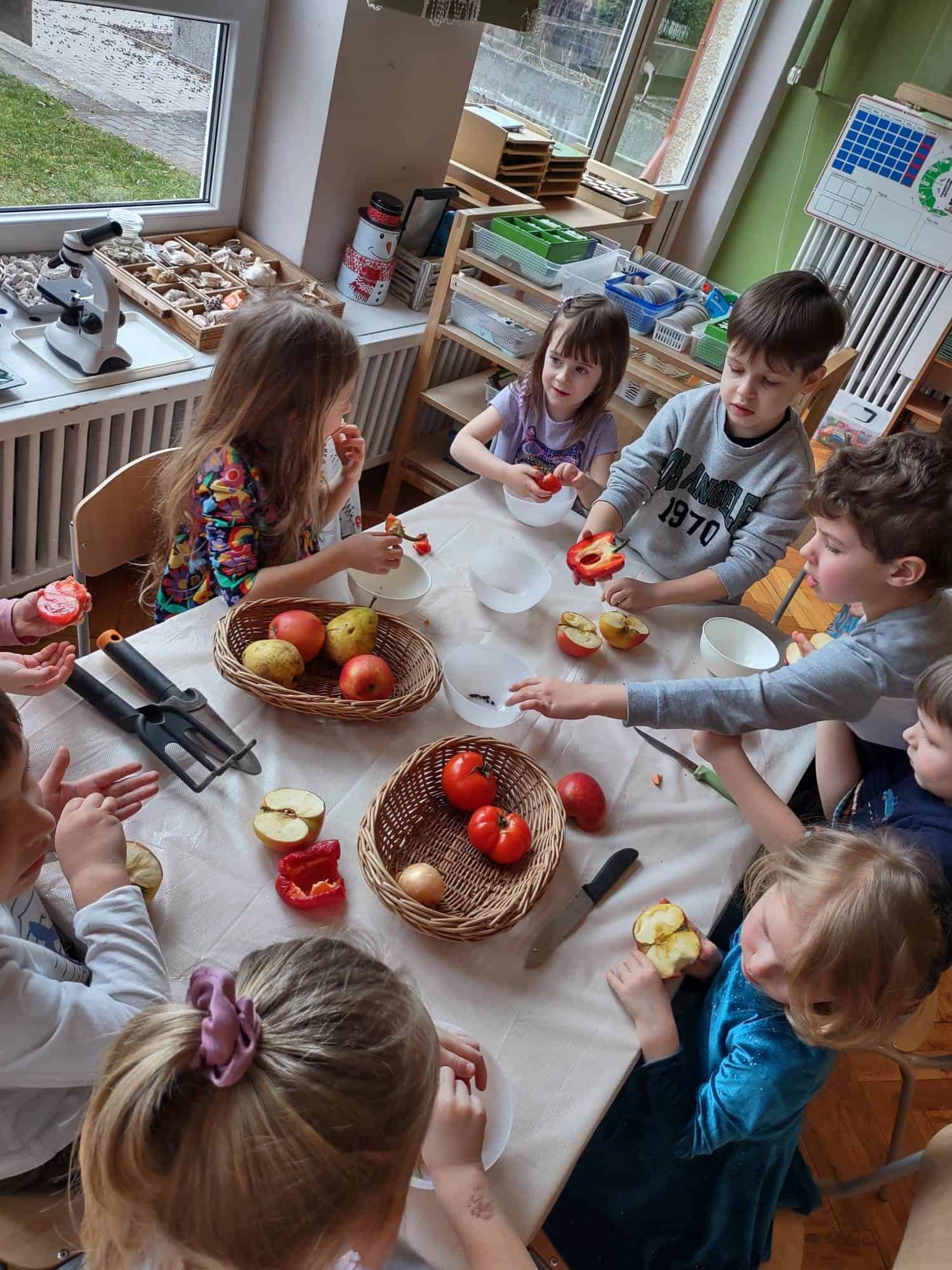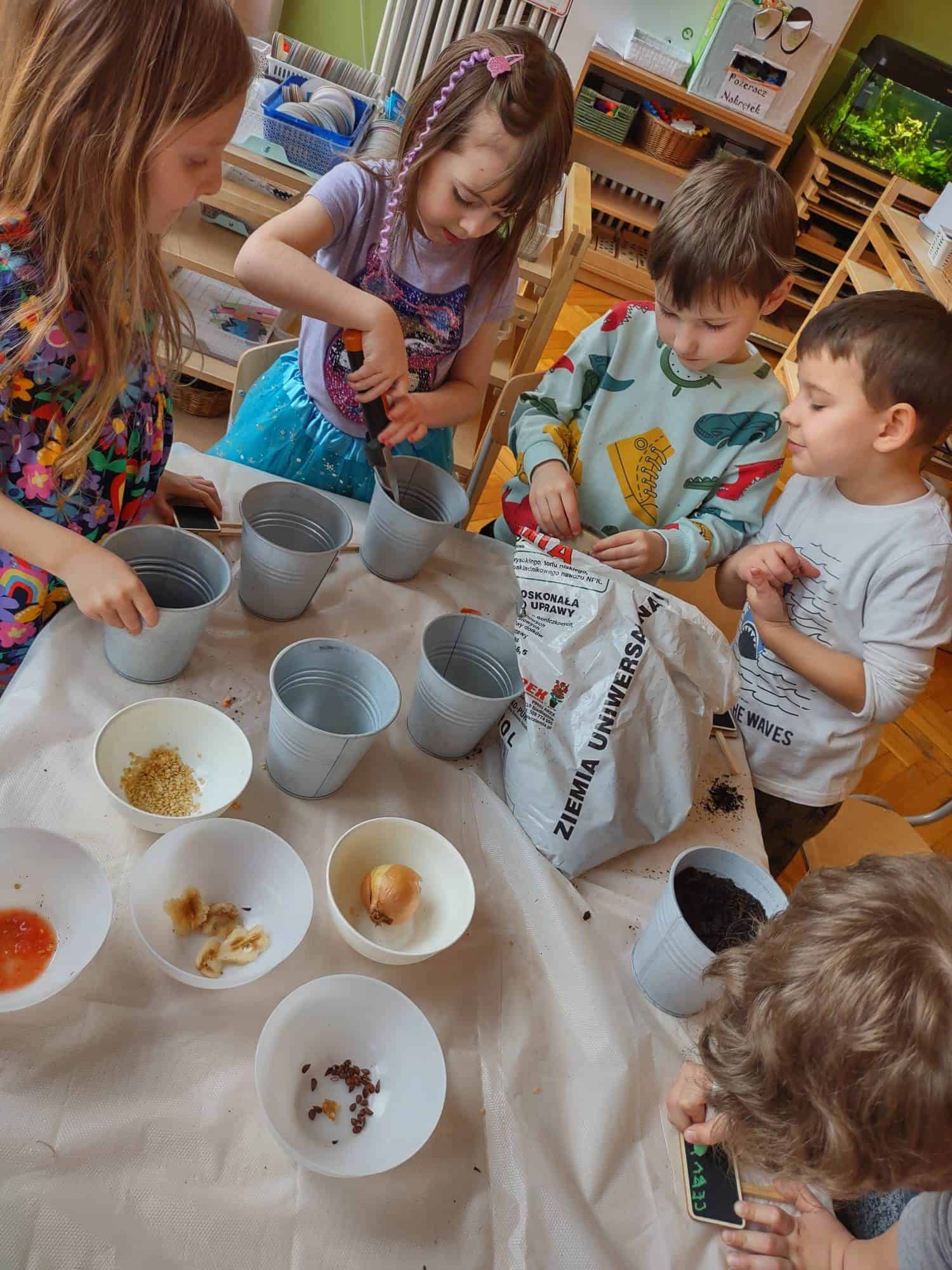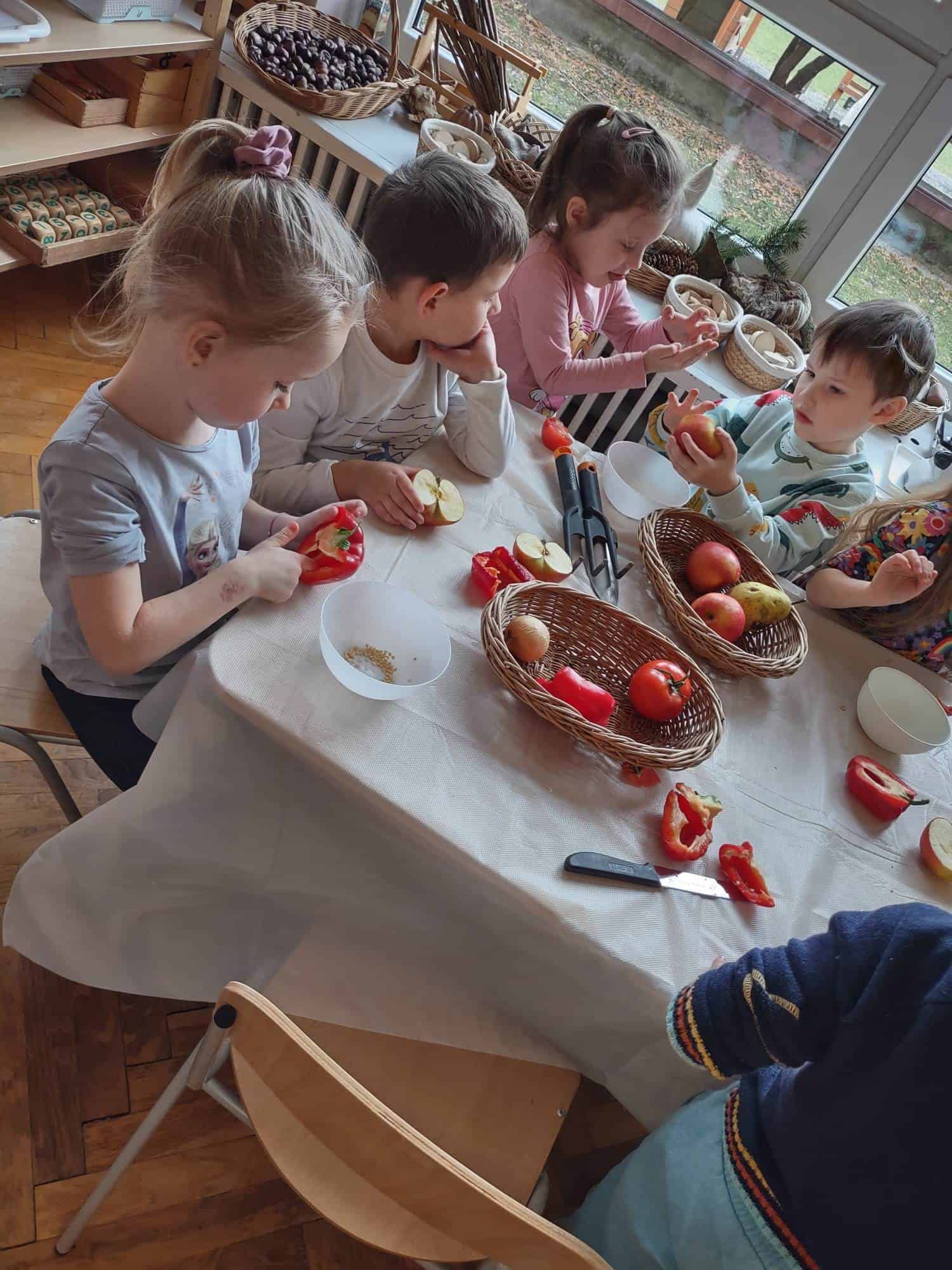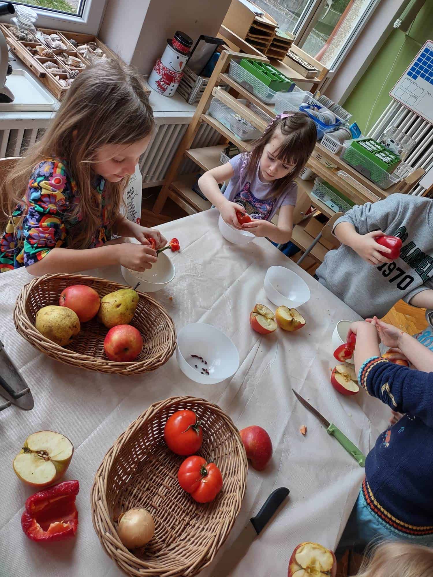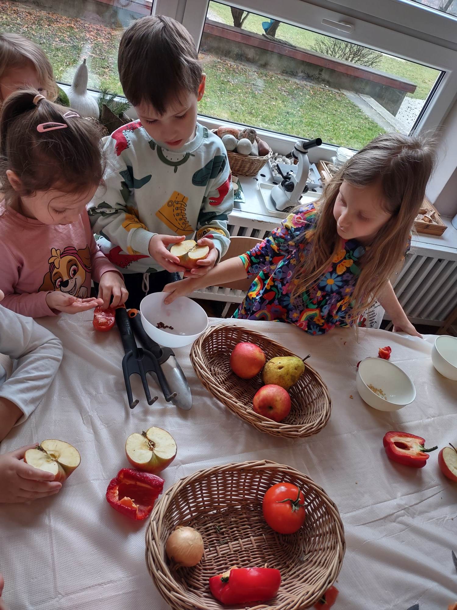 Przygotowaliśmy stanowisko pracy, wyłożyliśmy na stolik warzywa i owoce i zabraliśmy się do dzieła. Każdy samodzielnie drylował nasiona z owoców i warzyw, po czym następował proces umieszczania tych nasion w ziemi. Jeszcze tylko podlać, podpisać i gotowe. W ten sposób zostały zasadzone pomidory, papryka, ogórki, jabłka, gruszki, cebula i awokado.