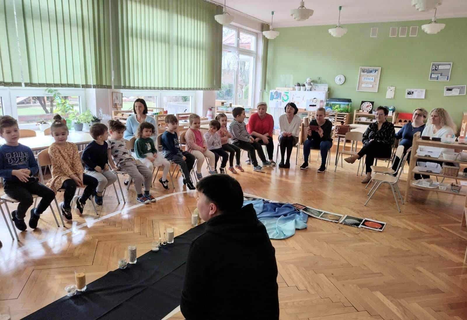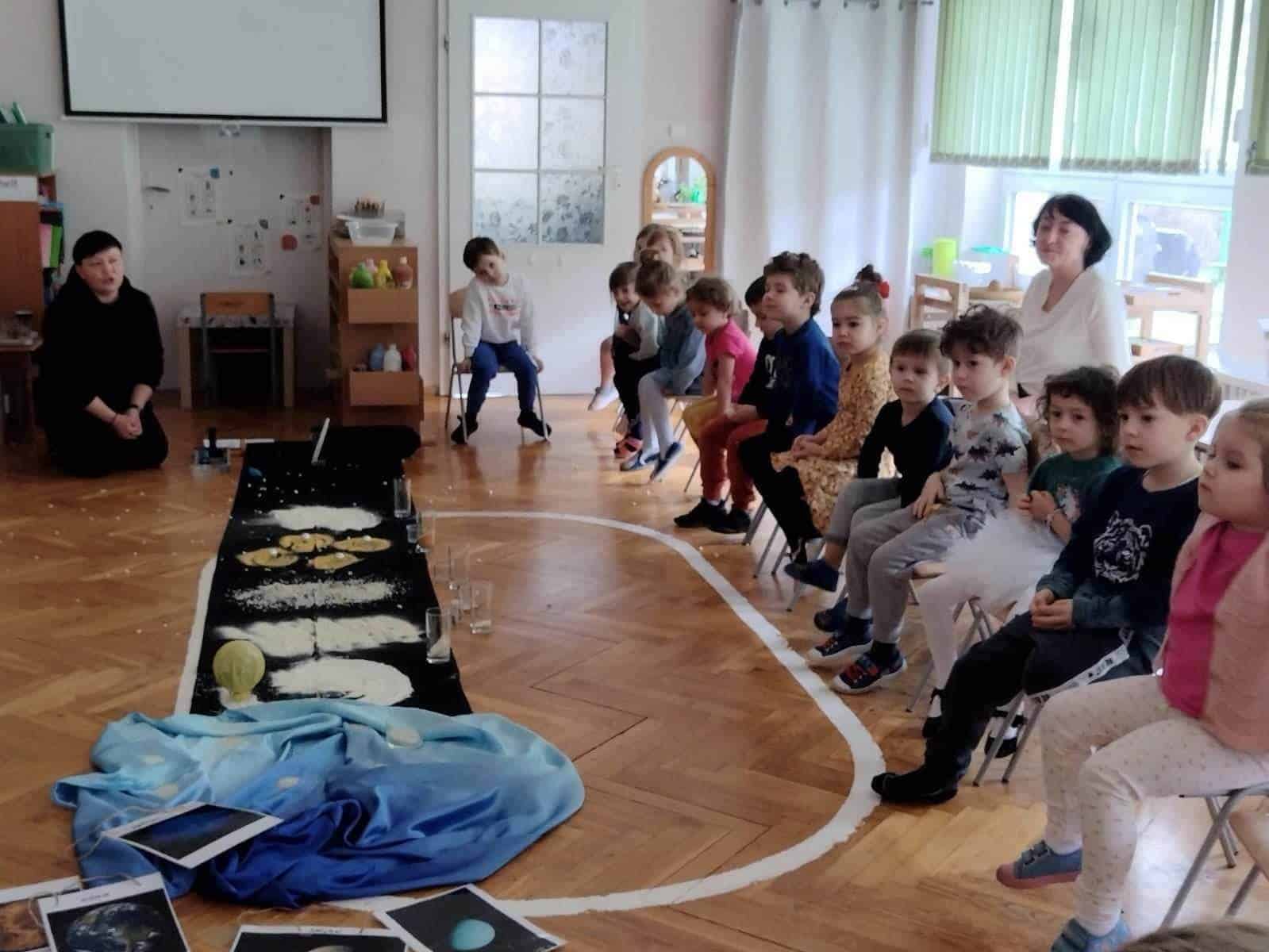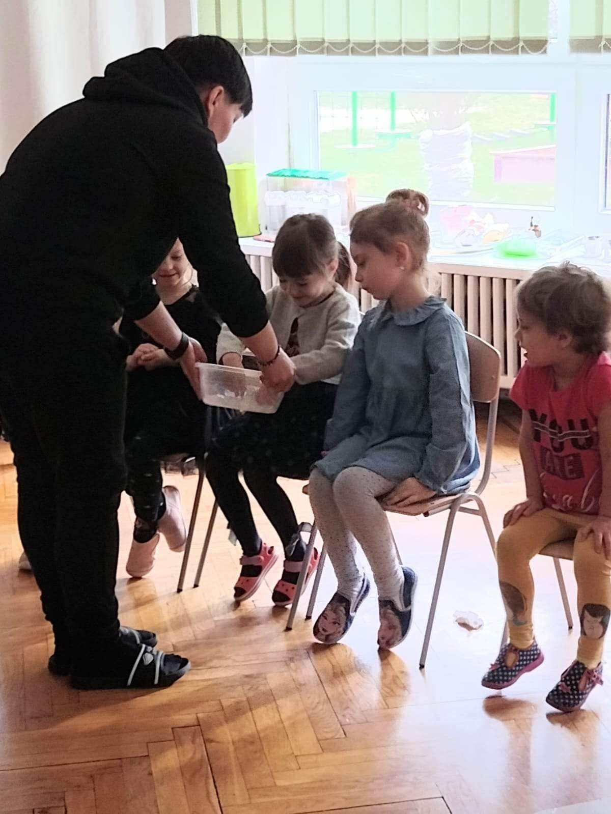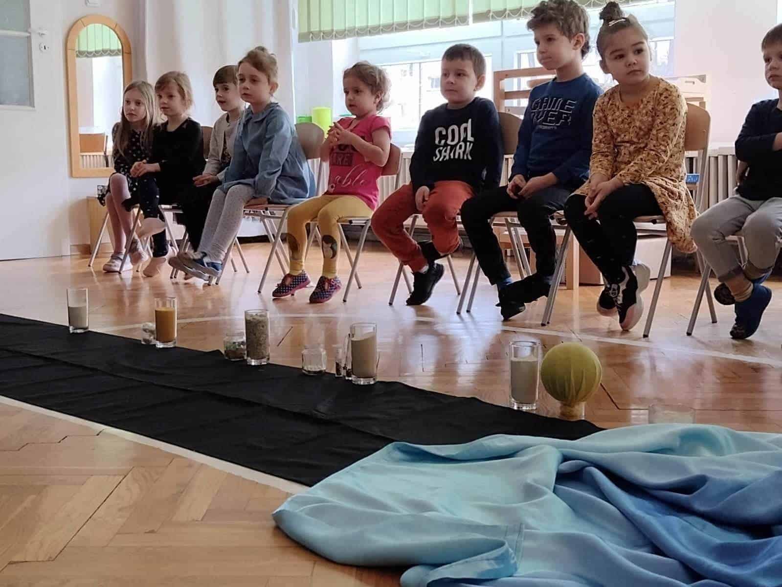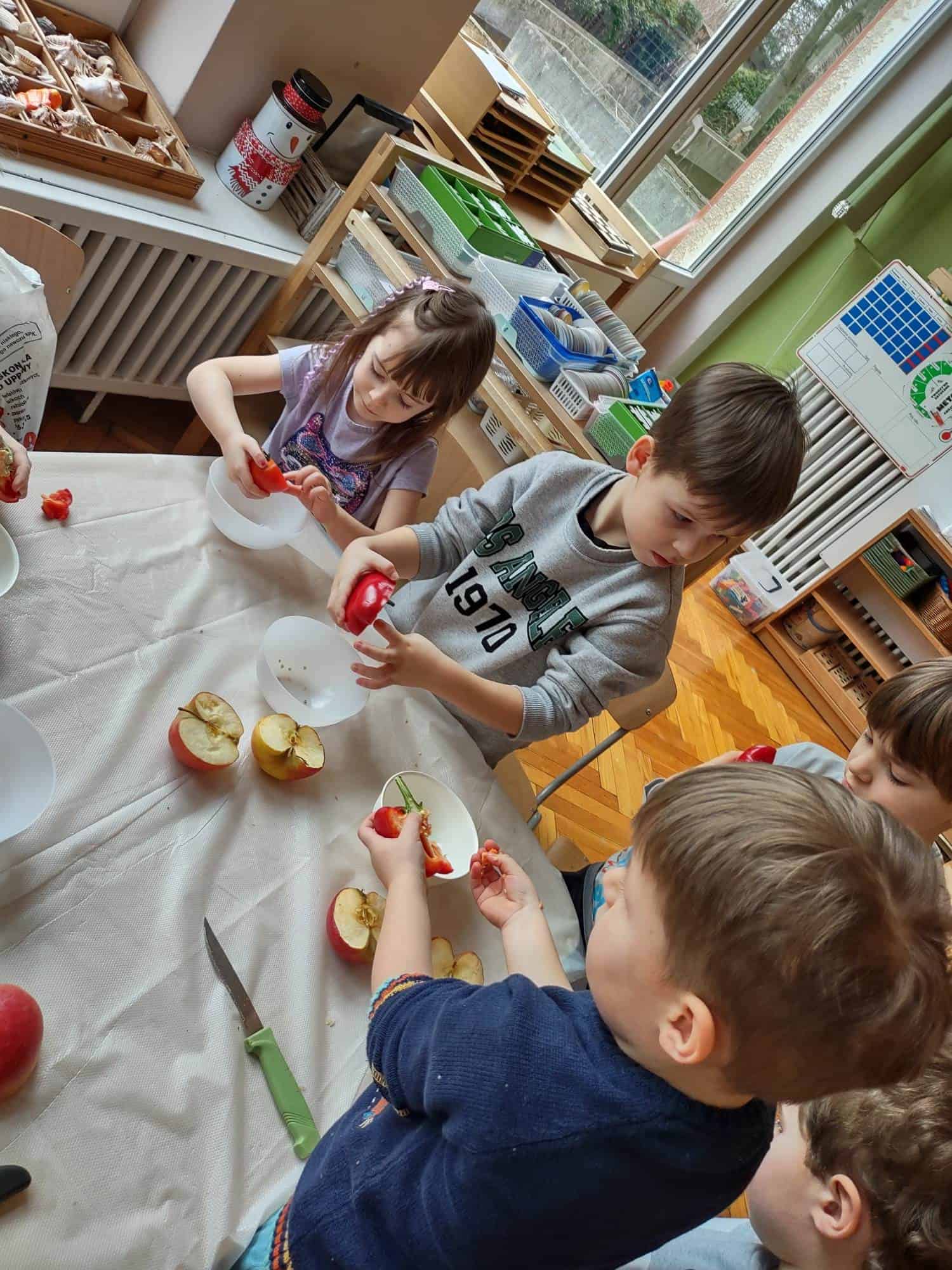 Przygotowaliśmy stanowisko pracy, wyłożyliśmy na stolik warzywa i owoce i zabraliśmy się do dzieła. Każdy samodzielnie drylował nasiona z owoców i warzyw, po czym następował proces umieszczania tych nasion w ziemi. Jeszcze tylko podlać, podpisać i gotowe. W ten sposób zostały zasadzone pomidory, papryka, ogórki, jabłka, gruszki, cebula i awokado.