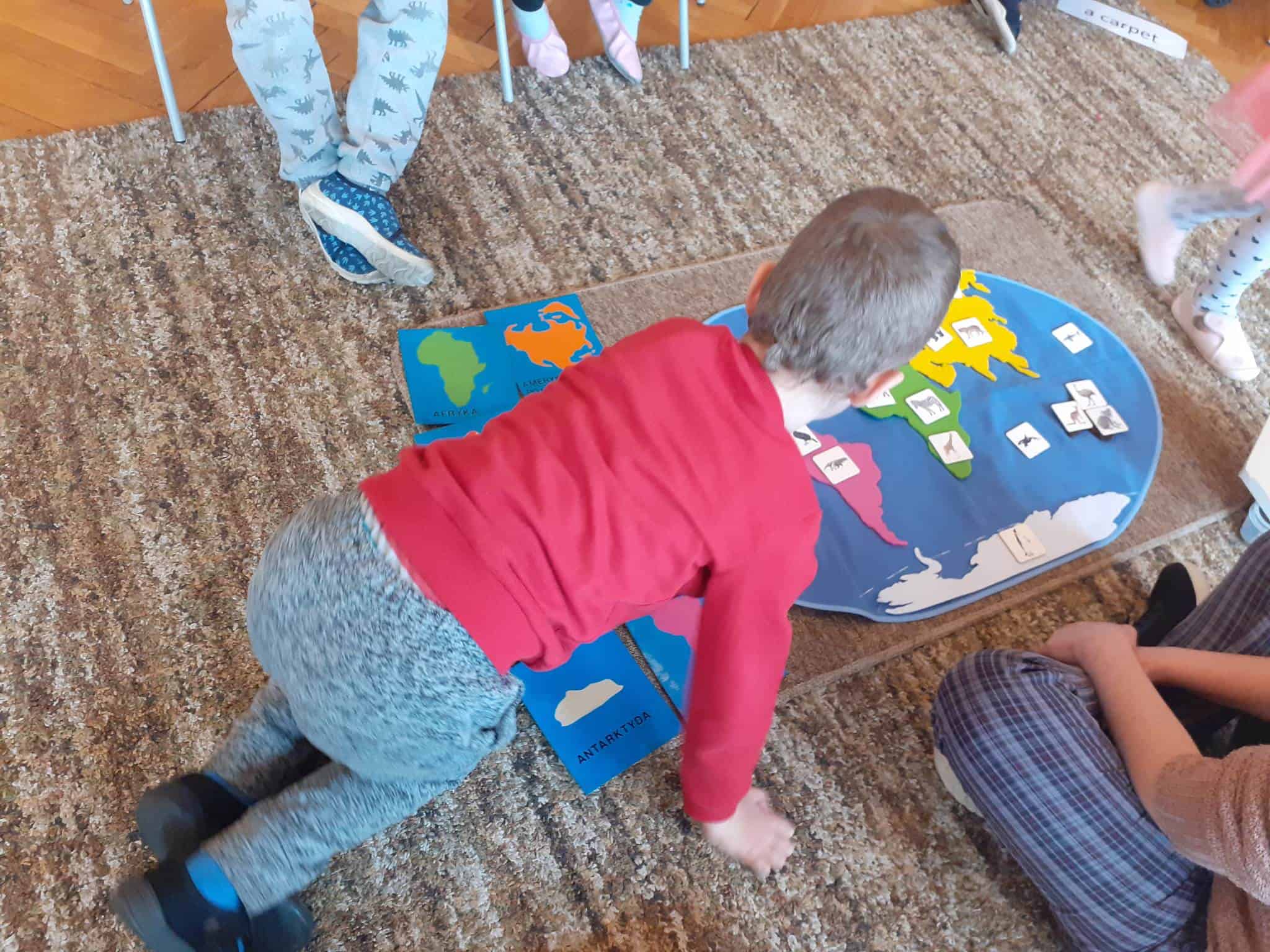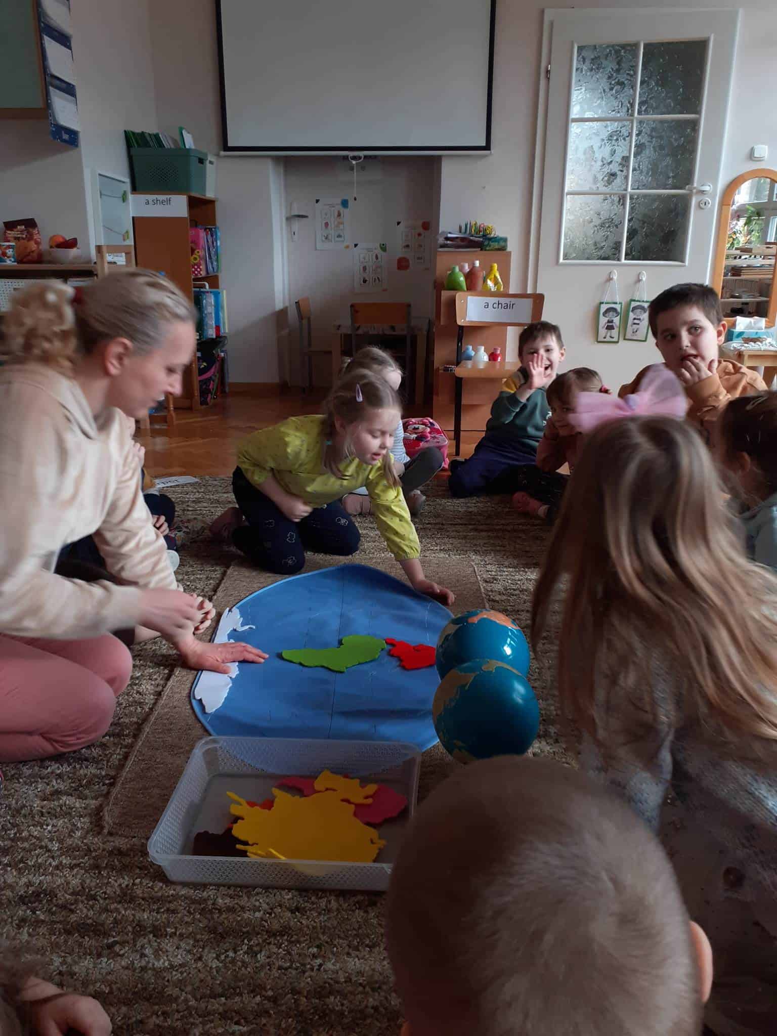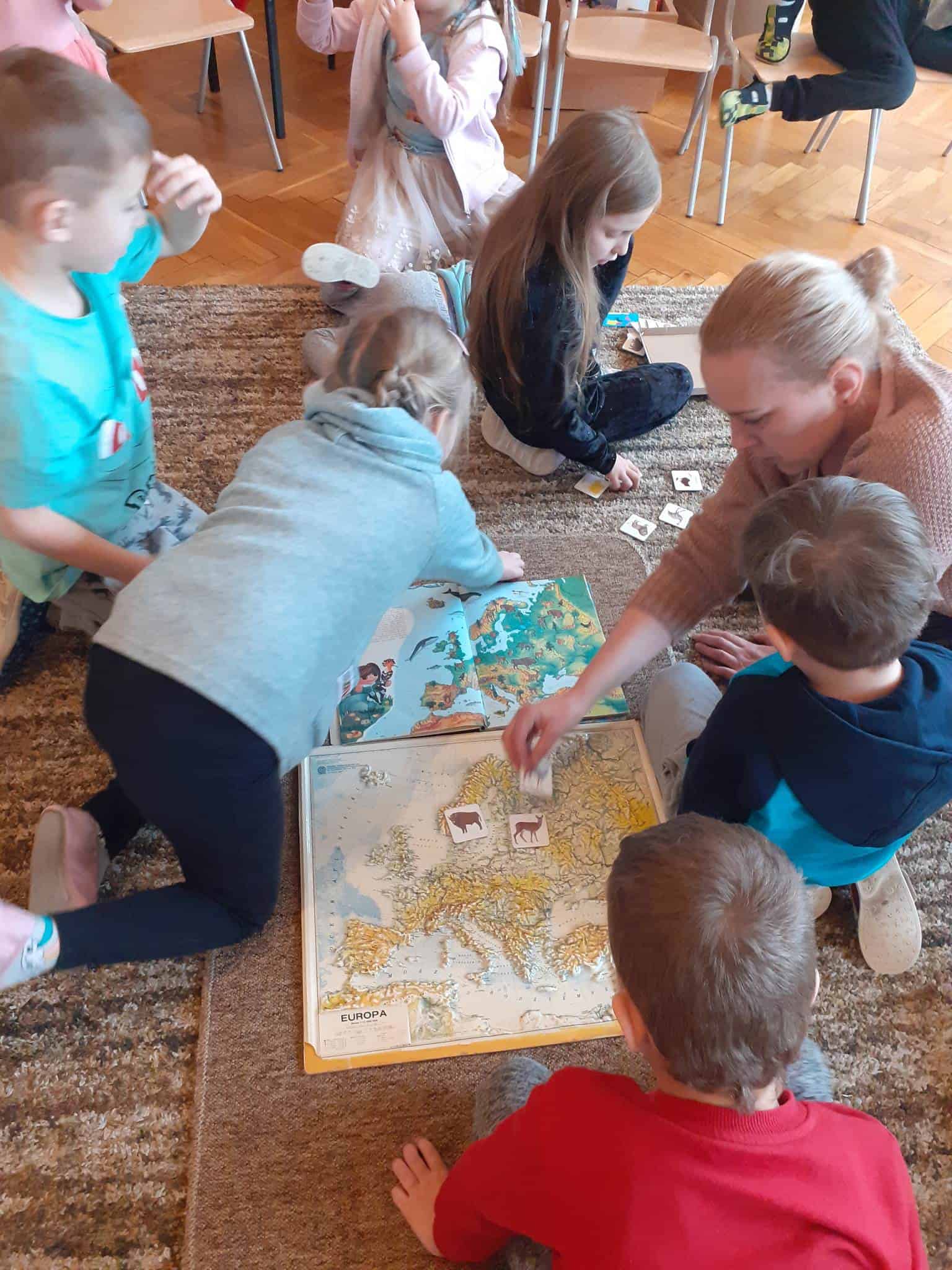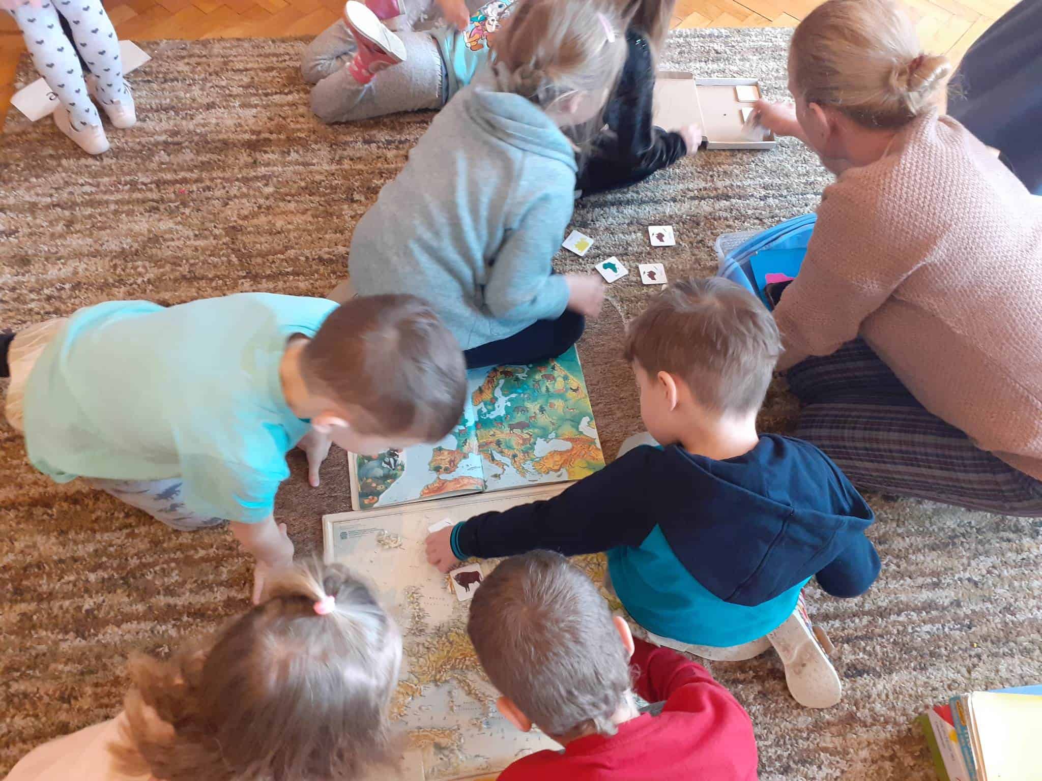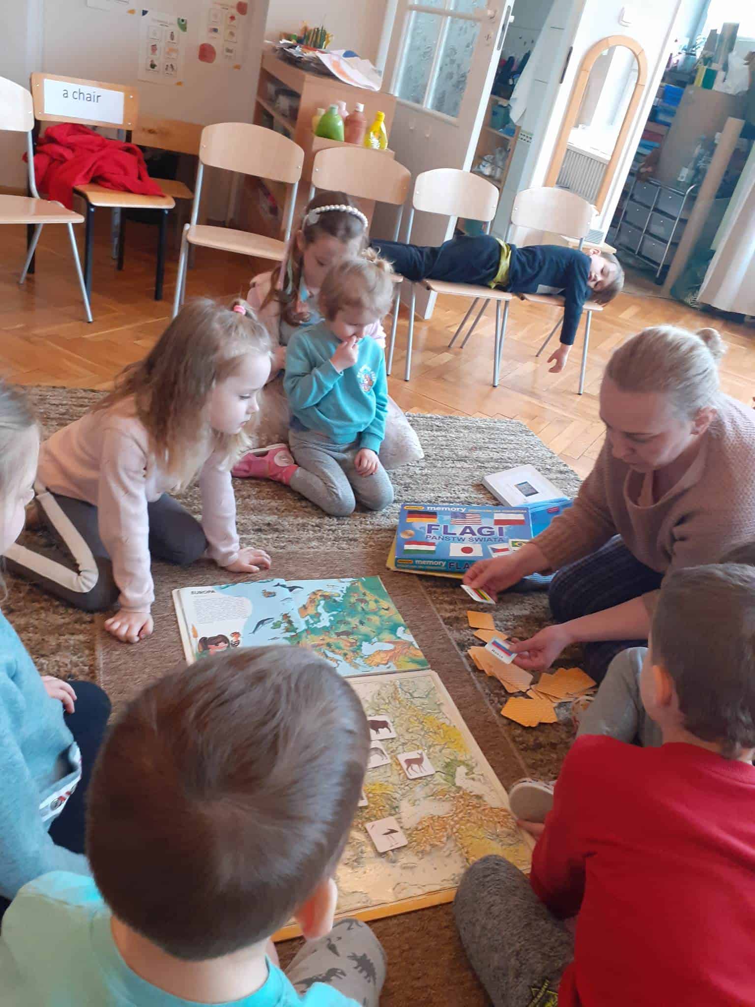 W mijającym tygodniu grupa Zielona wybrała się w pasjonującą podróż. Poznaliśmy europejskie kraje – te bliższe i te dalsze. Na początku tygodnia dzieci obejrzały film edukacyjny „Jak powstała Ziemia”. Rozmawialiśmy o powstaniu naszej planety na podstawie filmu oraz Wielkiej Lekcji Montessori, (którą przeprowadziła pani Ania dwa tygodnie wcześniej). Dzieci mogły zobaczyć jak Pangea się rozpada, a kontynenty odsuwają się od siebie. Dzieci zapoznały się z montessoriańskim Globusem Natury (na którym mogą „dotknąć” lądów i wód), oraz Globusem Kultury (gdzie kontynenty oznaczono różnymi kolorami). Z pomocą filcowej mapy świata dzieci poznały wzajemne położenie wszystkich kontynentów, porównywały wielkości kontynentów oraz ich nazwy. Dzieci zauważyły, że jedne nazwy są krótkie, inne długie, a niektóre nawet bardzo długie. Zauważyły także, że większość nazw kontynentów rozpoczyna się na tę samą literę. Wielozmysłowo poznaliśmy litery A i E, starszaki chętnie próbowały swoich sił w pisaniu tych liter w liniaturze, czy układaniu nazw kontynentów z ruchomego alfabetu. W kolejnych dniach skupiliśmy się na kontynencie, którego nazwa zaczyna się na inną literę od pozostałych. Dzieci zapoznały się krajami Europy: układały mapę puzzlową Europy, dopasowywały flagi do państw, grały w flagowe memory, samodzielnie też rysowały flagi państw Europy z użyciem metalowych matryc. Dzieci poznały także ukształtowanie powierzchni Europy, żyjące tu zwierzęta i rośliny. Pod koniec tygodnia mówiliśmy o sąsiadach Polski, o językach, o Unii Europejskiej. Dzieci słuchały krótkich informacji na temat życia dzieci w innych krajach, słuchaliśmy i próbowaliśmy śpiewać piosenkę „Panie Janie” w różnych językach, poznaliśmy niektóre zwroty i powitania w kilku językach europejskich oraz wysłuchaliśmy hymnu Unii Europejskiej. W ostatnim dniu odnajdywaliśmy miejsca na mapie Europy, z których pocztówki, magnesy i inne pamiątki przyniosły dzieci ze swoich domów, przeliczaliśmy ilość magnesów i pocztówek, tworzyliśmy zbiory i porównywaliśmy ich liczebność.