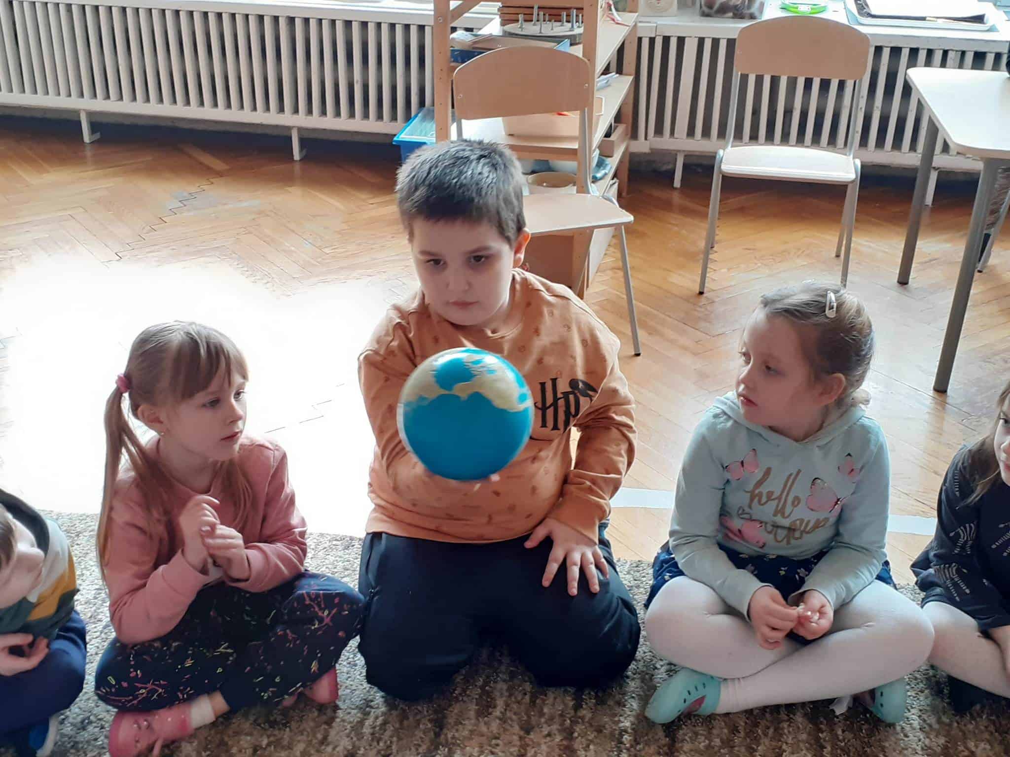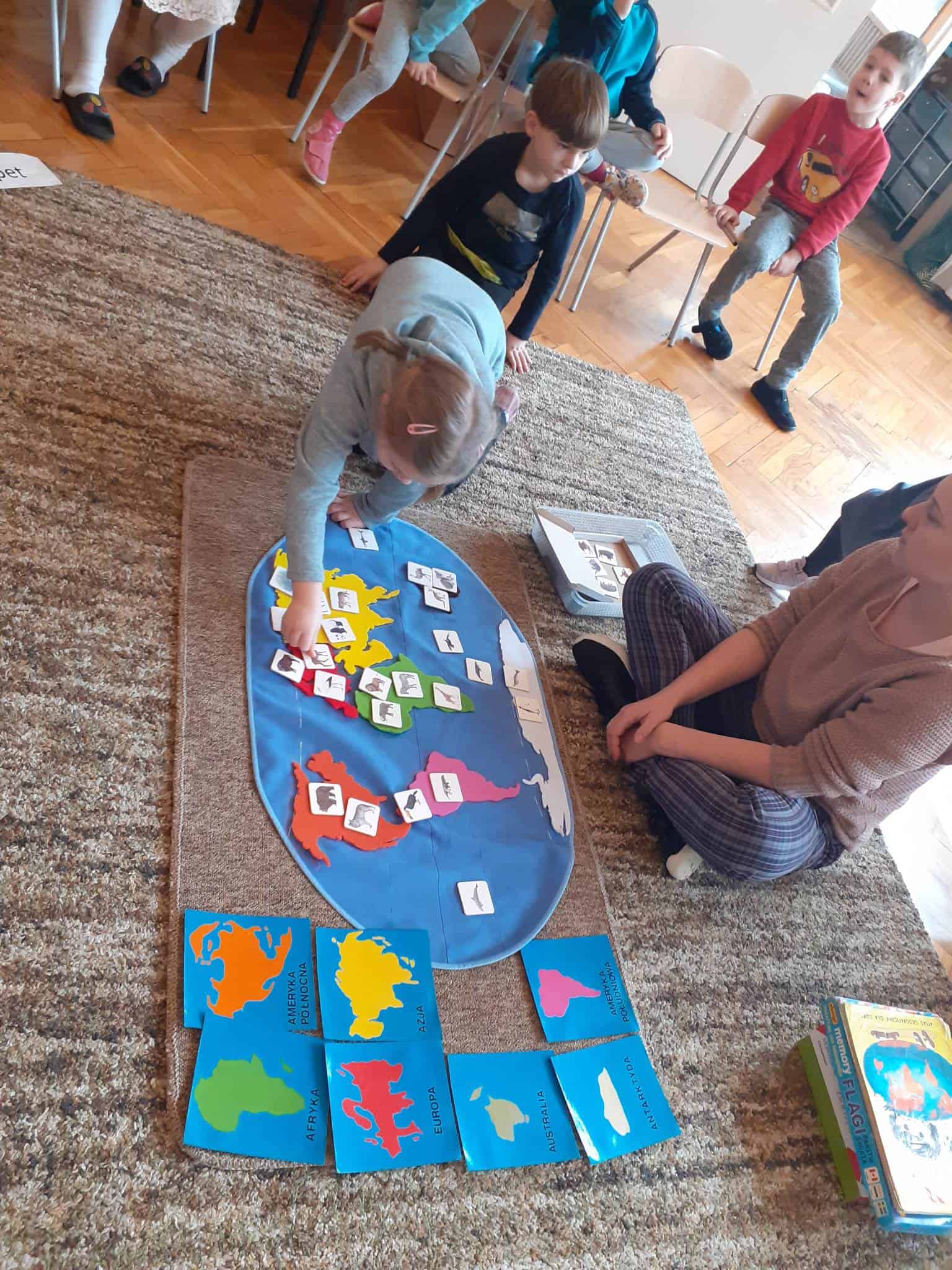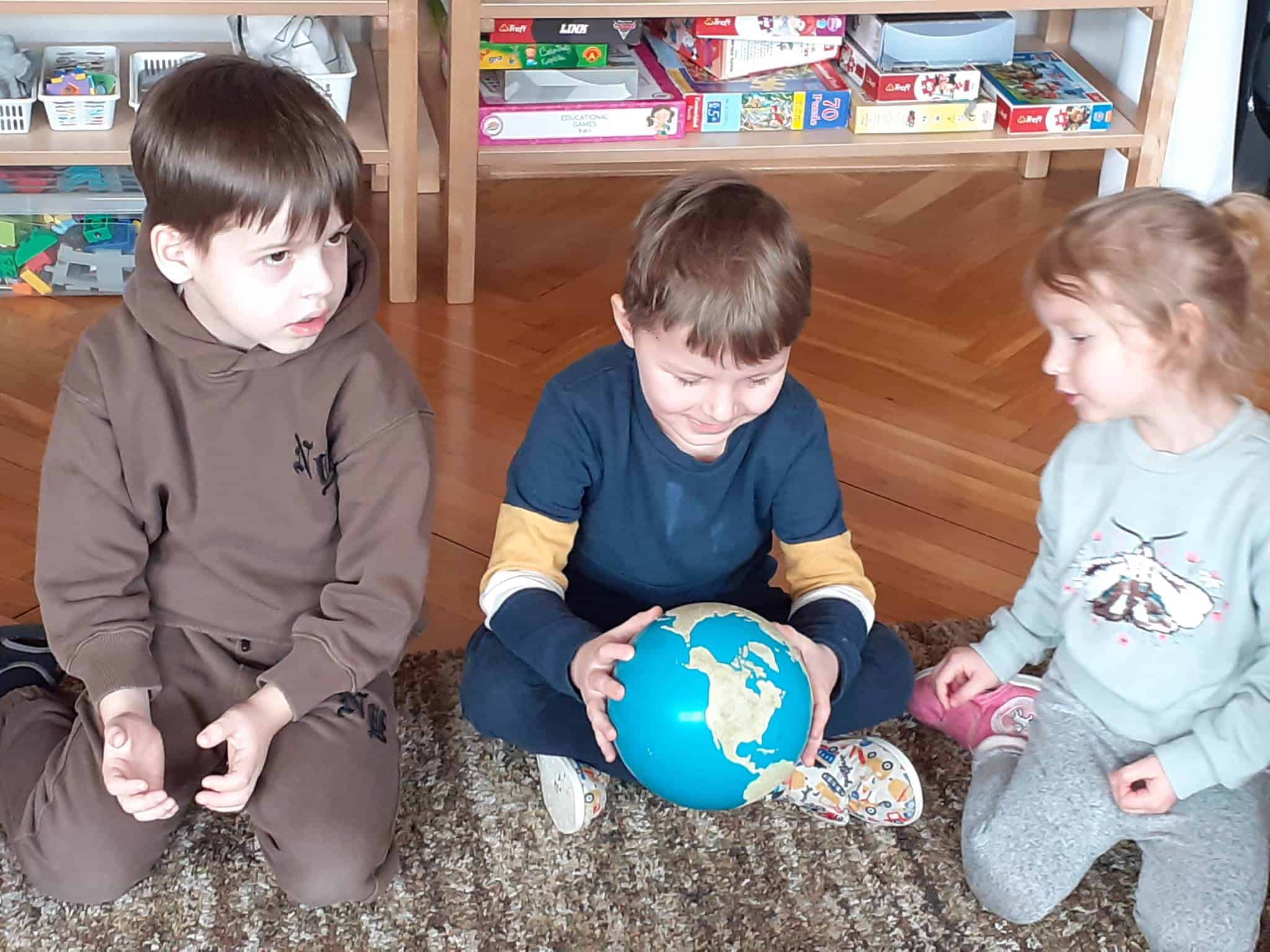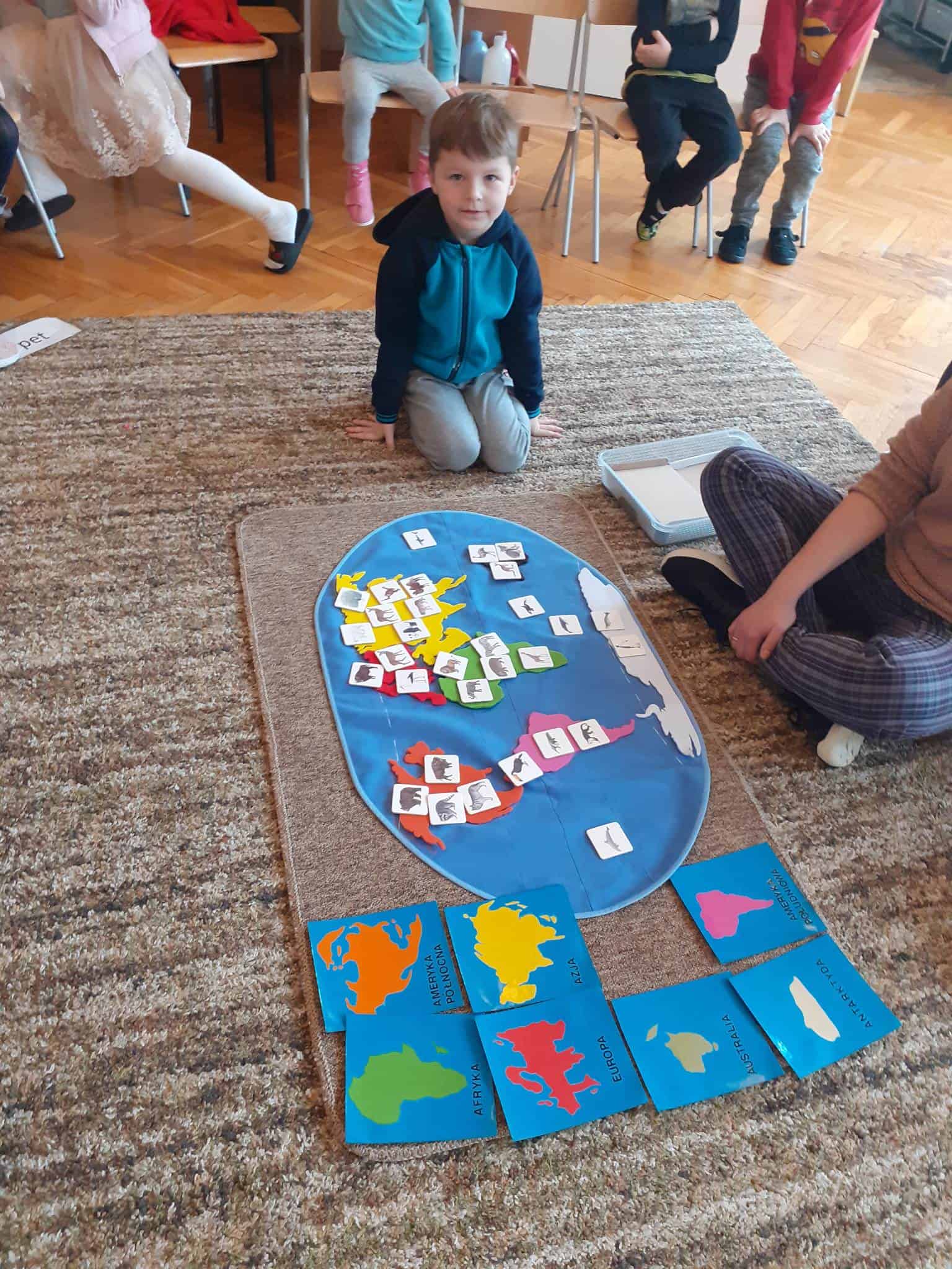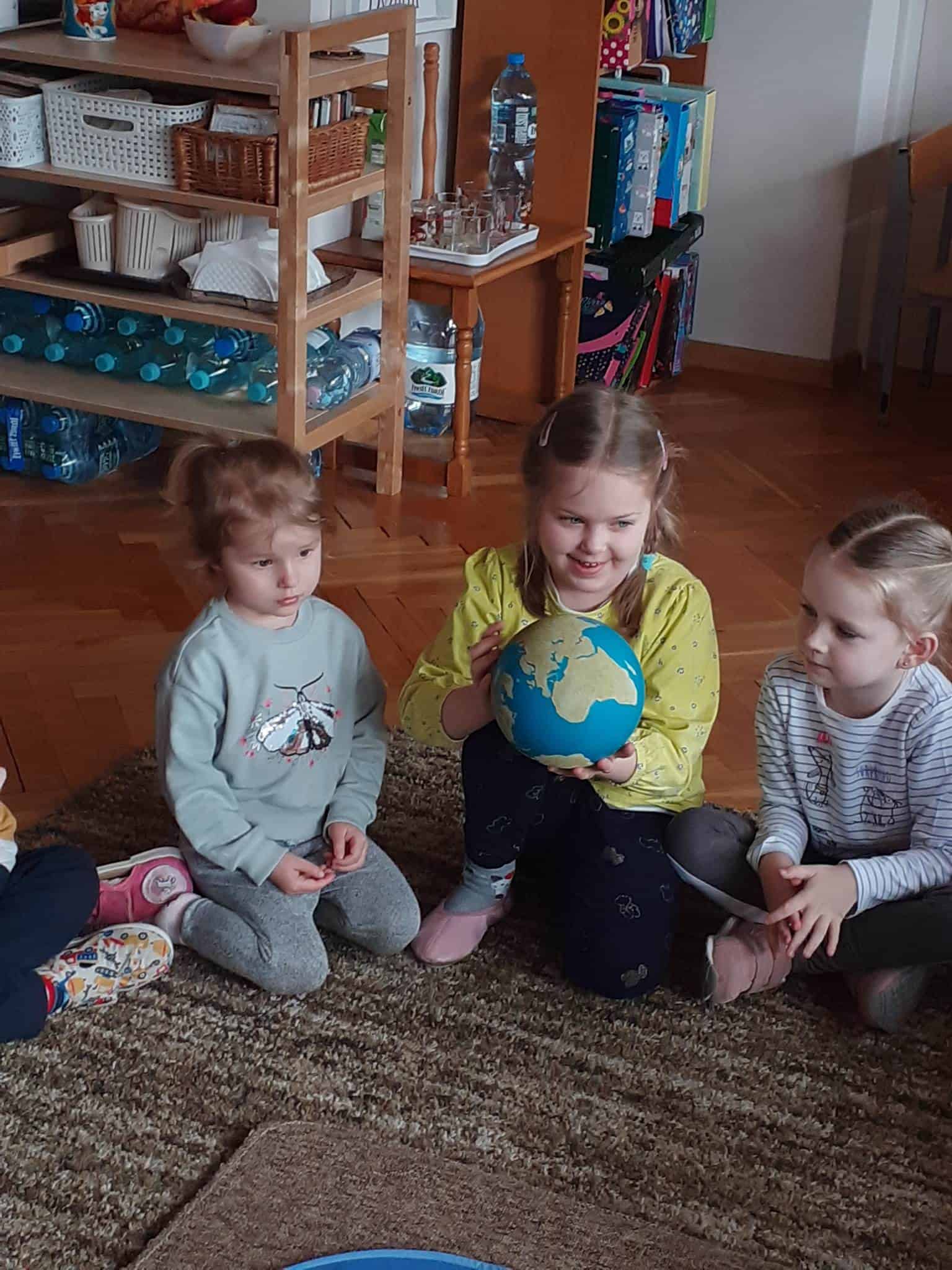 W mijającym tygodniu grupa Zielona wybrała się w pasjonującą podróż. Poznaliśmy europejskie kraje – te bliższe i te dalsze. Na początku tygodnia dzieci obejrzały film edukacyjny „Jak powstała Ziemia”. Rozmawialiśmy o powstaniu naszej planety na podstawie filmu oraz Wielkiej Lekcji Montessori, (którą przeprowadziła pani Ania dwa tygodnie wcześniej). Dzieci mogły zobaczyć jak Pangea się rozpada, a kontynenty odsuwają się od siebie. Dzieci zapoznały się z montessoriańskim Globusem Natury (na którym mogą „dotknąć” lądów i wód), oraz Globusem Kultury (gdzie kontynenty oznaczono różnymi kolorami). Z pomocą filcowej mapy świata dzieci poznały wzajemne położenie wszystkich kontynentów, porównywały wielkości kontynentów oraz ich nazwy. Dzieci zauważyły, że jedne nazwy są krótkie, inne długie, a niektóre nawet bardzo długie. Zauważyły także, że większość nazw kontynentów rozpoczyna się na tę samą literę. Wielozmysłowo poznaliśmy litery A i E, starszaki chętnie próbowały swoich sił w pisaniu tych liter w liniaturze, czy układaniu nazw kontynentów z ruchomego alfabetu. W kolejnych dniach skupiliśmy się na kontynencie, którego nazwa zaczyna się na inną literę od pozostałych. Dzieci zapoznały się krajami Europy: układały mapę puzzlową Europy, dopasowywały flagi do państw, grały w flagowe memory, samodzielnie też rysowały flagi państw Europy z użyciem metalowych matryc. Dzieci poznały także ukształtowanie powierzchni Europy, żyjące tu zwierzęta i rośliny. Pod koniec tygodnia mówiliśmy o sąsiadach Polski, o językach, o Unii Europejskiej. Dzieci słuchały krótkich informacji na temat życia dzieci w innych krajach, słuchaliśmy i próbowaliśmy śpiewać piosenkę „Panie Janie” w różnych językach, poznaliśmy niektóre zwroty i powitania w kilku językach europejskich oraz wysłuchaliśmy hymnu Unii Europejskiej. W ostatnim dniu odnajdywaliśmy miejsca na mapie Europy, z których pocztówki, magnesy i inne pamiątki przyniosły dzieci ze swoich domów, przeliczaliśmy ilość magnesów i pocztówek, tworzyliśmy zbiory i porównywaliśmy ich liczebność.