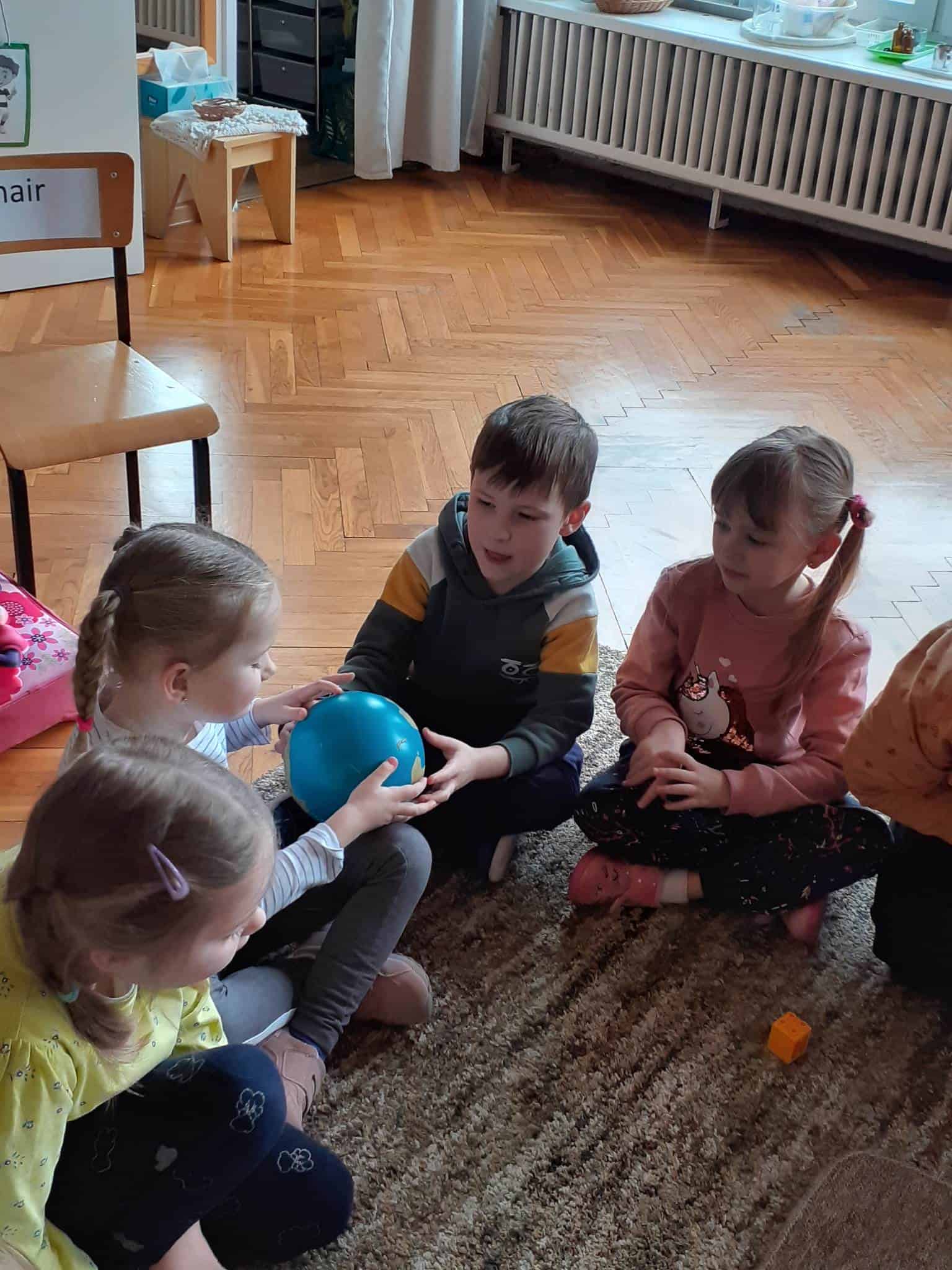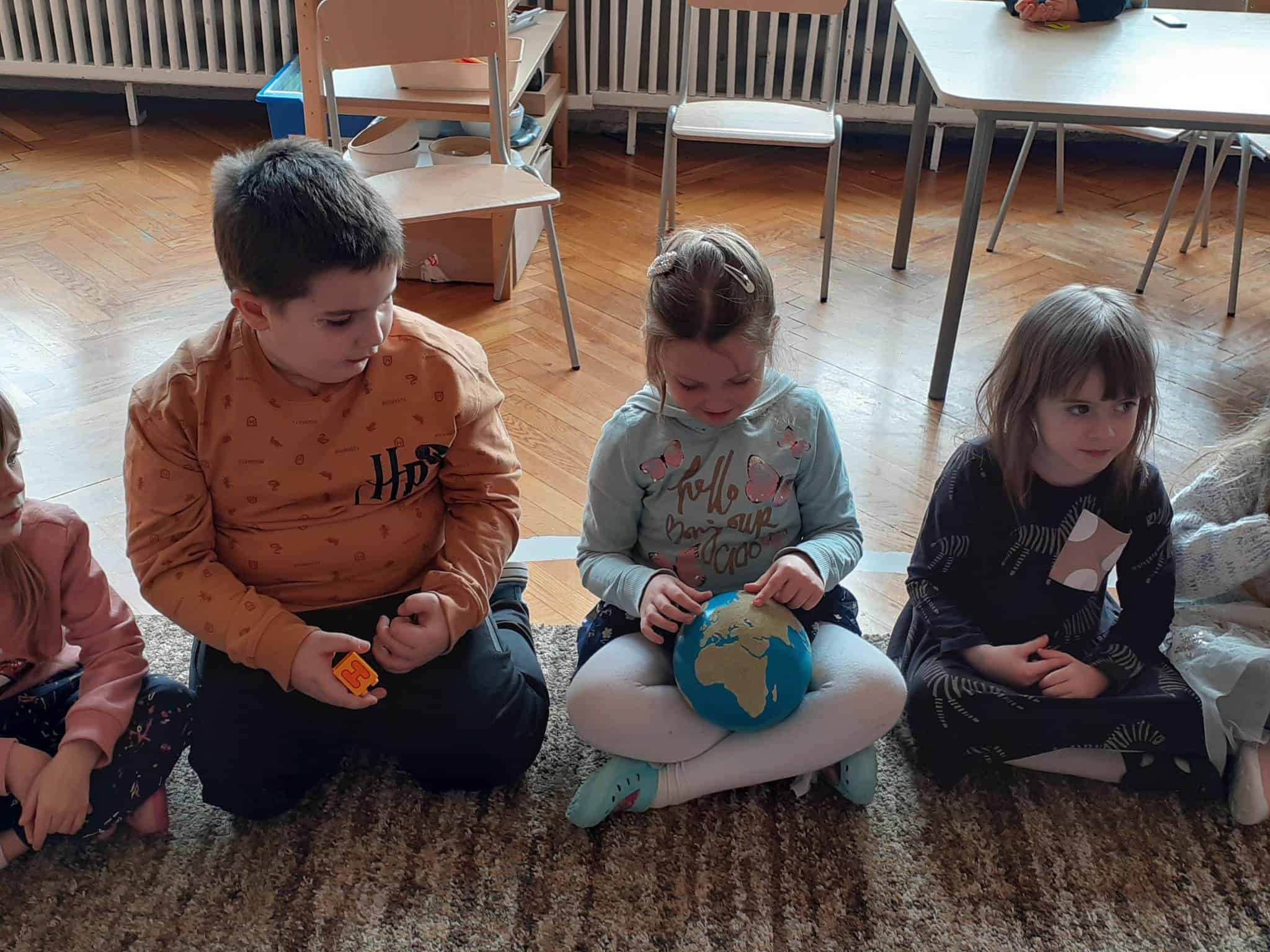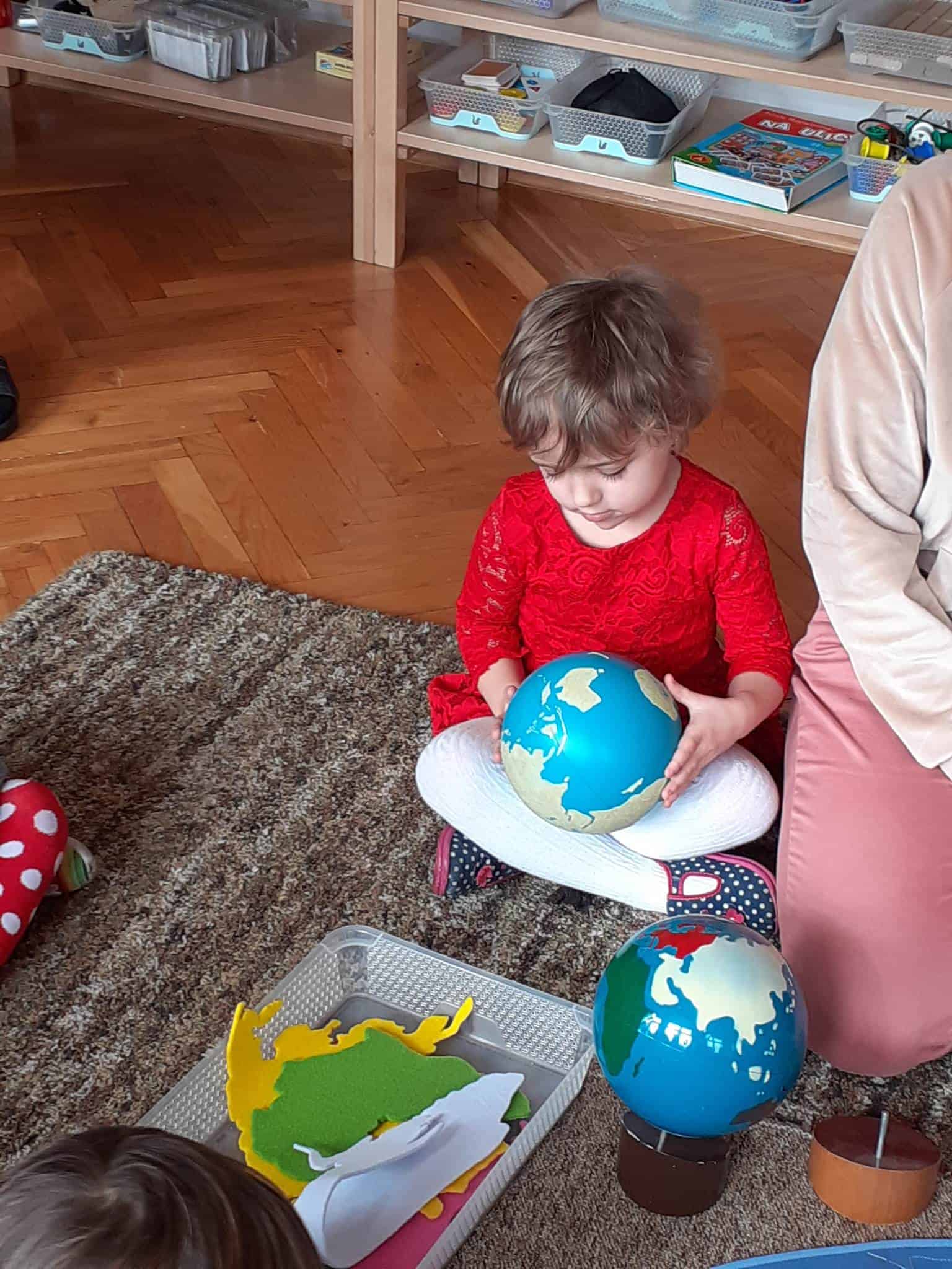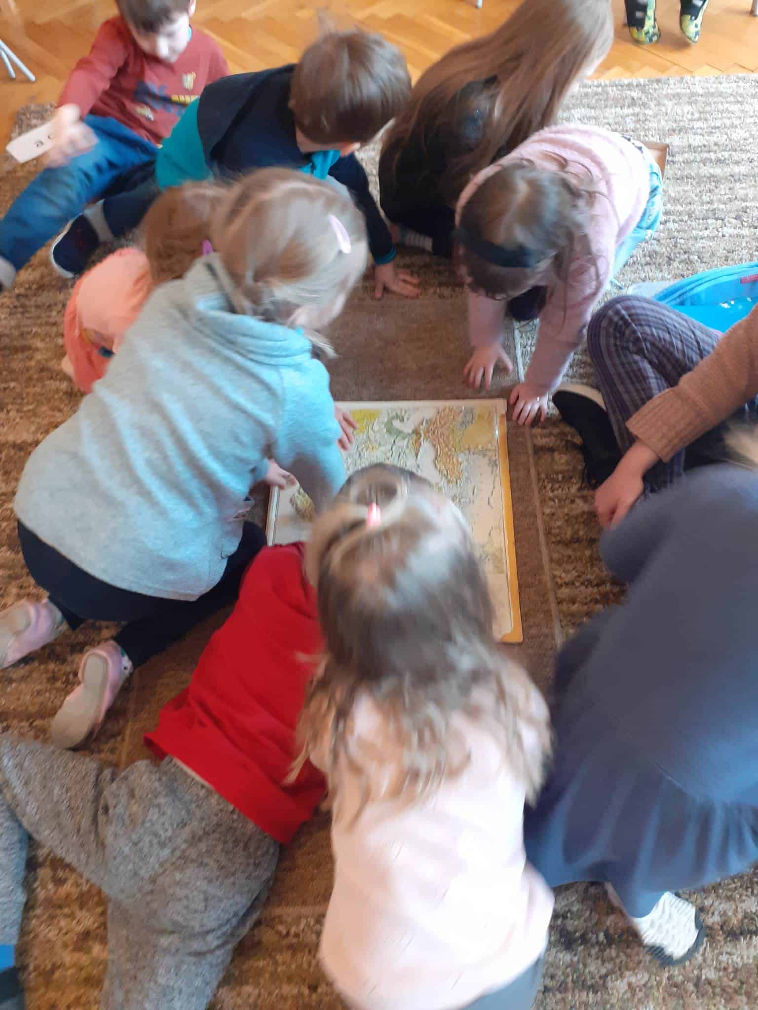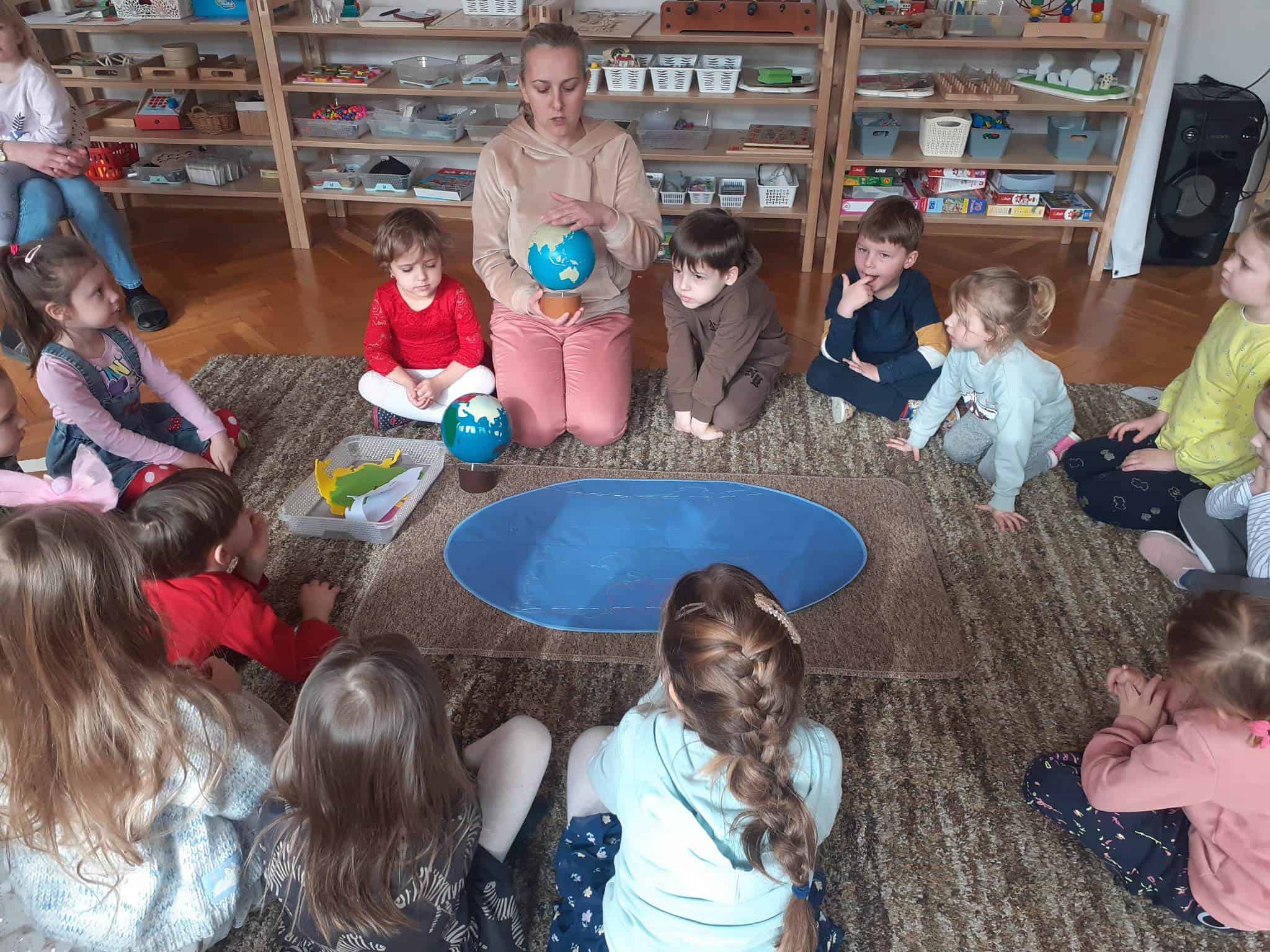 W mijającym tygodniu grupa Zielona wybrała się w pasjonującą podróż. Poznaliśmy europejskie kraje – te bliższe i te dalsze. Na początku tygodnia dzieci obejrzały film edukacyjny „Jak powstała Ziemia”. Rozmawialiśmy o powstaniu naszej planety na podstawie filmu oraz Wielkiej Lekcji Montessori, (którą przeprowadziła pani Ania dwa tygodnie wcześniej). Dzieci mogły zobaczyć jak Pangea się rozpada, a kontynenty odsuwają się od siebie. Dzieci zapoznały się z montessoriańskim Globusem Natury (na którym mogą „dotknąć” lądów i wód), oraz Globusem Kultury (gdzie kontynenty oznaczono różnymi kolorami). Z pomocą filcowej mapy świata dzieci poznały wzajemne położenie wszystkich kontynentów, porównywały wielkości kontynentów oraz ich nazwy. Dzieci zauważyły, że jedne nazwy są krótkie, inne długie, a niektóre nawet bardzo długie. Zauważyły także, że większość nazw kontynentów rozpoczyna się na tę samą literę. Wielozmysłowo poznaliśmy litery A i E, starszaki chętnie próbowały swoich sił w pisaniu tych liter w liniaturze, czy układaniu nazw kontynentów z ruchomego alfabetu. W kolejnych dniach skupiliśmy się na kontynencie, którego nazwa zaczyna się na inną literę od pozostałych. Dzieci zapoznały się krajami Europy: układały mapę puzzlową Europy, dopasowywały flagi do państw, grały w flagowe memory, samodzielnie też rysowały flagi państw Europy z użyciem metalowych matryc. Dzieci poznały także ukształtowanie powierzchni Europy, żyjące tu zwierzęta i rośliny. Pod koniec tygodnia mówiliśmy o sąsiadach Polski, o językach, o Unii Europejskiej. Dzieci słuchały krótkich informacji na temat życia dzieci w innych krajach, słuchaliśmy i próbowaliśmy śpiewać piosenkę „Panie Janie” w różnych językach, poznaliśmy niektóre zwroty i powitania w kilku językach europejskich oraz wysłuchaliśmy hymnu Unii Europejskiej. W ostatnim dniu odnajdywaliśmy miejsca na mapie Europy, z których pocztówki, magnesy i inne pamiątki przyniosły dzieci ze swoich domów, przeliczaliśmy ilość magnesów i pocztówek, tworzyliśmy zbiory i porównywaliśmy ich liczebność.