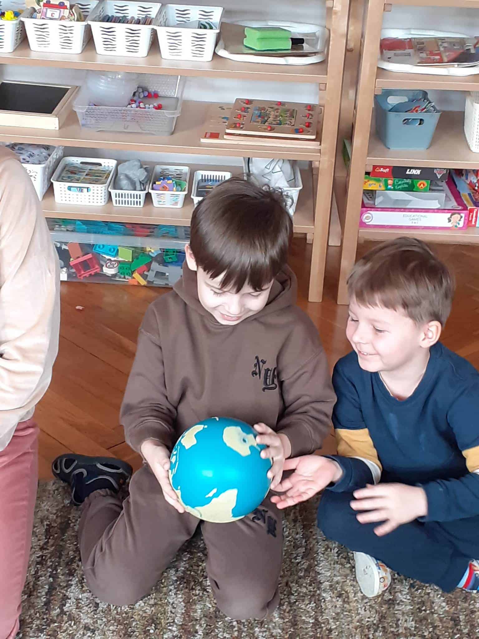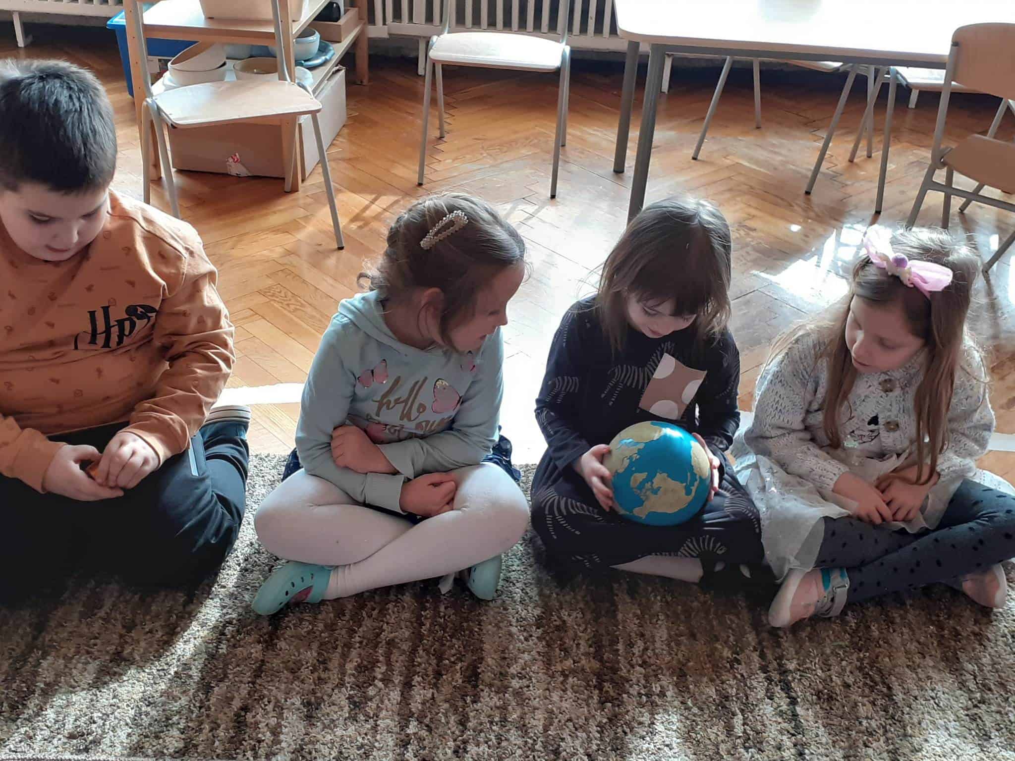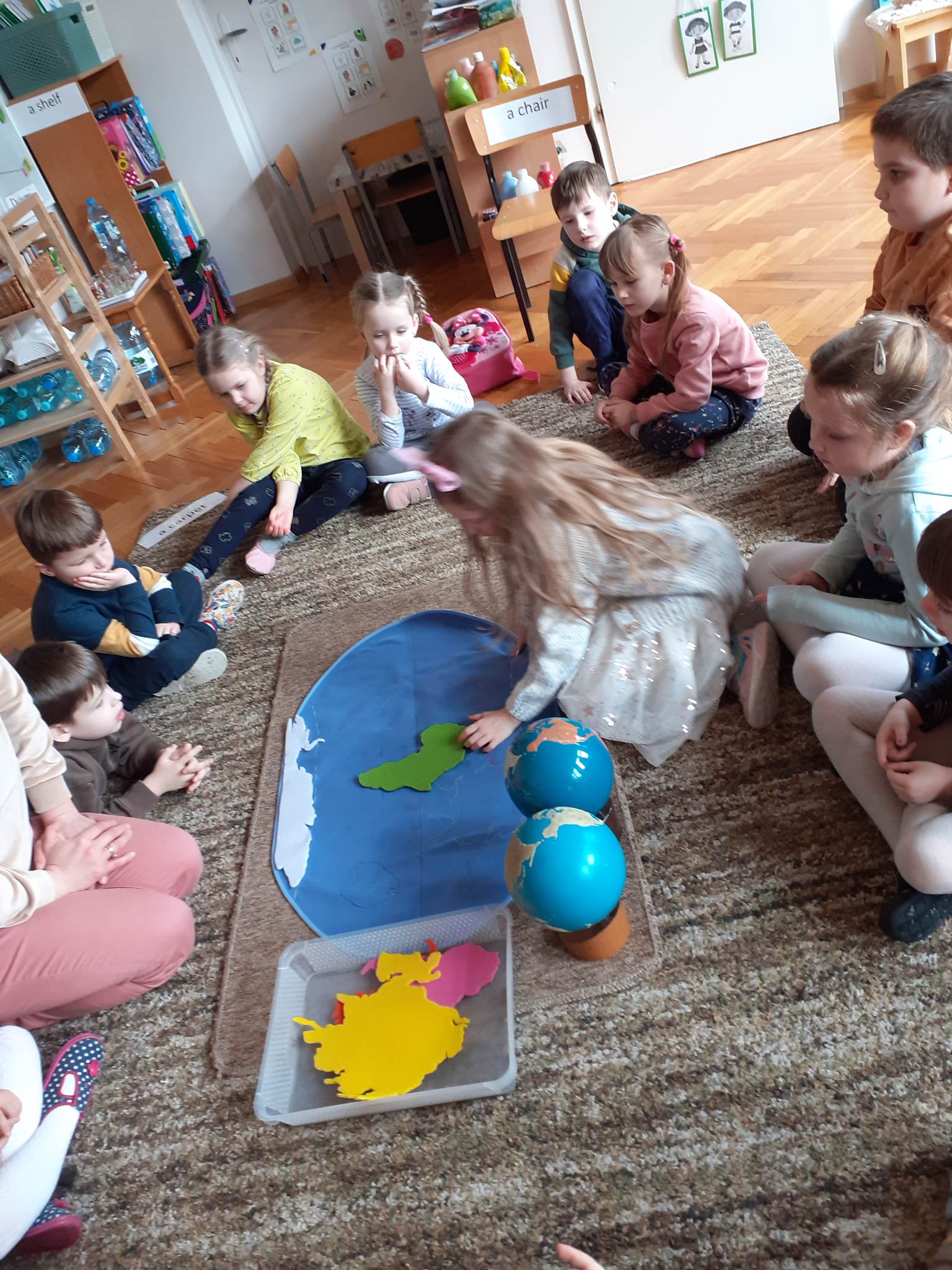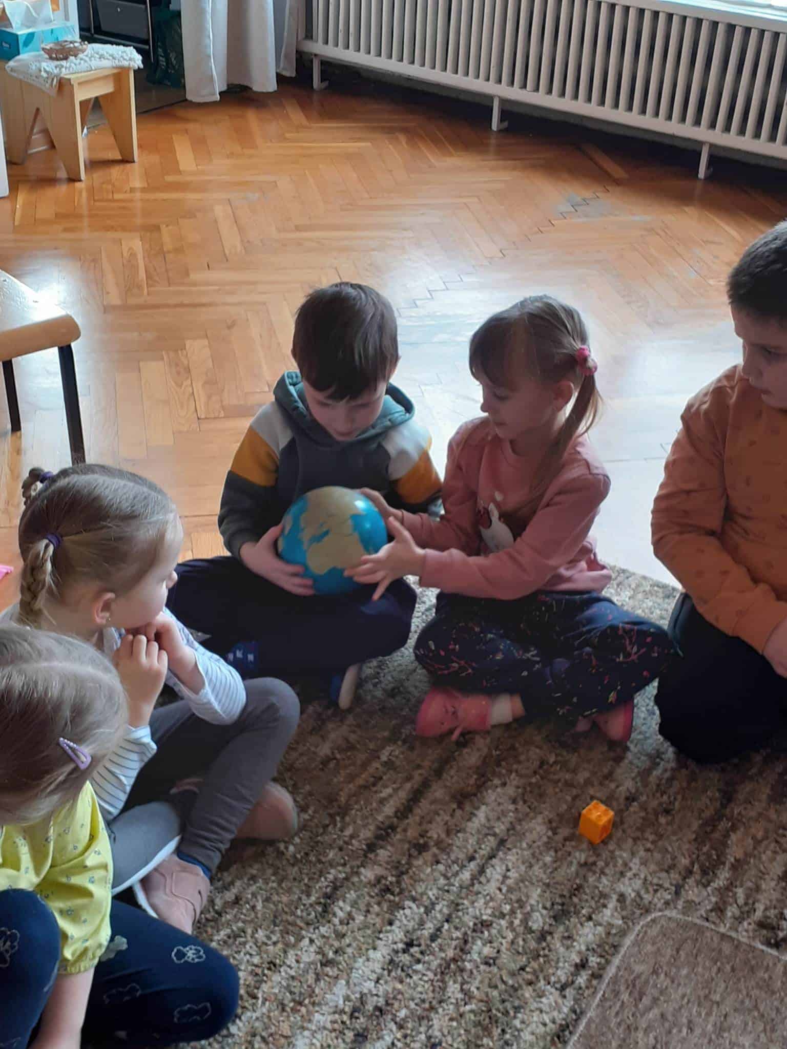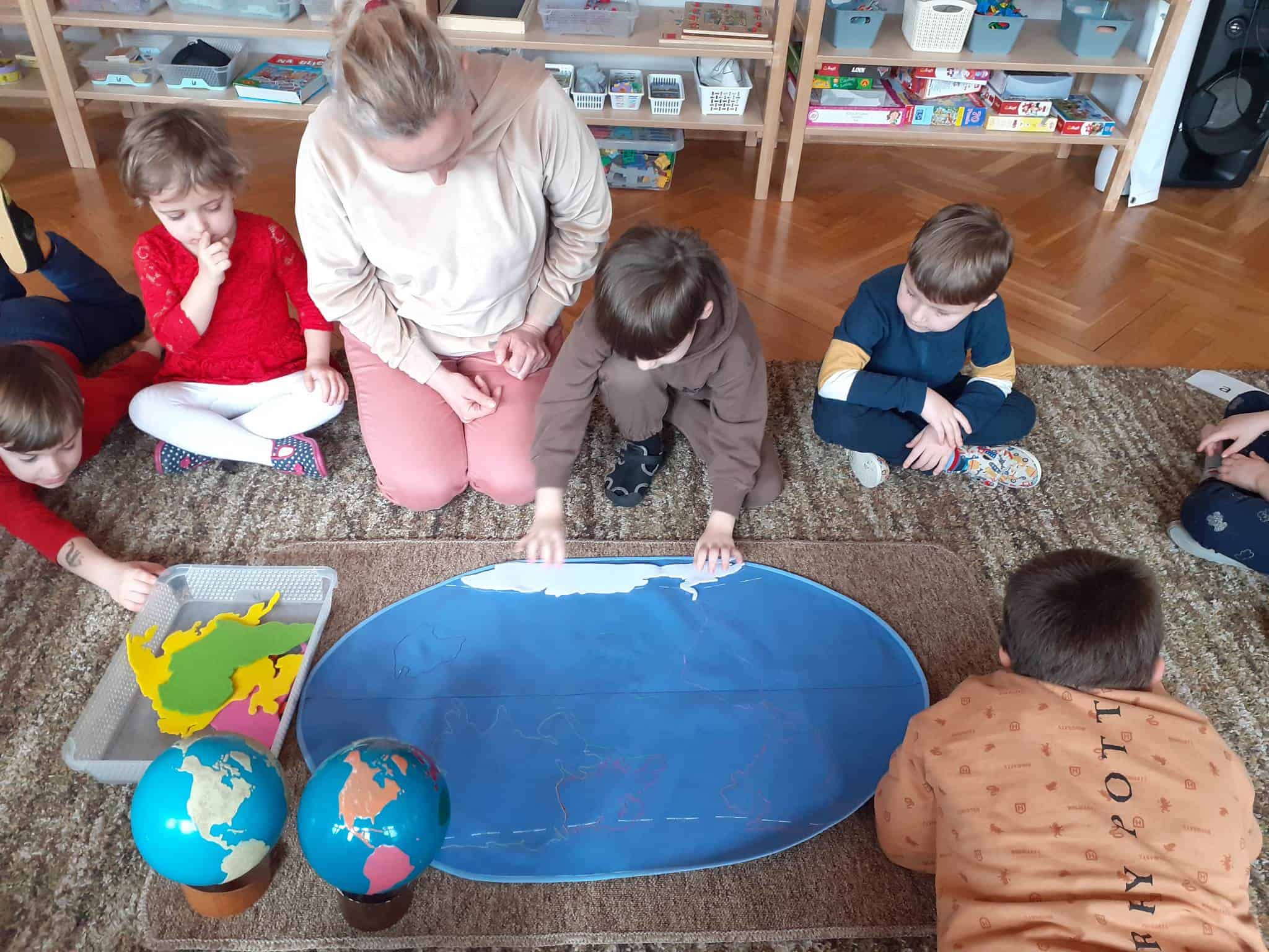 W mijającym tygodniu grupa Zielona wybrała się w pasjonującą podróż. Poznaliśmy europejskie kraje – te bliższe i te dalsze. Na początku tygodnia dzieci obejrzały film edukacyjny „Jak powstała Ziemia”. Rozmawialiśmy o powstaniu naszej planety na podstawie filmu oraz Wielkiej Lekcji Montessori, (którą przeprowadziła pani Ania dwa tygodnie wcześniej). Dzieci mogły zobaczyć jak Pangea się rozpada, a kontynenty odsuwają się od siebie. Dzieci zapoznały się z montessoriańskim Globusem Natury (na którym mogą „dotknąć” lądów i wód), oraz Globusem Kultury (gdzie kontynenty oznaczono różnymi kolorami). Z pomocą filcowej mapy świata dzieci poznały wzajemne położenie wszystkich kontynentów, porównywały wielkości kontynentów oraz ich nazwy. Dzieci zauważyły, że jedne nazwy są krótkie, inne długie, a niektóre nawet bardzo długie. Zauważyły także, że większość nazw kontynentów rozpoczyna się na tę samą literę. Wielozmysłowo poznaliśmy litery A i E, starszaki chętnie próbowały swoich sił w pisaniu tych liter w liniaturze, czy układaniu nazw kontynentów z ruchomego alfabetu. W kolejnych dniach skupiliśmy się na kontynencie, którego nazwa zaczyna się na inną literę od pozostałych. Dzieci zapoznały się krajami Europy: układały mapę puzzlową Europy, dopasowywały flagi do państw, grały w flagowe memory, samodzielnie też rysowały flagi państw Europy z użyciem metalowych matryc. Dzieci poznały także ukształtowanie powierzchni Europy, żyjące tu zwierzęta i rośliny. Pod koniec tygodnia mówiliśmy o sąsiadach Polski, o językach, o Unii Europejskiej. Dzieci słuchały krótkich informacji na temat życia dzieci w innych krajach, słuchaliśmy i próbowaliśmy śpiewać piosenkę „Panie Janie” w różnych językach, poznaliśmy niektóre zwroty i powitania w kilku językach europejskich oraz wysłuchaliśmy hymnu Unii Europejskiej. W ostatnim dniu odnajdywaliśmy miejsca na mapie Europy, z których pocztówki, magnesy i inne pamiątki przyniosły dzieci ze swoich domów, przeliczaliśmy ilość magnesów i pocztówek, tworzyliśmy zbiory i porównywaliśmy ich liczebność.