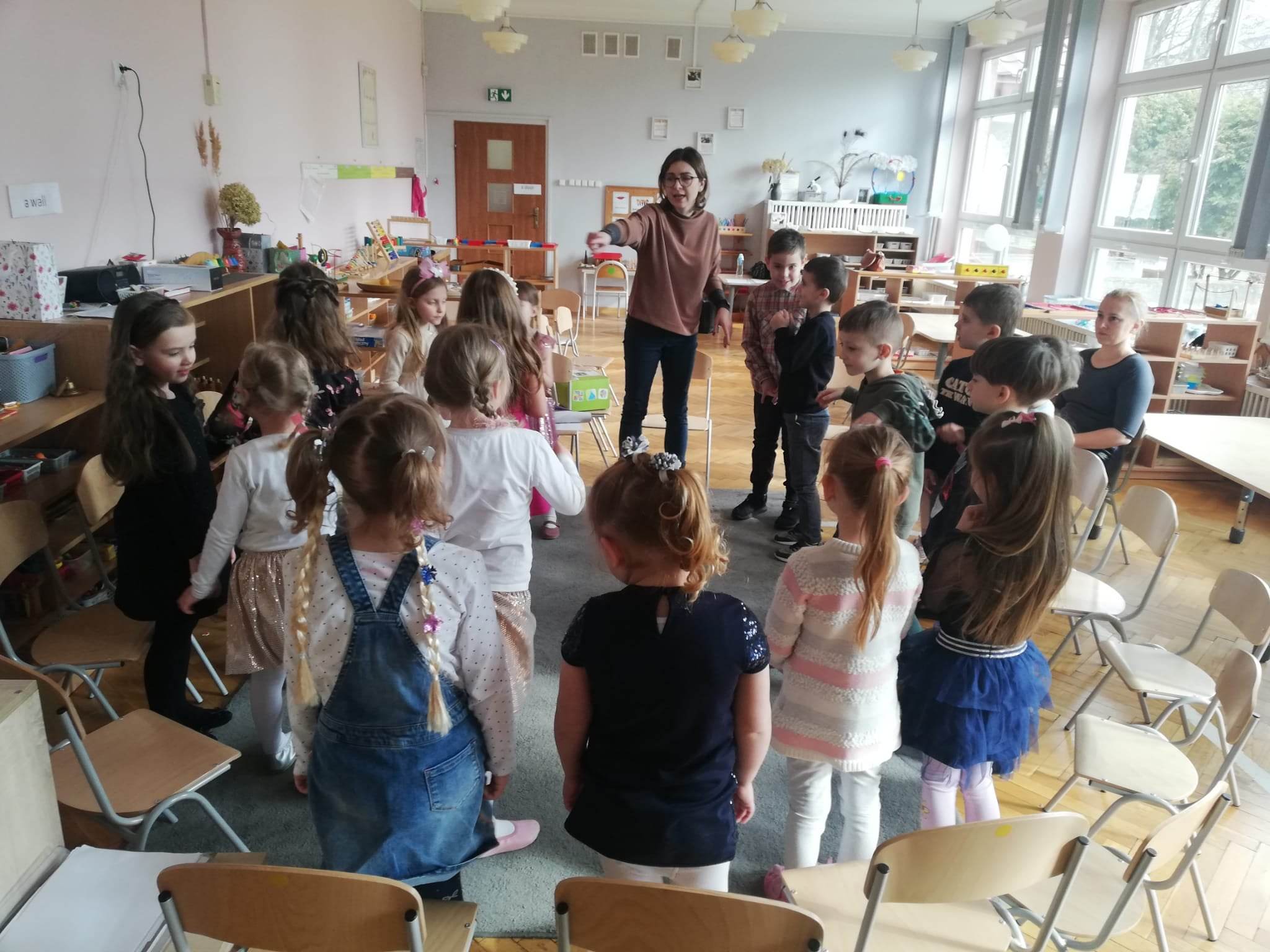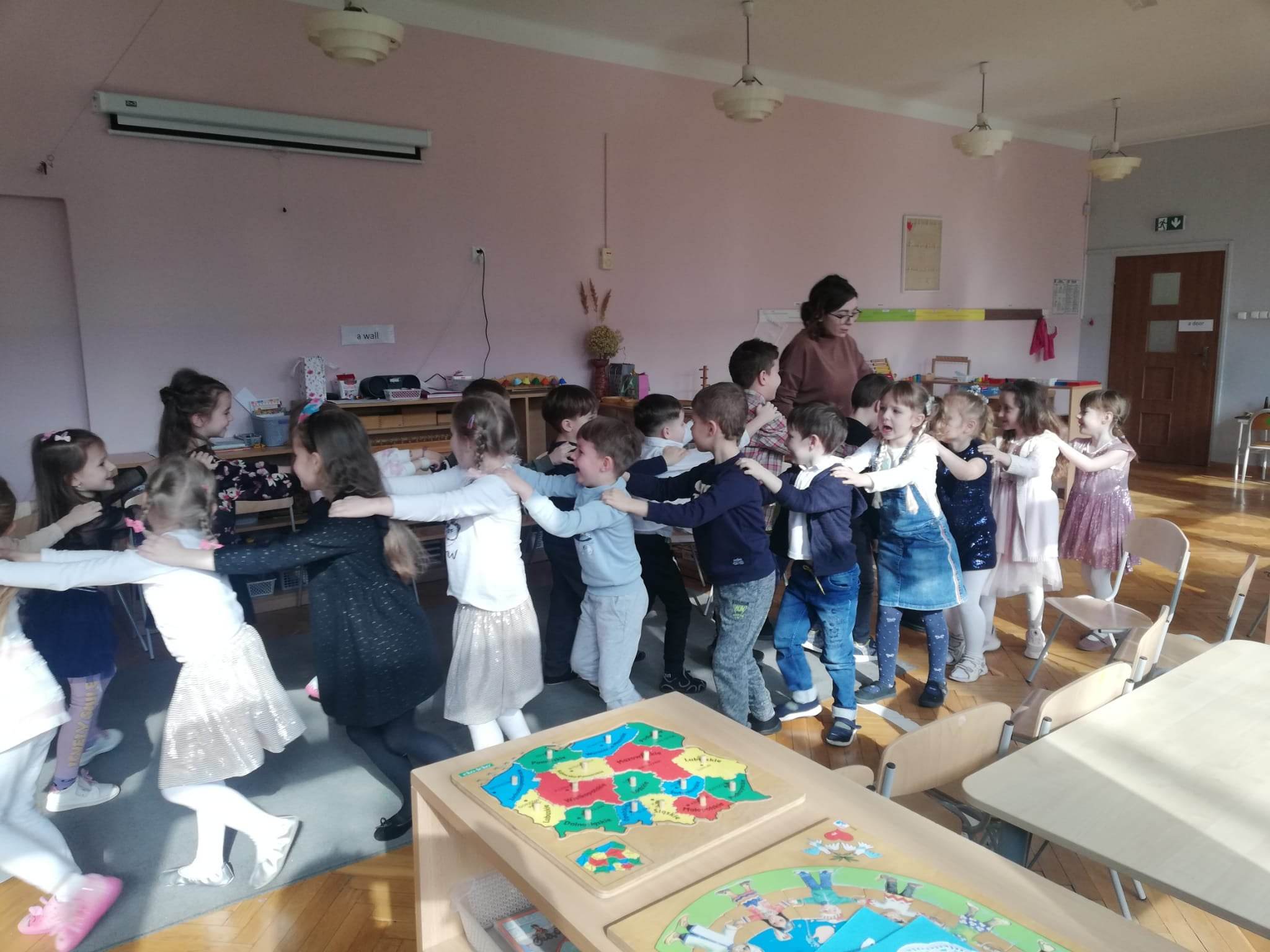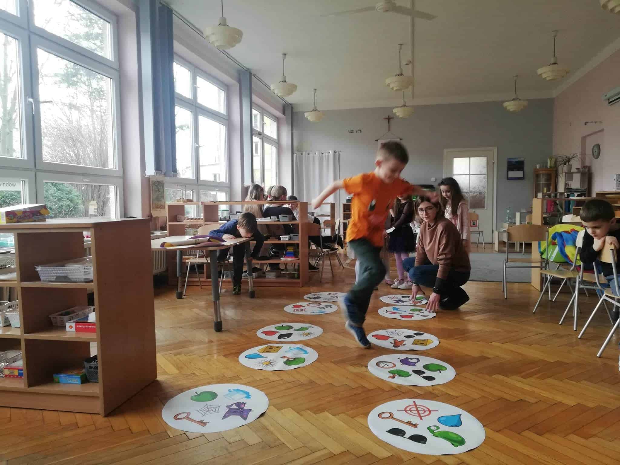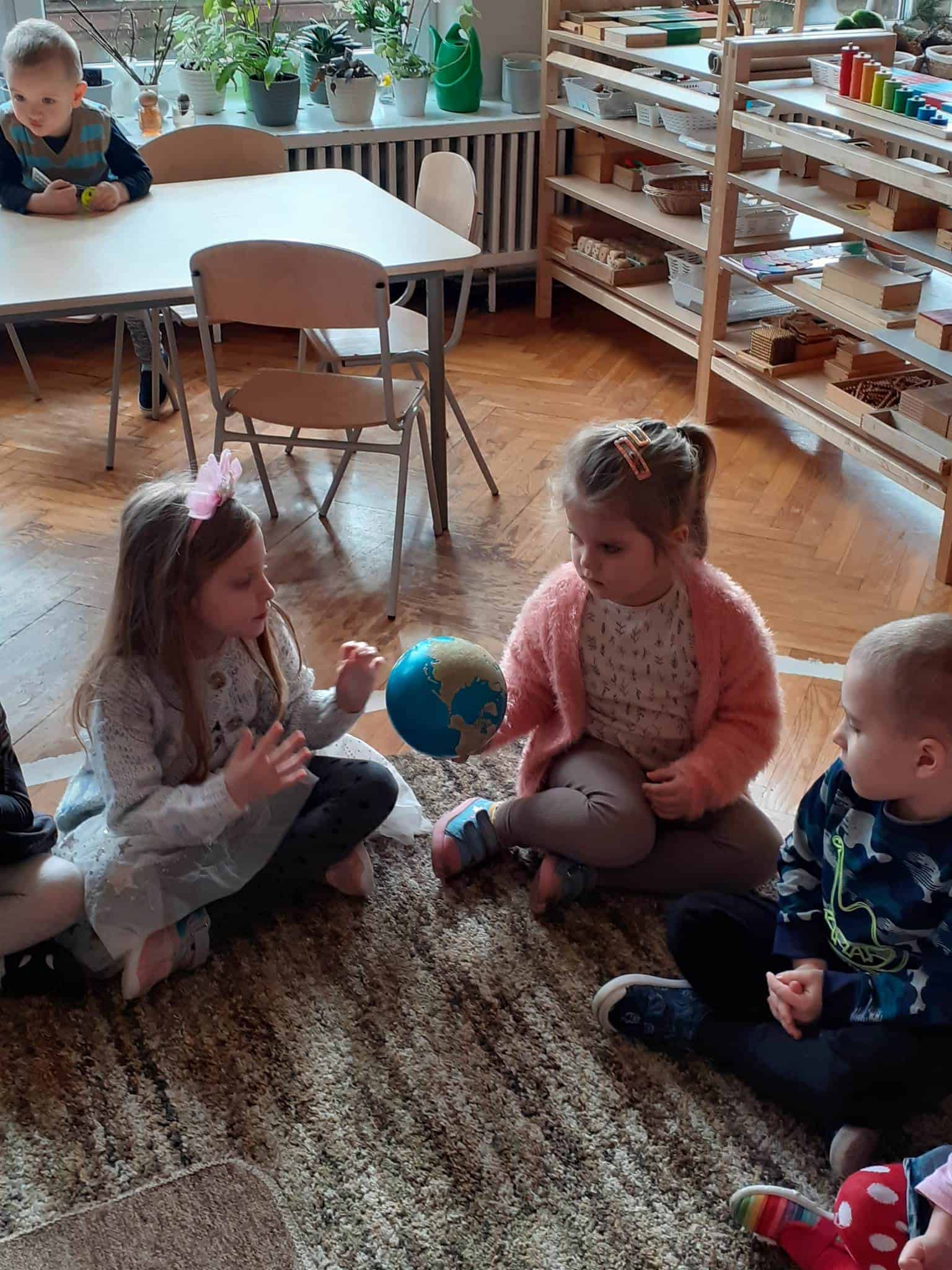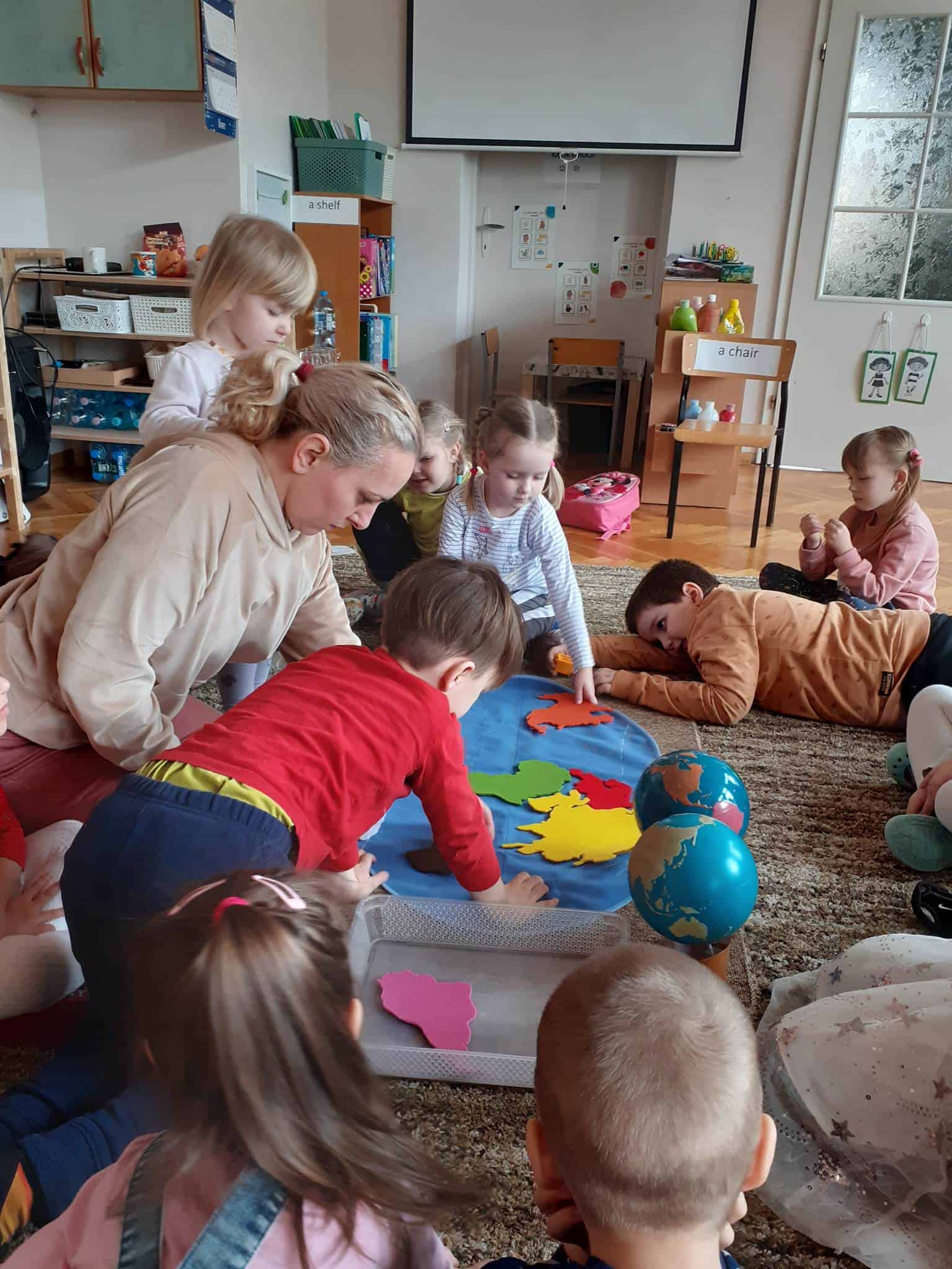 W mijającym tygodniu grupa Zielona wybrała się w pasjonującą podróż. Poznaliśmy europejskie kraje – te bliższe i te dalsze. Na początku tygodnia dzieci obejrzały film edukacyjny „Jak powstała Ziemia”. Rozmawialiśmy o powstaniu naszej planety na podstawie filmu oraz Wielkiej Lekcji Montessori, (którą przeprowadziła pani Ania dwa tygodnie wcześniej). Dzieci mogły zobaczyć jak Pangea się rozpada, a kontynenty odsuwają się od siebie. Dzieci zapoznały się z montessoriańskim Globusem Natury (na którym mogą „dotknąć” lądów i wód), oraz Globusem Kultury (gdzie kontynenty oznaczono różnymi kolorami). Z pomocą filcowej mapy świata dzieci poznały wzajemne położenie wszystkich kontynentów, porównywały wielkości kontynentów oraz ich nazwy. Dzieci zauważyły, że jedne nazwy są krótkie, inne długie, a niektóre nawet bardzo długie. Zauważyły także, że większość nazw kontynentów rozpoczyna się na tę samą literę. Wielozmysłowo poznaliśmy litery A i E, starszaki chętnie próbowały swoich sił w pisaniu tych liter w liniaturze, czy układaniu nazw kontynentów z ruchomego alfabetu. W kolejnych dniach skupiliśmy się na kontynencie, którego nazwa zaczyna się na inną literę od pozostałych. Dzieci zapoznały się krajami Europy: układały mapę puzzlową Europy, dopasowywały flagi do państw, grały w flagowe memory, samodzielnie też rysowały flagi państw Europy z użyciem metalowych matryc. Dzieci poznały także ukształtowanie powierzchni Europy, żyjące tu zwierzęta i rośliny. Pod koniec tygodnia mówiliśmy o sąsiadach Polski, o językach, o Unii Europejskiej. Dzieci słuchały krótkich informacji na temat życia dzieci w innych krajach, słuchaliśmy i próbowaliśmy śpiewać piosenkę „Panie Janie” w różnych językach, poznaliśmy niektóre zwroty i powitania w kilku językach europejskich oraz wysłuchaliśmy hymnu Unii Europejskiej. W ostatnim dniu odnajdywaliśmy miejsca na mapie Europy, z których pocztówki, magnesy i inne pamiątki przyniosły dzieci ze swoich domów, przeliczaliśmy ilość magnesów i pocztówek, tworzyliśmy zbiory i porównywaliśmy ich liczebność.