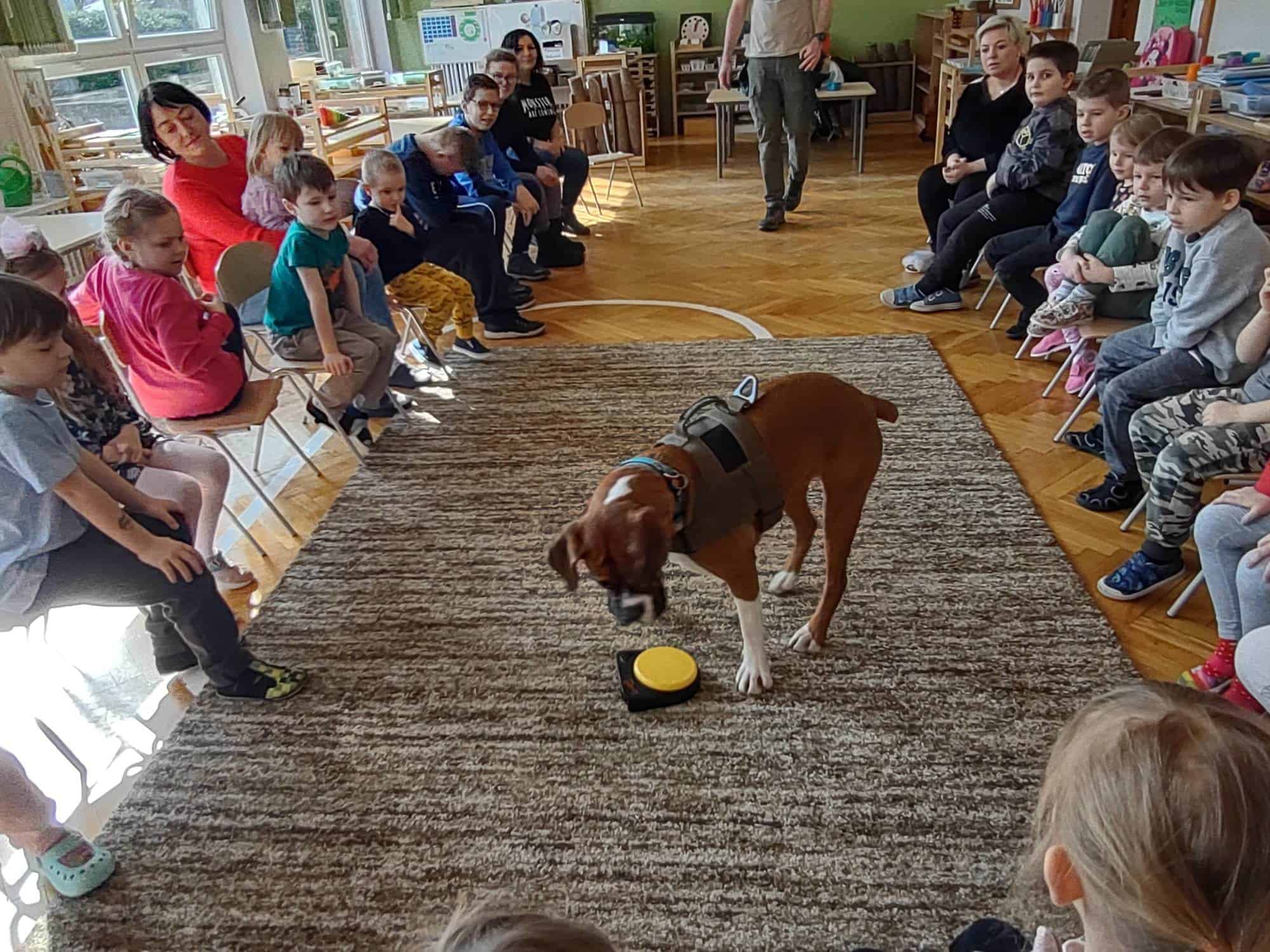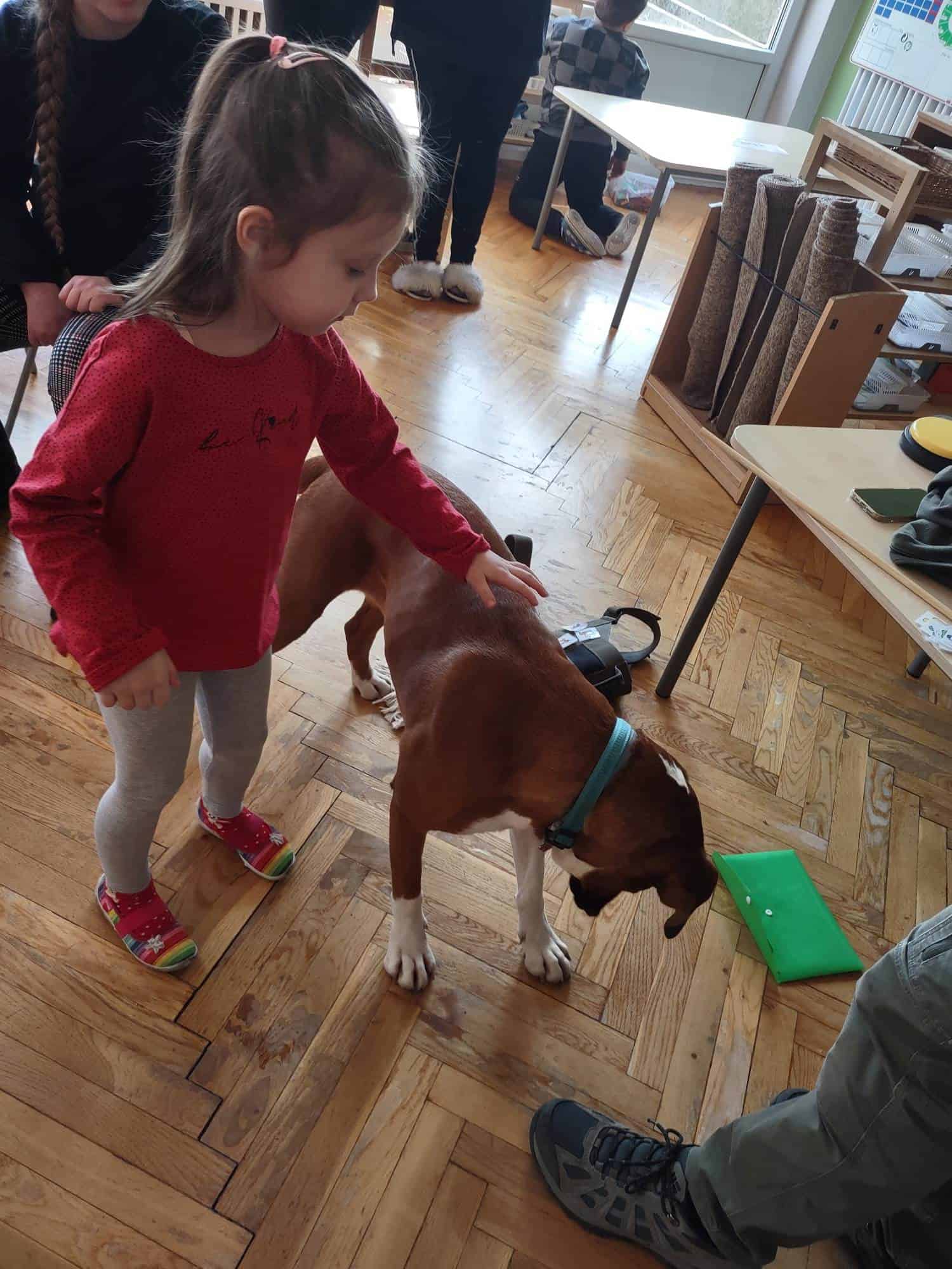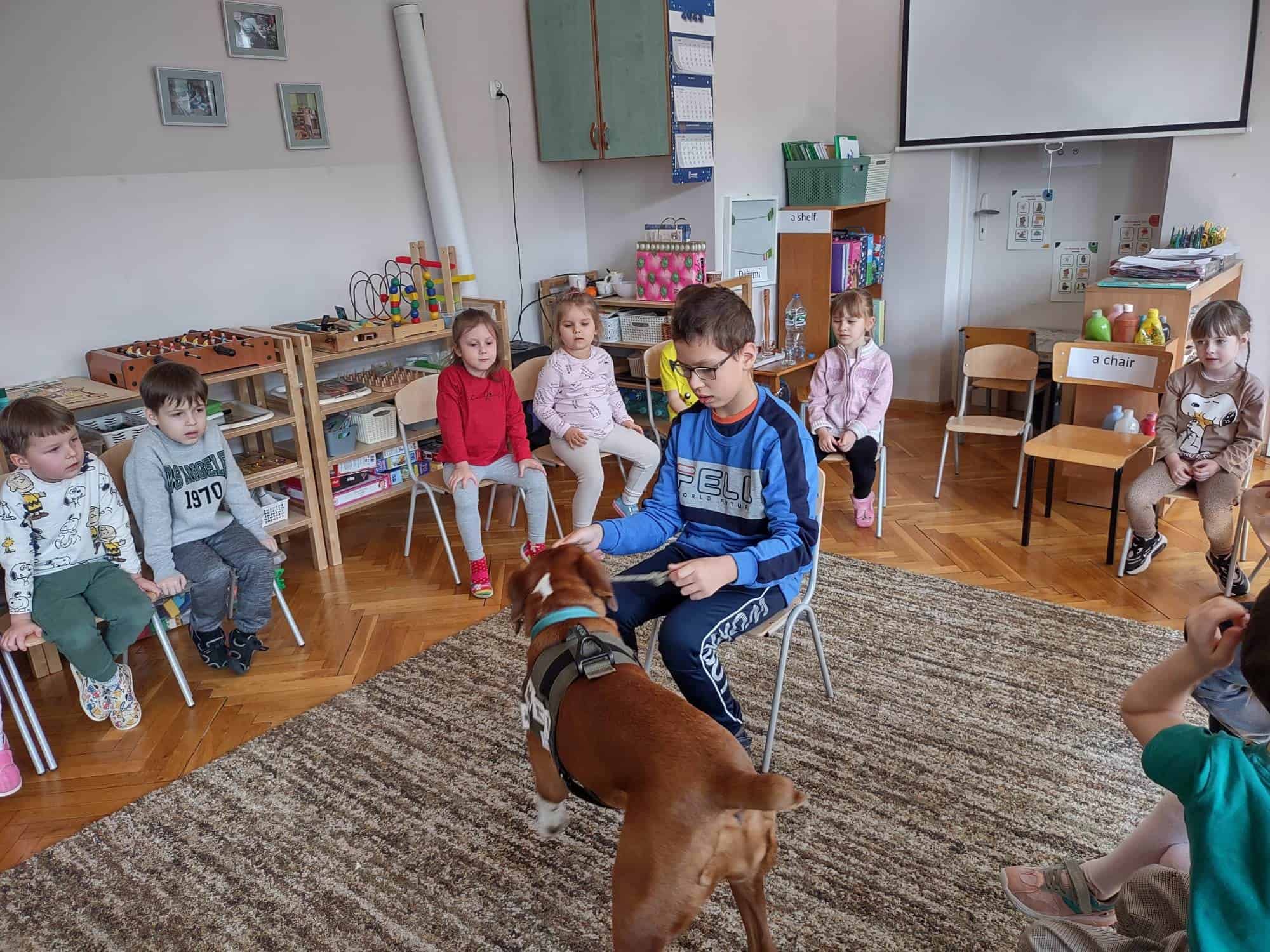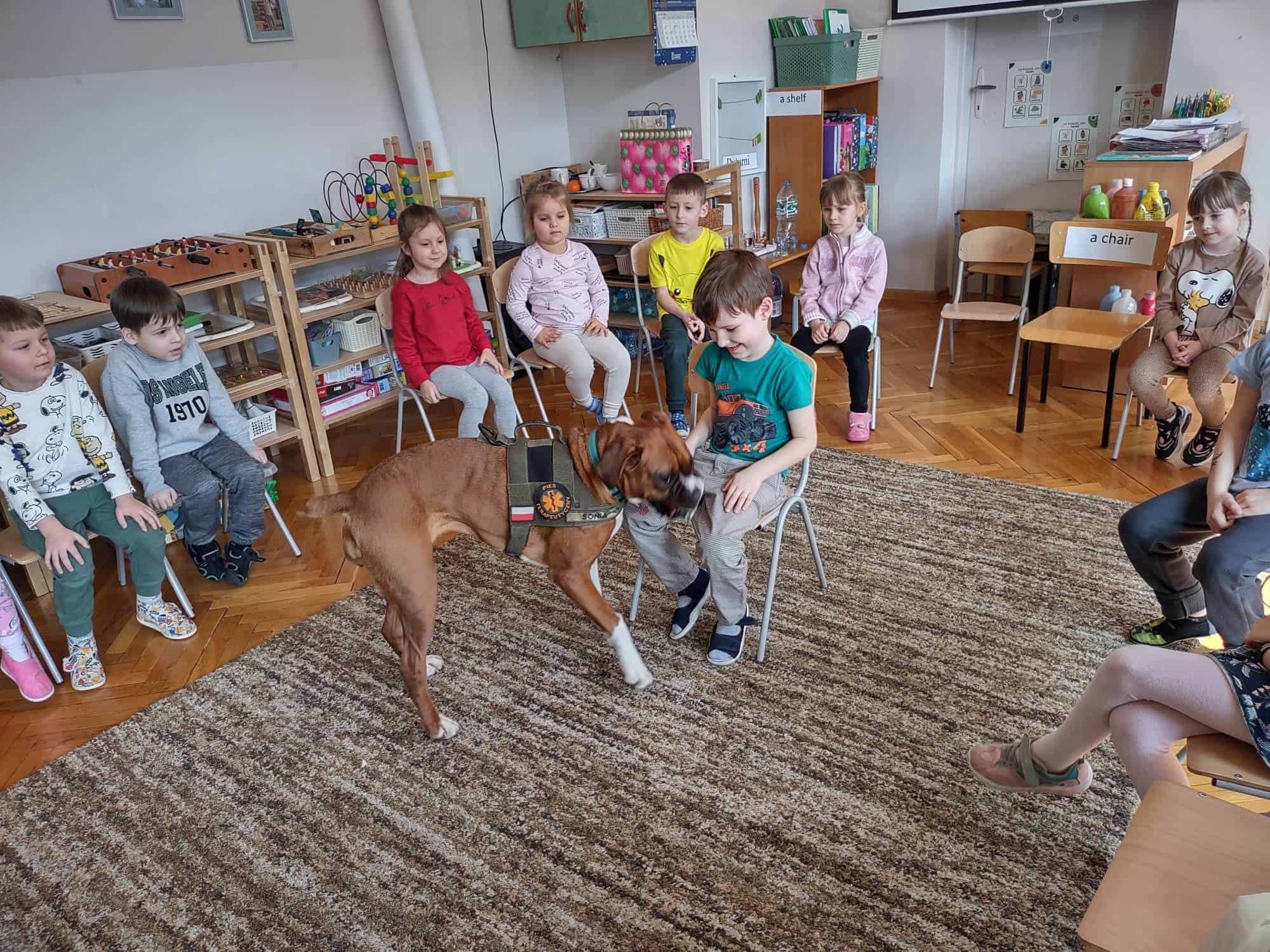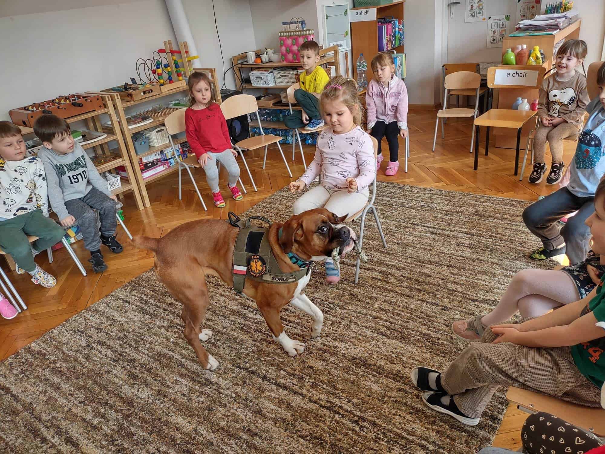 W trakcie zajęć z Sonią, Pan Witek, jej opiekun i przewodnik, pokazywał nam na czym polegają zajęcia z dogoterapii. W jaki sposób pies pomaga dzieciom w grupie, jak współdziała, rozwija umiejętności komunikacyjne, stymuluje rozwój sfery poznawczej, motorycznej i emocjonalno-społecznej. Sonia fantastycznie współpracowała i zachwycała nas poziomem swoich umiejętności i zdolności.