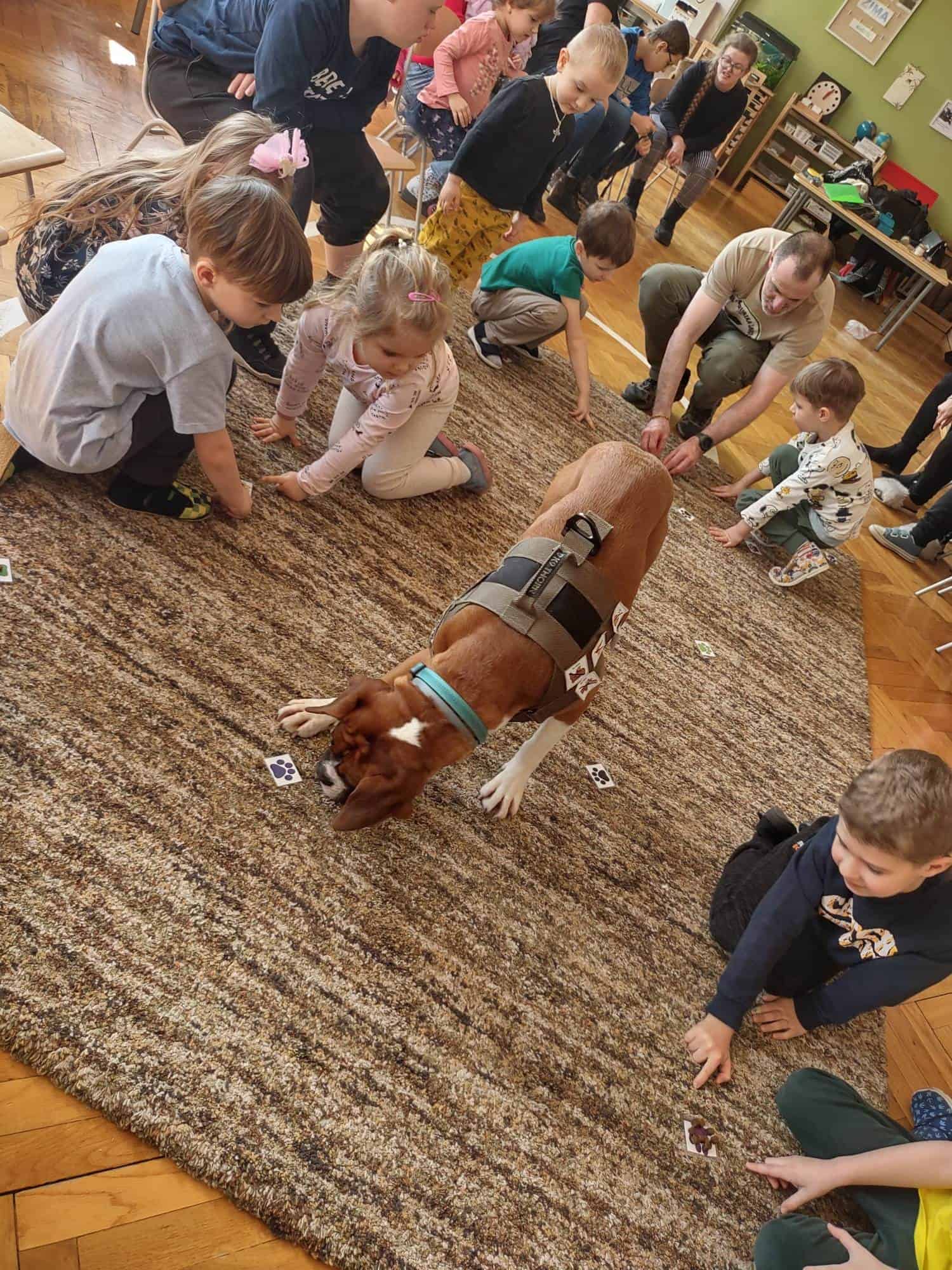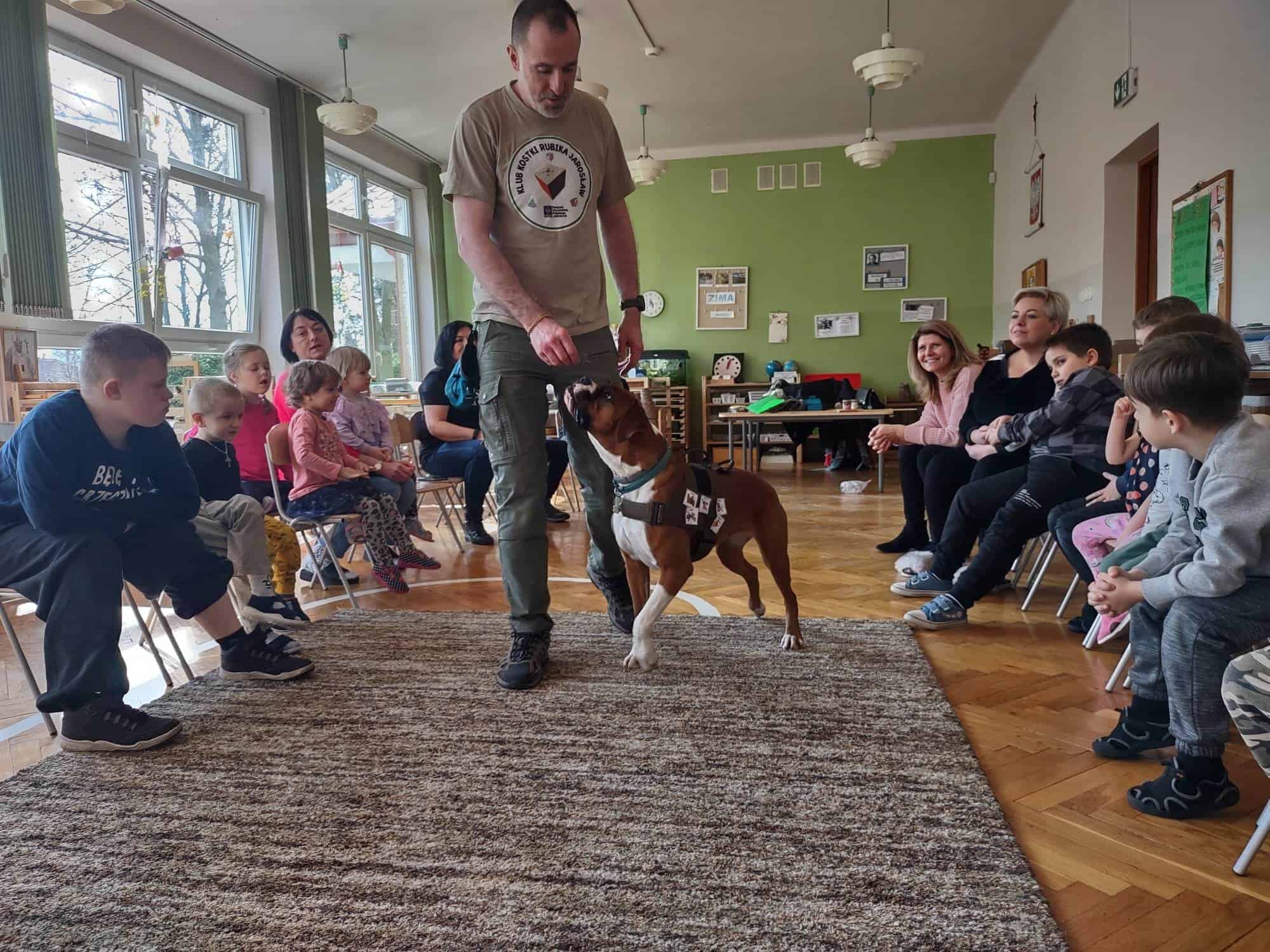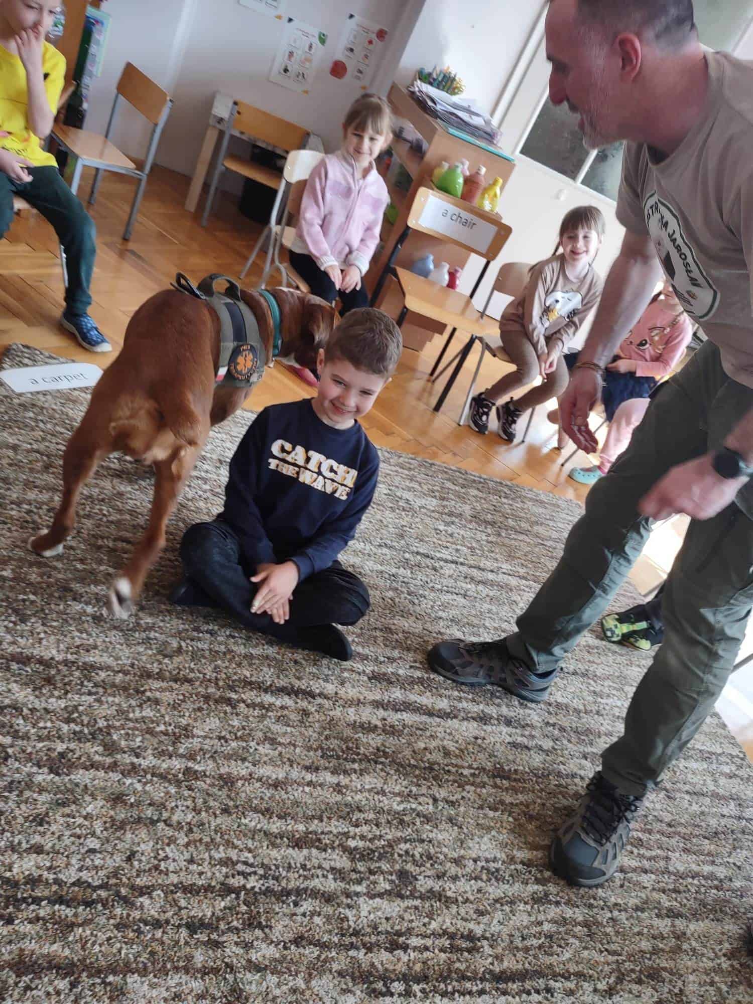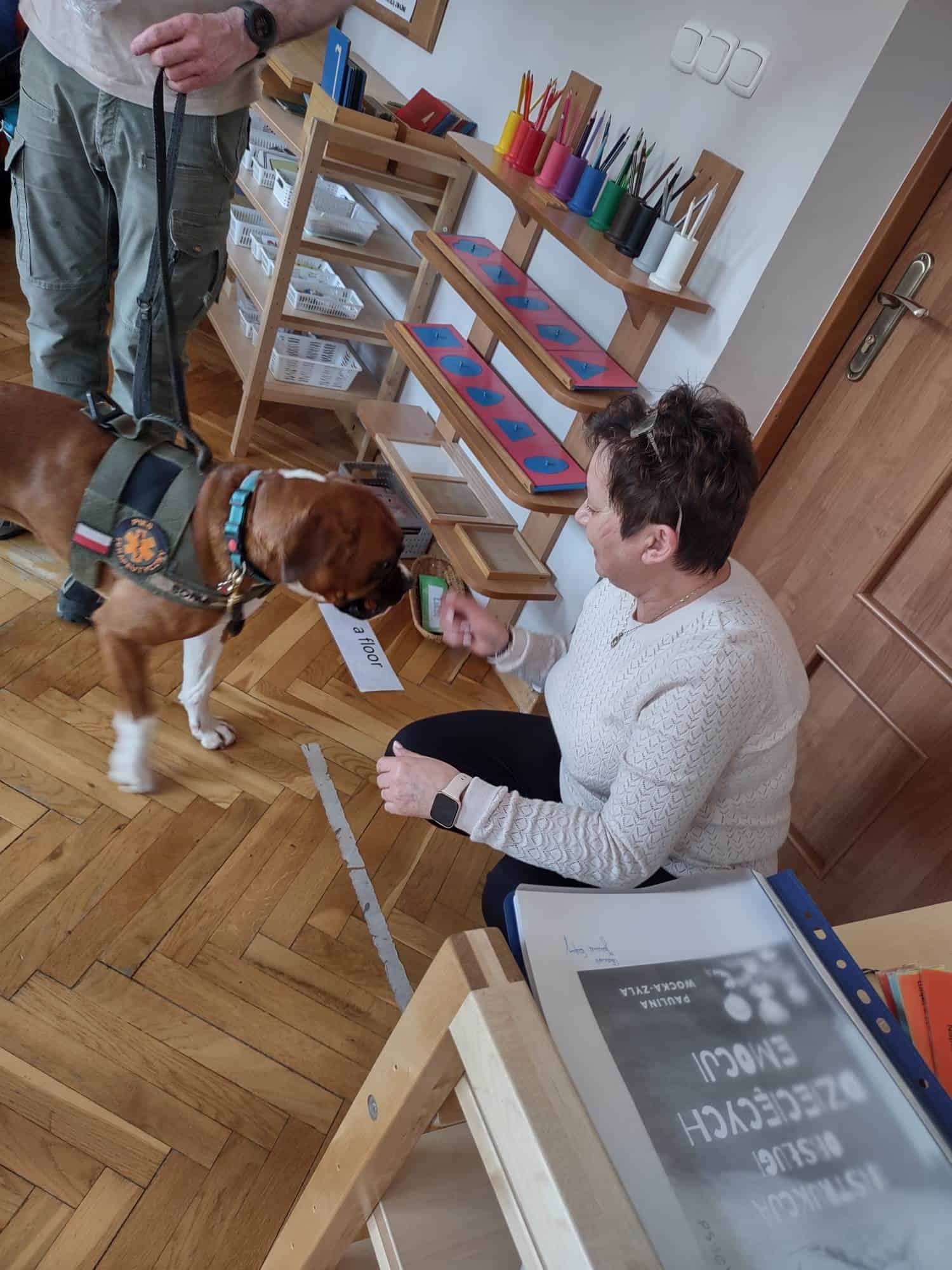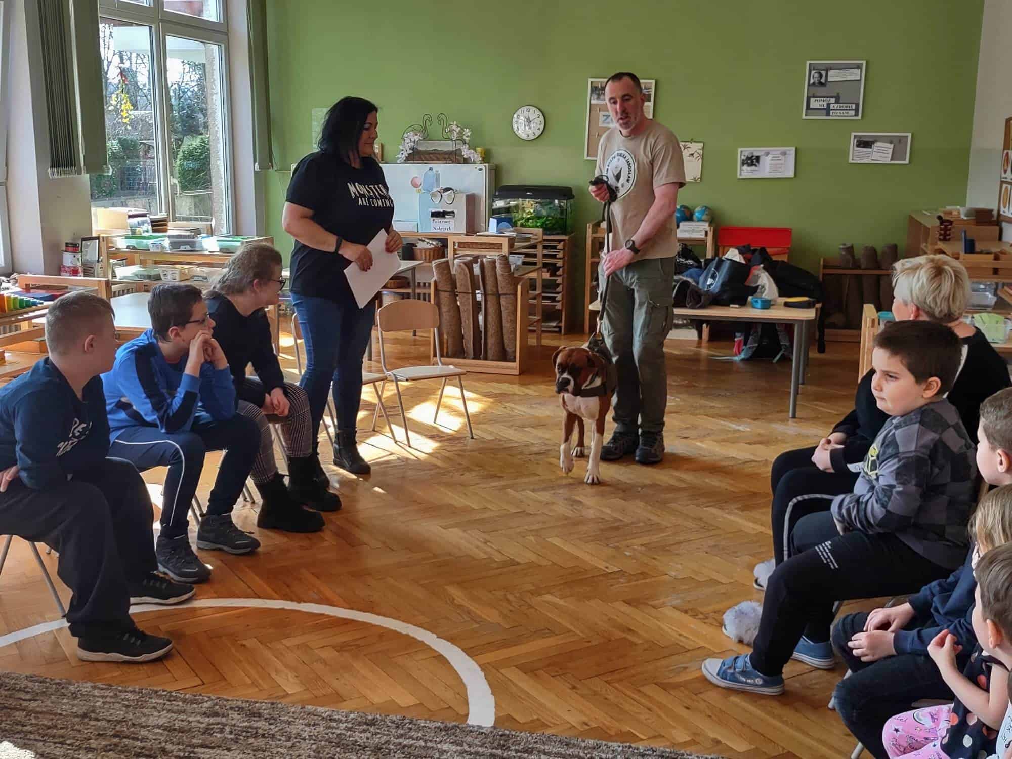 W trakcie zajęć z Sonią, Pan Witek, jej opiekun i przewodnik, pokazywał nam na czym polegają zajęcia z dogoterapii. W jaki sposób pies pomaga dzieciom w grupie, jak współdziała, rozwija umiejętności komunikacyjne, stymuluje rozwój sfery poznawczej, motorycznej i emocjonalno-społecznej. Sonia fantastycznie współpracowała i zachwycała nas poziomem swoich umiejętności i zdolności.