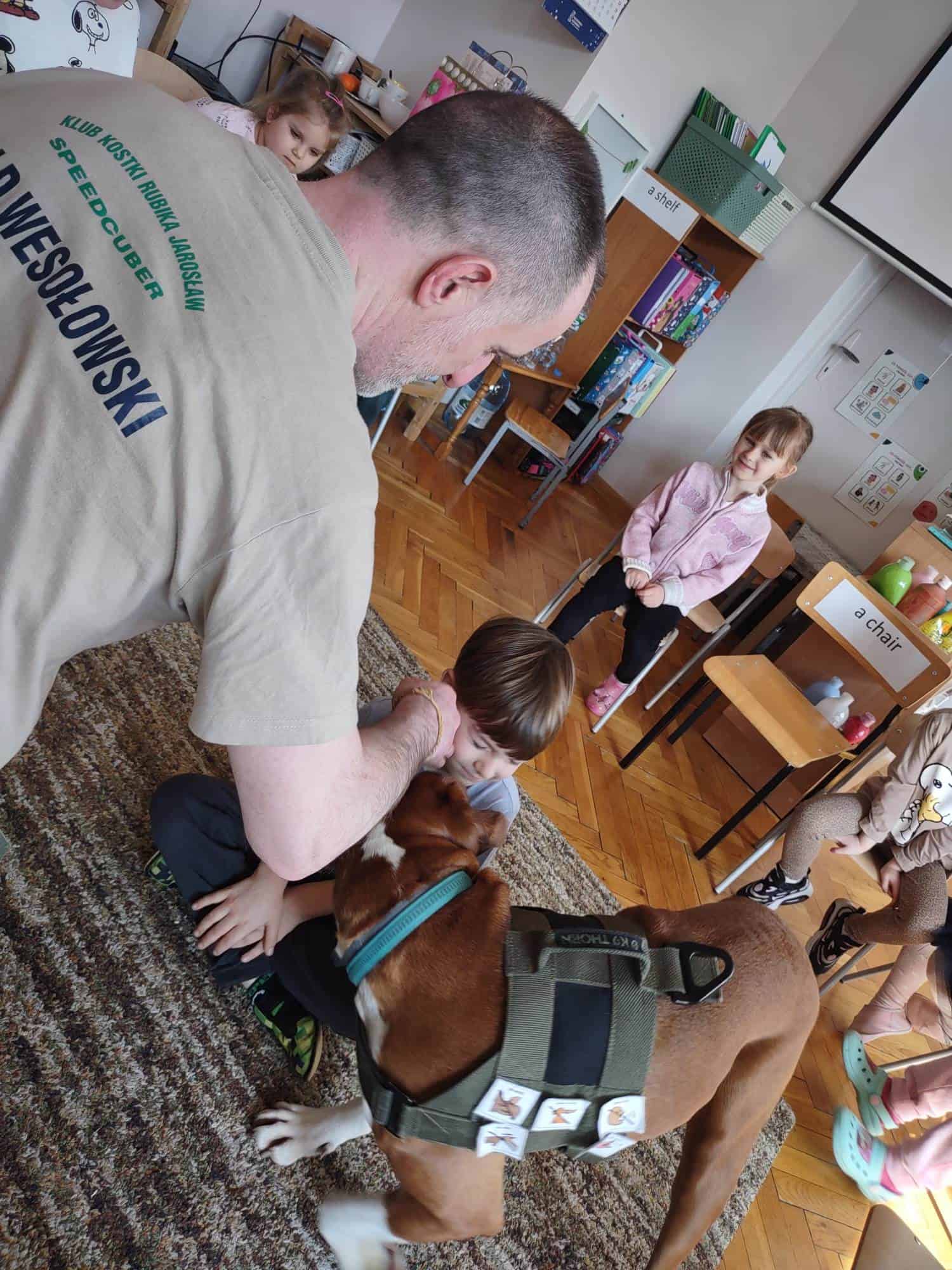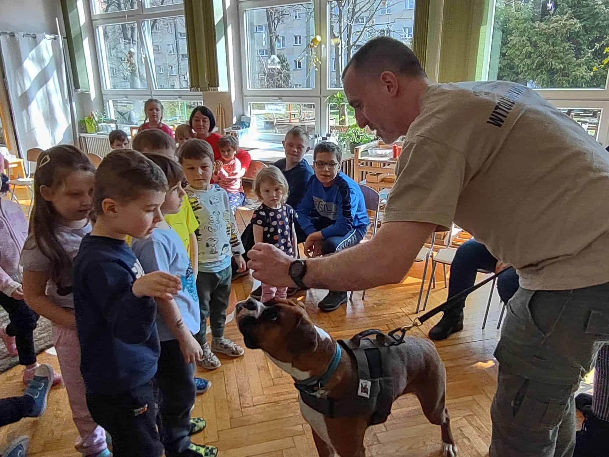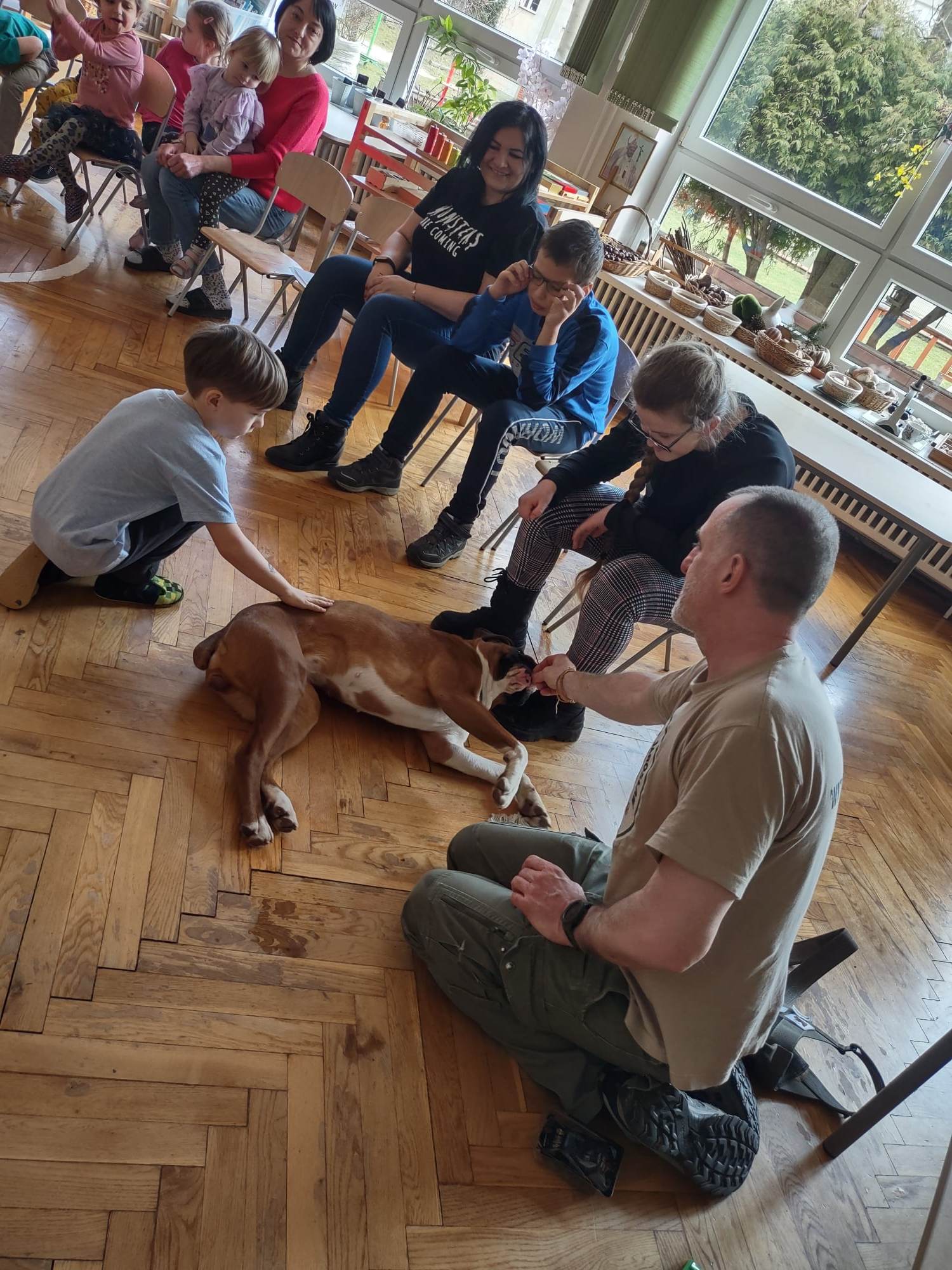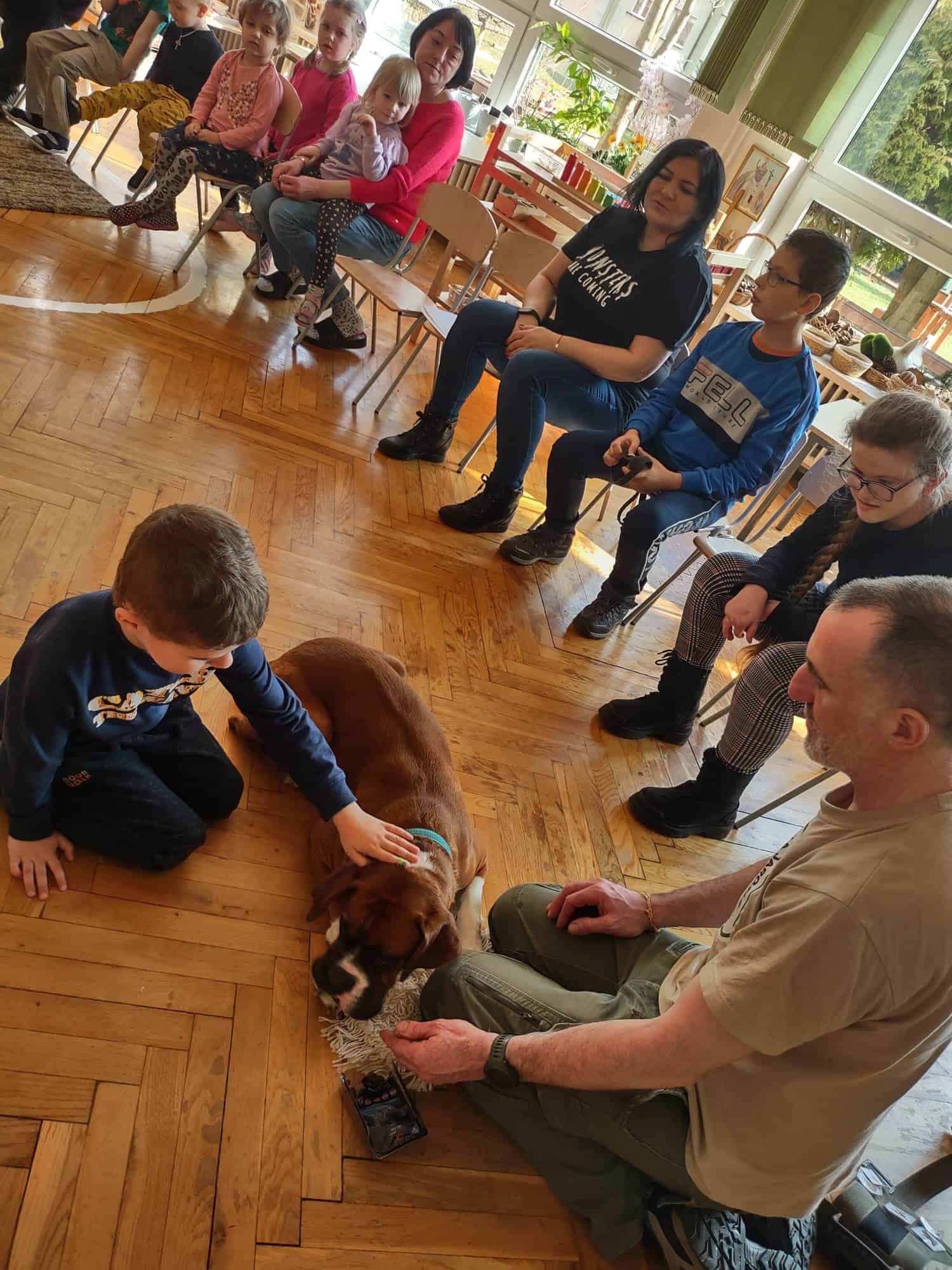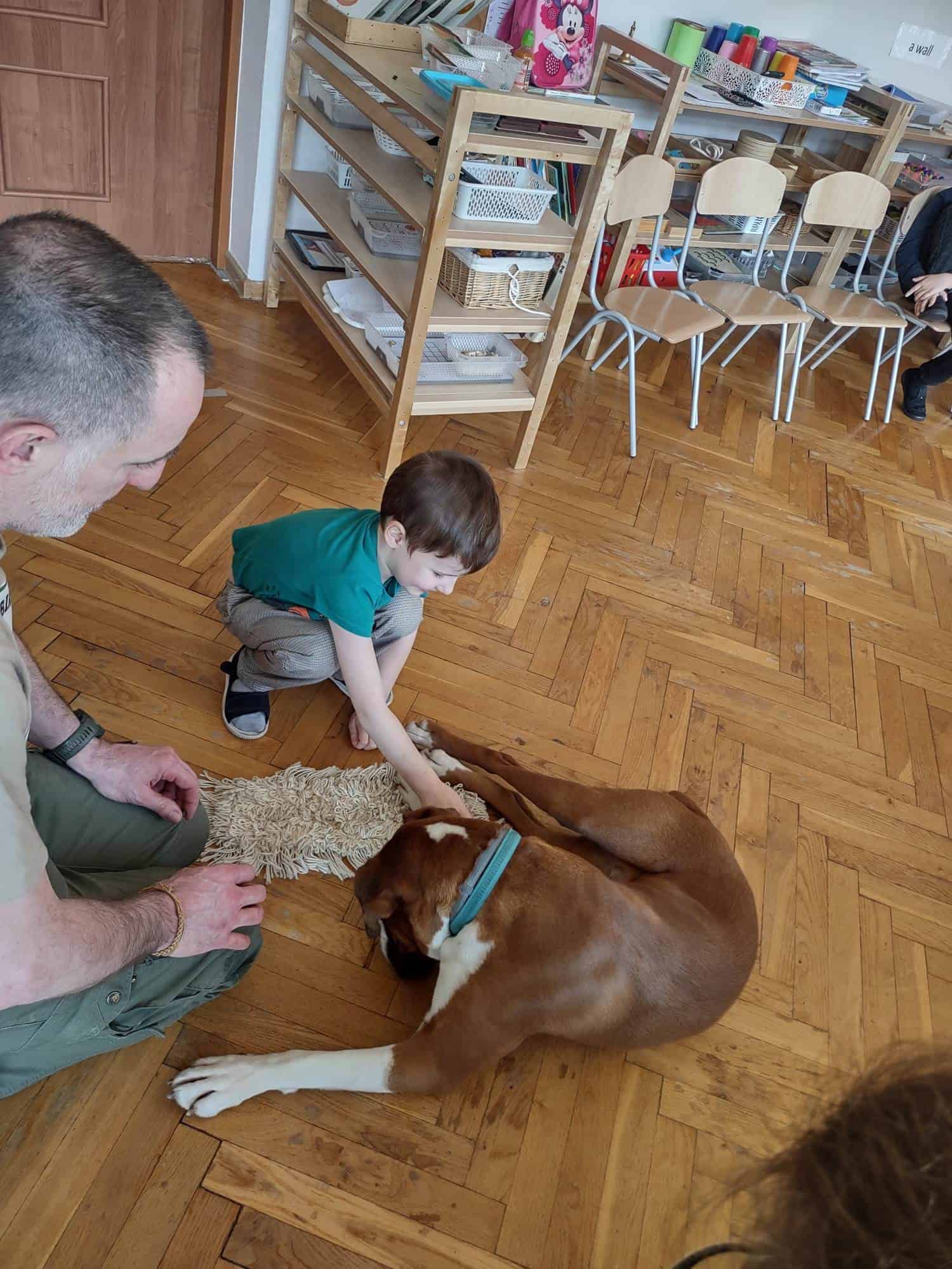 W trakcie zajęć z Sonią, Pan Witek, jej opiekun i przewodnik, pokazywał nam na czym polegają zajęcia z dogoterapii. W jaki sposób pies pomaga dzieciom w grupie, jak współdziała, rozwija umiejętności komunikacyjne, stymuluje rozwój sfery poznawczej, motorycznej i emocjonalno-społecznej. Sonia fantastycznie współpracowała i zachwycała nas poziomem swoich umiejętności i zdolności.