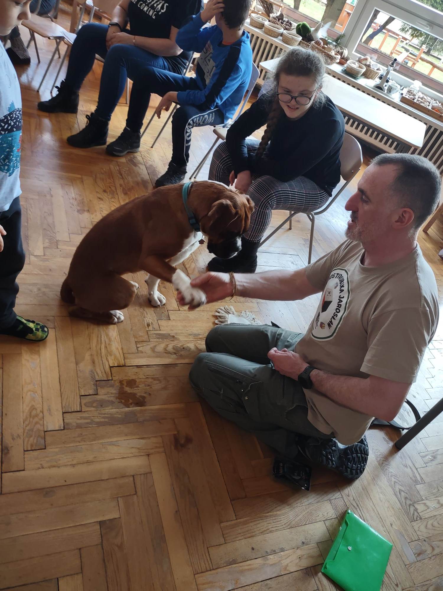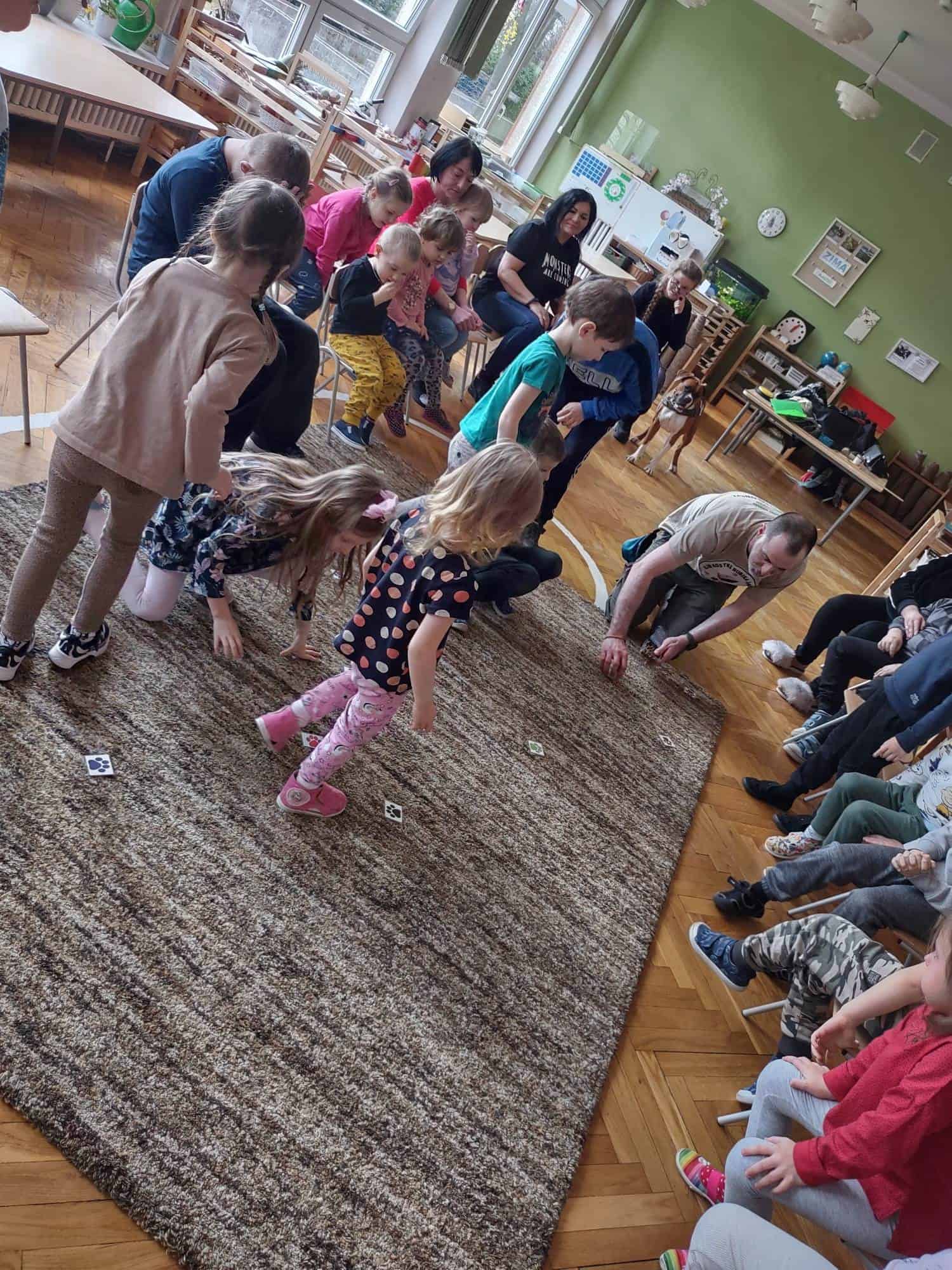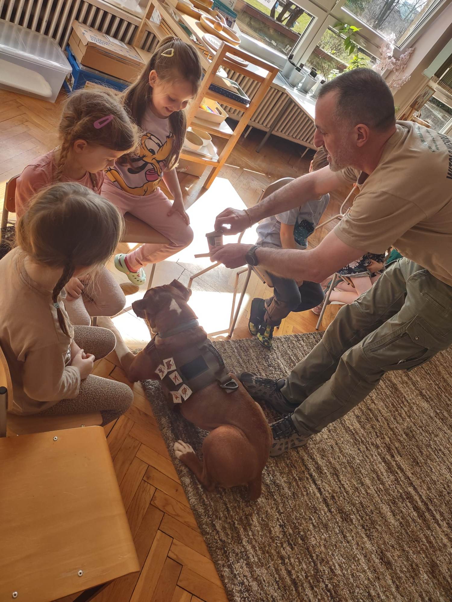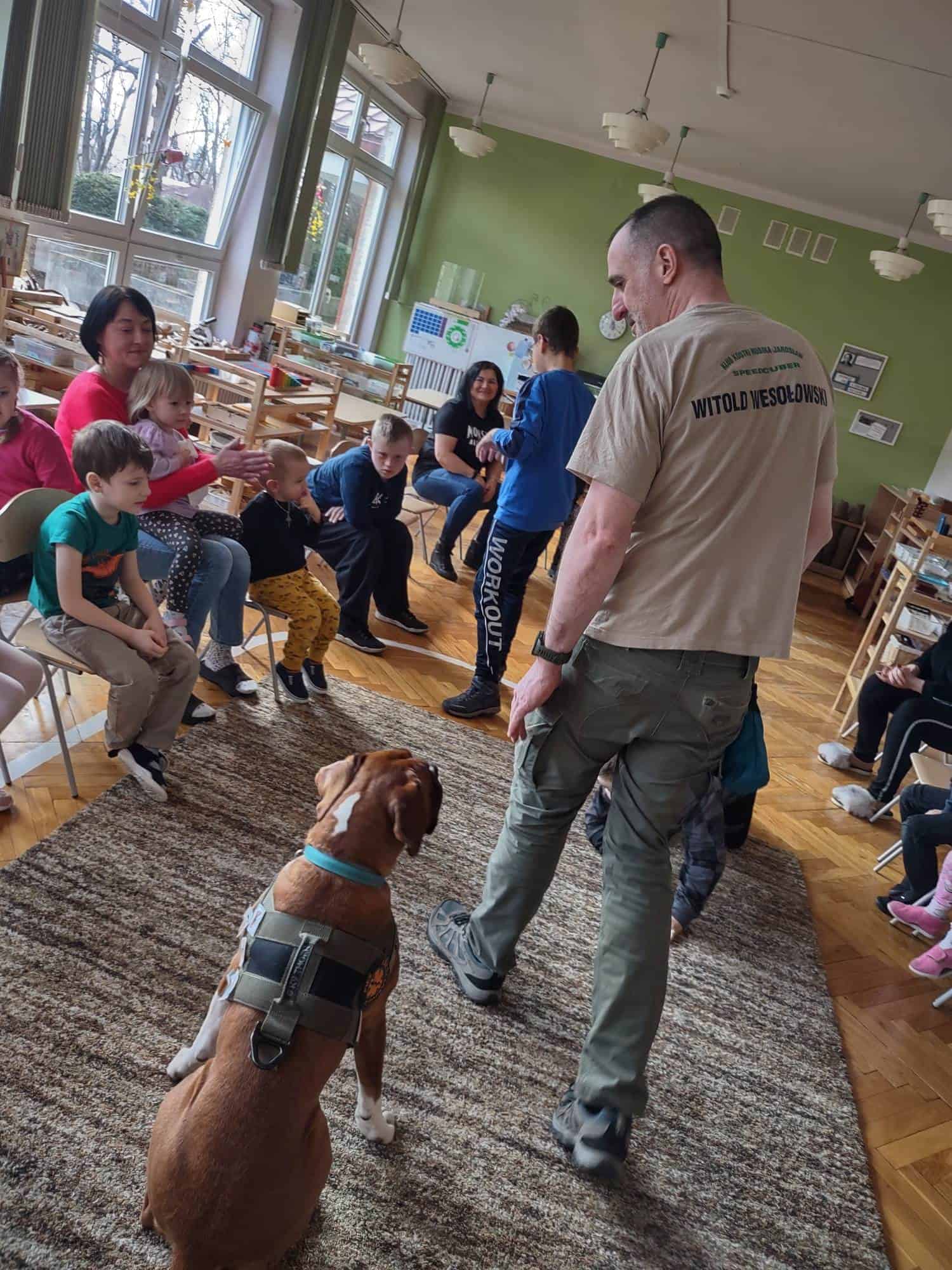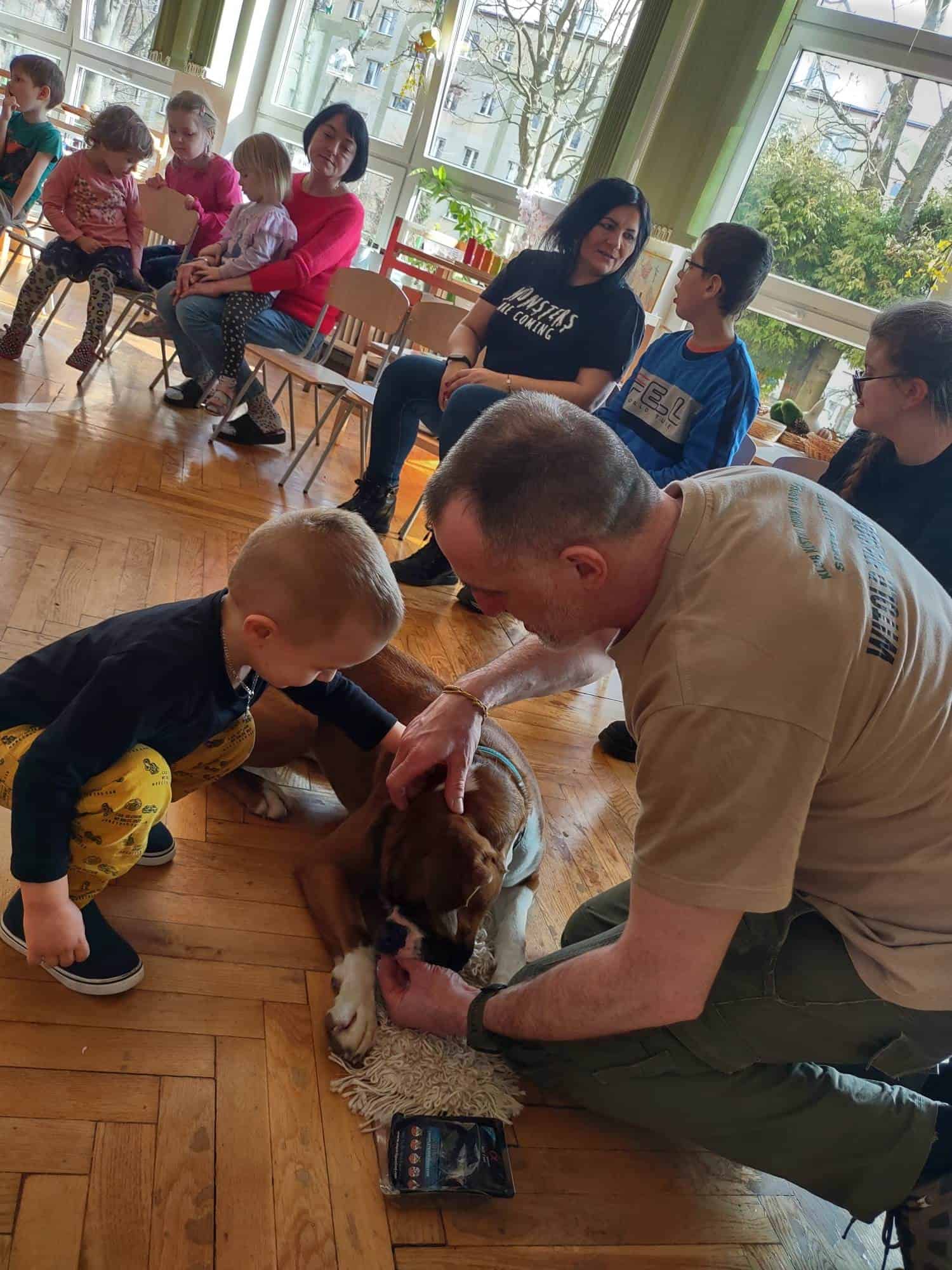W trakcie zajęć z Sonią, Pan Witek, jej opiekun i przewodnik, pokazywał nam na czym polegają zajęcia z dogoterapii. W jaki sposób pies pomaga dzieciom w grupie, jak współdziała, rozwija umiejętności komunikacyjne, stymuluje rozwój sfery poznawczej, motorycznej i emocjonalno-społecznej. Sonia fantastycznie współpracowała i zachwycała nas poziomem swoich umiejętności i zdolności.