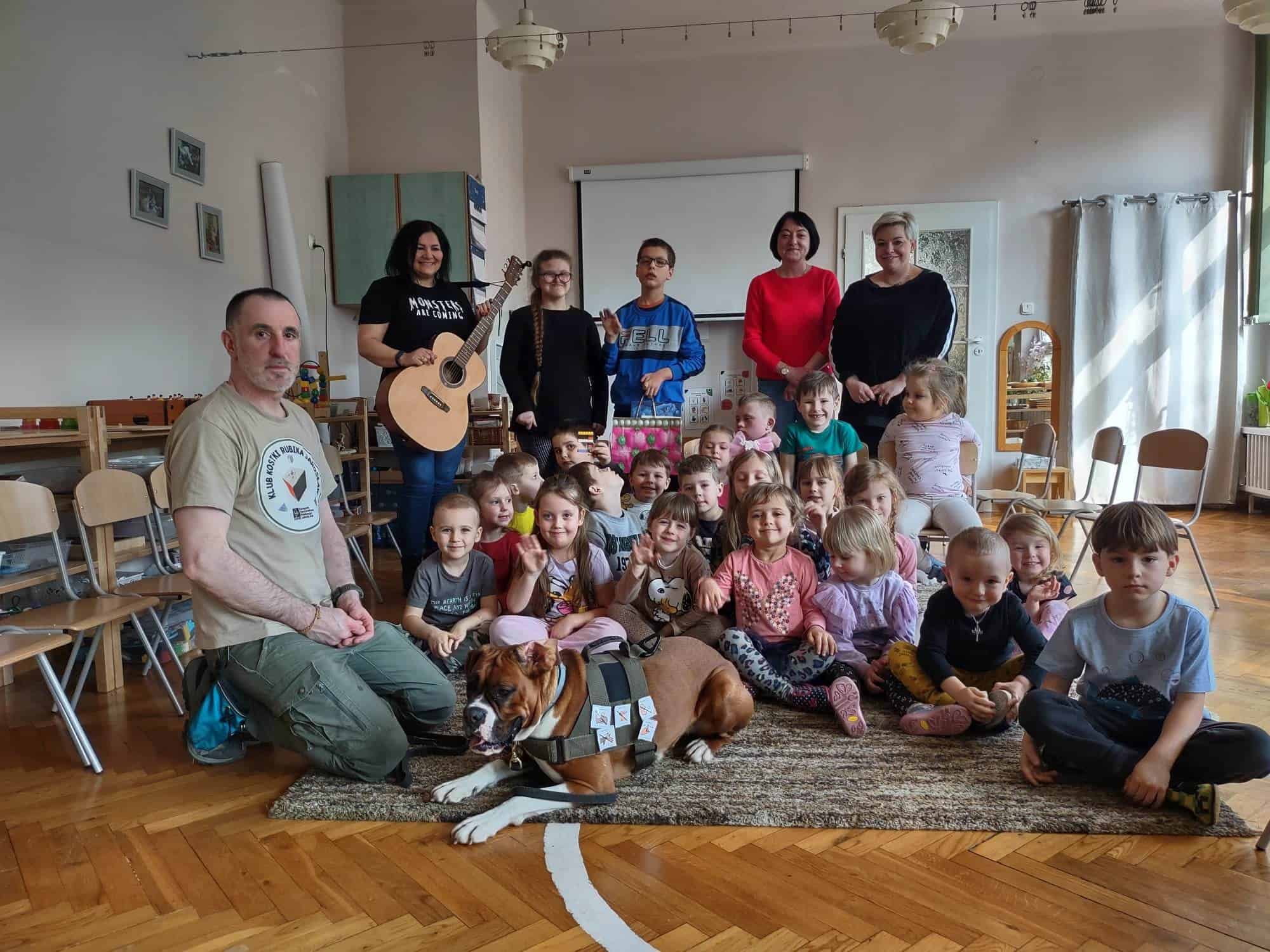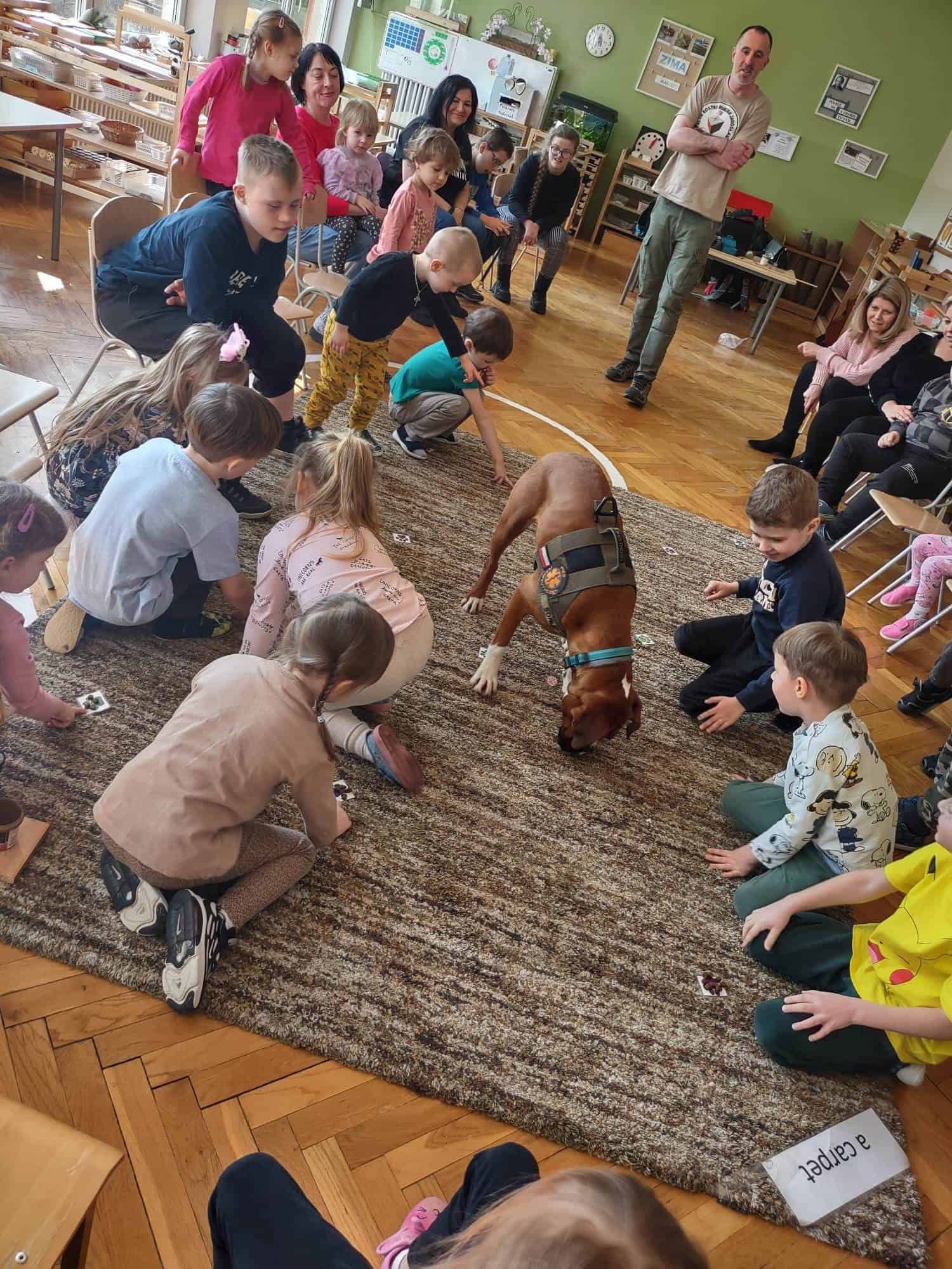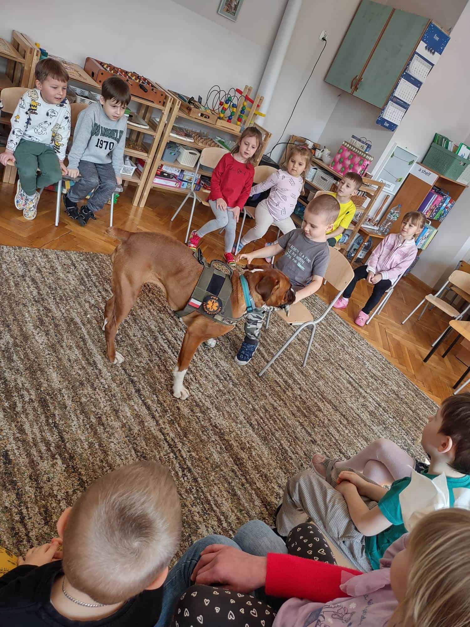 W ubiegłym tygodniu mieliśmy niezmierny zaszczyt gościć w progach naszej grupy wyjątkową drużynę, wyjątkową, bo podróżującą wraz z psem terapeutą o wdzięcznym imieniu Sonia 🙂 Dogoekipa, bo tak o sobie mówią, wyruszyła z drugiej części miasta, aby spotkać się z naszymi przedszkolakami, aby opowiedzieć im o tym, jaką rolę w życiu ludzi może pełnić pies, jak może pomagać w różnych sytuacjach wykorzystując do tego celu swoje zdolności…a Sonia miała ich naprawdę dużo!