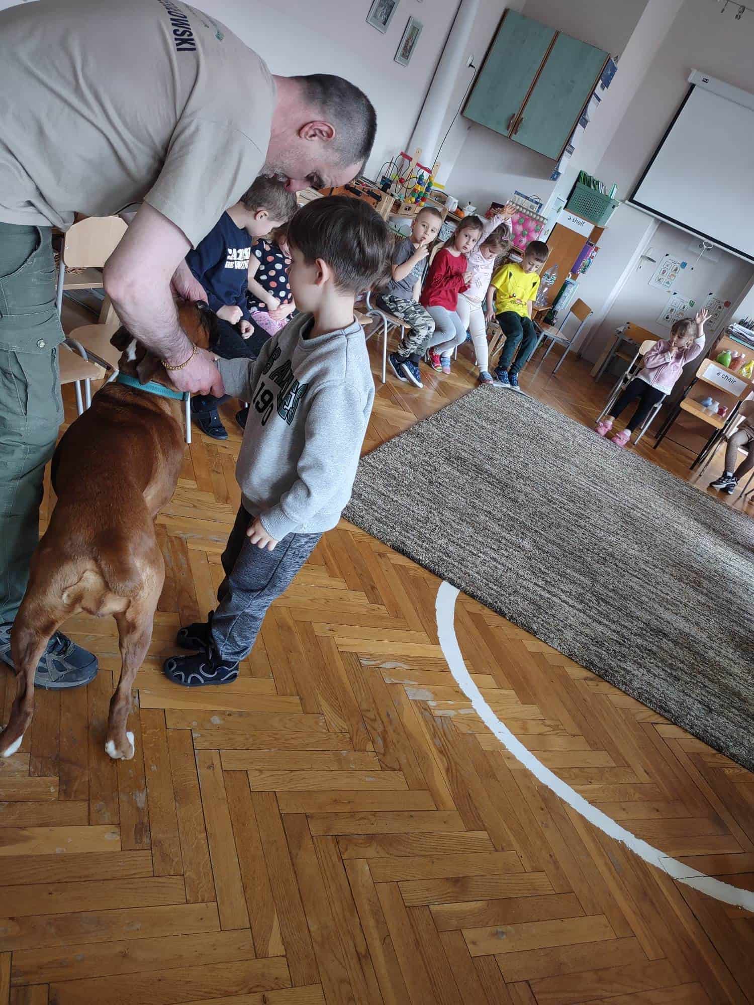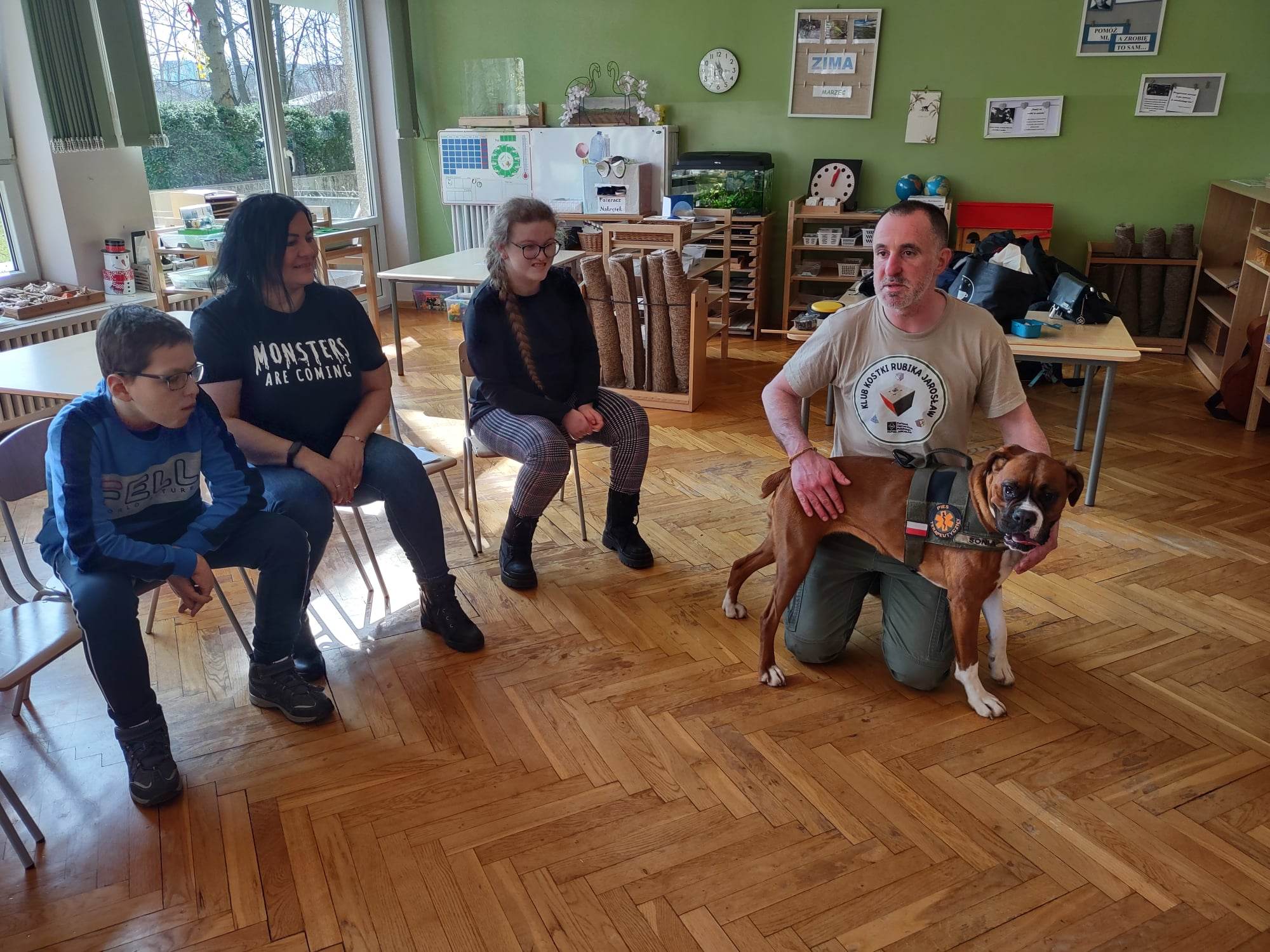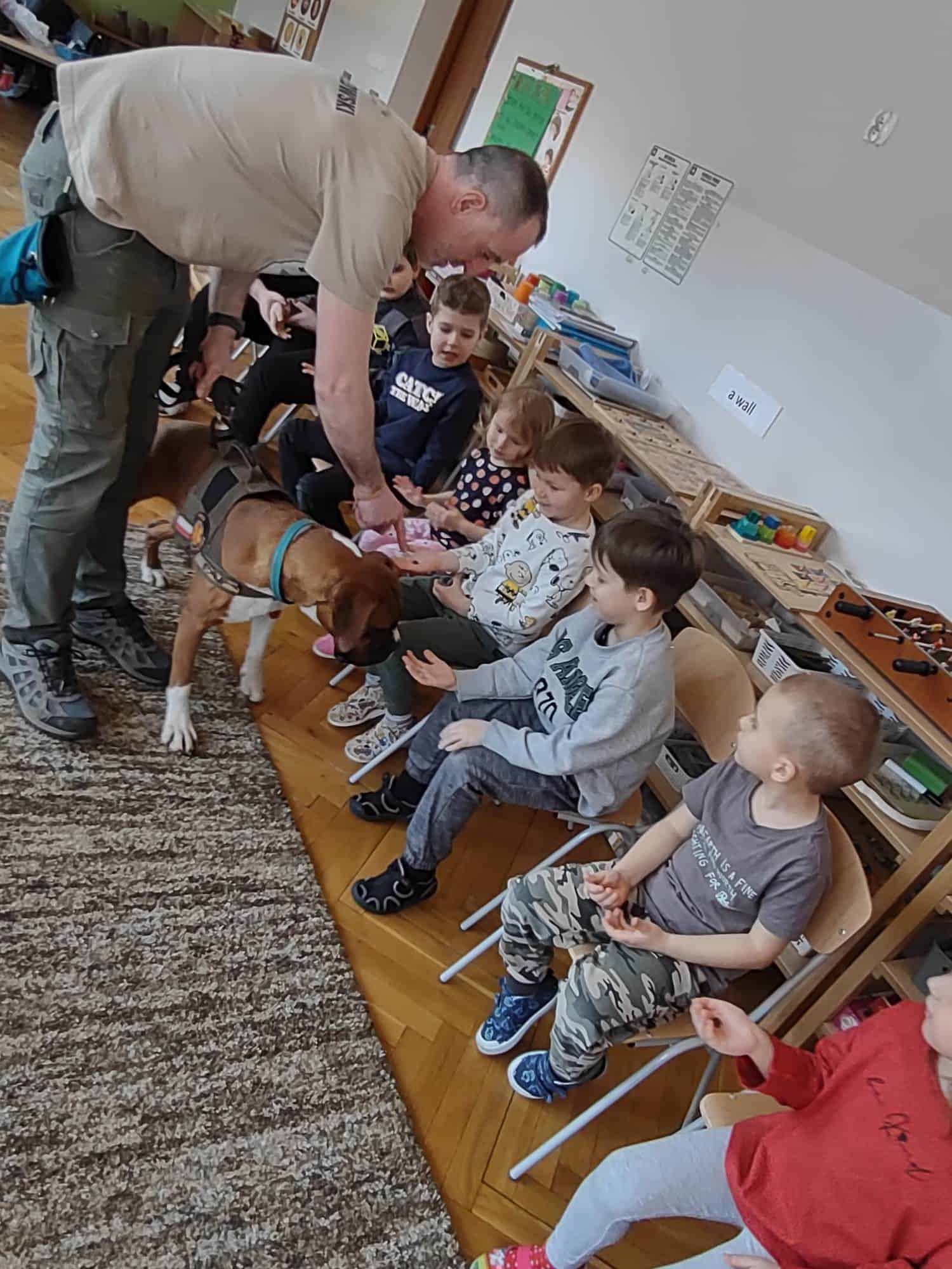 W ubiegłym tygodniu mieliśmy niezmierny zaszczyt gościć w progach naszej grupy wyjątkową drużynę, wyjątkową, bo podróżującą wraz z psem terapeutą o wdzięcznym imieniu Sonia 🙂 Dogoekipa, bo tak o sobie mówią, wyruszyła z drugiej części miasta, aby spotkać się z naszymi przedszkolakami, aby opowiedzieć im o tym, jaką rolę w życiu ludzi może pełnić pies, jak może pomagać w różnych sytuacjach wykorzystując do tego celu swoje zdolności…a Sonia miała ich naprawdę dużo!