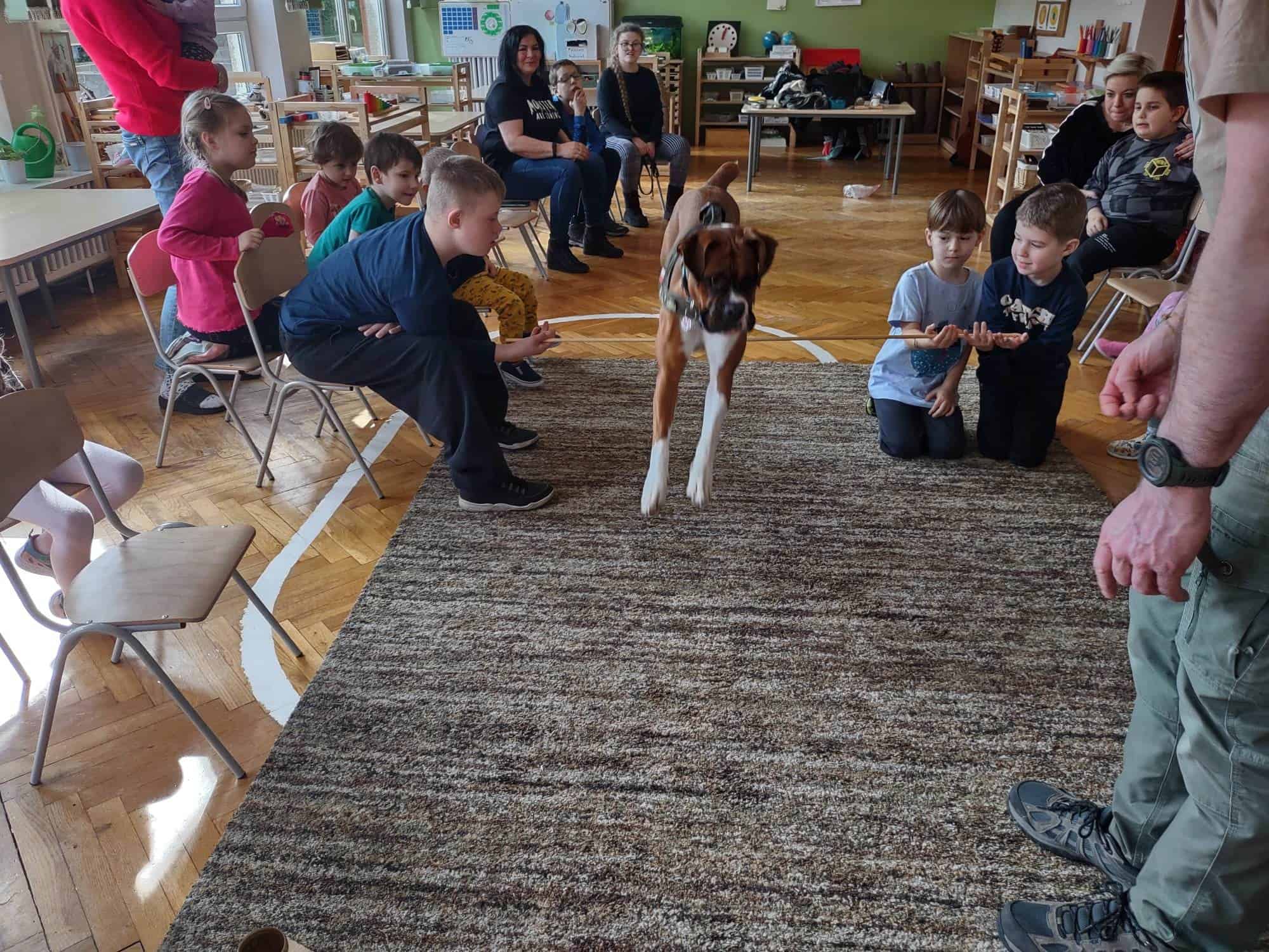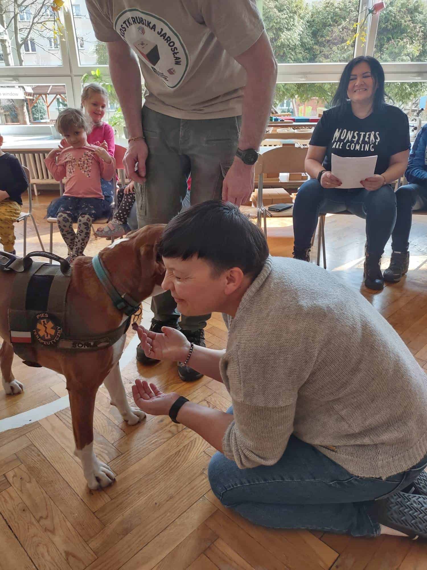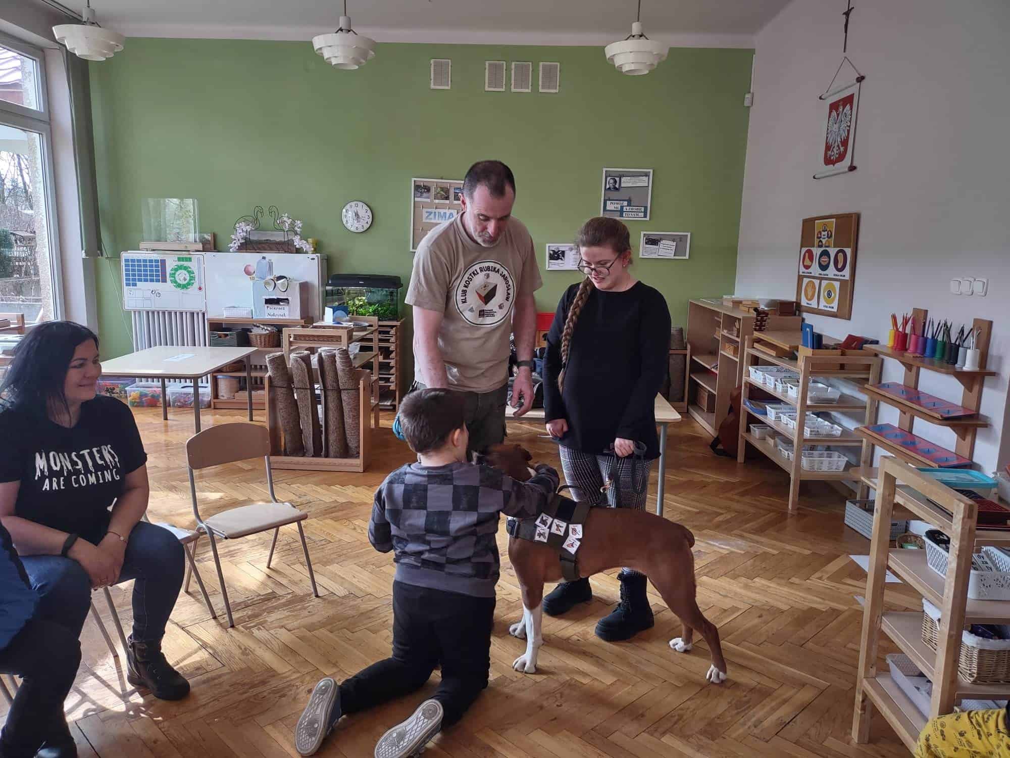 W trakcie zajęć z Sonią, Pan Witek, jej opiekun i przewodnik, pokazywał nam na czym polegają zajęcia z dogoterapii. W jaki sposób pies pomaga dzieciom w grupie, jak współdziała, rozwija umiejętności komunikacyjne, stymuluje rozwój sfery poznawczej, motorycznej i emocjonalno-społecznej. Sonia fantastycznie współpracowała i zachwycała nas poziomem swoich umiejętności i zdolności.