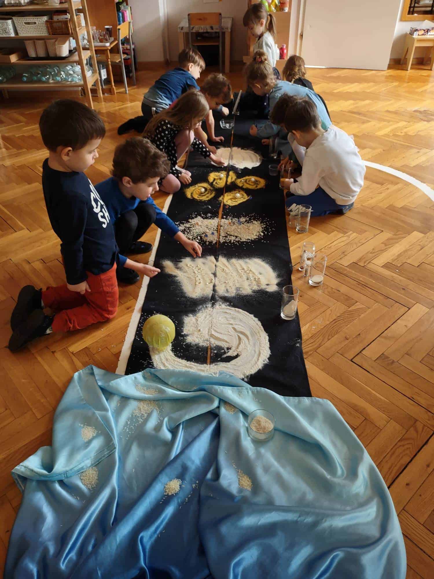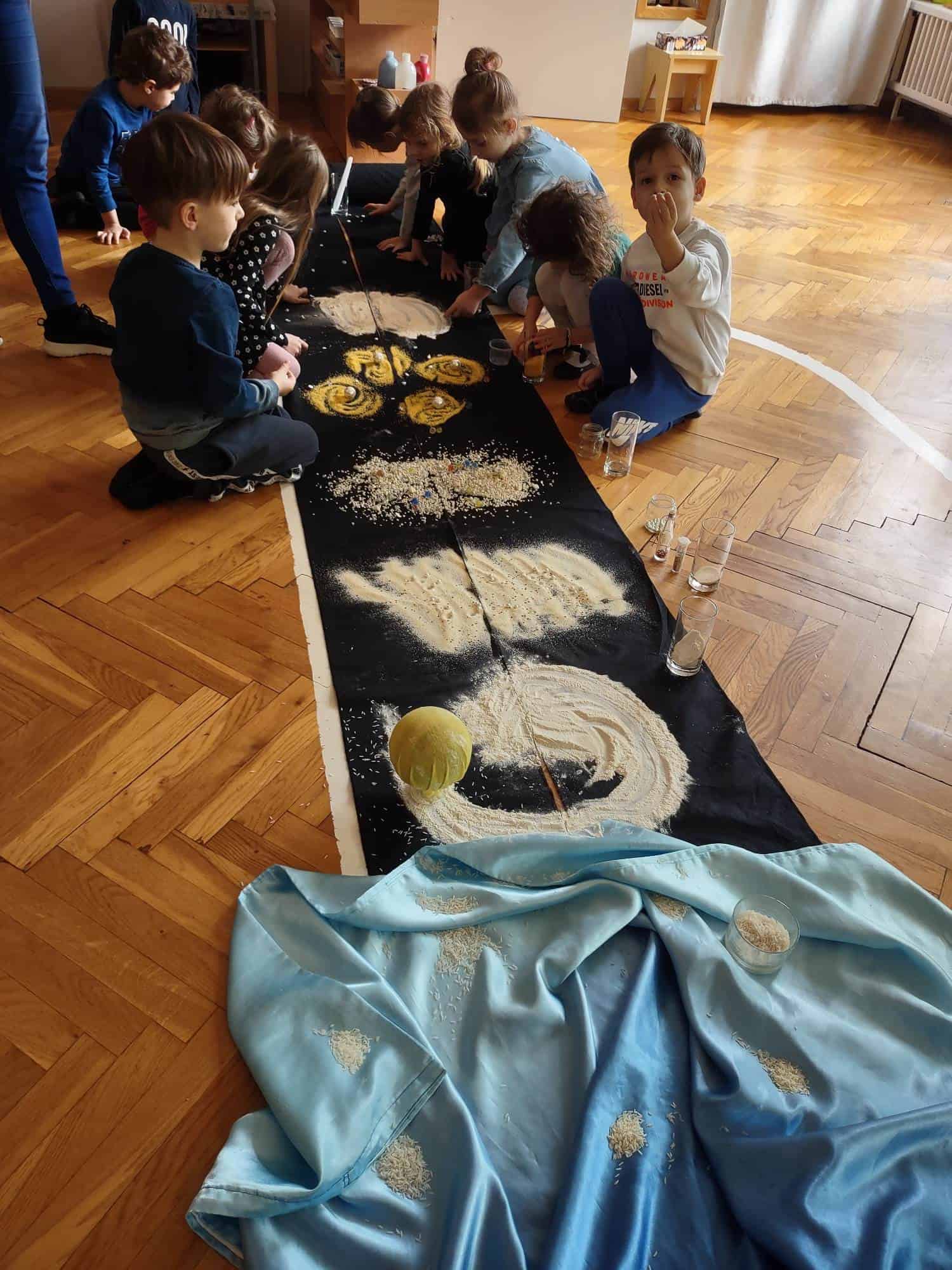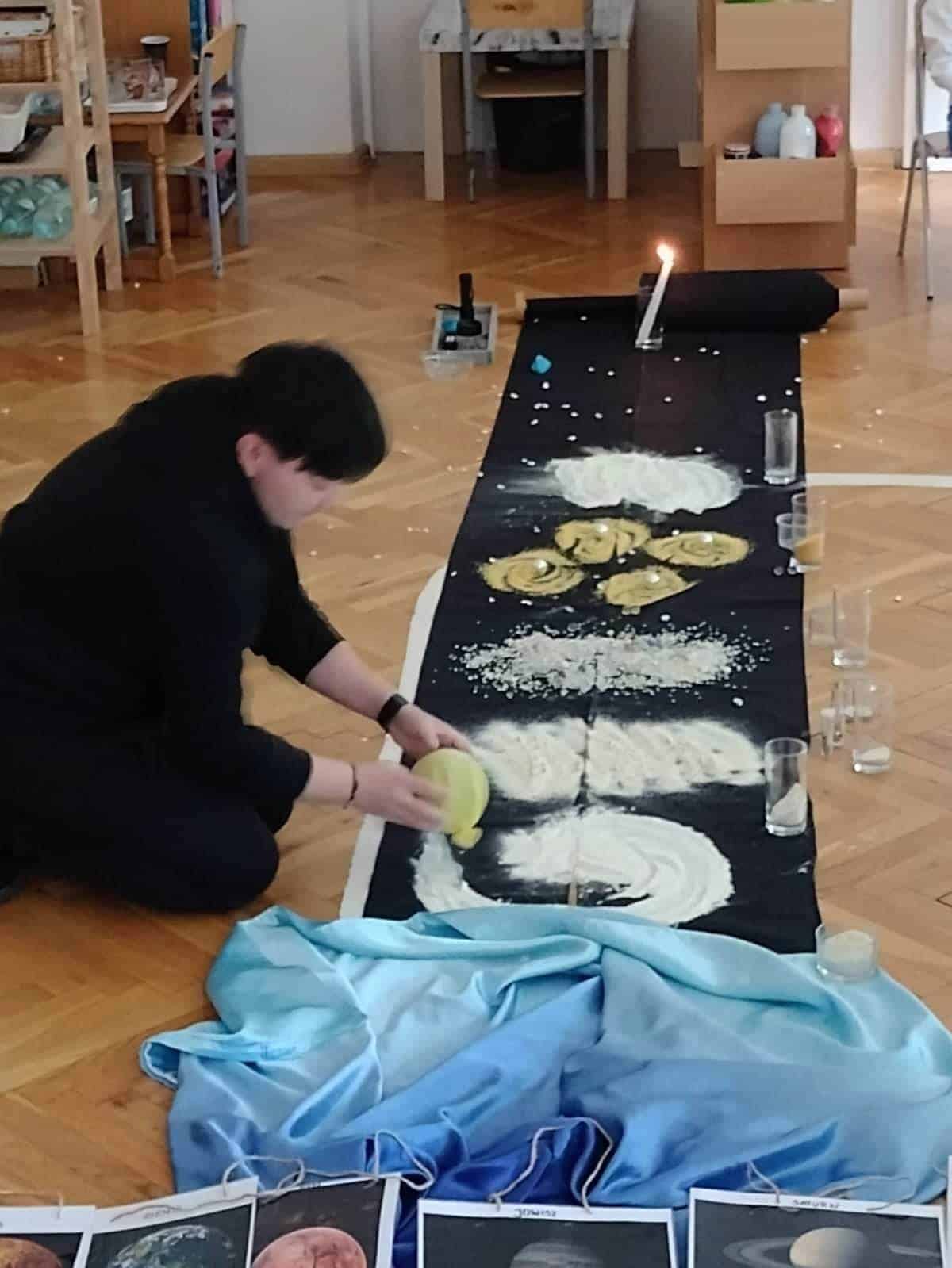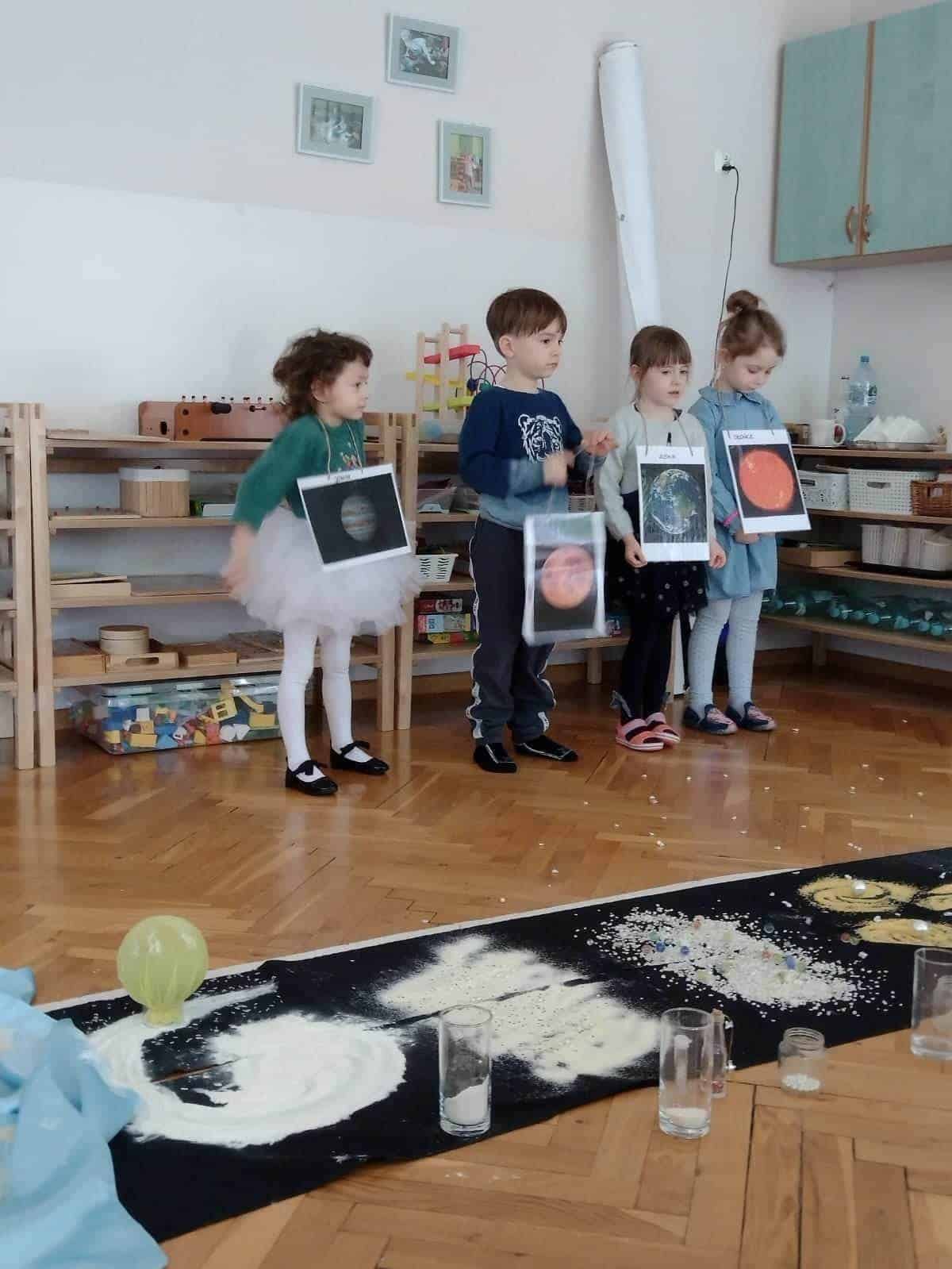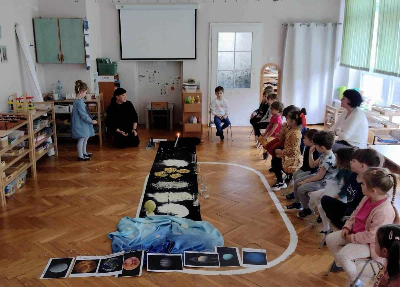 Pedagogika Marii Montessori zachęcała do tego, żeby patrzeć szeroko i pokazywać dzieciom całość świata w przeróżnych odsłonach. Z pewnością bardzo pomocne są w tym nasze montessoriańskie Wielkie Lekcje. Pierwsza z nich – Powstanie Wszechświata – odbyła się w naszej grupie w tym tygodniu. Od wielkiego wybuchu, powstania atomu, tworzeniu się galaktyk, gwiazd i planet, po powstanie kontynentów na naszej planecie. Pierwsza Wielka Lekcja jest chyba najbardziej widowiskowa – brokat, wybuchy i zimne ognie, świecące kamyczki i szklane kulki, to wszystko sprawia, że dzieci przeżywają ją w dużym skupieniu i ciszy. Wielkie Lekcje Montessori są lekcjami jedynie z nazwy. Tak naprawdę z klasyczną lekcją nie mają nic wspólnego. To swego rodzaju pokaz, zaproszenie do magicznego świata wiedzy. Wydarzenie to ma więcej ze spektaklu teatralnego albo pasjonującej opowieści, bowiem Wielkie Lekcje mają dzieci inspirować, zachęcić do poszukiwań, pytań, samodzielnej pracy i pomysłów na własne działania. Nauczyciel nie wyjaśnia nic szczegółowo, nie operuje zbyt trudnymi pojęciami. Jego zadaniem jest dać ogólny obraz. Dla dzieci jest to trochę jak opowieść ze świata fantazji, ale wszystko to, co mówi nauczyciel, jest prawdziwe. Wielka Lekcja nie służy temu, żeby dzieci zrozumiały wszystkie procesy fizyczne i chemiczne, ma ona przede wszystkim zachwycić i zachęcić do zadawania pytań.
