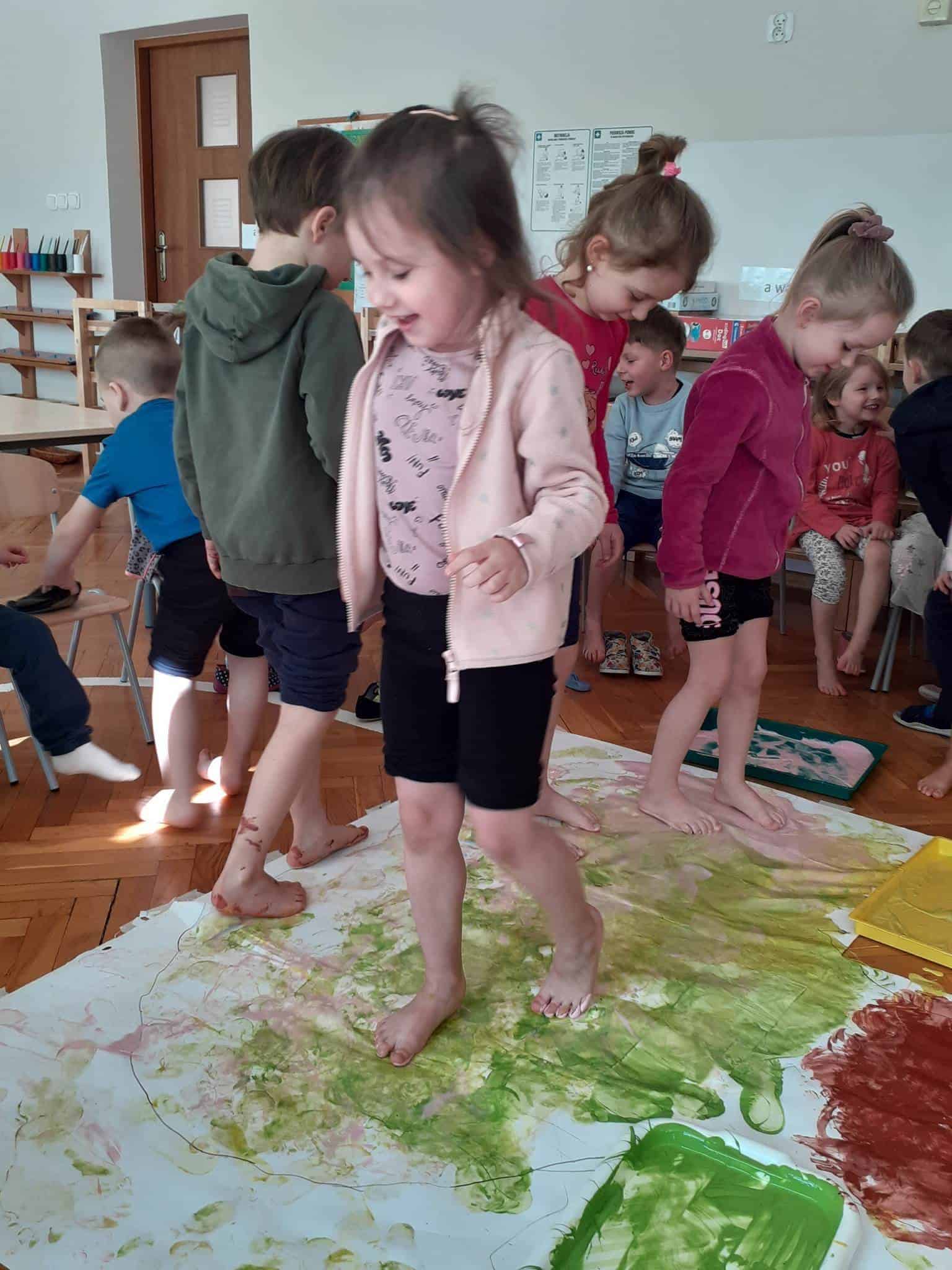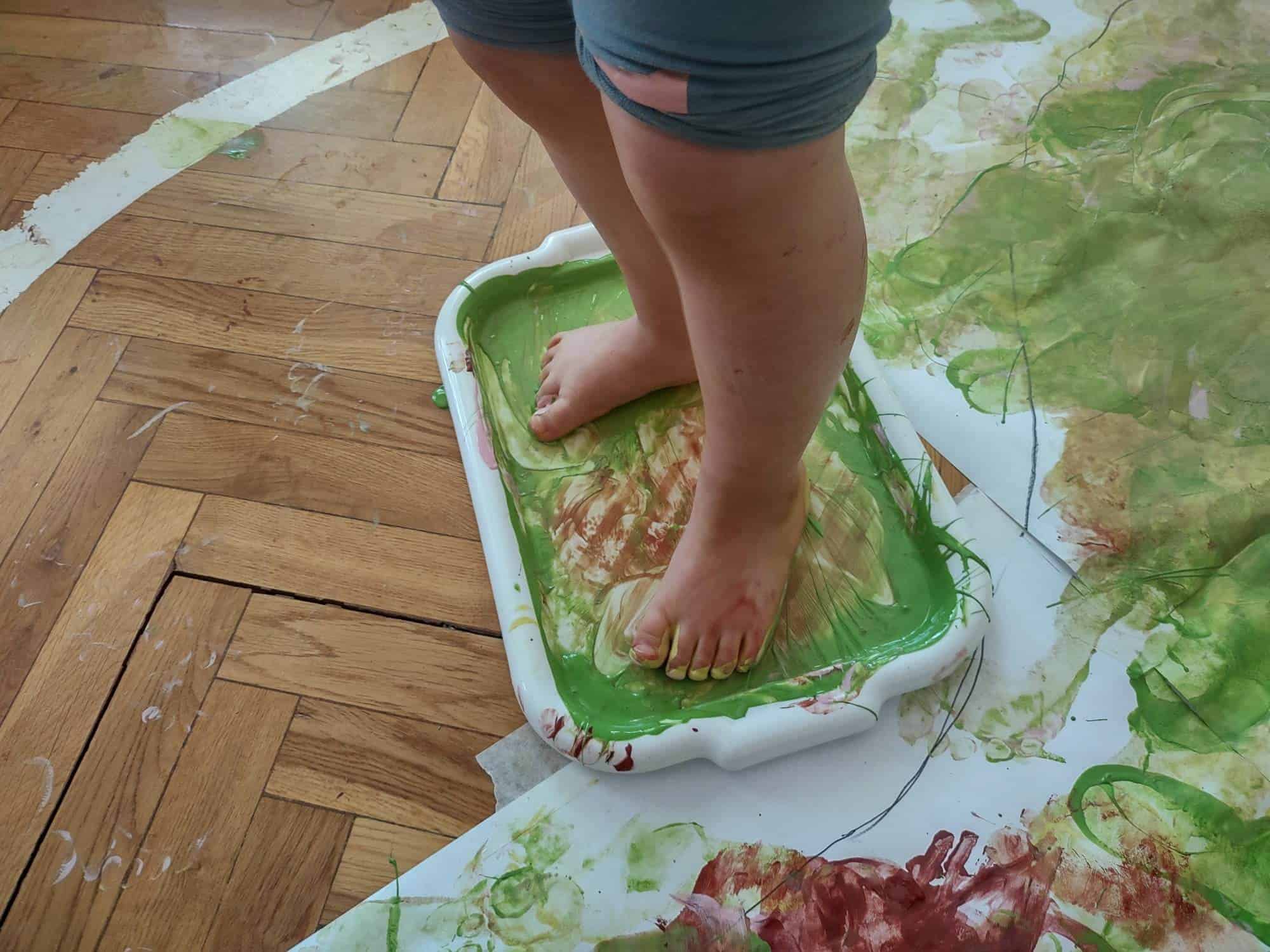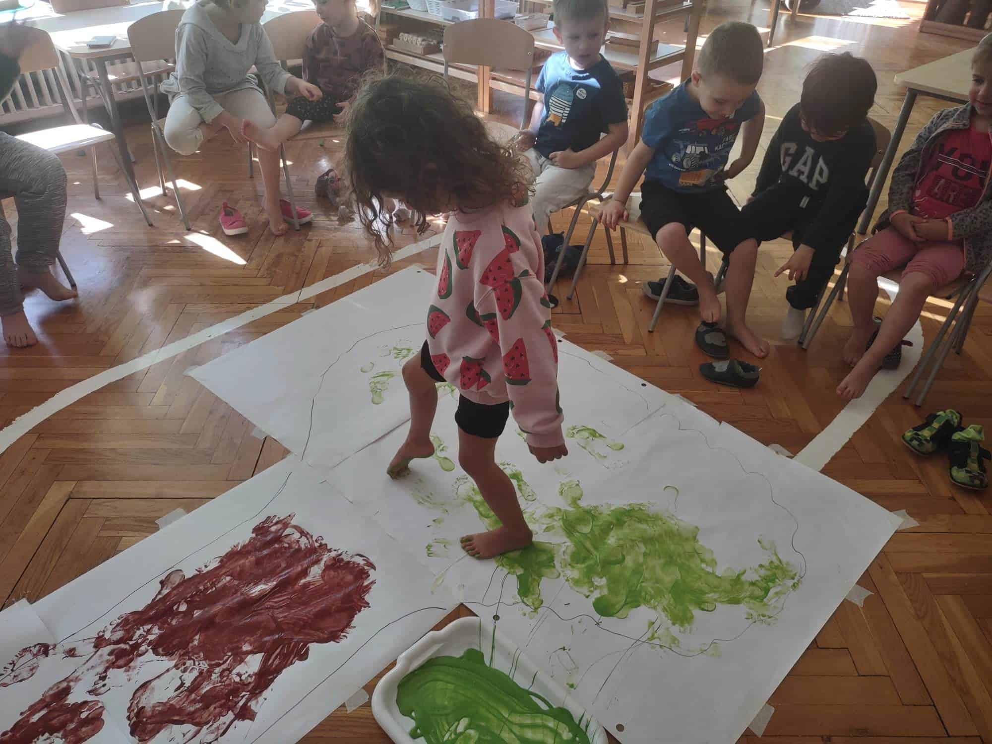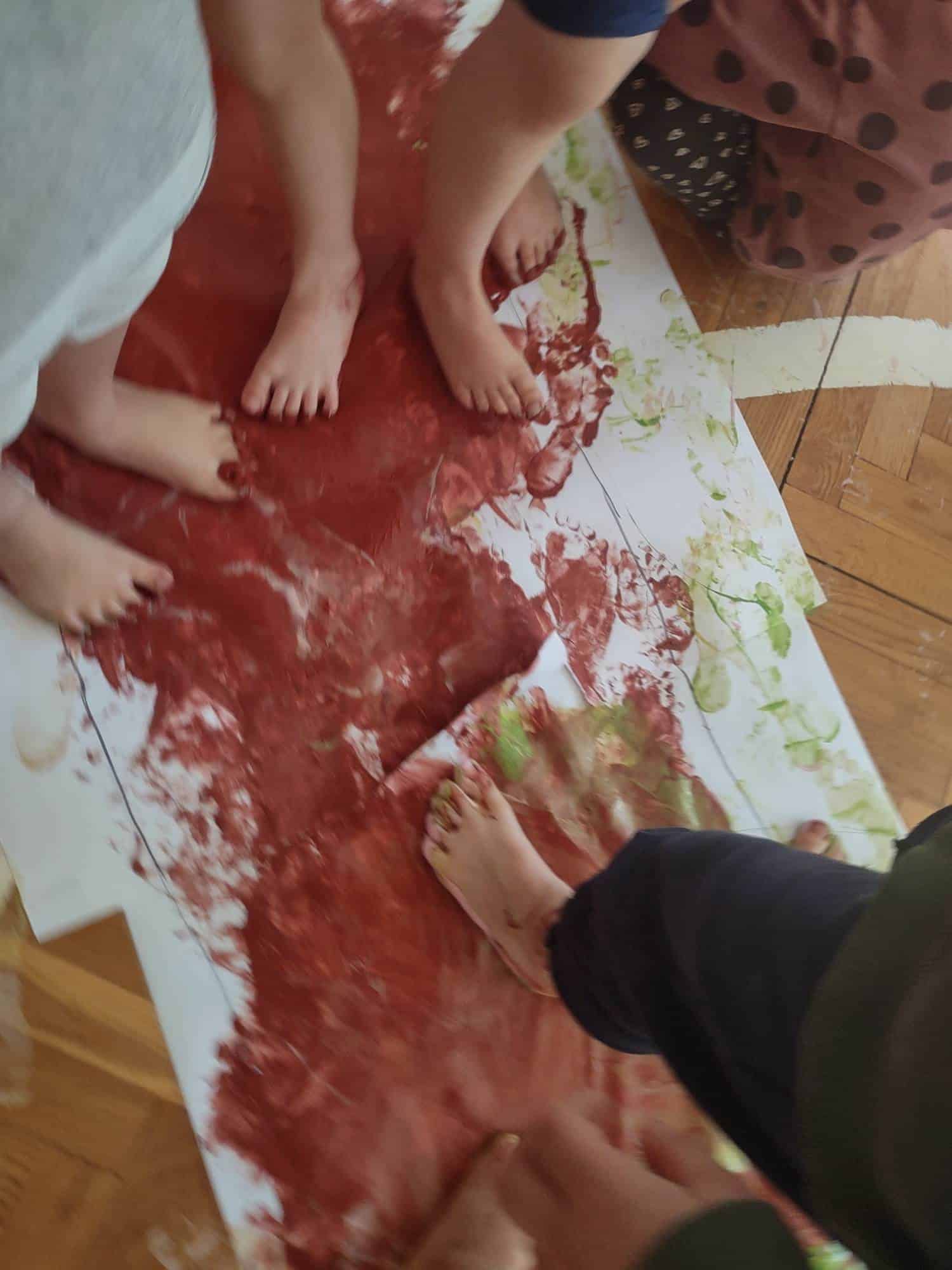 Malowanie stopami to przede wszystkim fantastyczna zabawa, pełna spontanicznych reakcji i zdobywania przez dzieci nowych doświadczeń, ale malowanie stopami, to również doskonałe ćwiczenie wspomagające integrację sensoryczną dziecka, w której główną metodą jest posługiwanie się ruchem. Realizacja tego typu zajęć pozwala na przeprowadzenie doskonałej zabawy plastycznej, na stymulację dotyku oraz kształtowanie się orientacji przestrzennej. Zatem przyjemne z pożytecznym 🙂