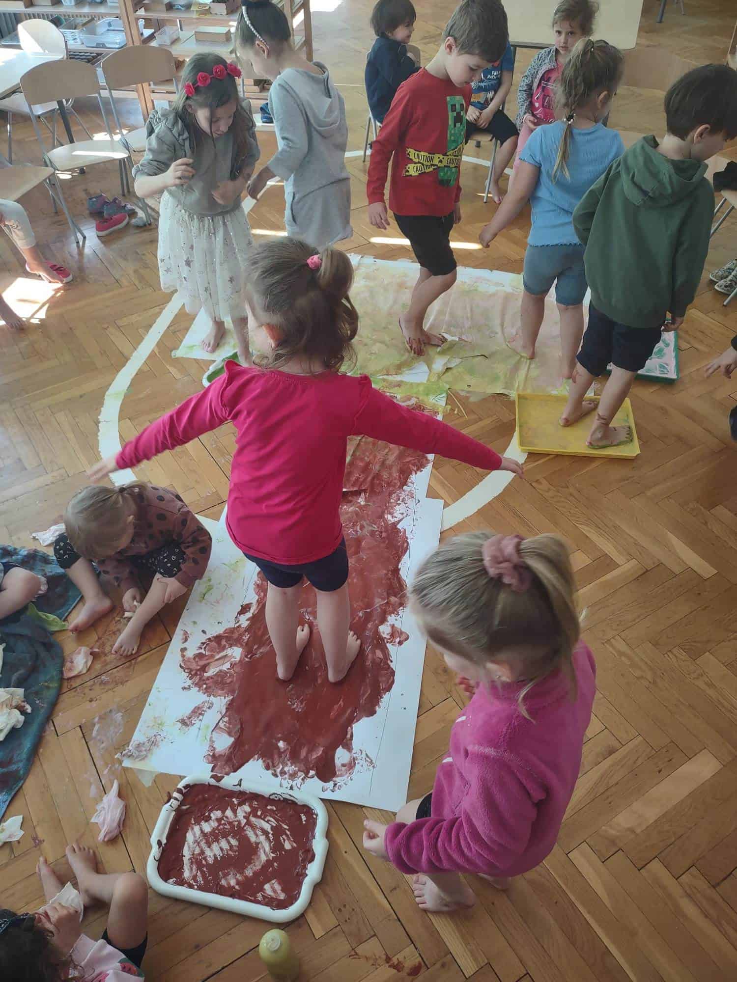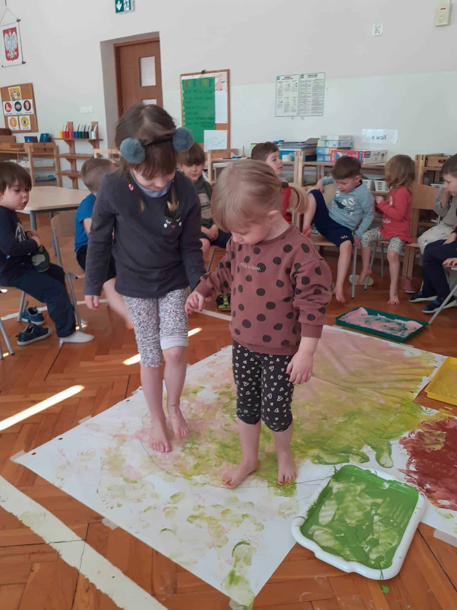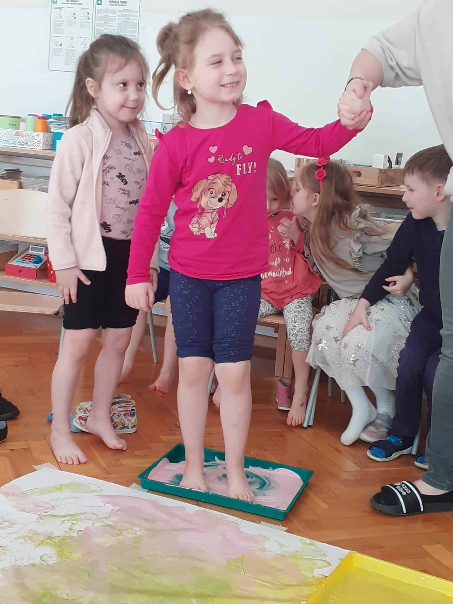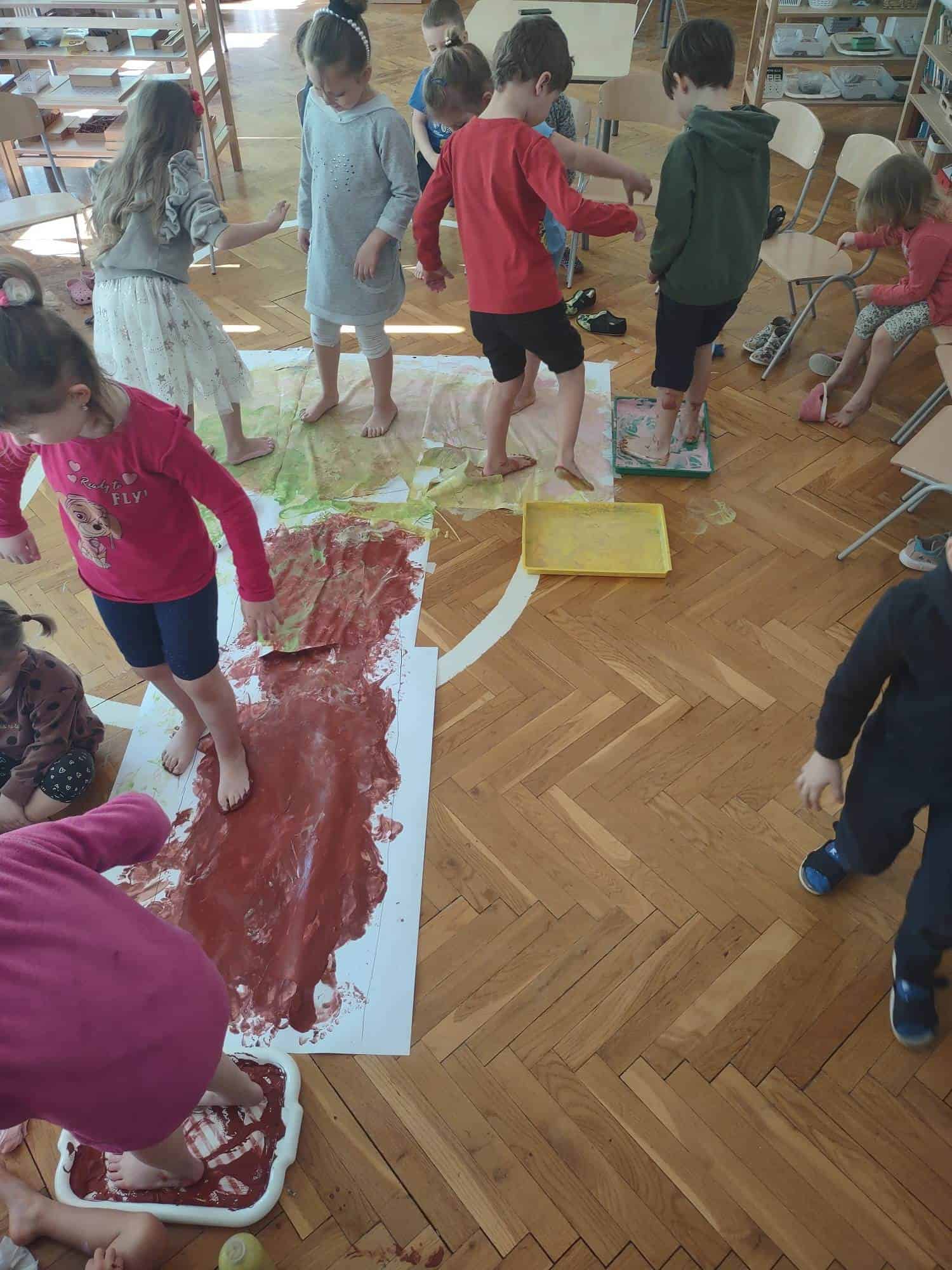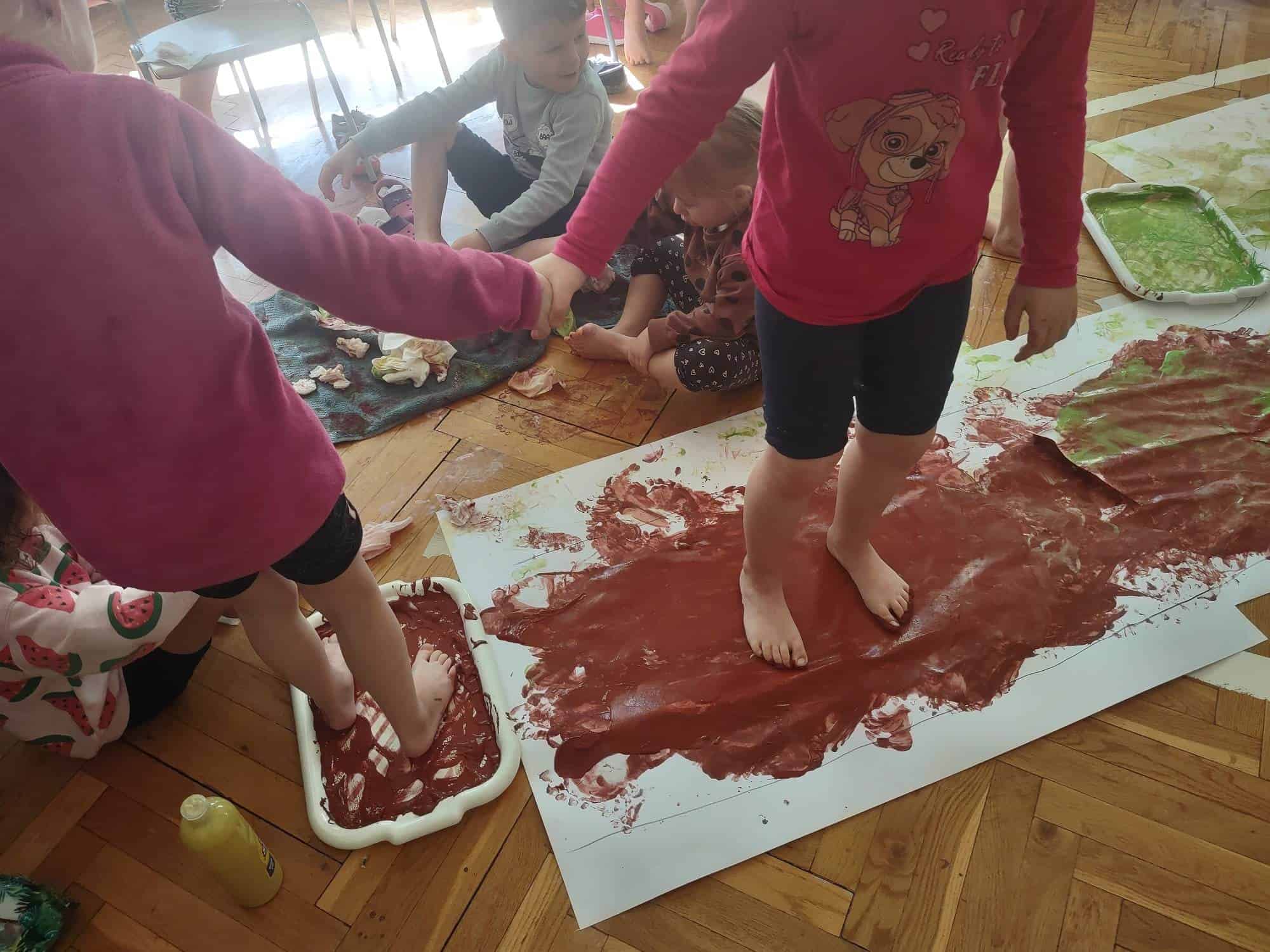 Malowanie stopami to przede wszystkim fantastyczna zabawa, pełna spontanicznych reakcji i zdobywania przez dzieci nowych doświadczeń, ale malowanie stopami, to również doskonałe ćwiczenie wspomagające integrację sensoryczną dziecka, w której główną metodą jest posługiwanie się ruchem. Realizacja tego typu zajęć pozwala na przeprowadzenie doskonałej zabawy plastycznej, na stymulację dotyku oraz kształtowanie się orientacji przestrzennej. Zatem przyjemne z pożytecznym 🙂