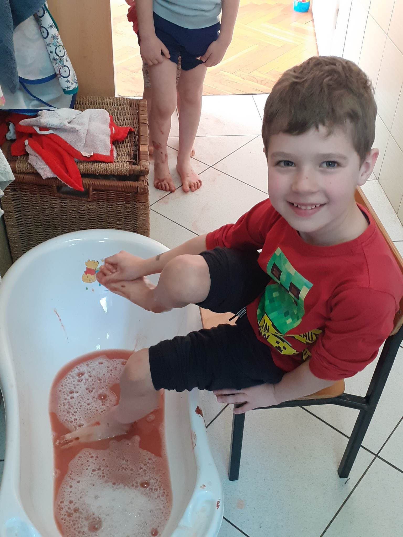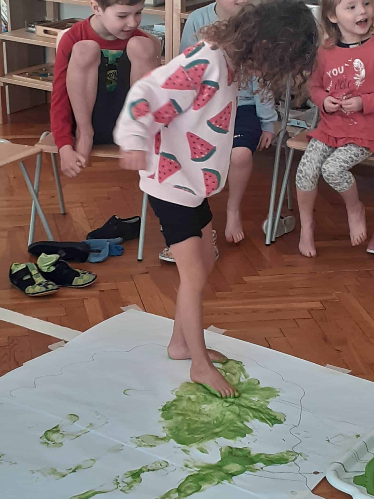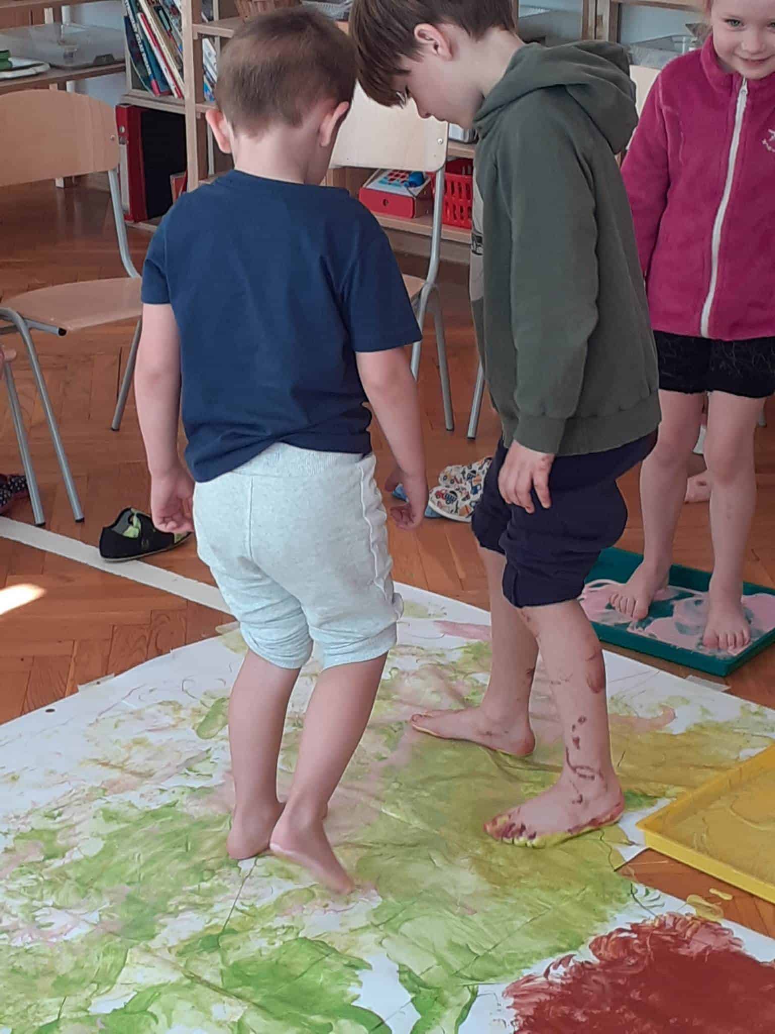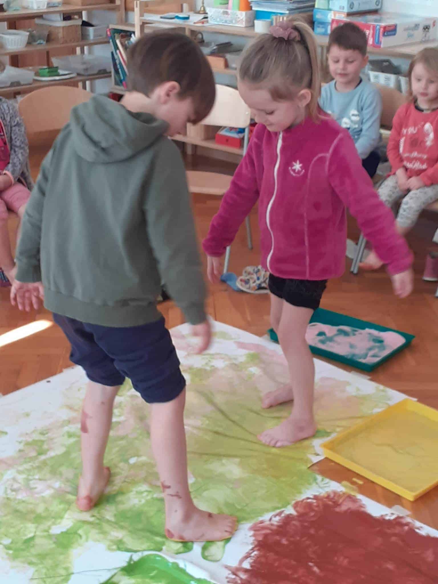 Malowanie stopami to przede wszystkim fantastyczna zabawa, pełna spontanicznych reakcji i zdobywania przez dzieci nowych doświadczeń, ale malowanie stopami, to również doskonałe ćwiczenie wspomagające integrację sensoryczną dziecka, w której główną metodą jest posługiwanie się ruchem. Realizacja tego typu zajęć pozwala na przeprowadzenie doskonałej zabawy plastycznej, na stymulację dotyku oraz kształtowanie się orientacji przestrzennej. Zatem przyjemne z pożytecznym 🙂