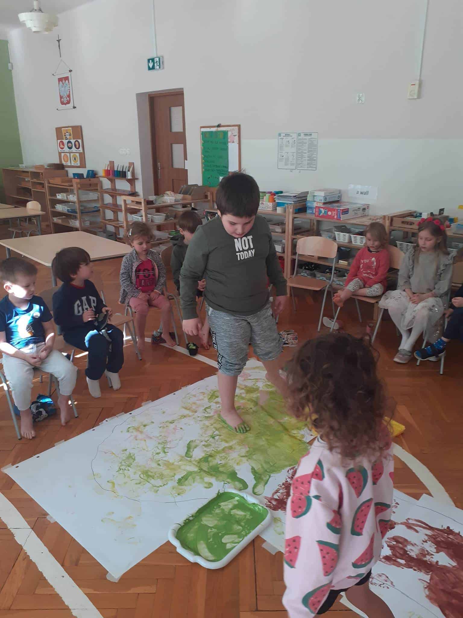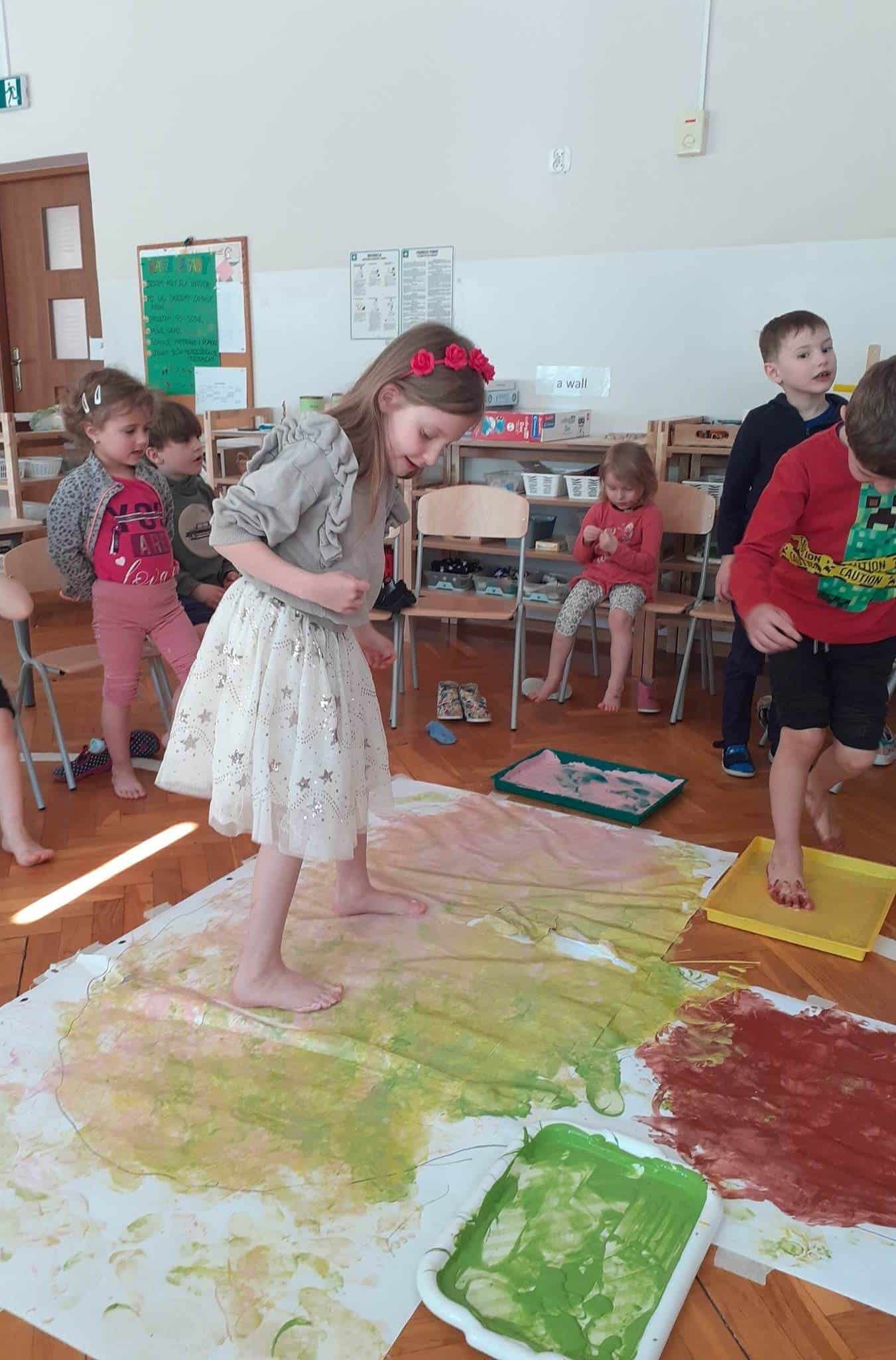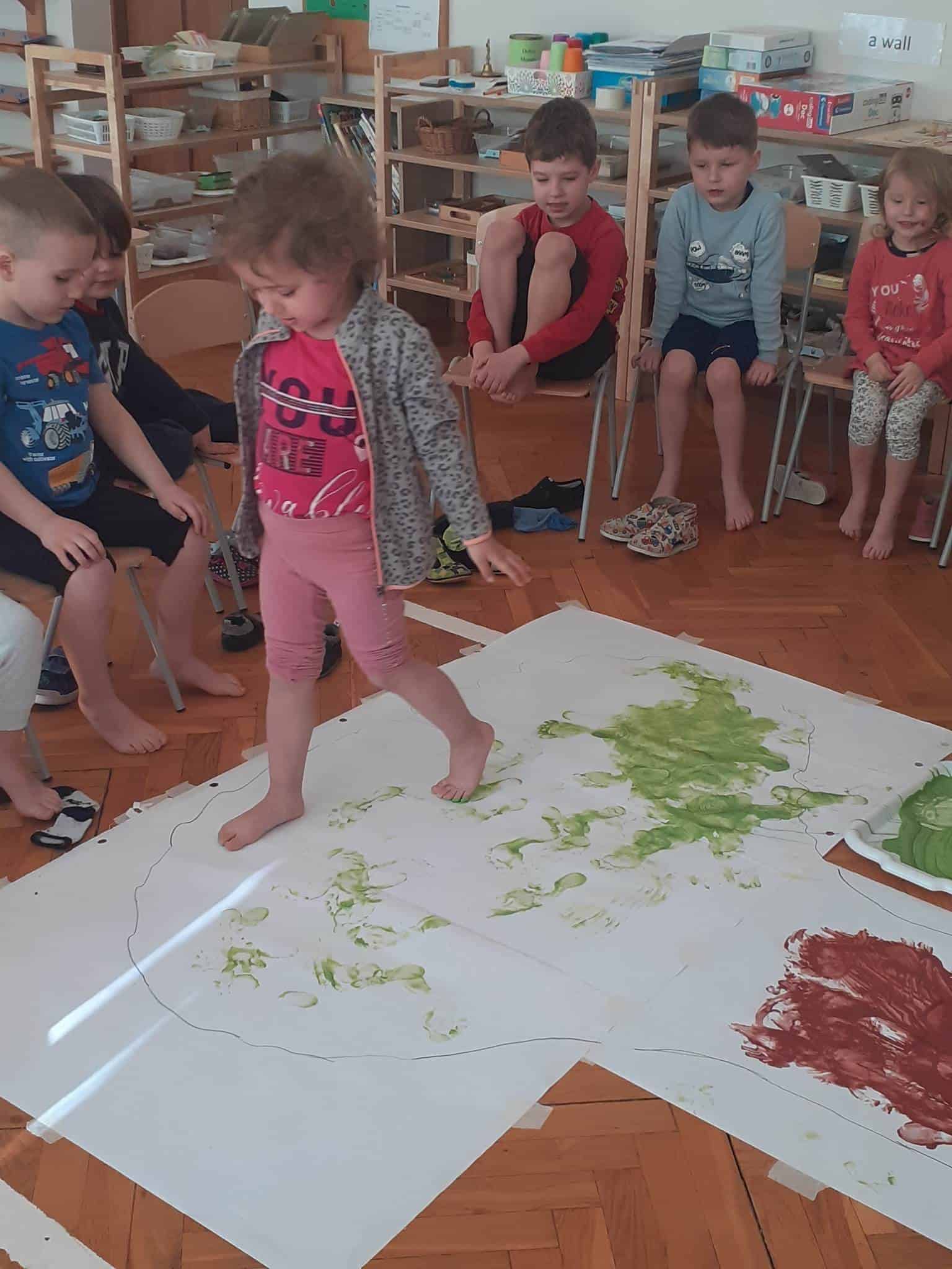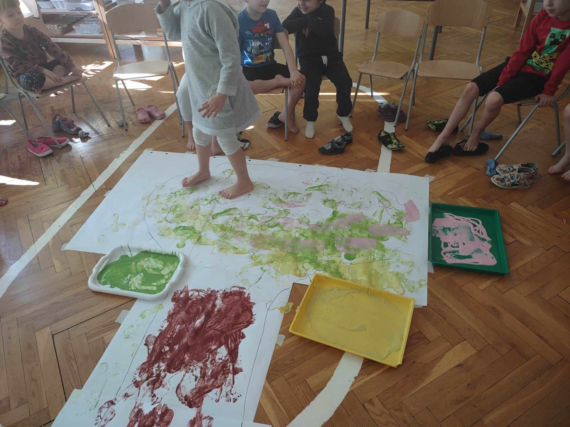 Podczas naszych ostatnich zajęć plastycznych wspólnie wykonaliśmy „Wiosenne drzewo”. Do tworzenia tej pracy pobudziliśmy receptory stóp 🙂 nieco inaczej niż zwykle, dlatego była to bardzo radosna i kreatywna twórczość 🙂