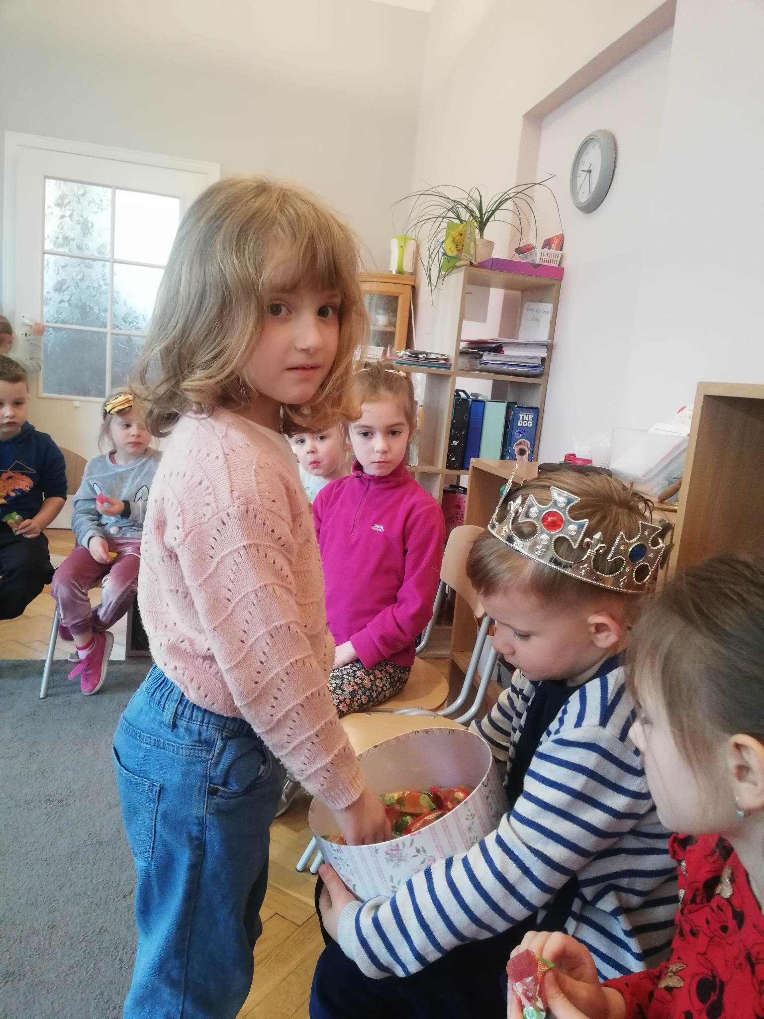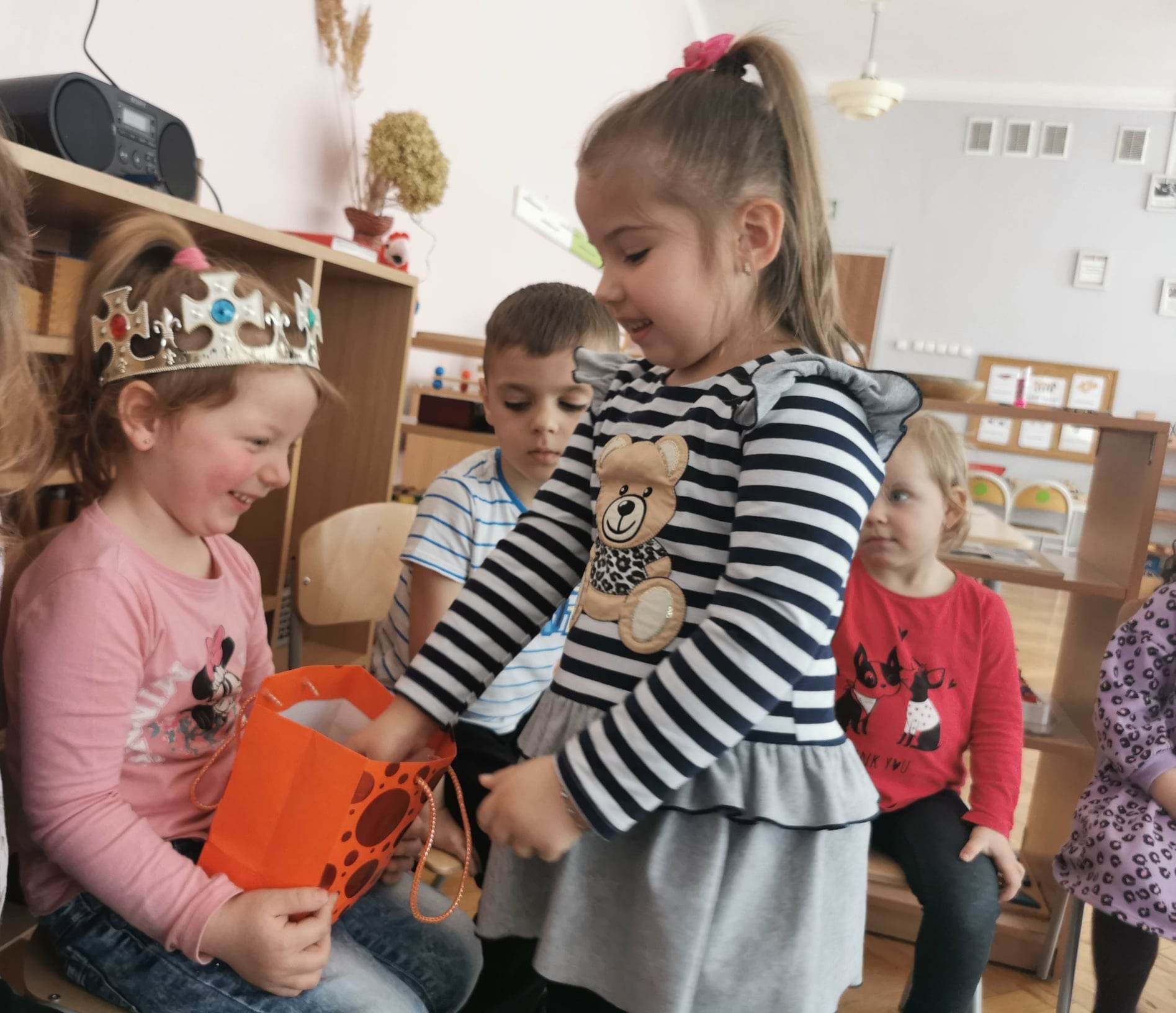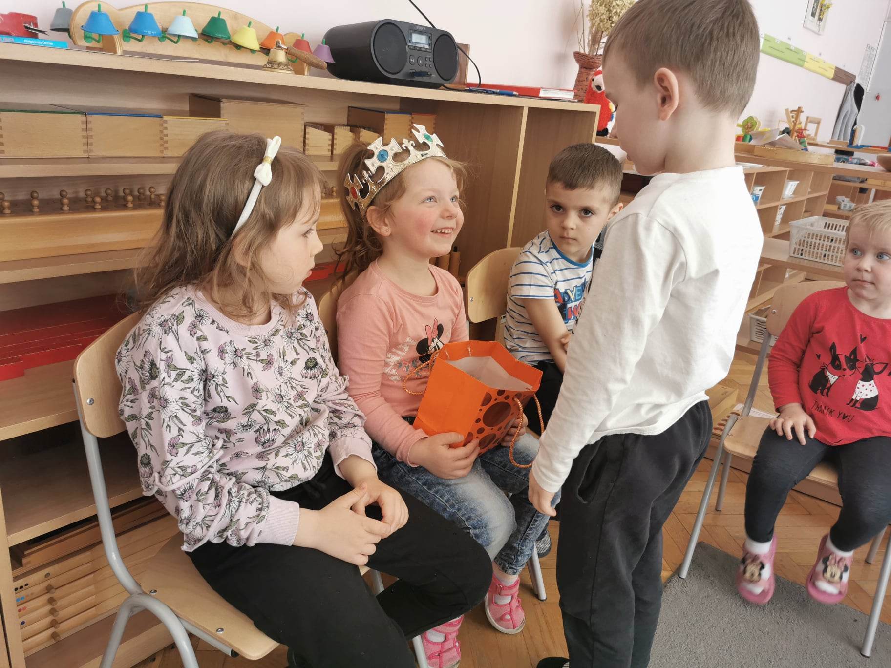 Urodziny świętowaliśmy zgodnie z montessoriańskim zwyczajem, śpiewaliśmy Sto lat, składaliśmy piękne życzenia, a także częstowaliśmy się słodyczami.