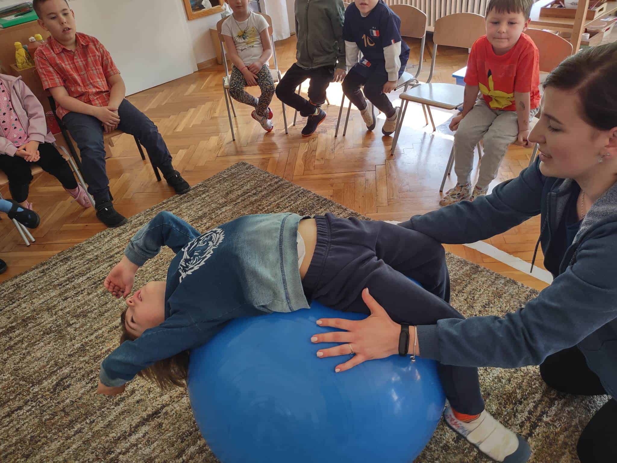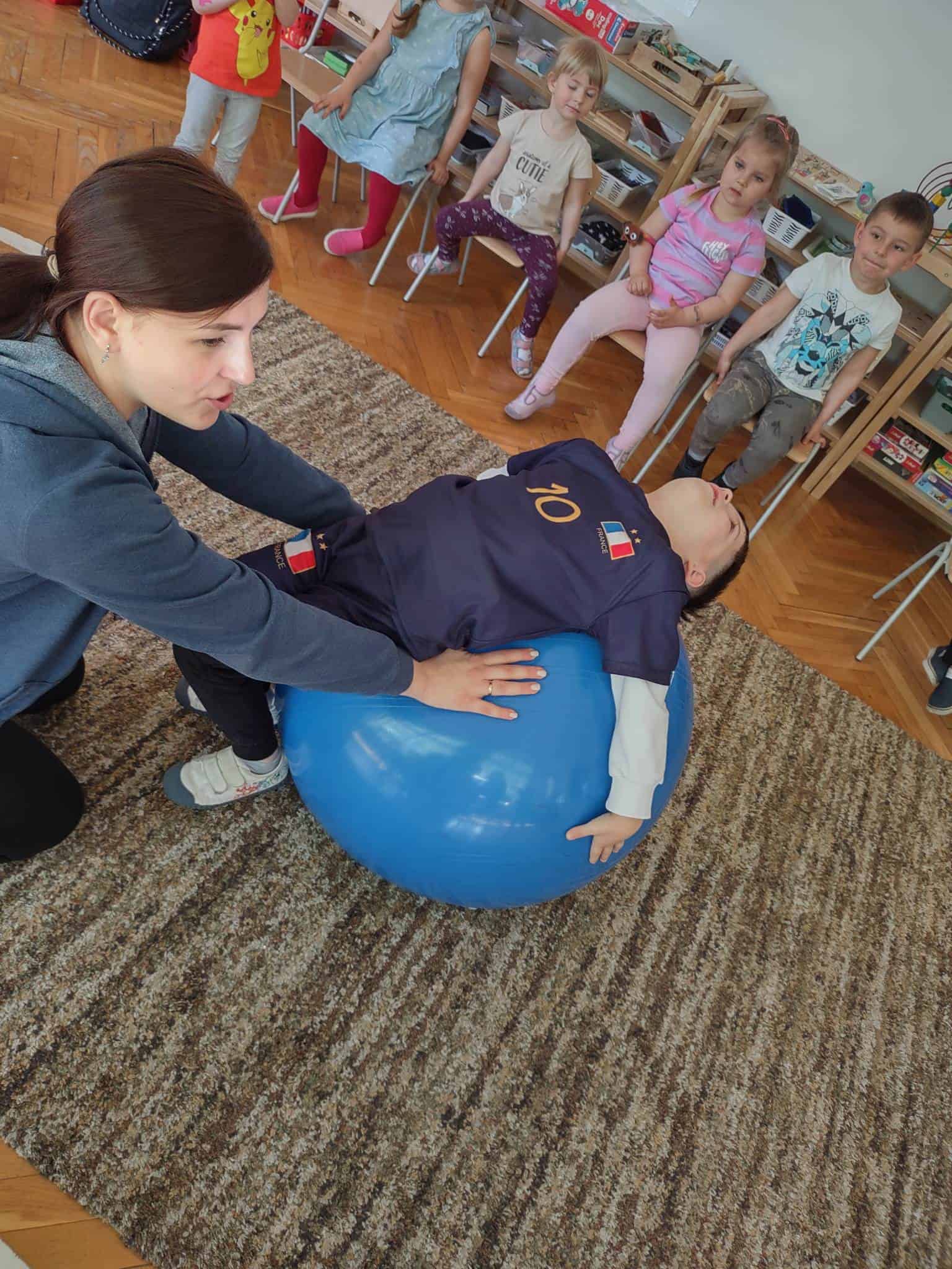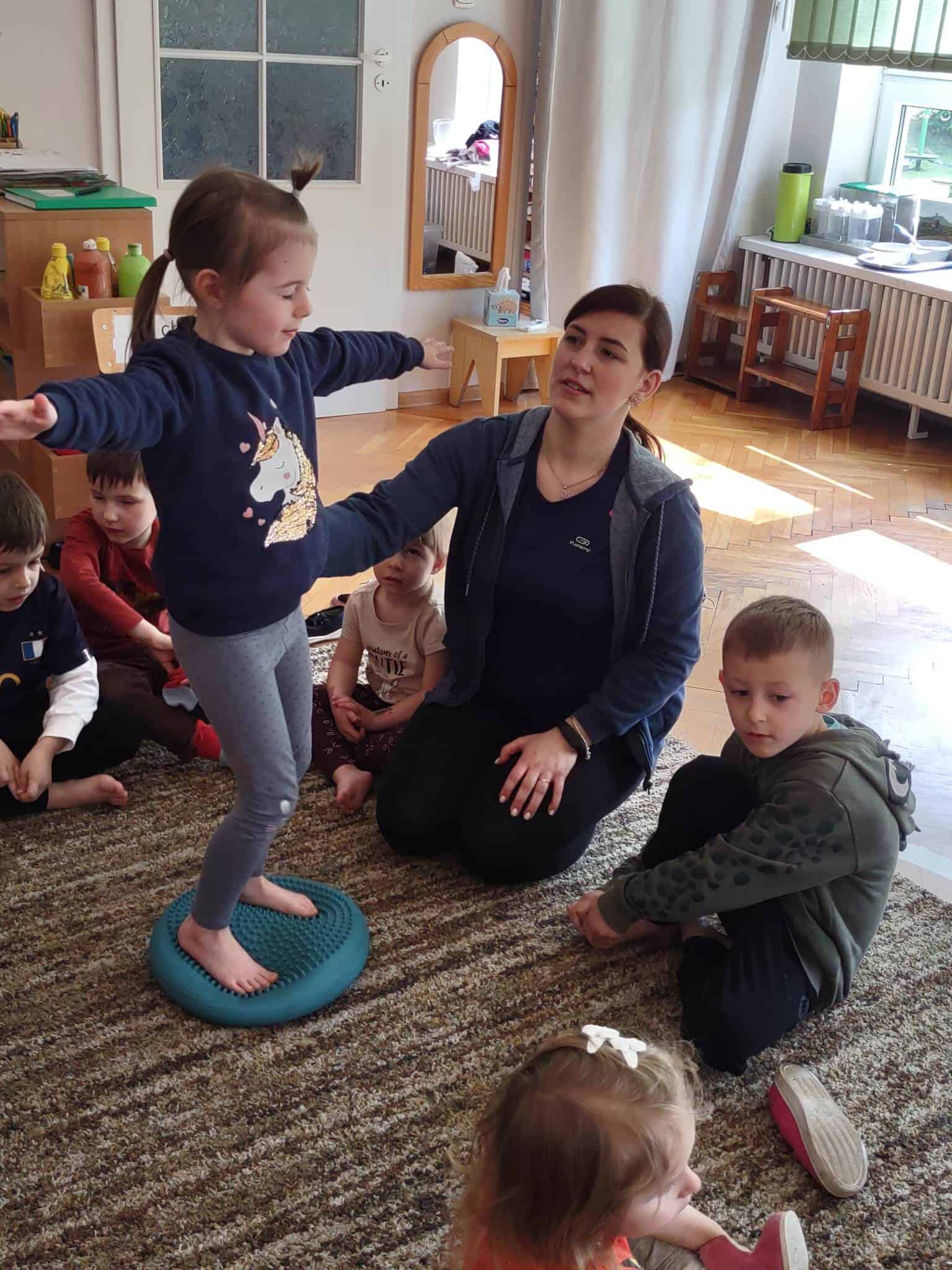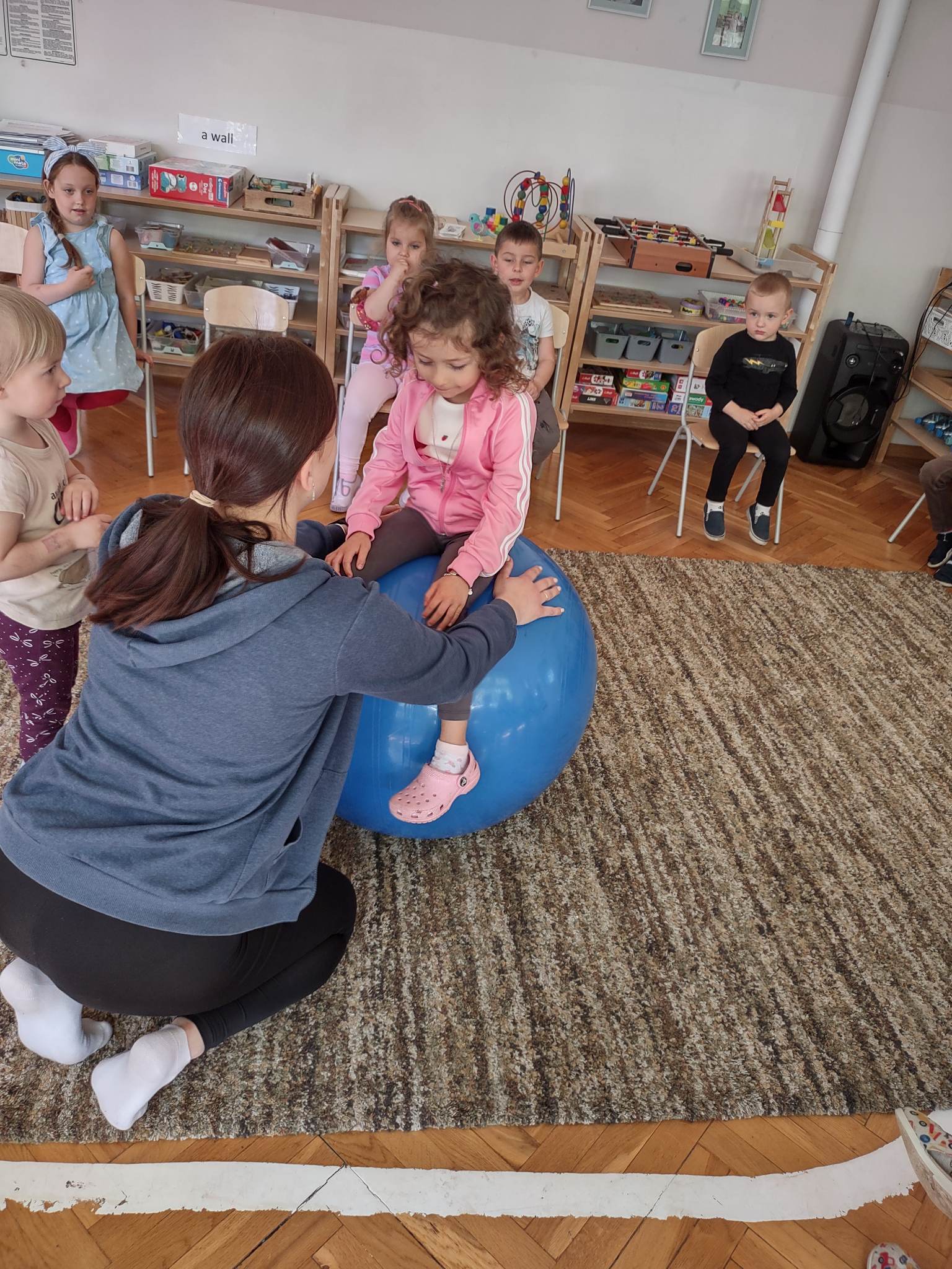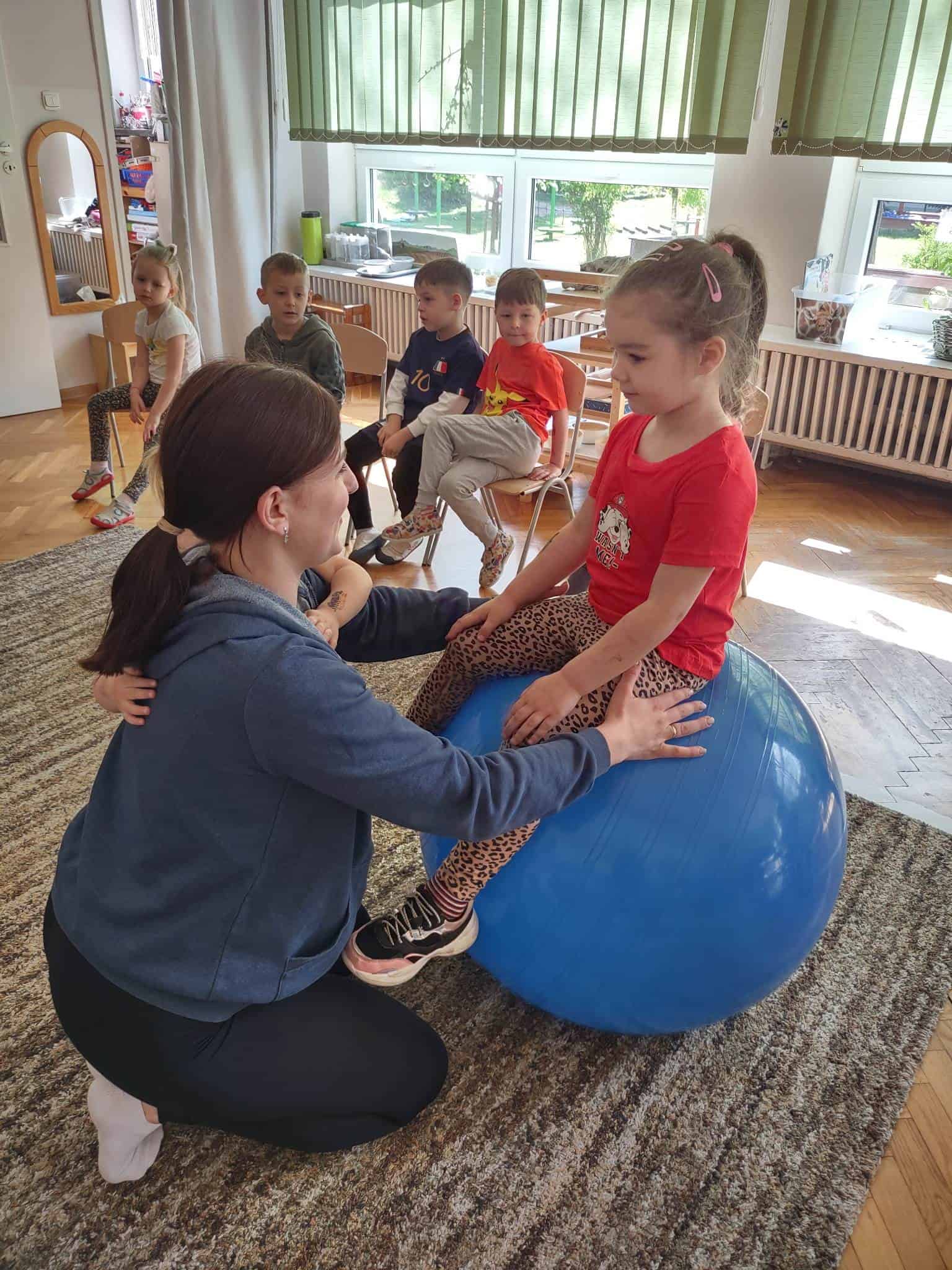 W czwartek, 11 maja, gościliśmy w naszej grupie Panią Gabrysię, mamusię naszej Ani i Jasia, która zawodowo zajmuje się fizjoterapią. Na początku Pani Gabrysia po krótce przedstawiła dzieciom na czym polega jej praca, komu i w jaki sposób pomaga. Po wstępie teoretycznym przeszliśmy do części związanej z ćwiczeniami. Nasz gość zaprezentował kilka niezbędnych narzędzi, które wykorzystuje w swojej pracy. Dzieci miały możliwość spróbować kilku ćwiczeń na piłce rehabilitacyjnej, doświadczyły ćwiczeń na dysku sensorycznym oraz mogły rozciągnąć swój kręgosłup i uaktywnić receptory na stopach 🙂
