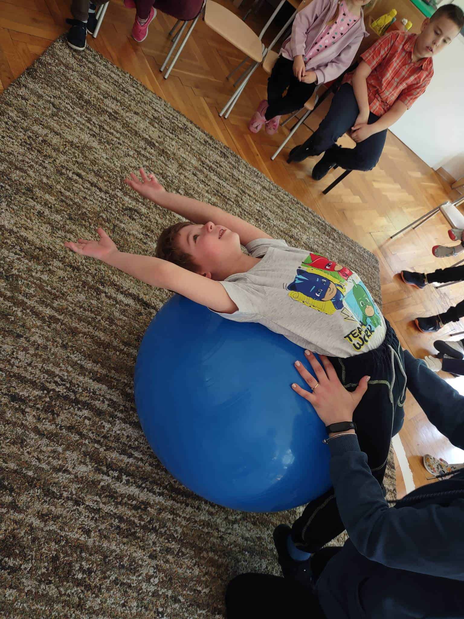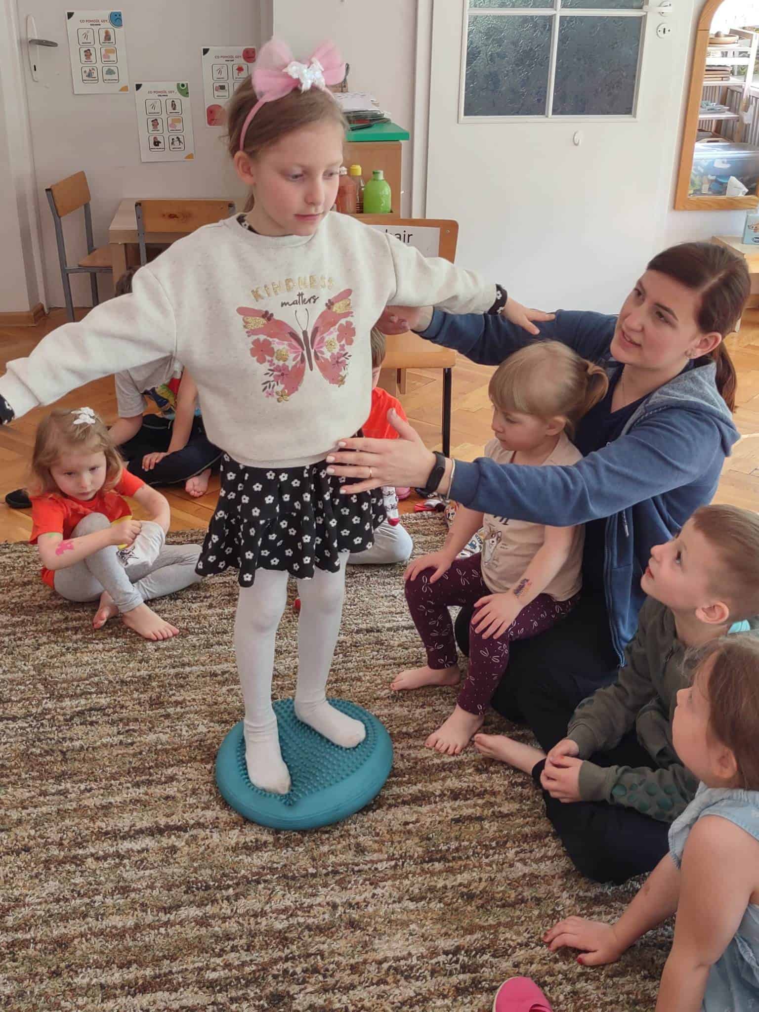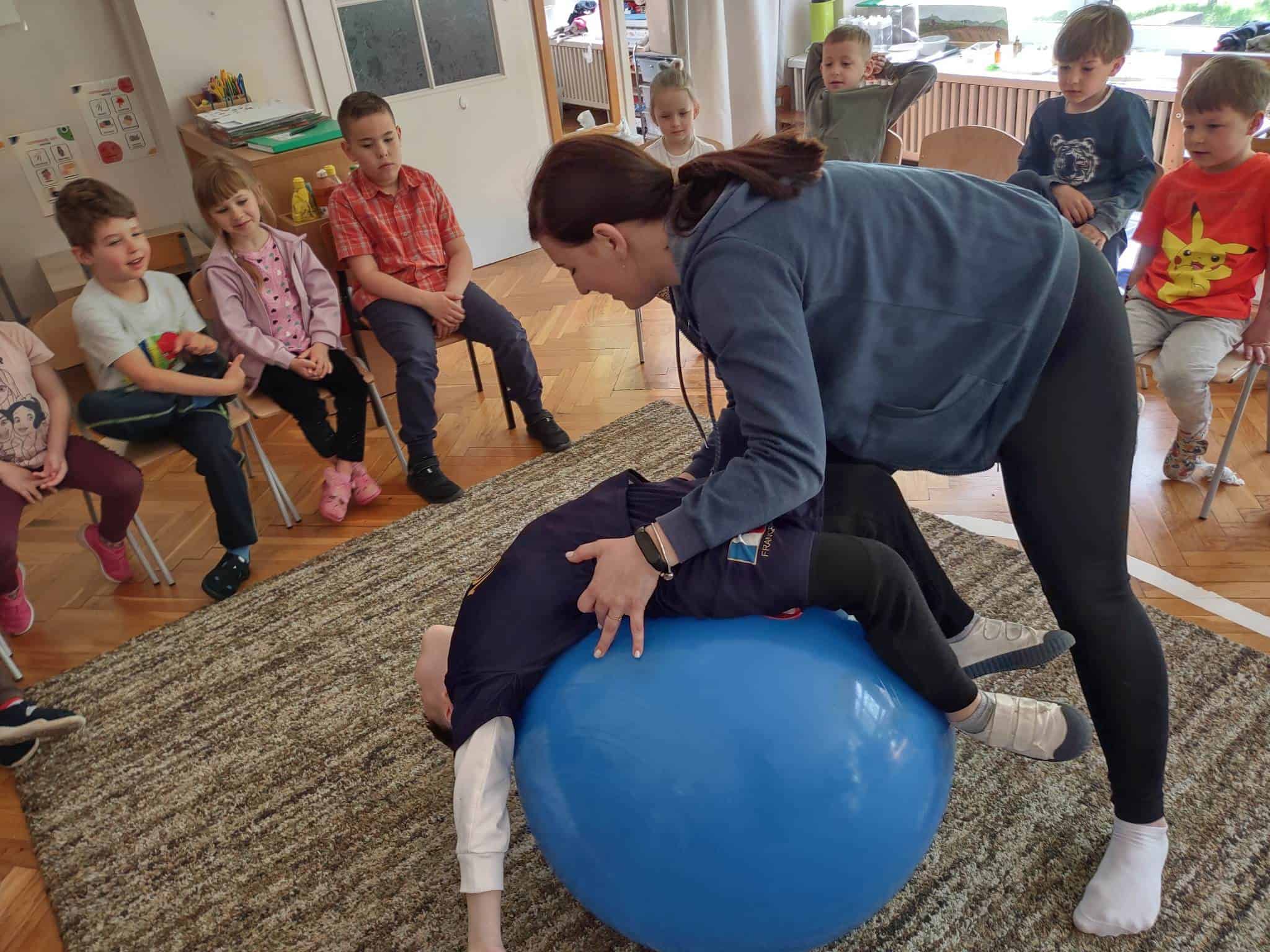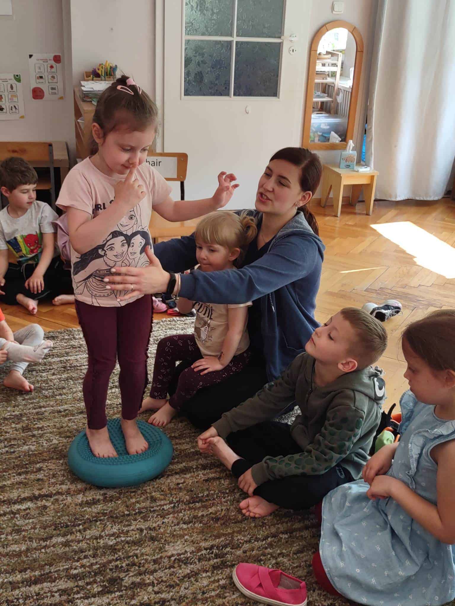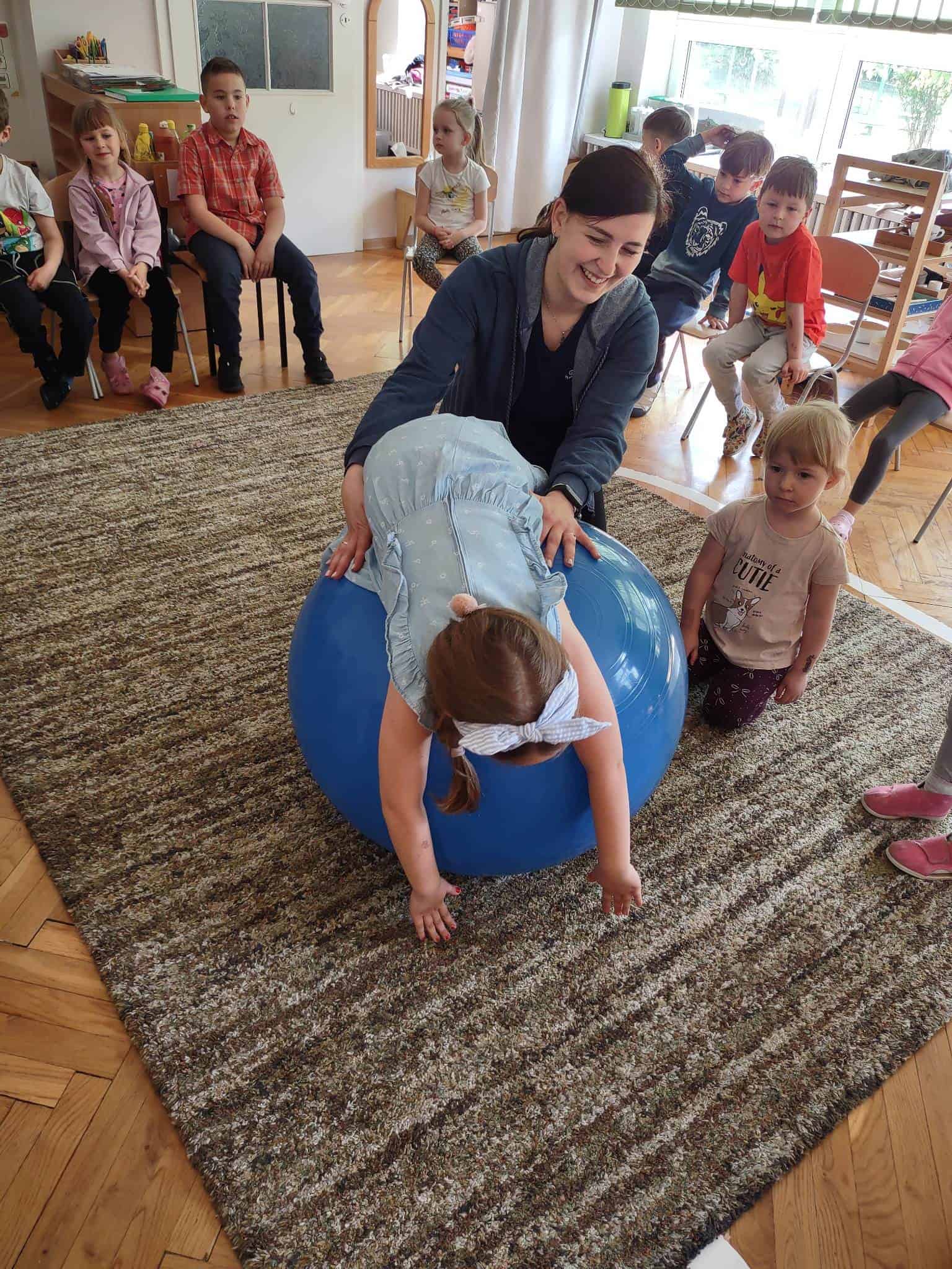 W czwartek, 11 maja, gościliśmy w naszej grupie Panią Gabrysię, mamusię naszej Ani i Jasia, która zawodowo zajmuje się fizjoterapią. Na początku Pani Gabrysia po krótce przedstawiła dzieciom na czym polega jej praca, komu i w jaki sposób pomaga. Po wstępie teoretycznym przeszliśmy do części związanej z ćwiczeniami. Nasz gość zaprezentował kilka niezbędnych narzędzi, które wykorzystuje w swojej pracy. Dzieci miały możliwość spróbować kilku ćwiczeń na piłce rehabilitacyjnej, doświadczyły ćwiczeń na dysku sensorycznym oraz mogły rozciągnąć swój kręgosłup i uaktywnić receptory na stopach 🙂