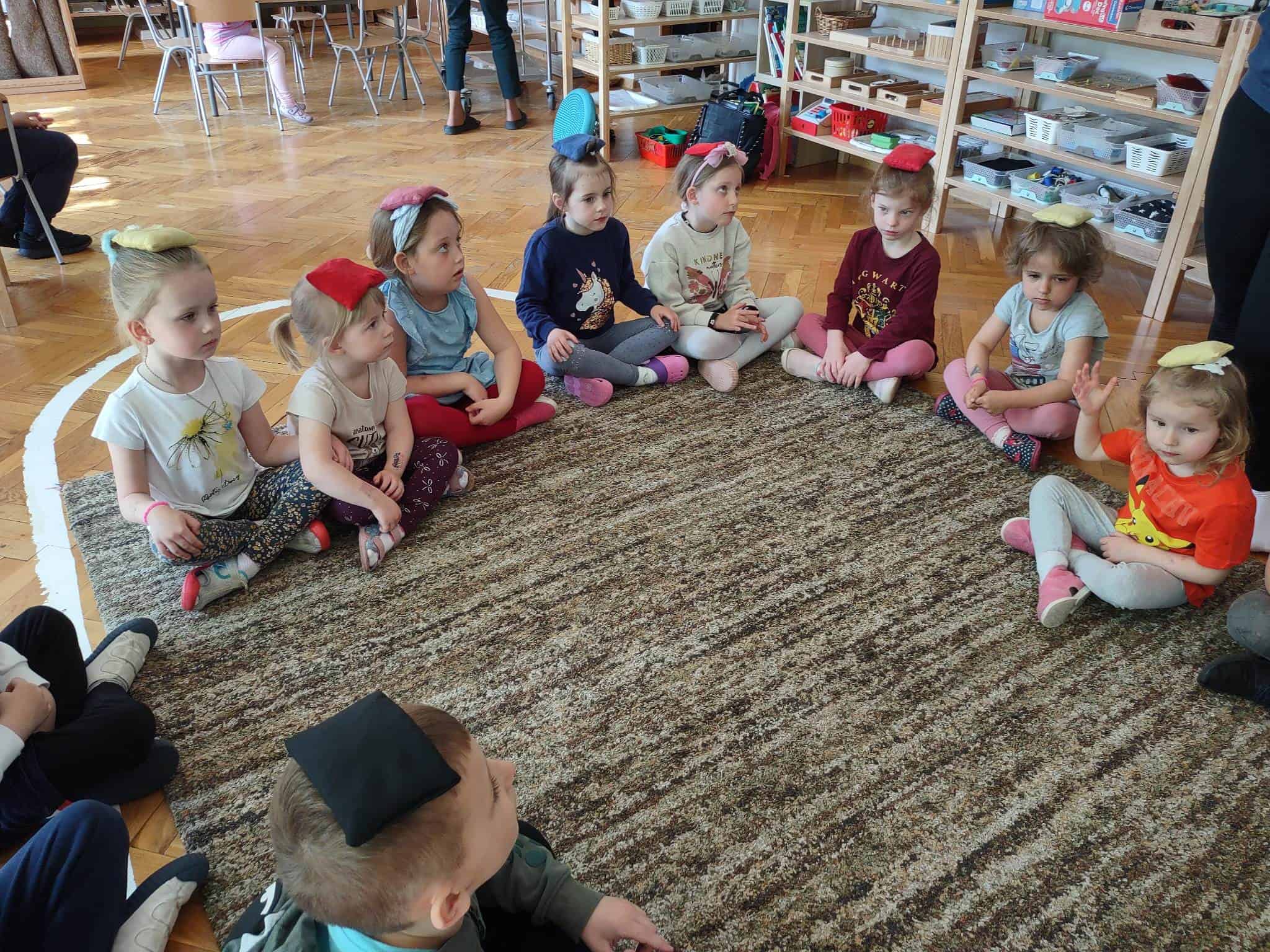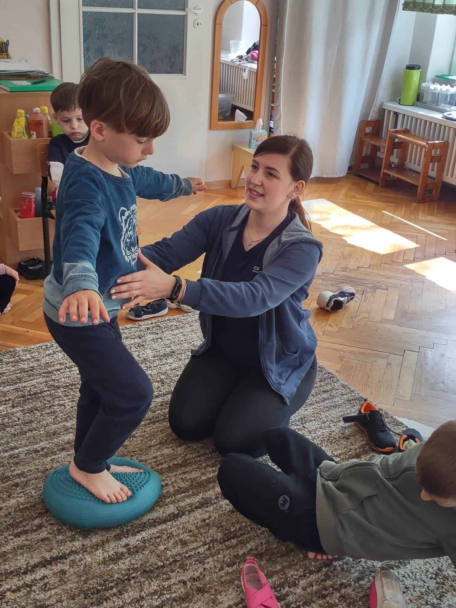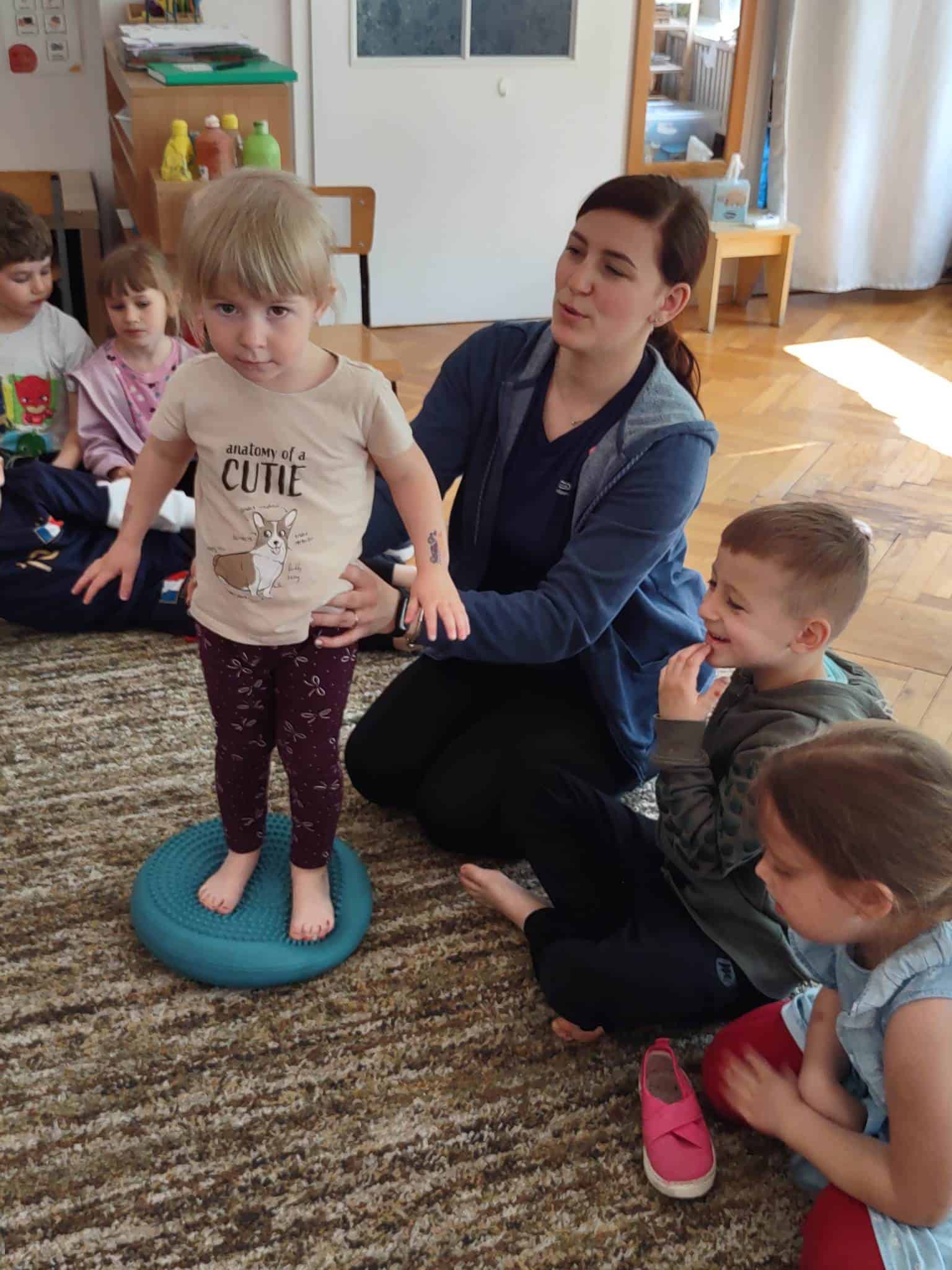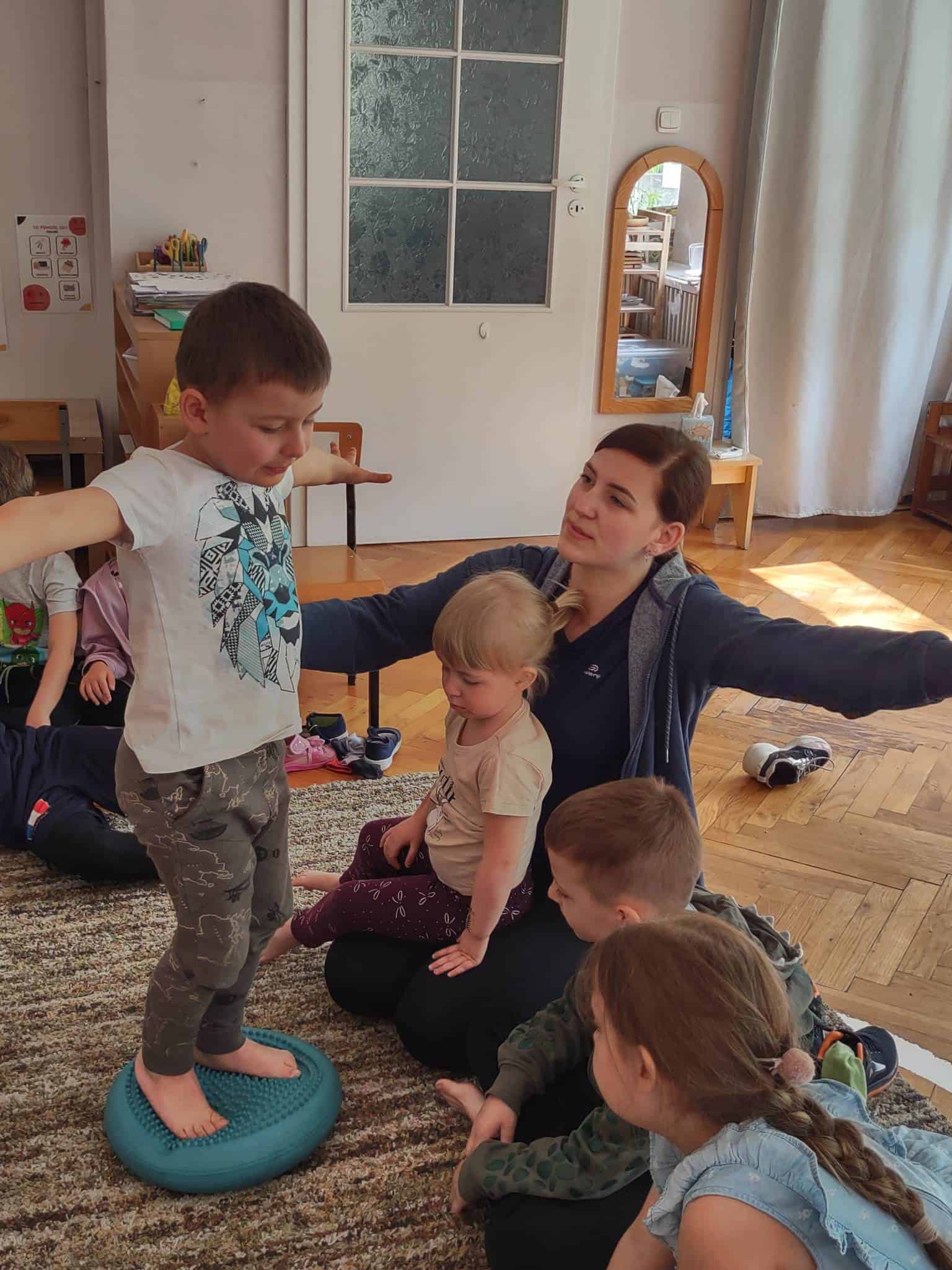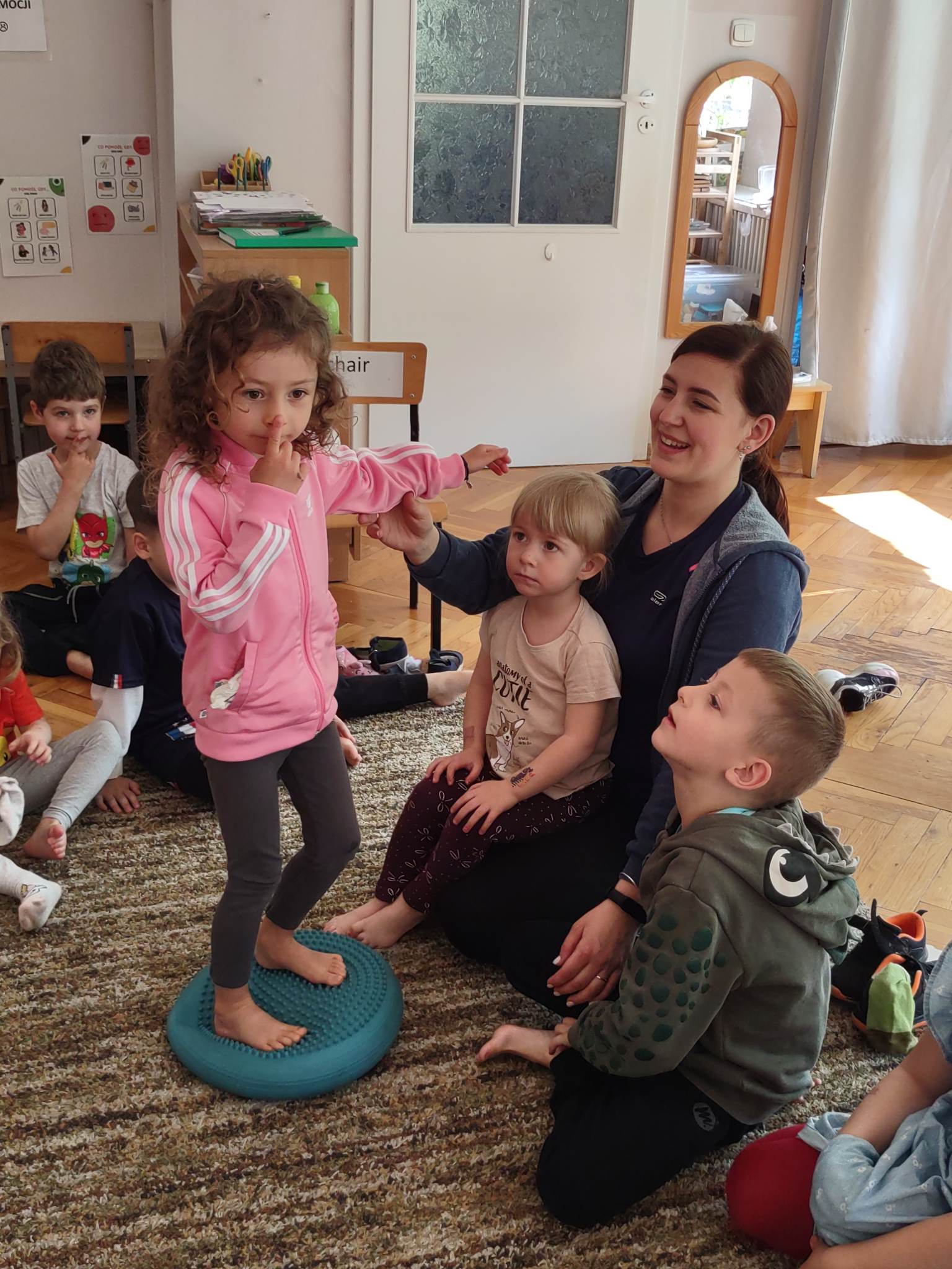 W czwartek, 11 maja, gościliśmy w naszej grupie Panią Gabrysię, mamusię naszej Ani i Jasia, która zawodowo zajmuje się fizjoterapią. Na początku Pani Gabrysia po krótce przedstawiła dzieciom na czym polega jej praca, komu i w jaki sposób pomaga. Po wstępie teoretycznym przeszliśmy do części związanej z ćwiczeniami. Nasz gość zaprezentował kilka niezbędnych narzędzi, które wykorzystuje w swojej pracy. Dzieci miały możliwość spróbować kilku ćwiczeń na piłce rehabilitacyjnej, doświadczyły ćwiczeń na dysku sensorycznym oraz mogły rozciągnąć swój kręgosłup i uaktywnić receptory na stopach 🙂