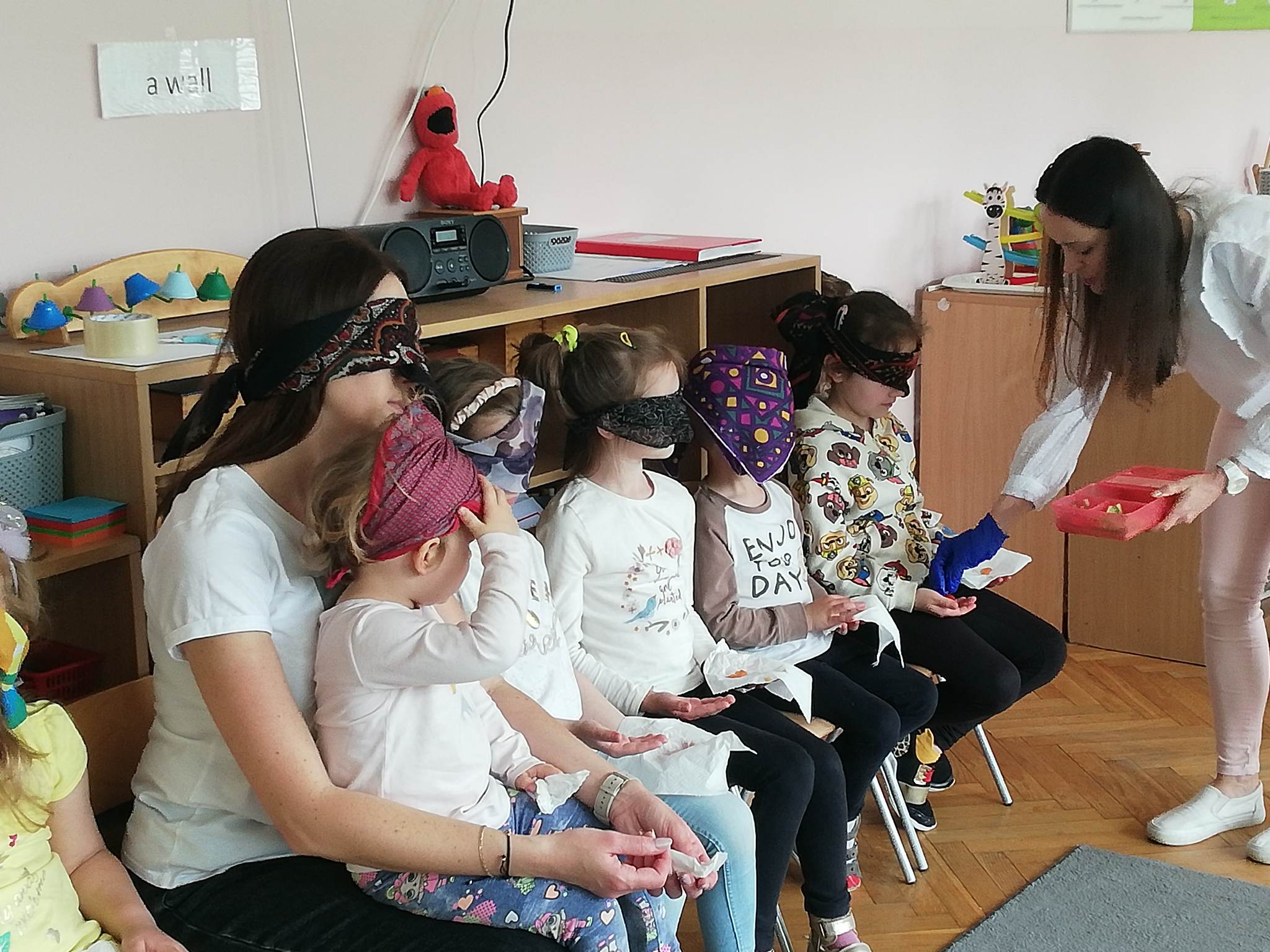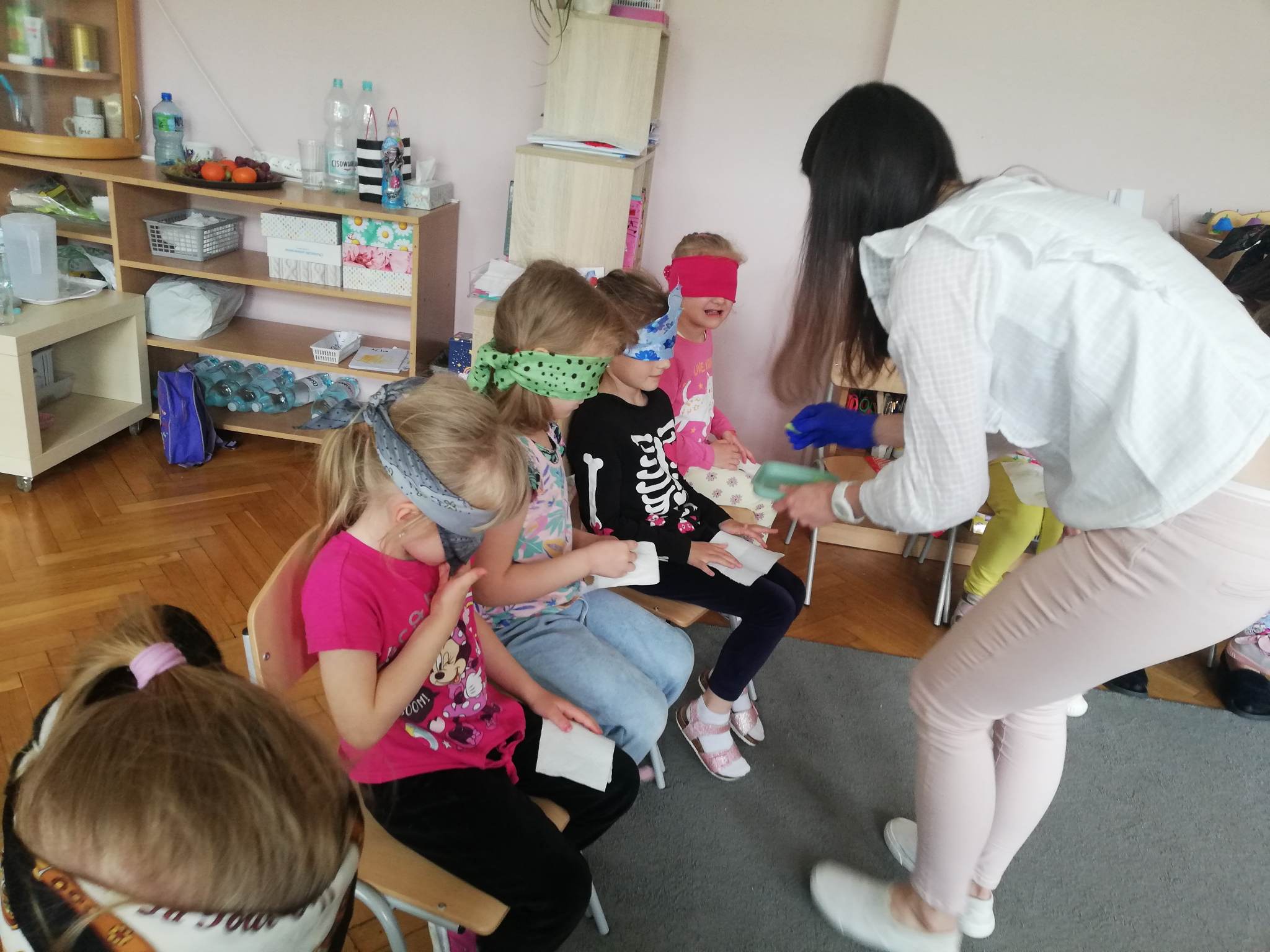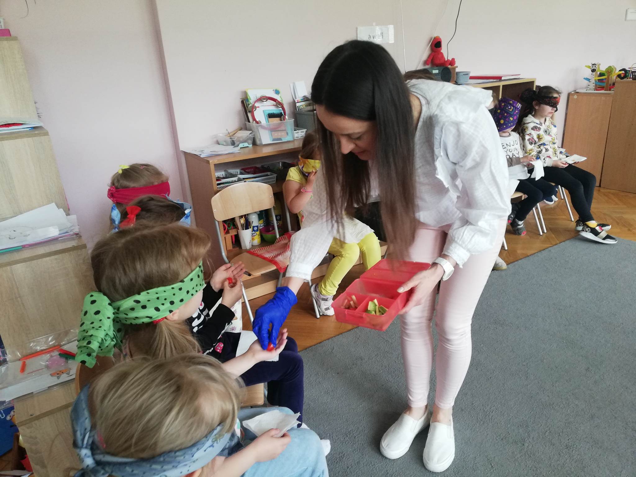To były bardzo zdrowe i witaminowe zajęcia. Odgadywanie warzyw i owoców po smaku i zapachu sprawiło przedszkolakom dużo radości. Pani Madzia była pod wrażeniem i stwierdziła, że grupa Czerwona świetnie poradziła sobie z tym zadaniem.