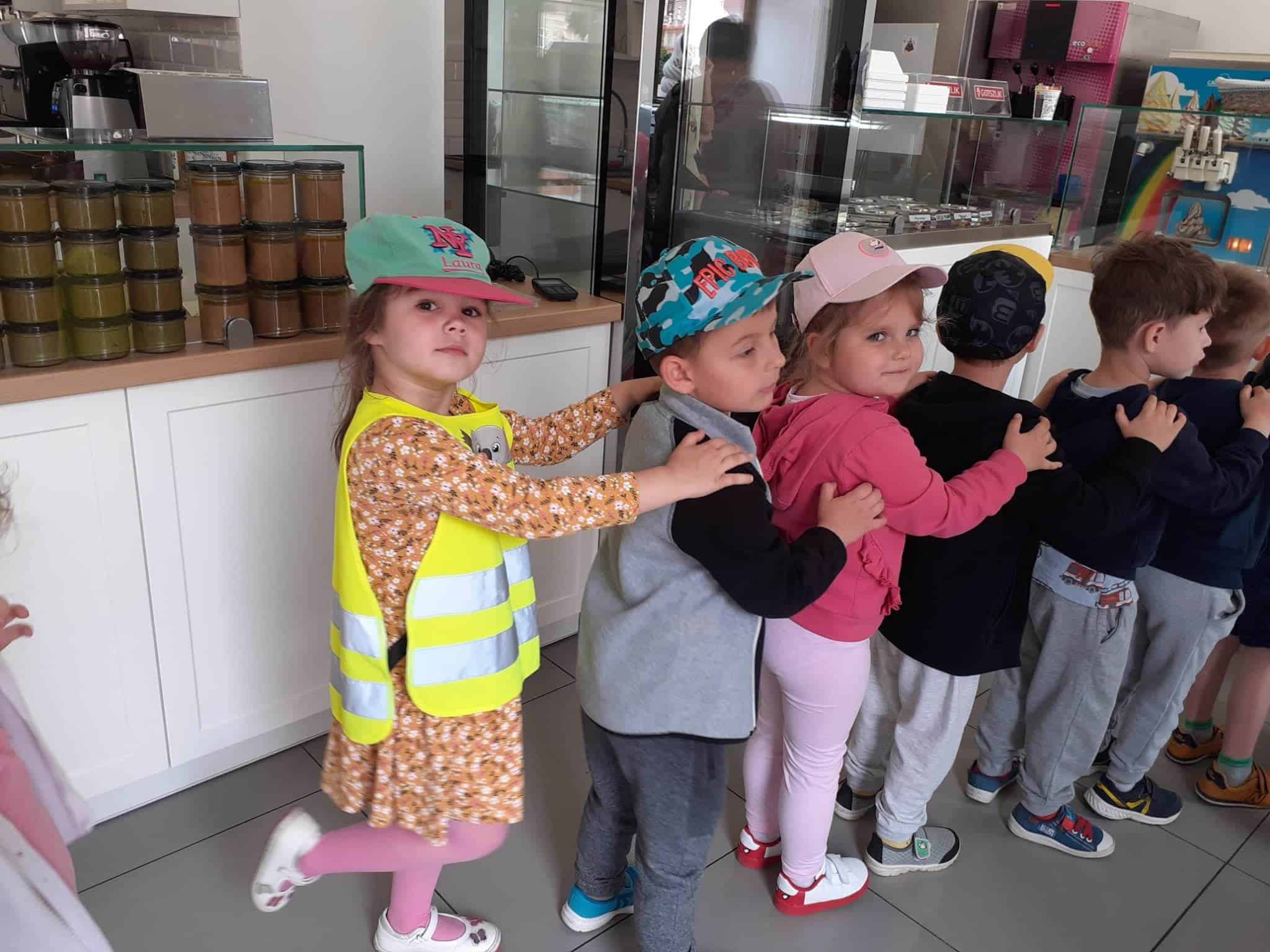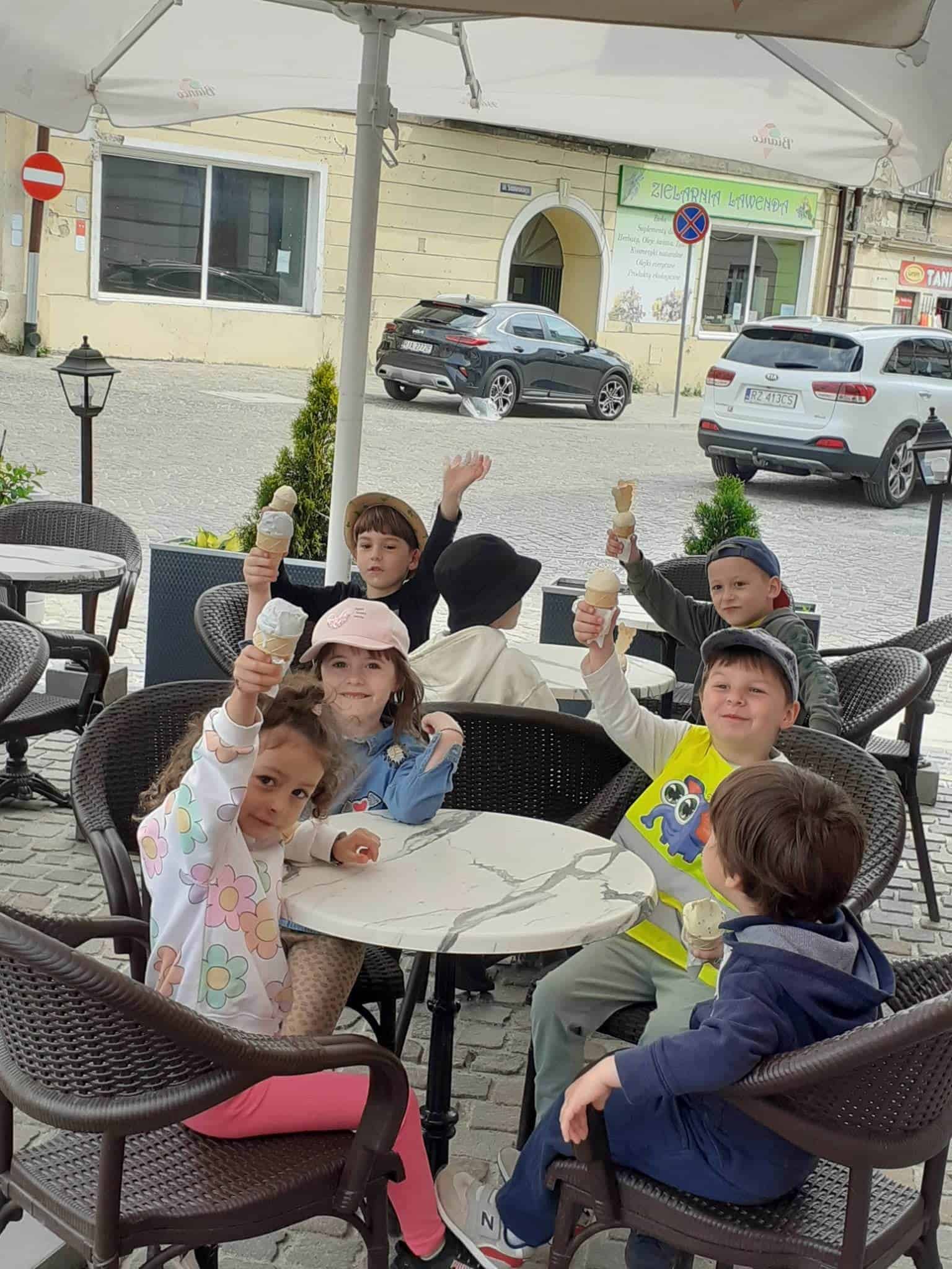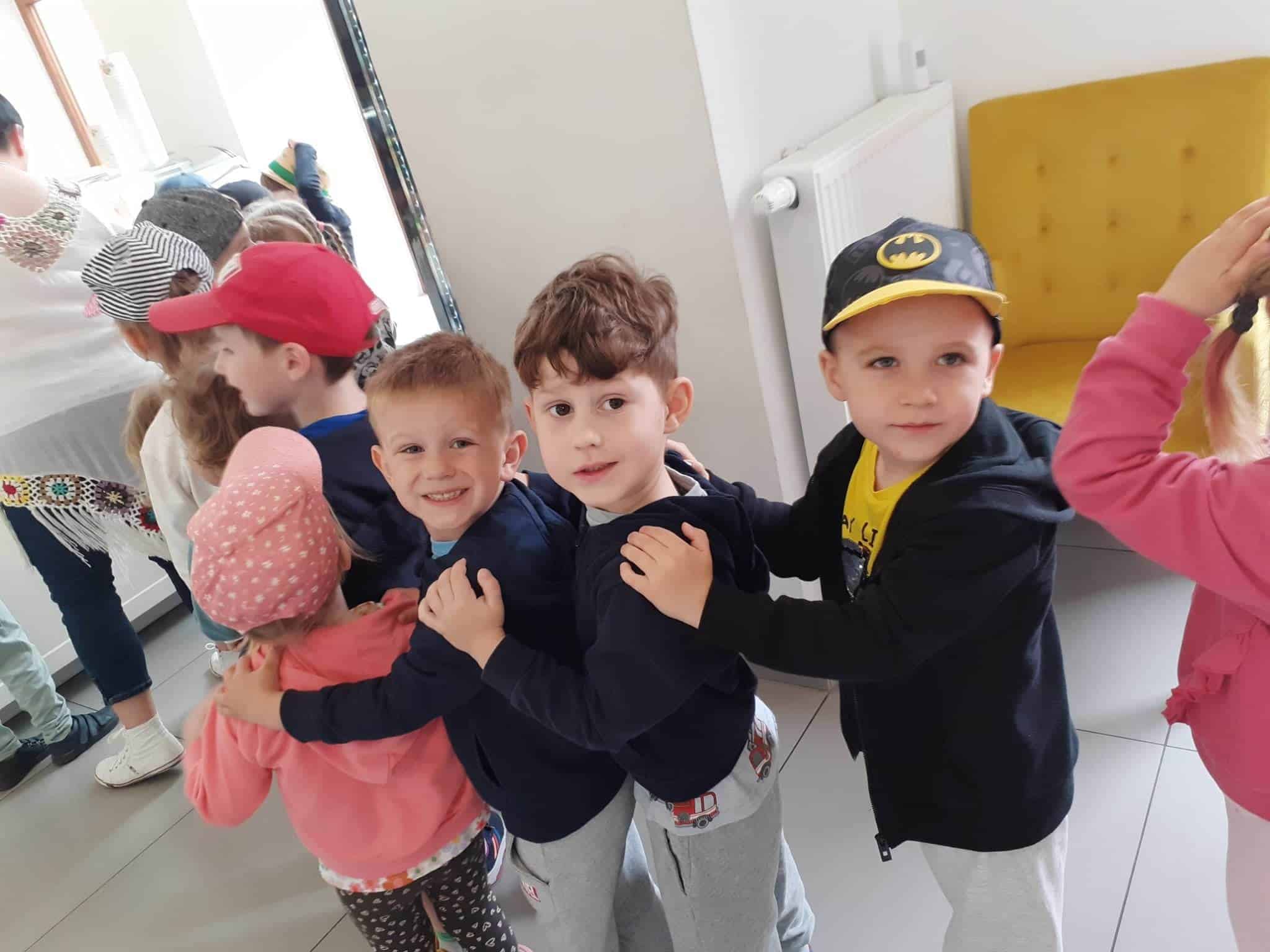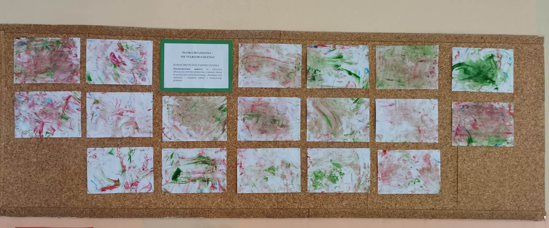 Użyliśmy ją do marmurkowania papieru – to niezwykle dekoracyjna technika plastyczna, a zarazem okazja do poznawania polisensorycznego, określania cech substancji i czerpania radości z kreatywnego działania. Powstałe prace można było obejrzeć na gazetce w holu.