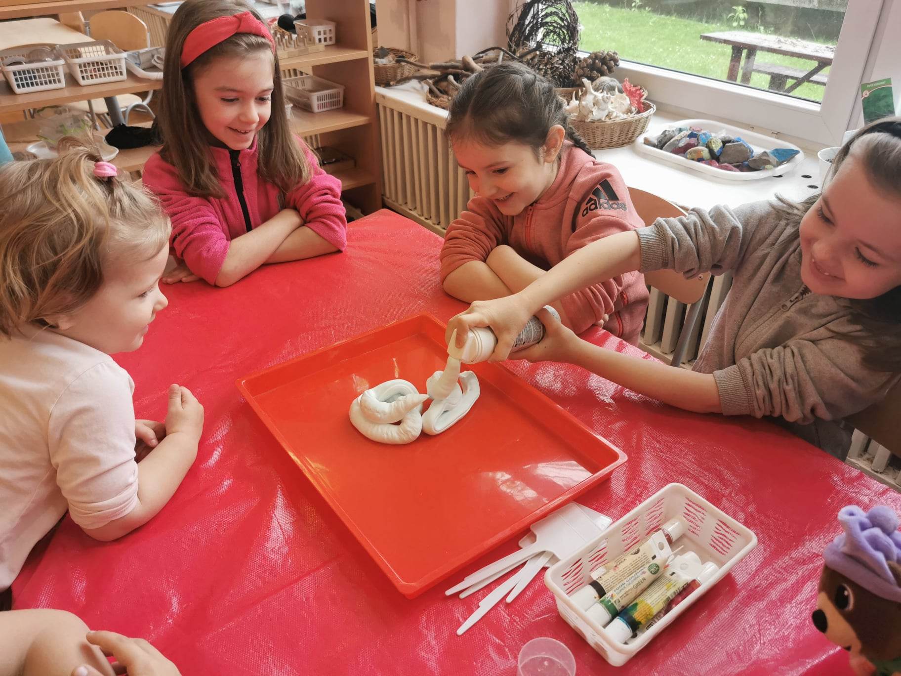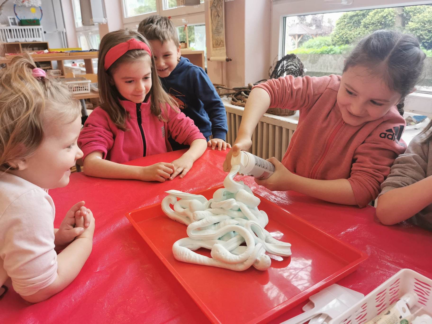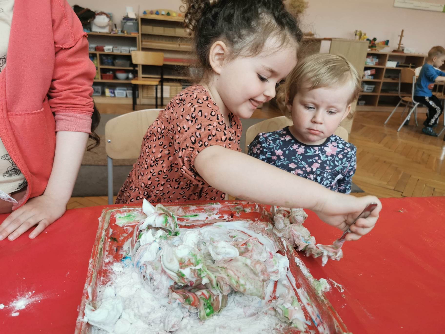 Zrobiliśmy także piankolinę – to bardzo delikatna, miękka, przyjemna w dotyku masa plastyczna prosta w wykonaniu. Potrzebna była nam oczywiście pianka do golenia, mąka ziemniaczana i barwnik spożywczy – należało wszystko porządnie wymieszać i gotowe!