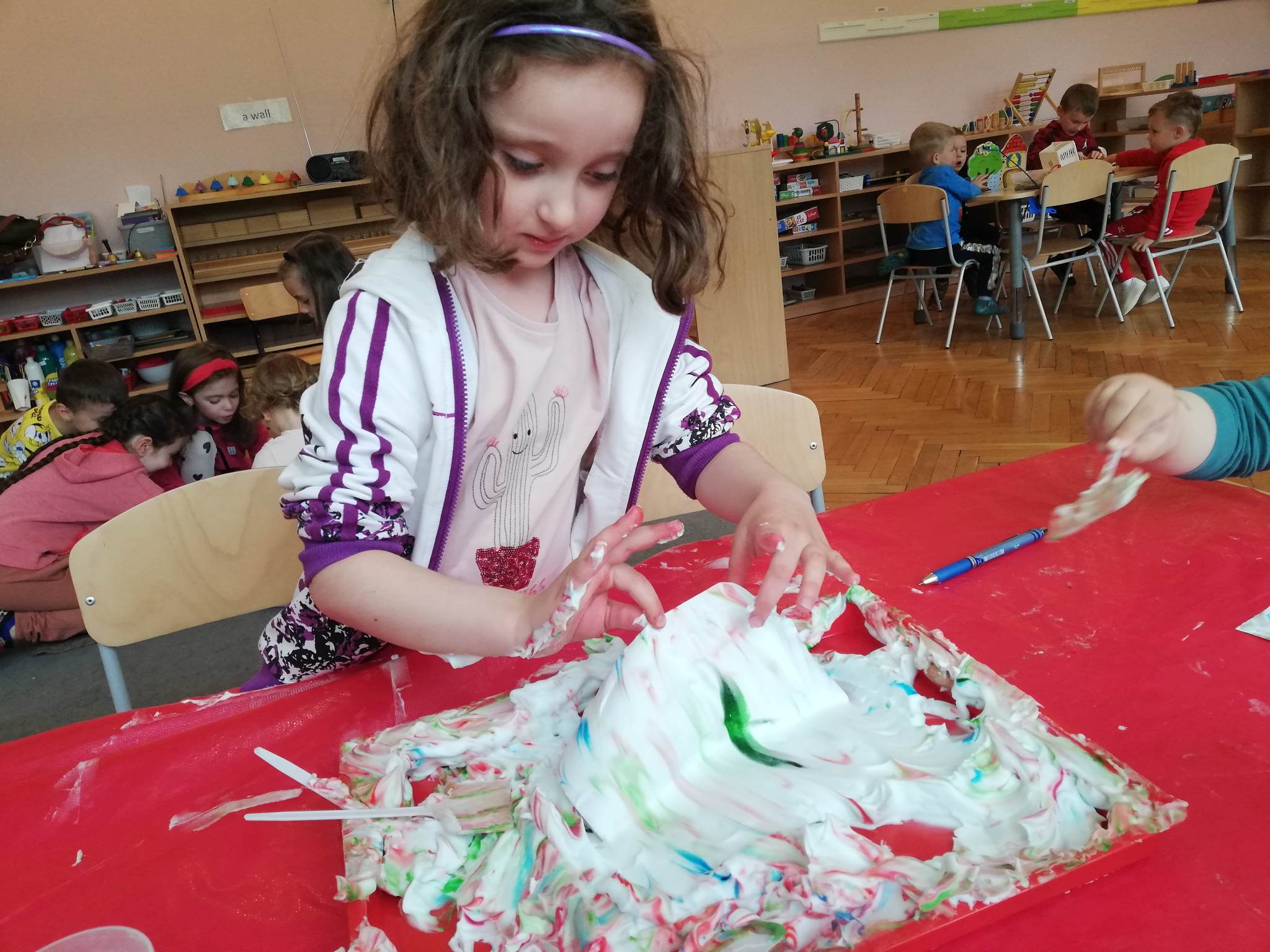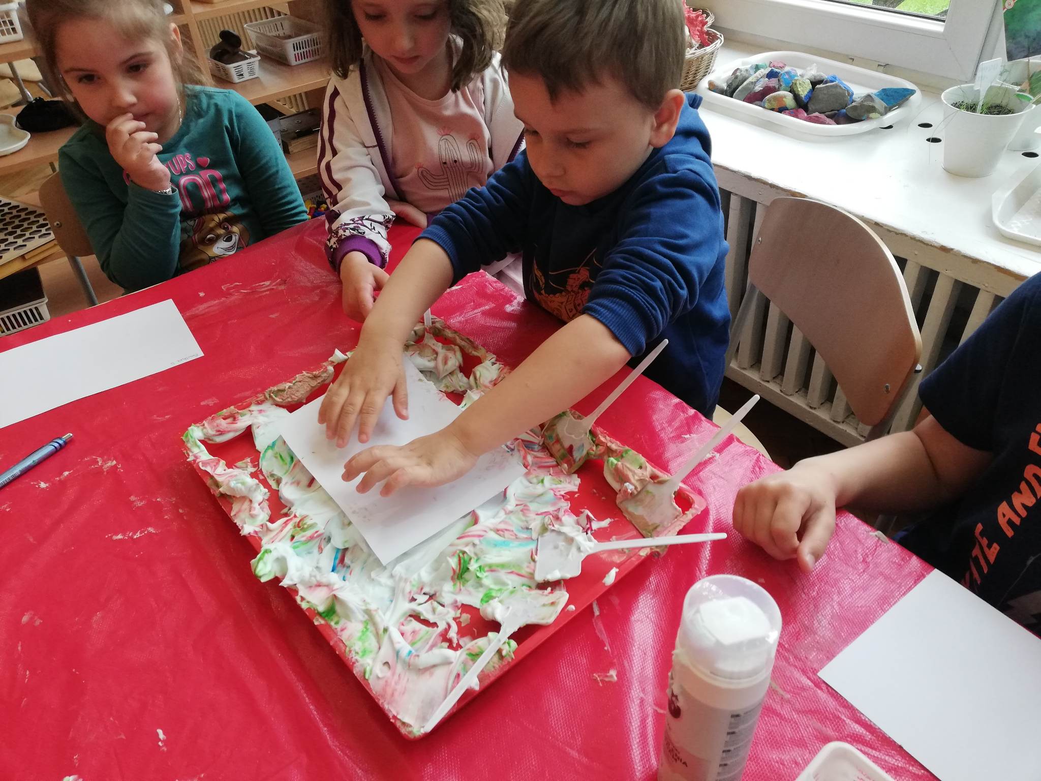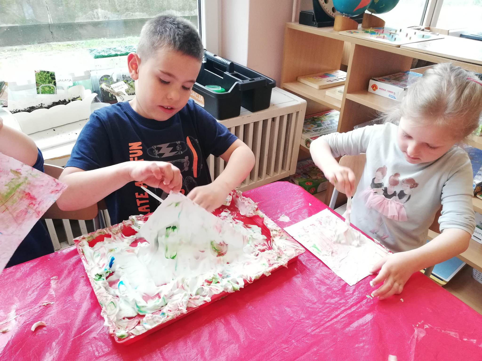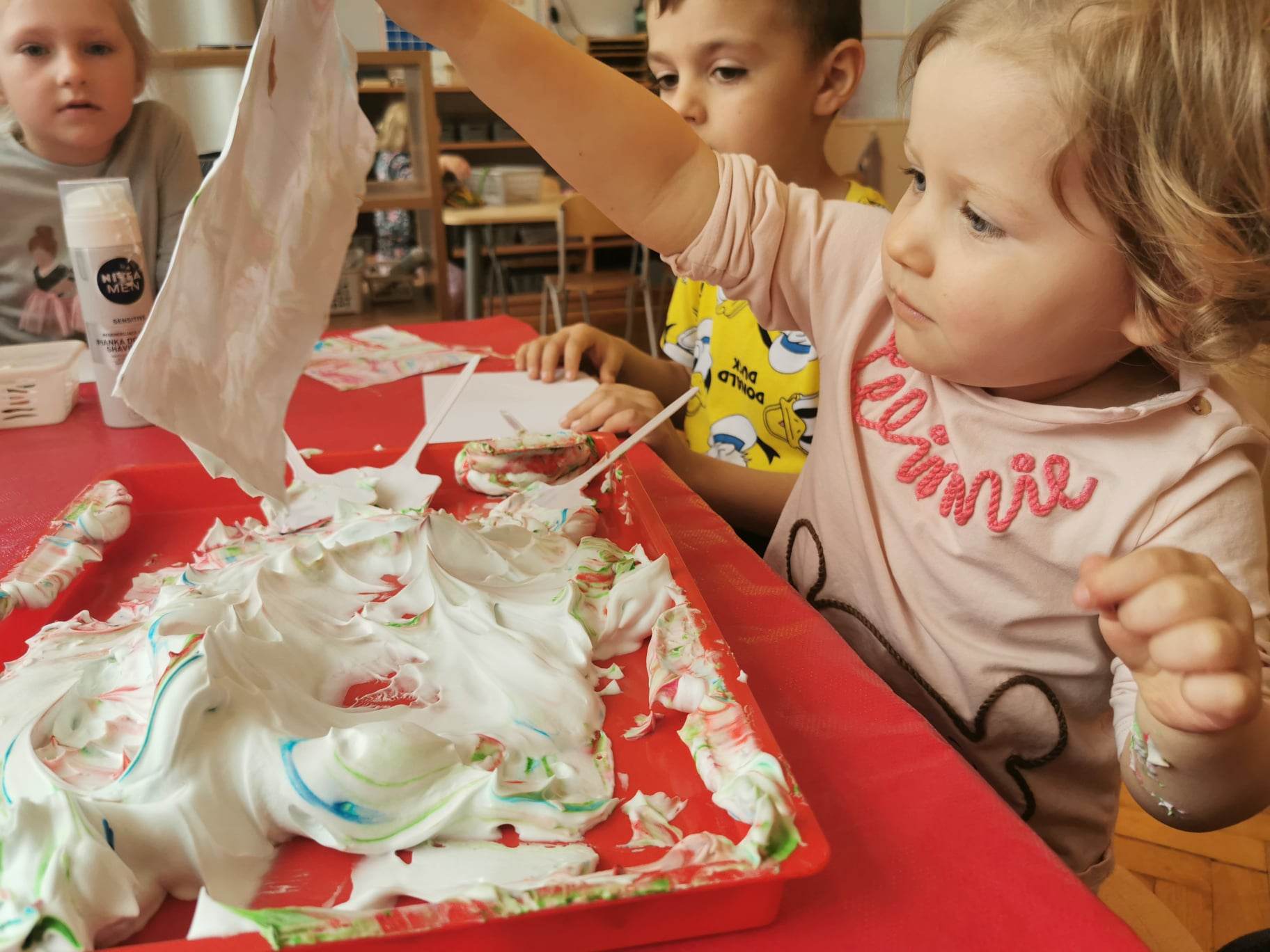 Eksperymentowanie z pianką do golenia przyniosło nam dużo frajdy, co prawda było przy tym trochę bałaganu, ale czego nie robi się dla dobrej zabawy, przy okazji sprawdziliśmy nasze umiejętności z zakresu praktycznego dnia – z porządkowaniem warsztatu pracy poradziliśmy sobie bardzo dobrze.