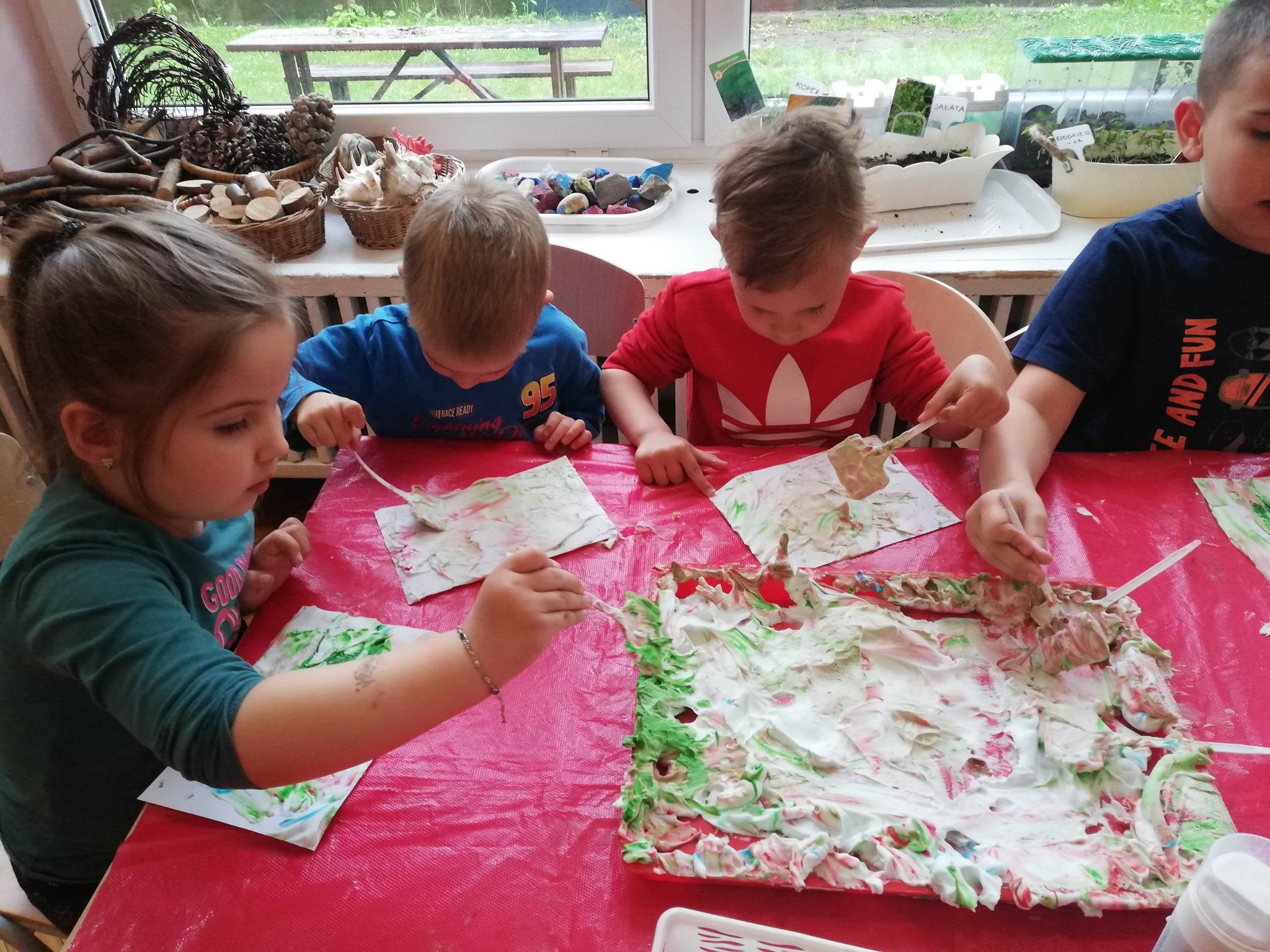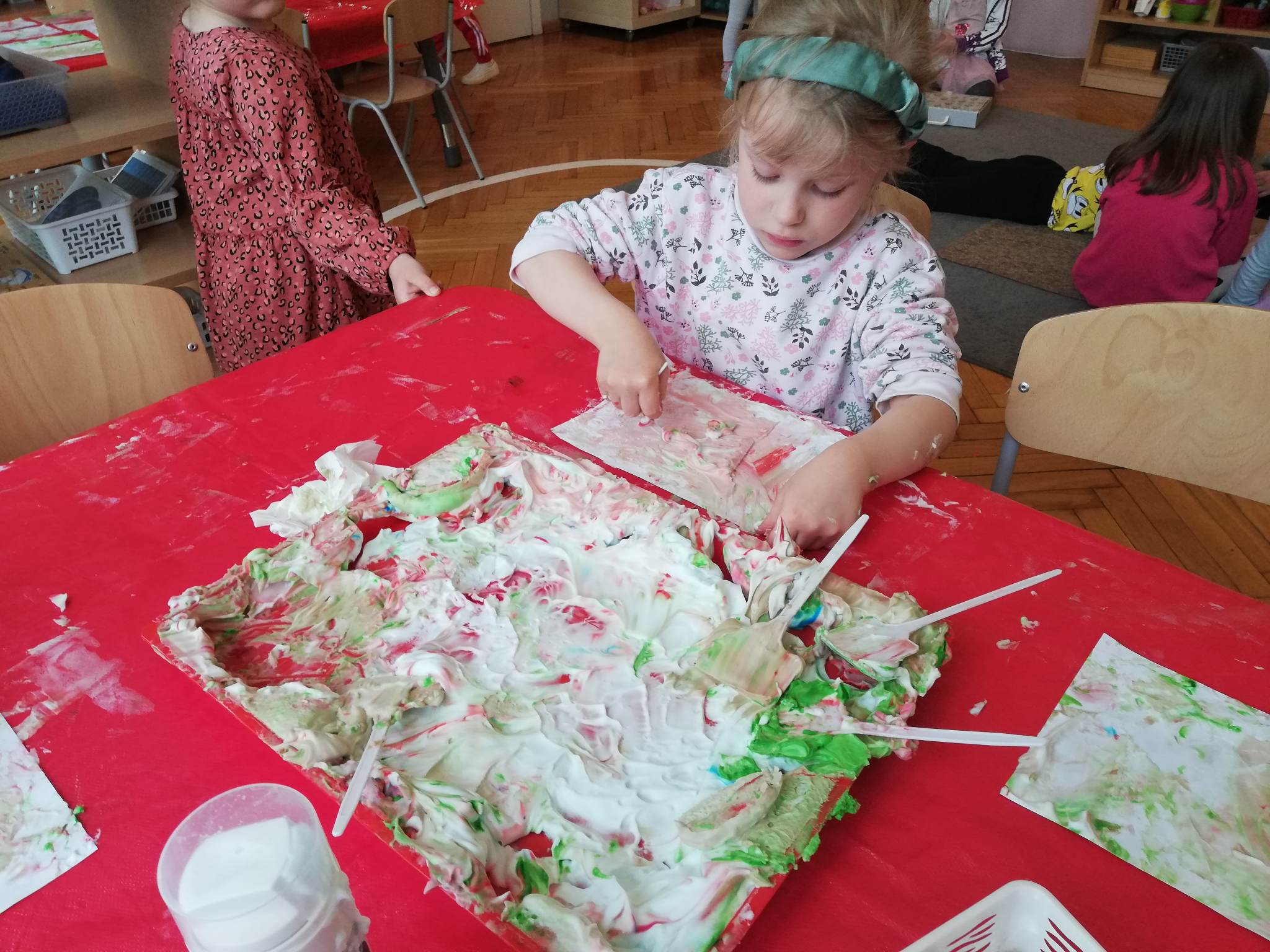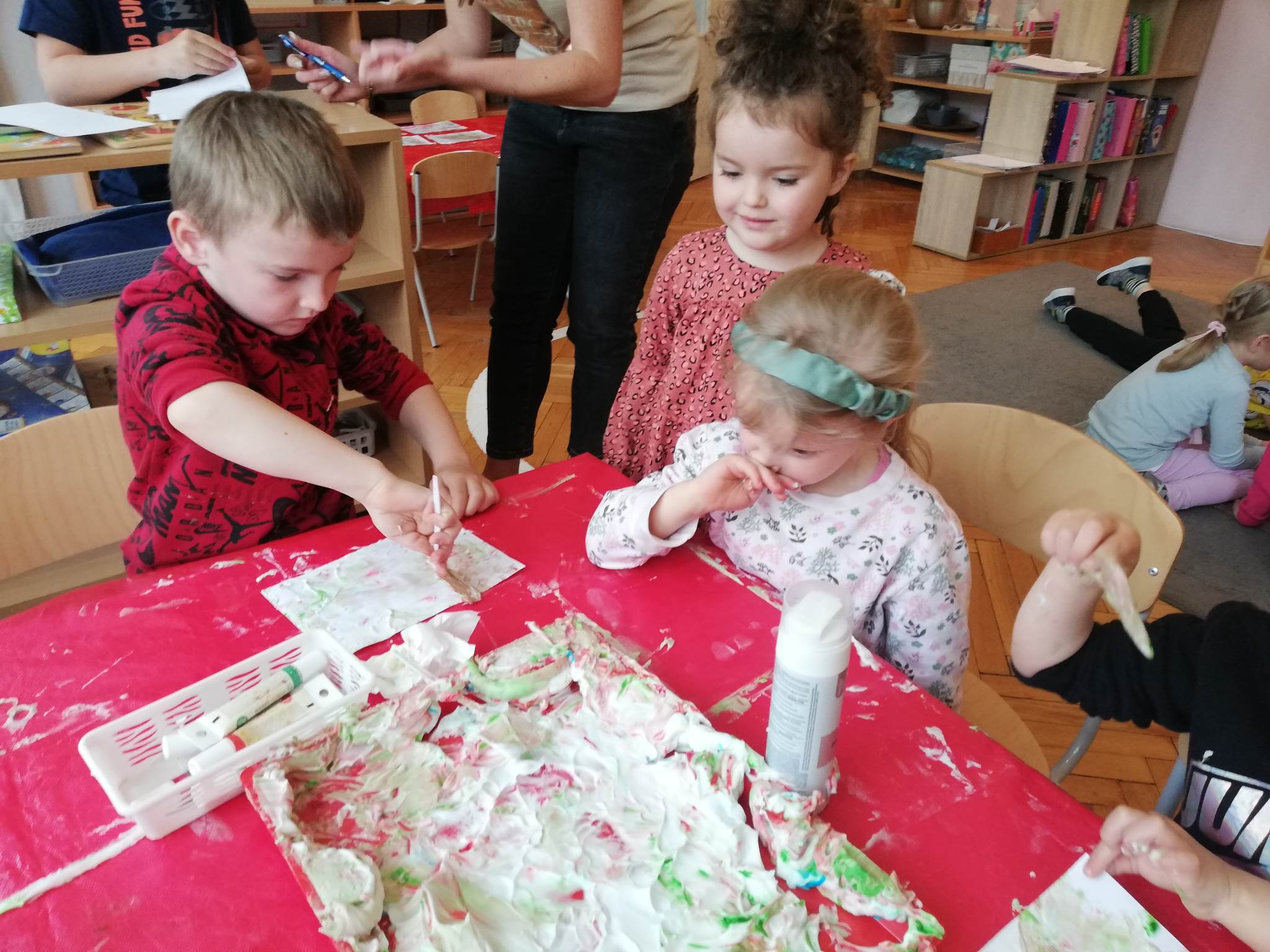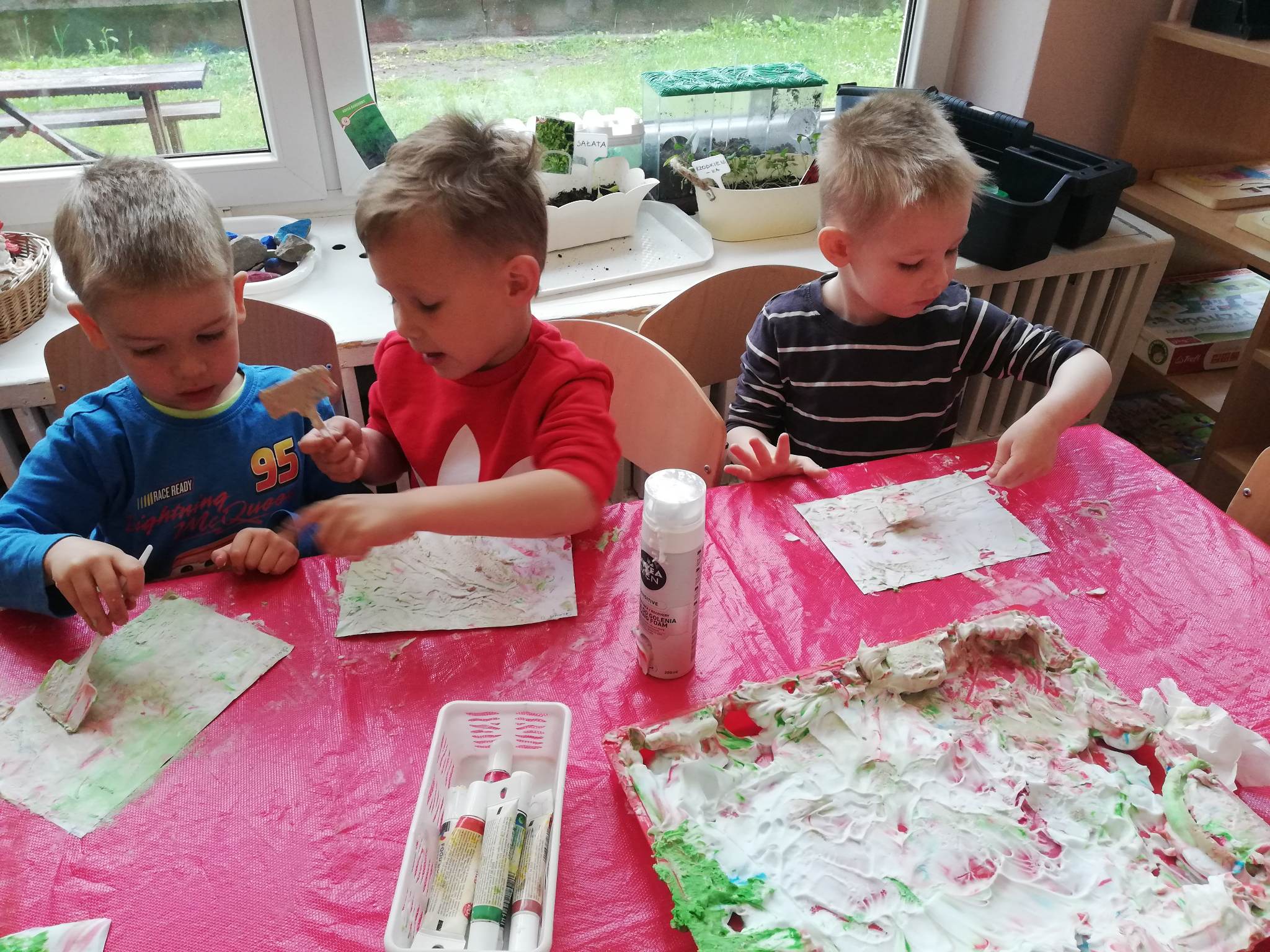 Eksperymentowanie z pianką do golenia przyniosło nam dużo frajdy, co prawda było przy tym trochę bałaganu, ale czego nie robi się dla dobrej zabawy, przy okazji sprawdziliśmy nasze umiejętności z zakresu praktycznego dnia – z porządkowaniem warsztatu pracy poradziliśmy sobie bardzo dobrze.