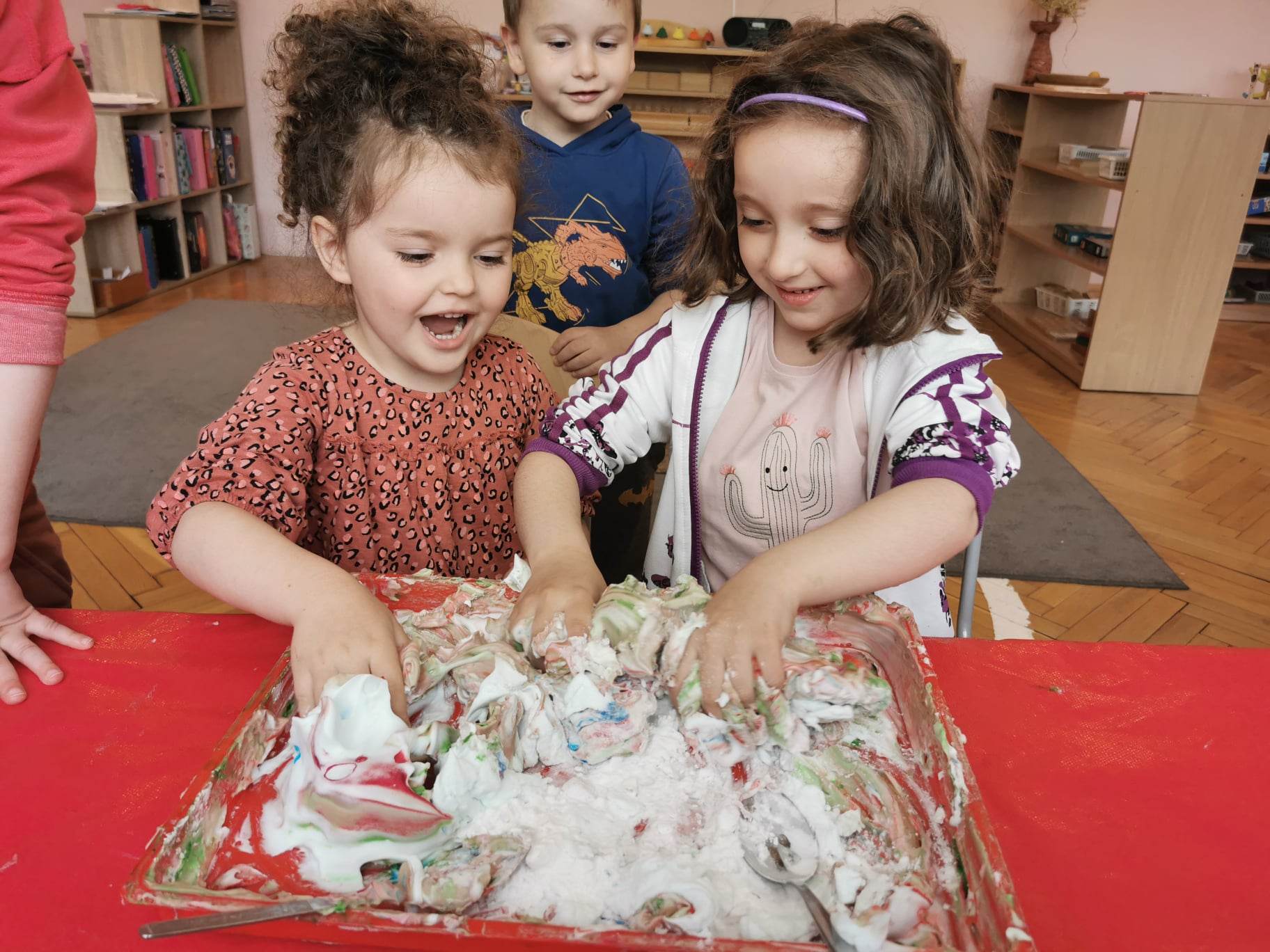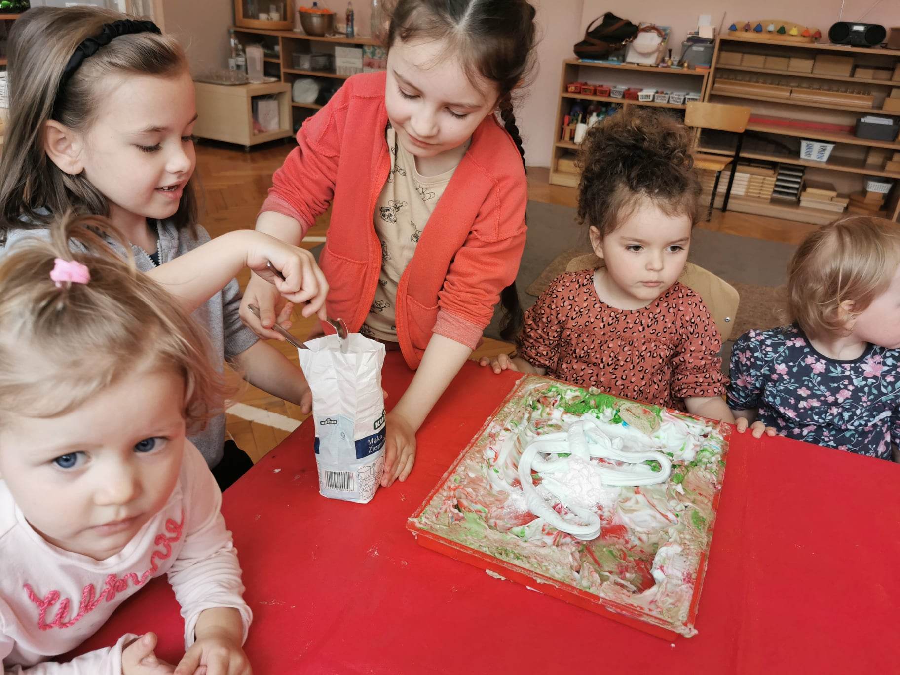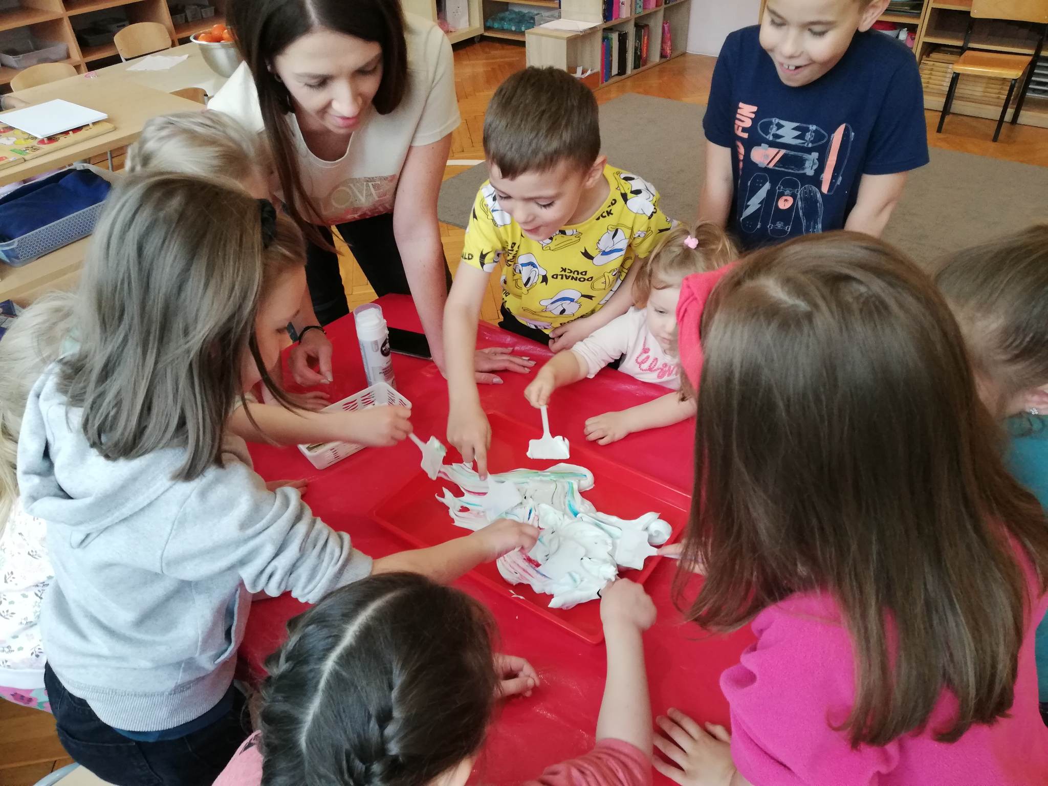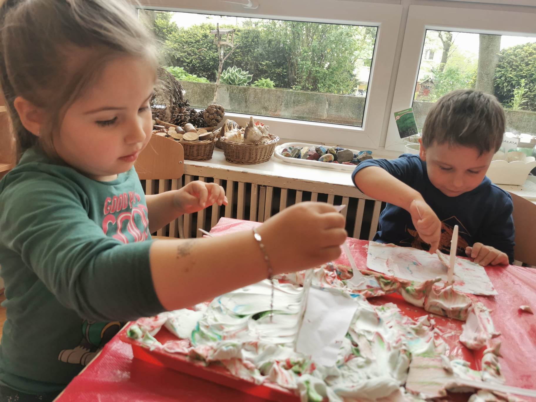 Eksperymentowanie z pianką do golenia przyniosło nam dużo frajdy, co prawda było przy tym trochę bałaganu, ale czego nie robi się dla dobrej zabawy, przy okazji sprawdziliśmy nasze umiejętności z zakresu praktycznego dnia – z porządkowaniem warsztatu pracy poradziliśmy sobie bardzo dobrze.