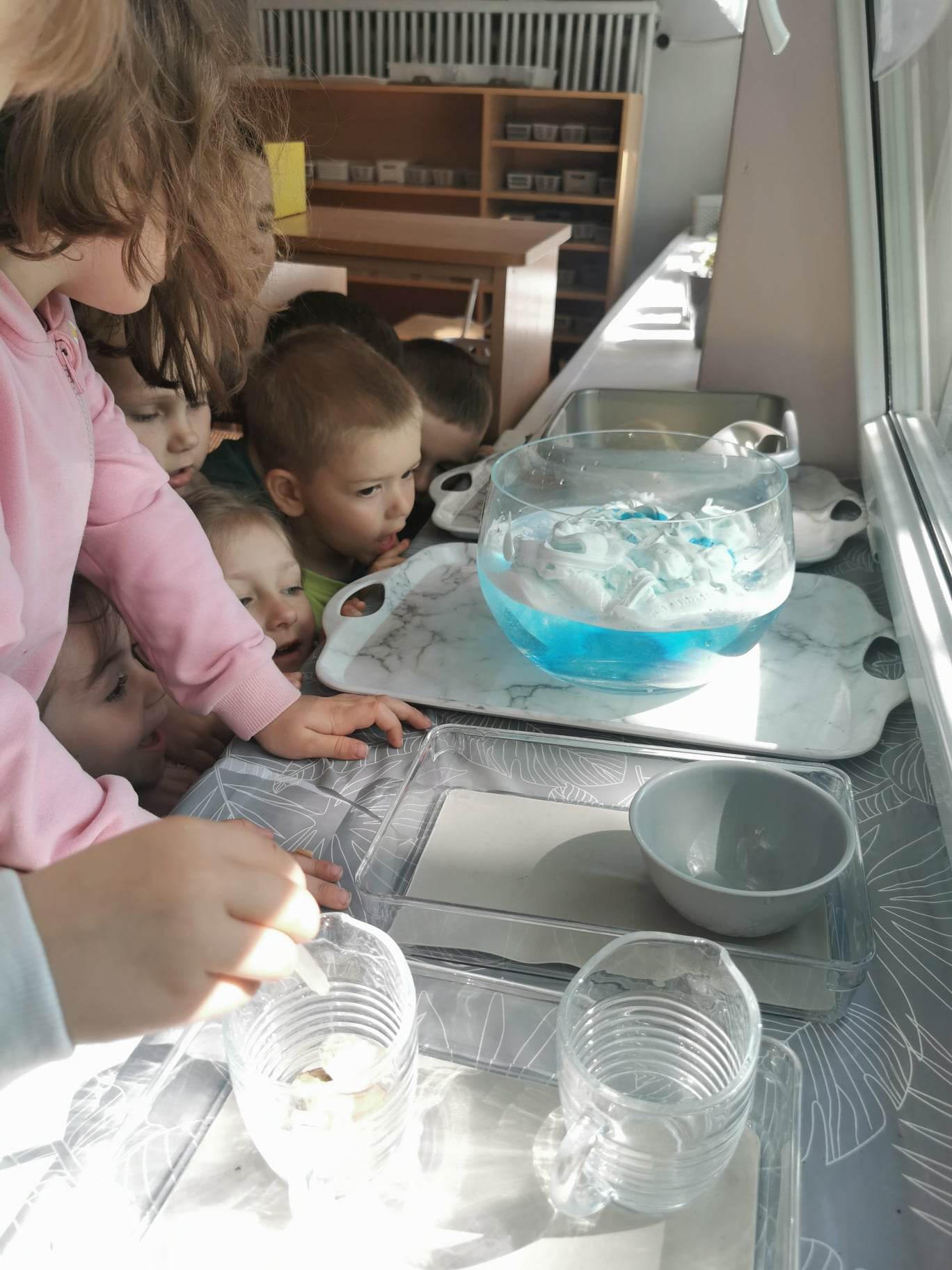 Przeprowadziliśmy również eksperyment – deszczowa chmurka, co pozwoliło małym odkrywcom lepiej zrozumieć zjawiska zachodzące w otoczeniu i znaleźć odpowiedź na pytanie: dlaczego krople spadają, a pianka się unosi?