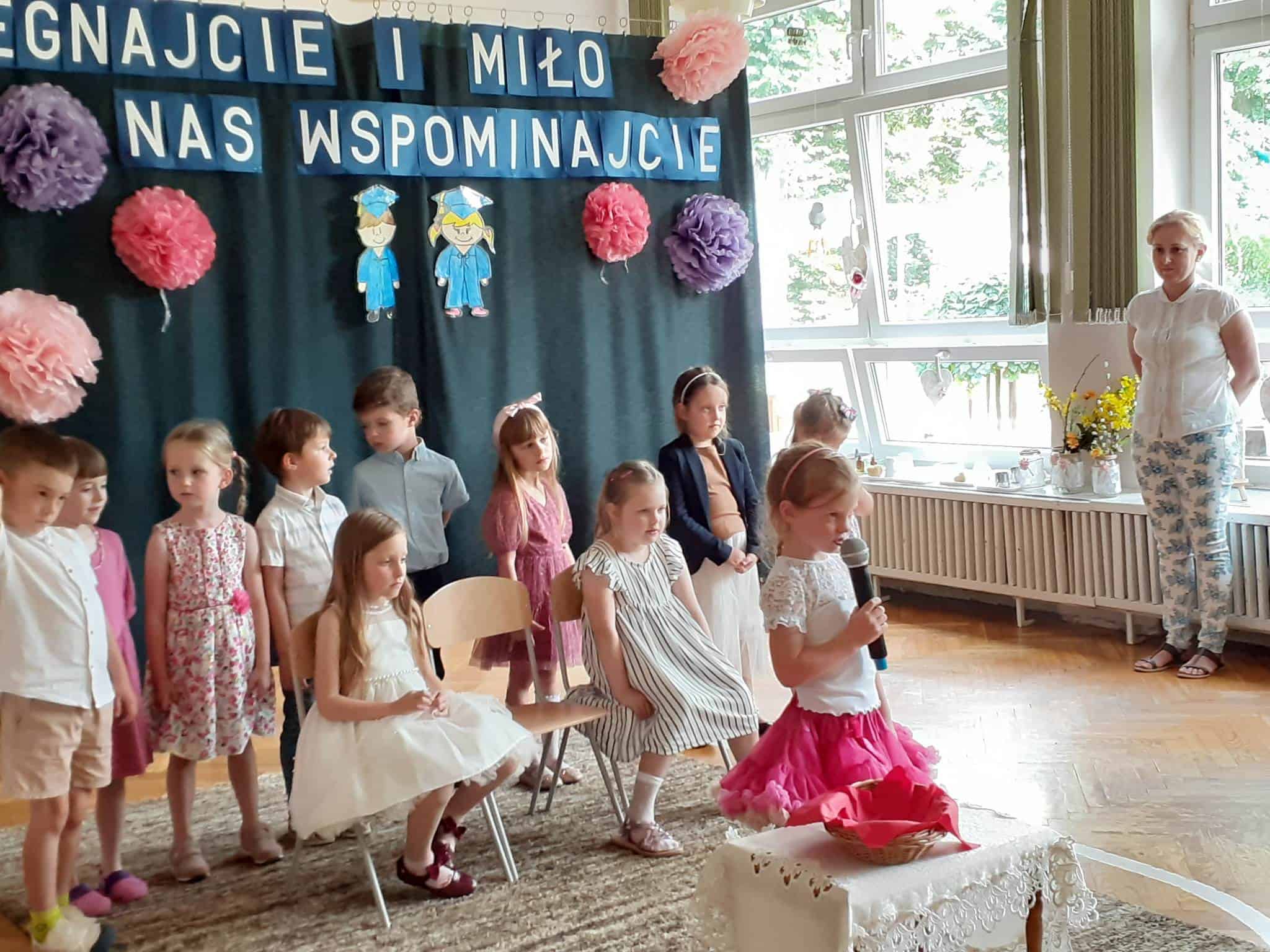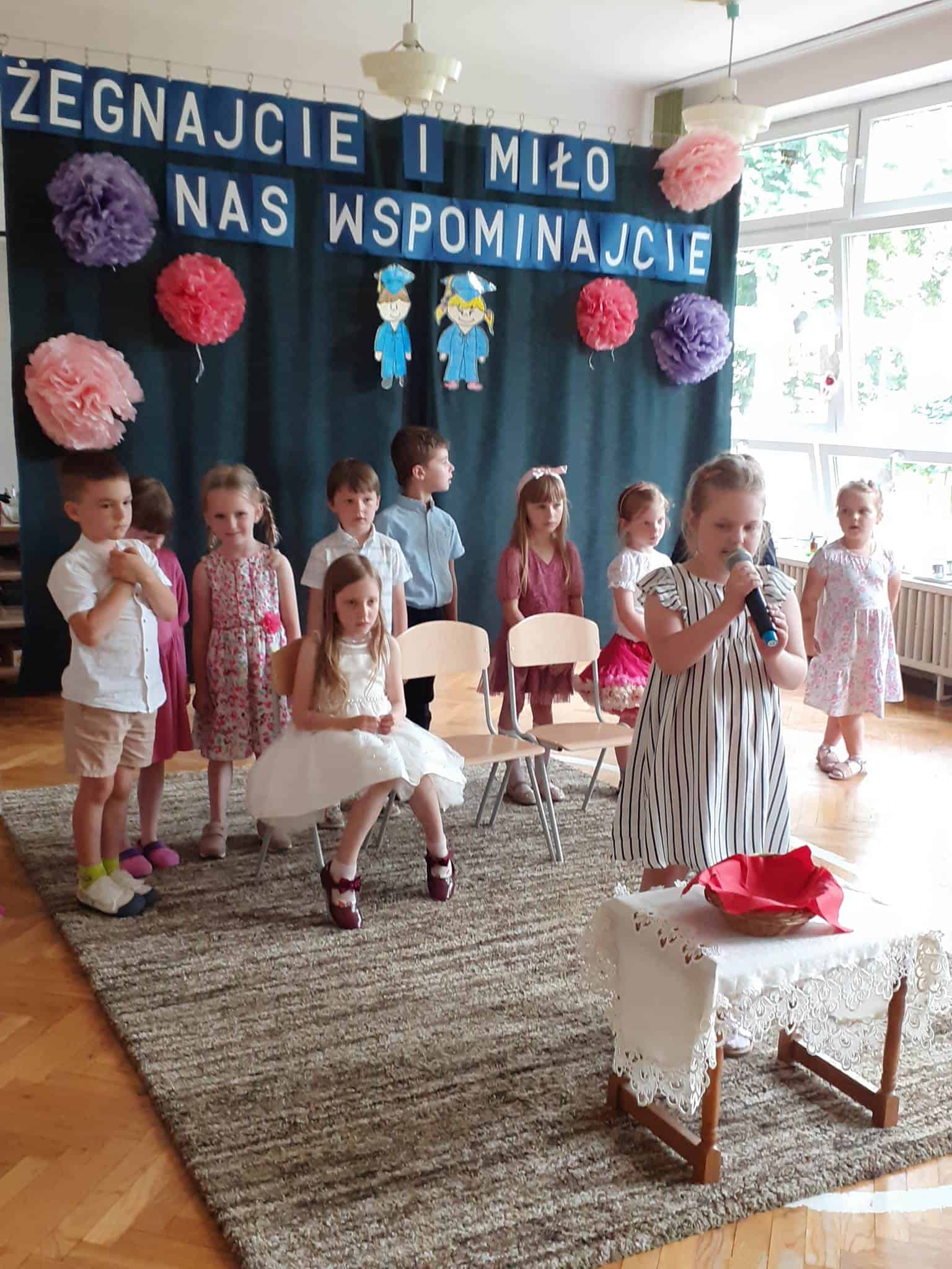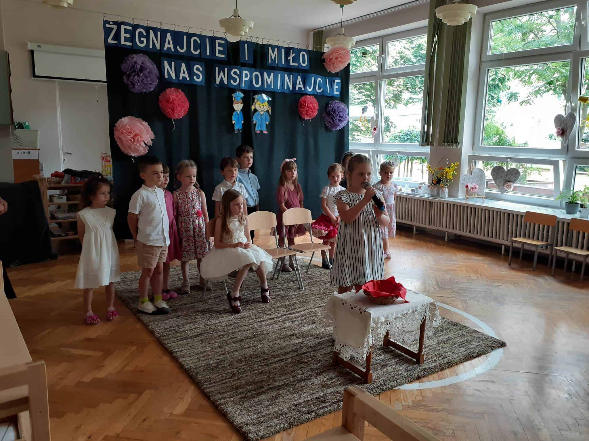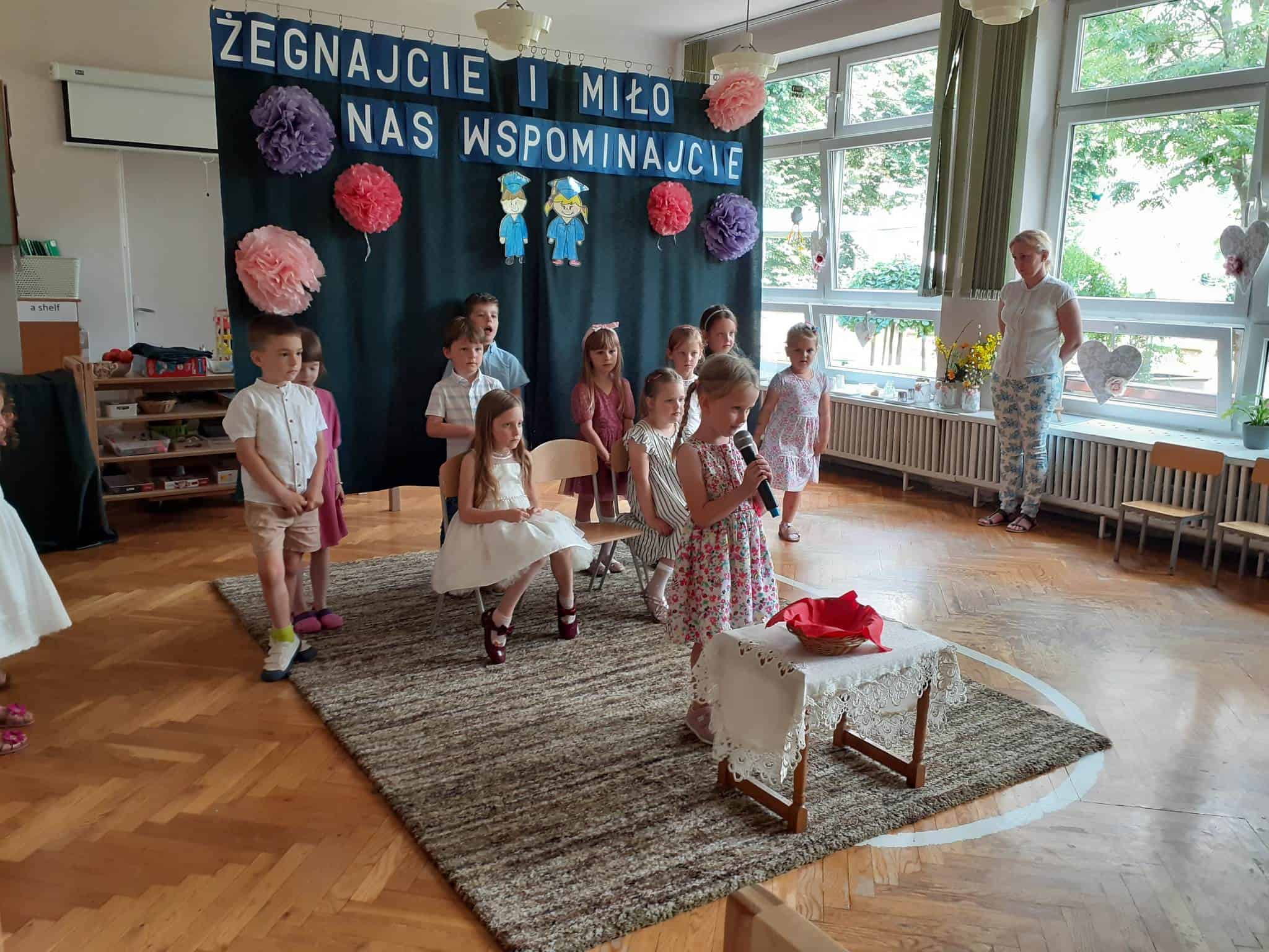 Następnie dzieci zaprezentowały przygotowany wcześniej montaż słowno-muzyczny. Starszaki, które po wakacjach już do nas nie wrócą, żegnały przedszkole piosenkami i wierszami, w których wspominały wszystkie przeżyte tu lata. Nie zabrakło też wypowiedzi dzieci młodszych, które w swoim wystąpieniu, z żalem i tęsknotą w głosie, żegnały swoich starszych kolegów i koleżanki.