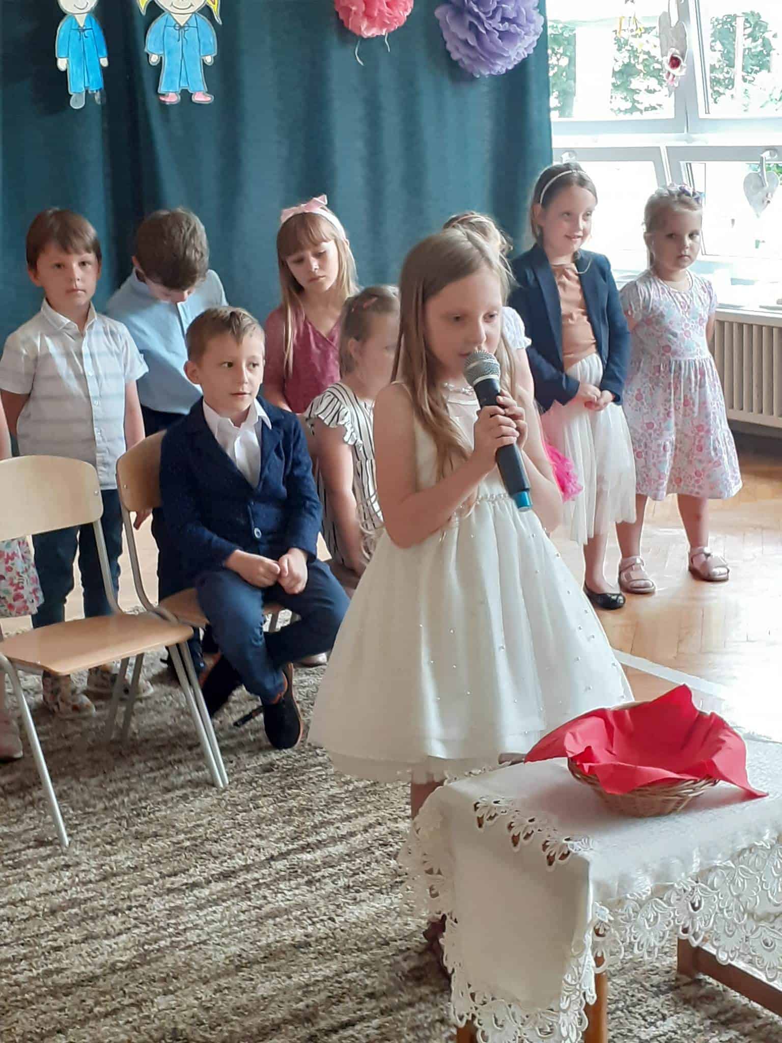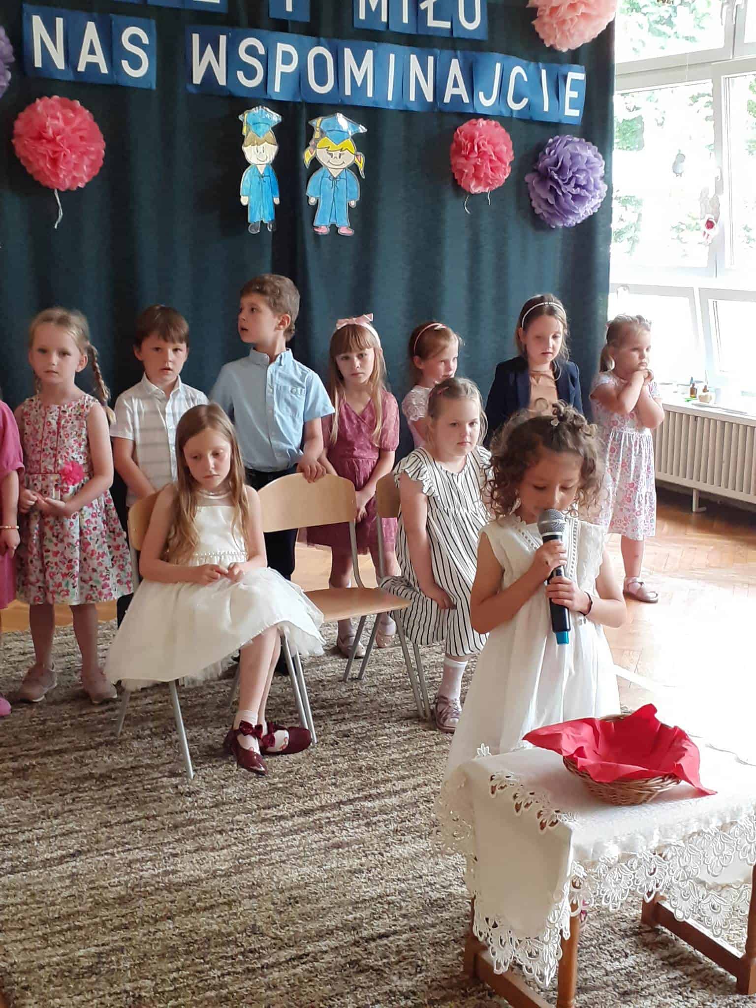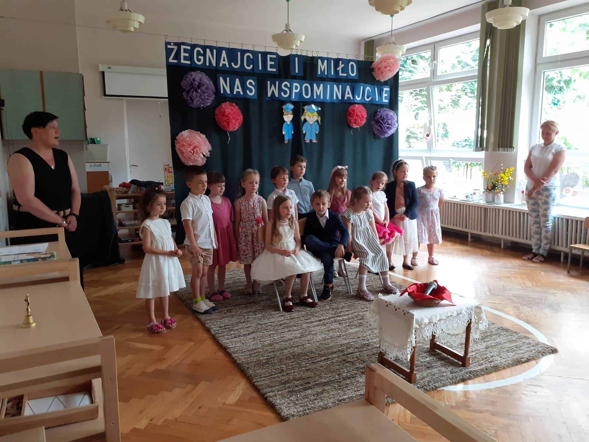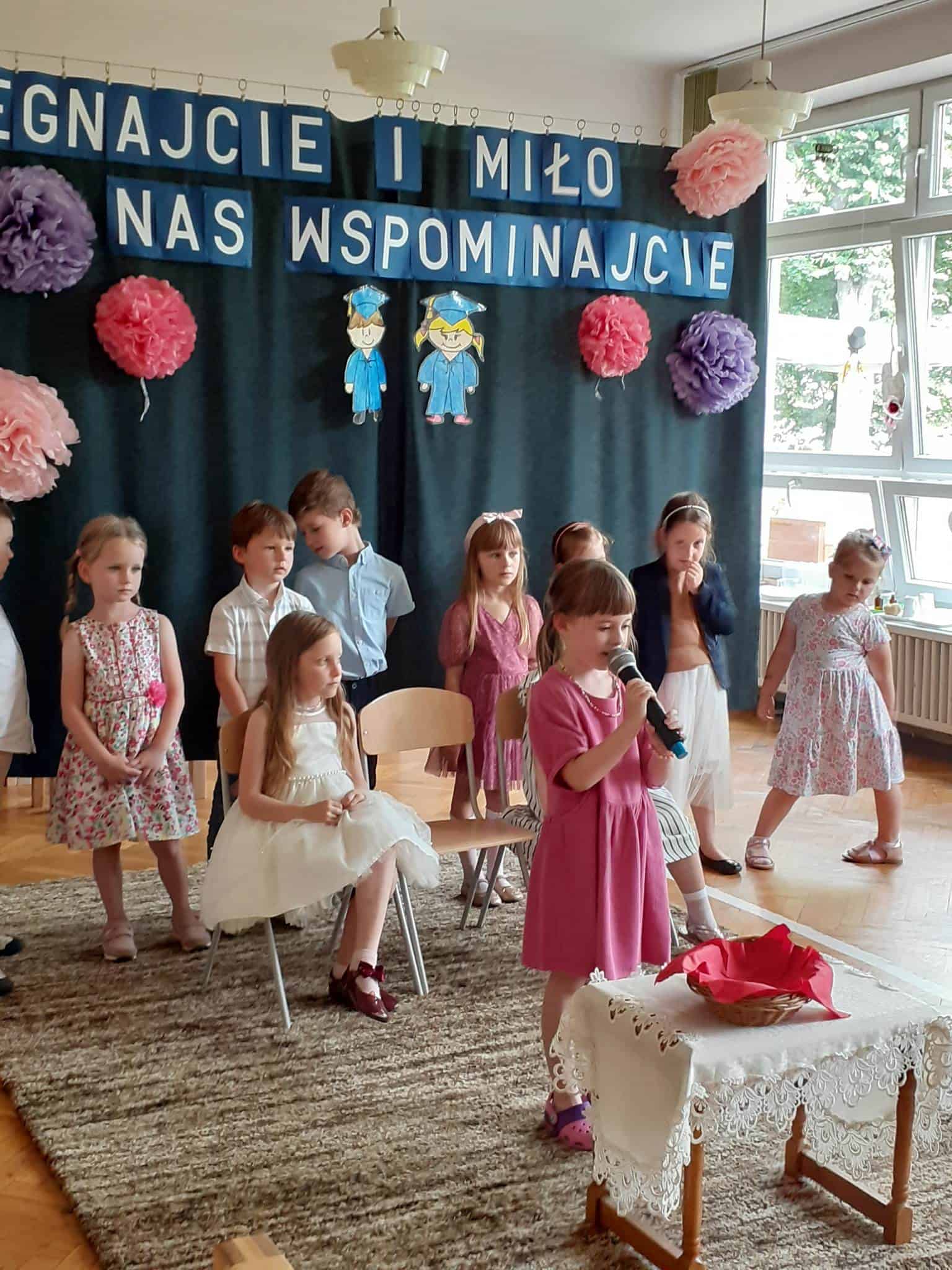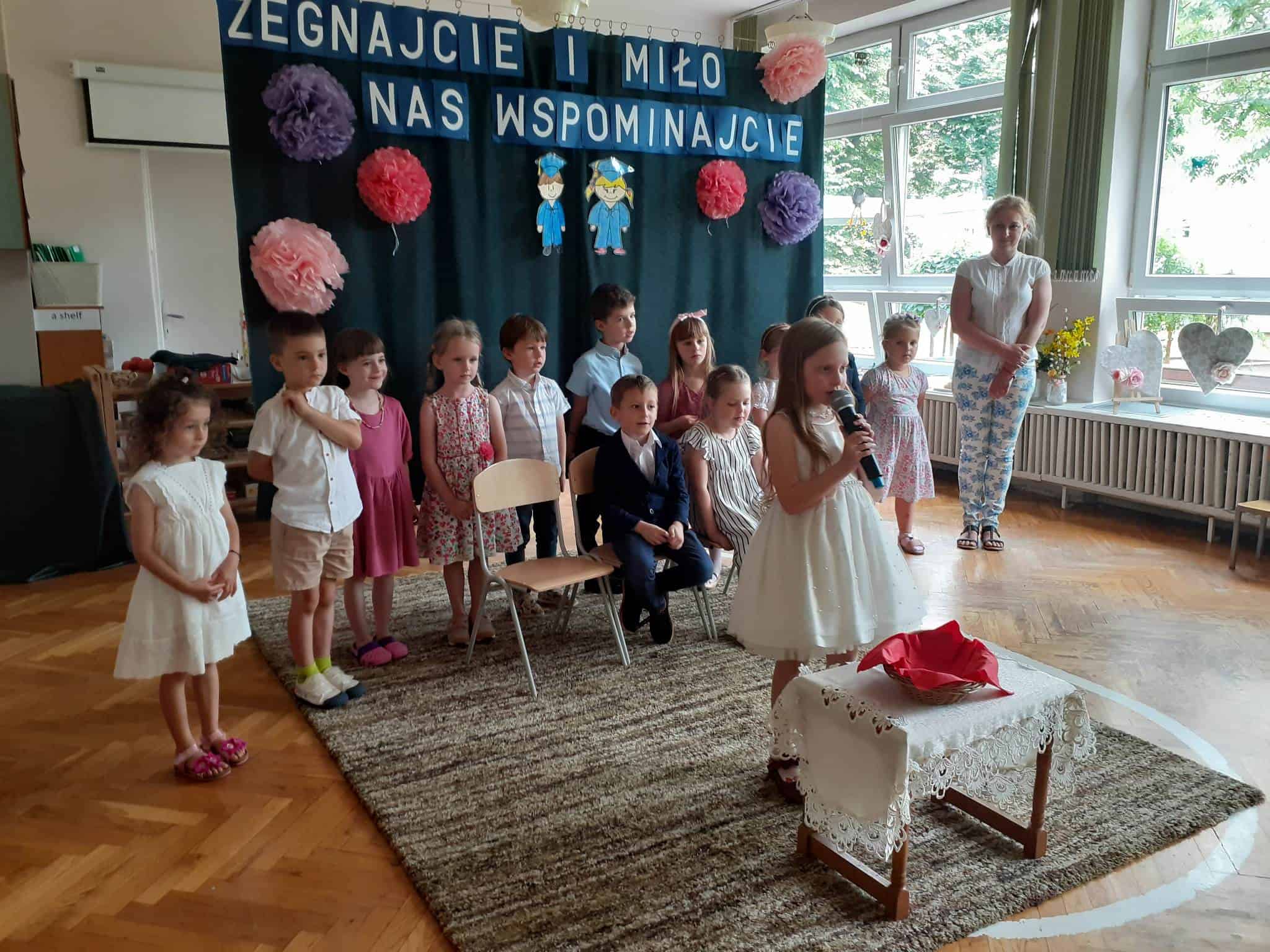 Następnie dzieci zaprezentowały przygotowany wcześniej montaż słowno-muzyczny. Starszaki, które po wakacjach już do nas nie wrócą, żegnały przedszkole piosenkami i wierszami, w których wspominały wszystkie przeżyte tu lata. Nie zabrakło też wypowiedzi dzieci młodszych, które w swoim wystąpieniu, z żalem i tęsknotą w głosie, żegnały swoich starszych kolegów i koleżanki.