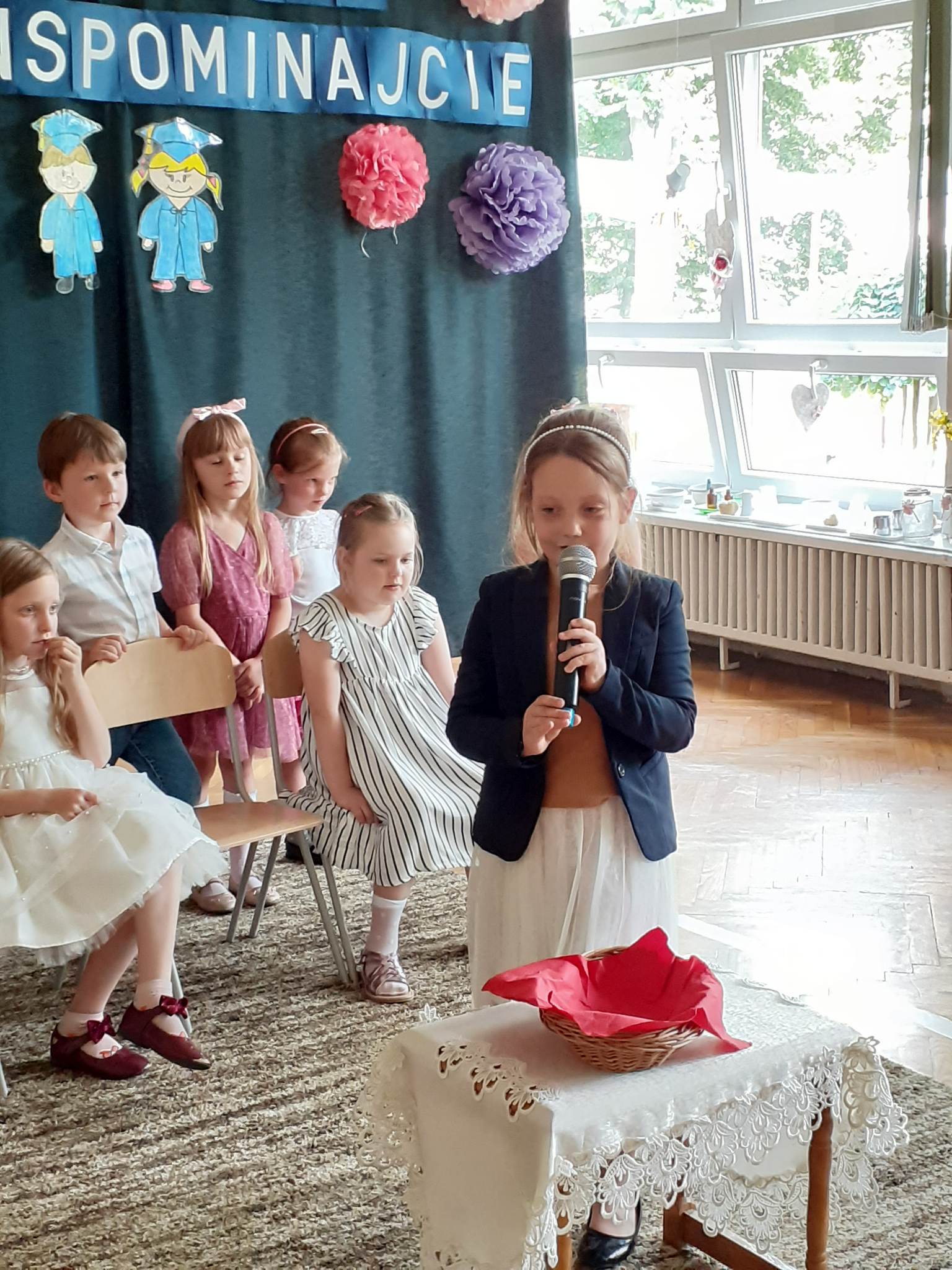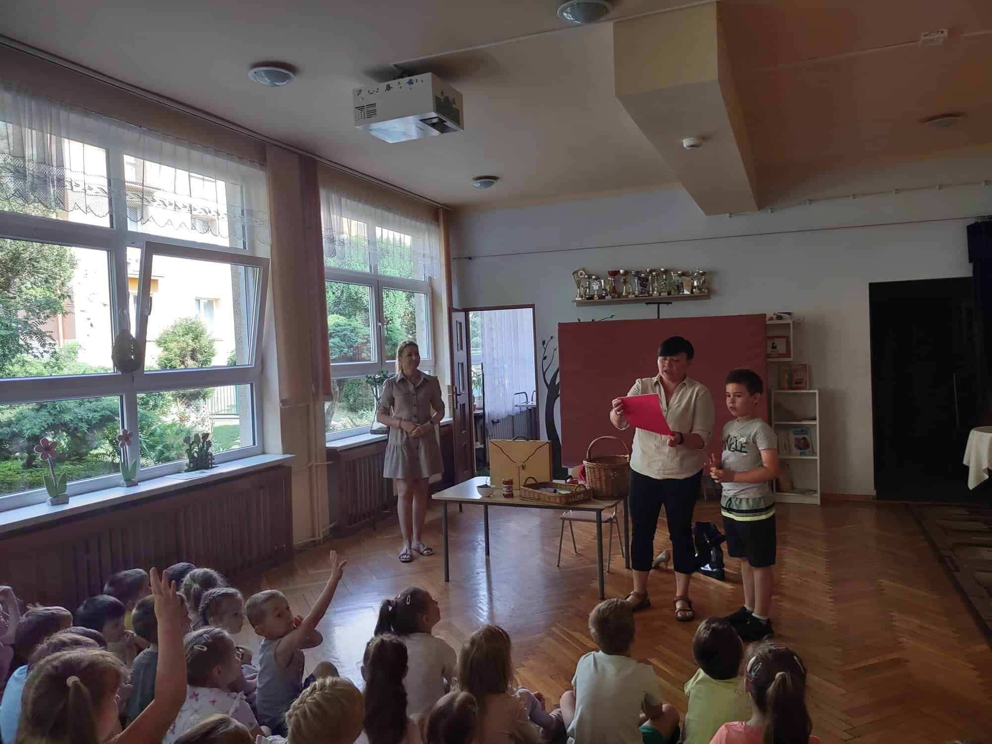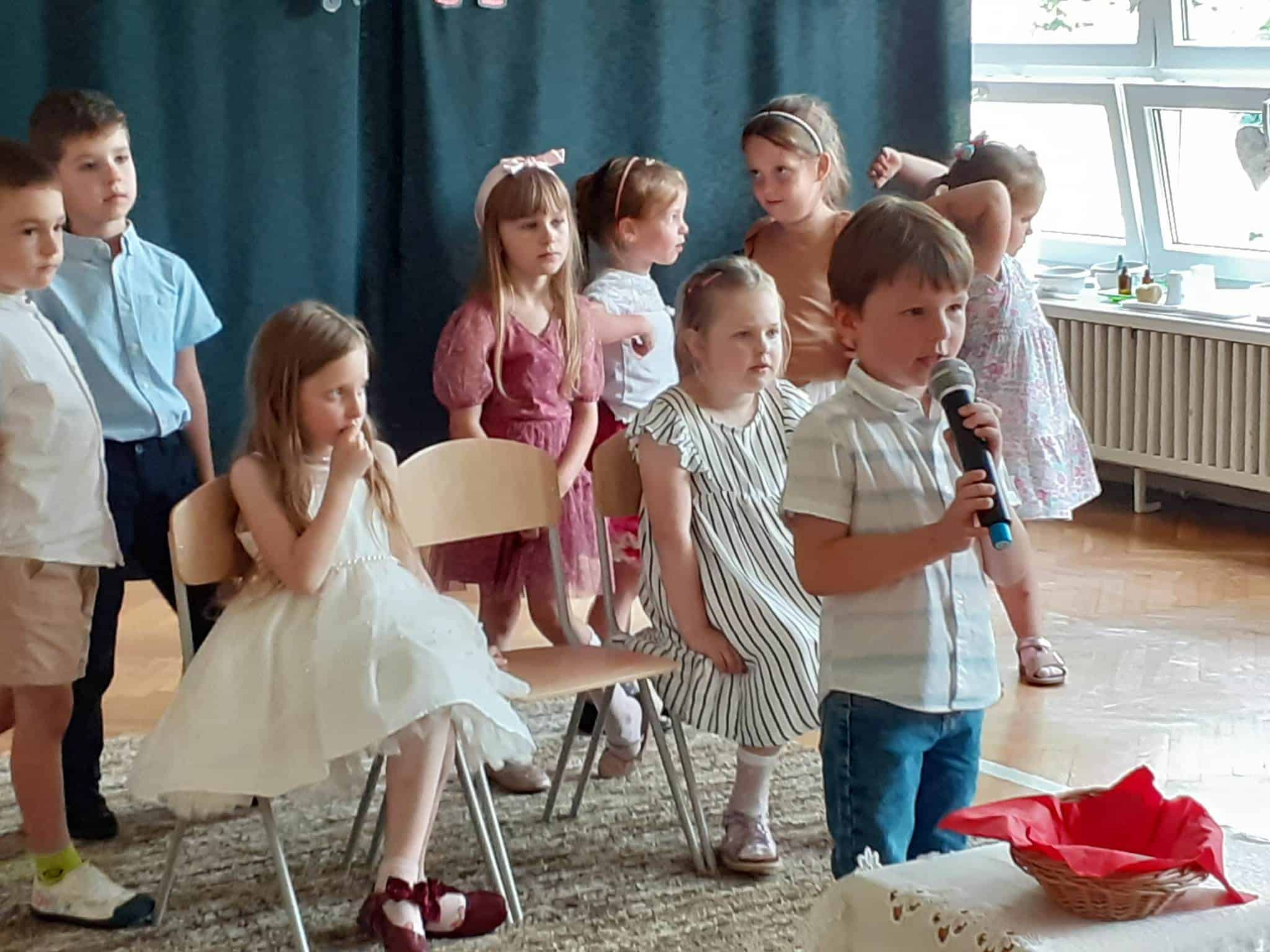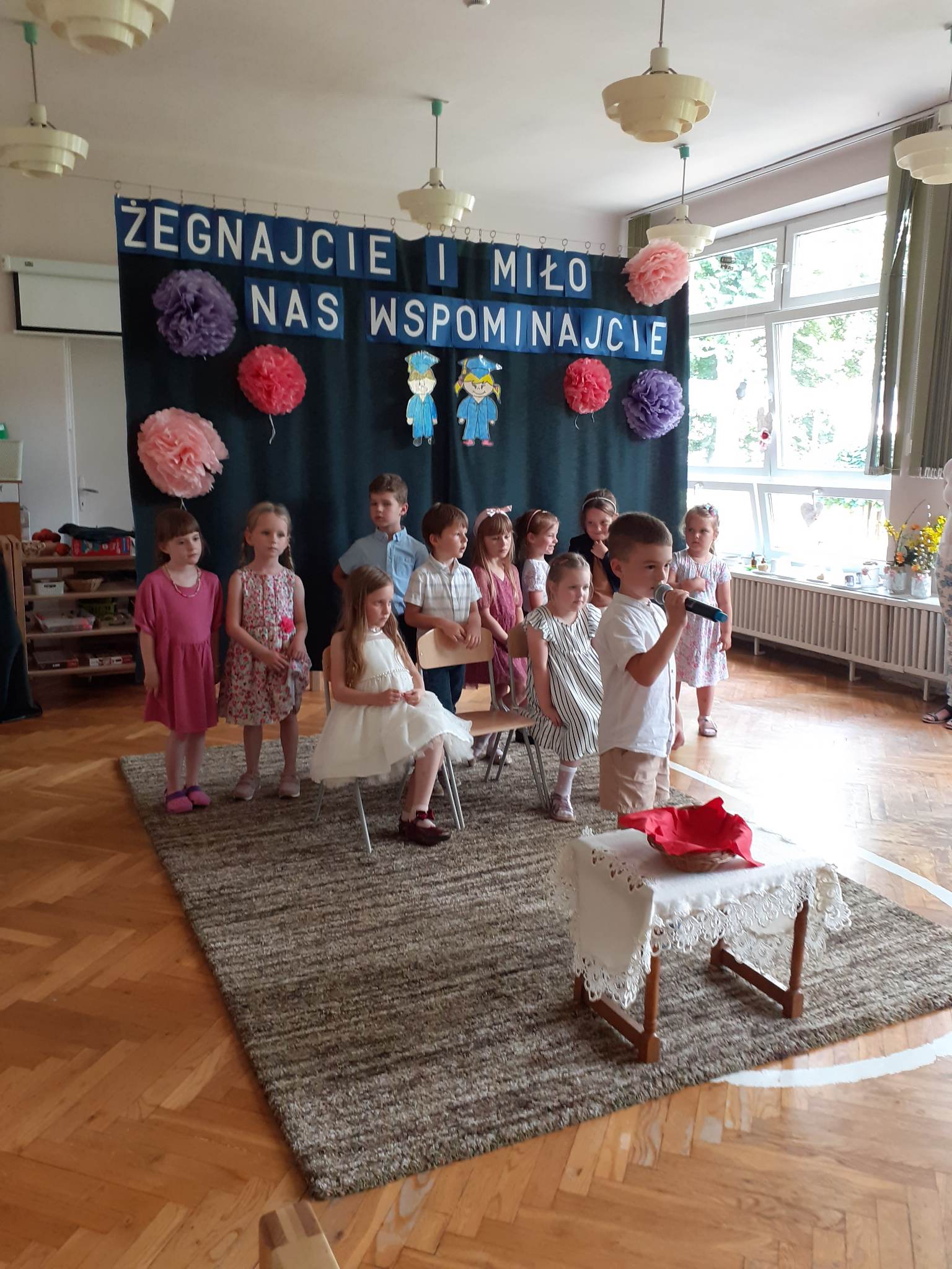 Następnie dzieci zaprezentowały przygotowany wcześniej montaż słowno-muzyczny. Starszaki, które po wakacjach już do nas nie wrócą, żegnały przedszkole piosenkami i wierszami, w których wspominały wszystkie przeżyte tu lata. Nie zabrakło też wypowiedzi dzieci młodszych, które w swoim wystąpieniu, z żalem i tęsknotą w głosie, żegnały swoich starszych kolegów i koleżanki.