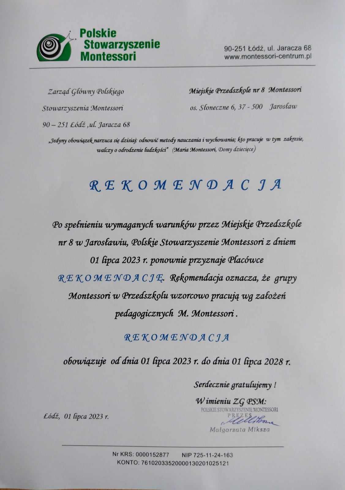 Mamy wielką przyjemność poinformować, iż 1 lipca 2023 roku, nasze przedszkole, a w nim nasza codzienna praca zawodowa, zaowocowała otrzymaniem ponownej, pięcioletniej, rekomendacji Polskiego Stowarzyszenia Montessori, jako podkreślenie wzorcowej realizacji założeń pedagogicznych Marii Montessori. DZIĘKUJEMY!