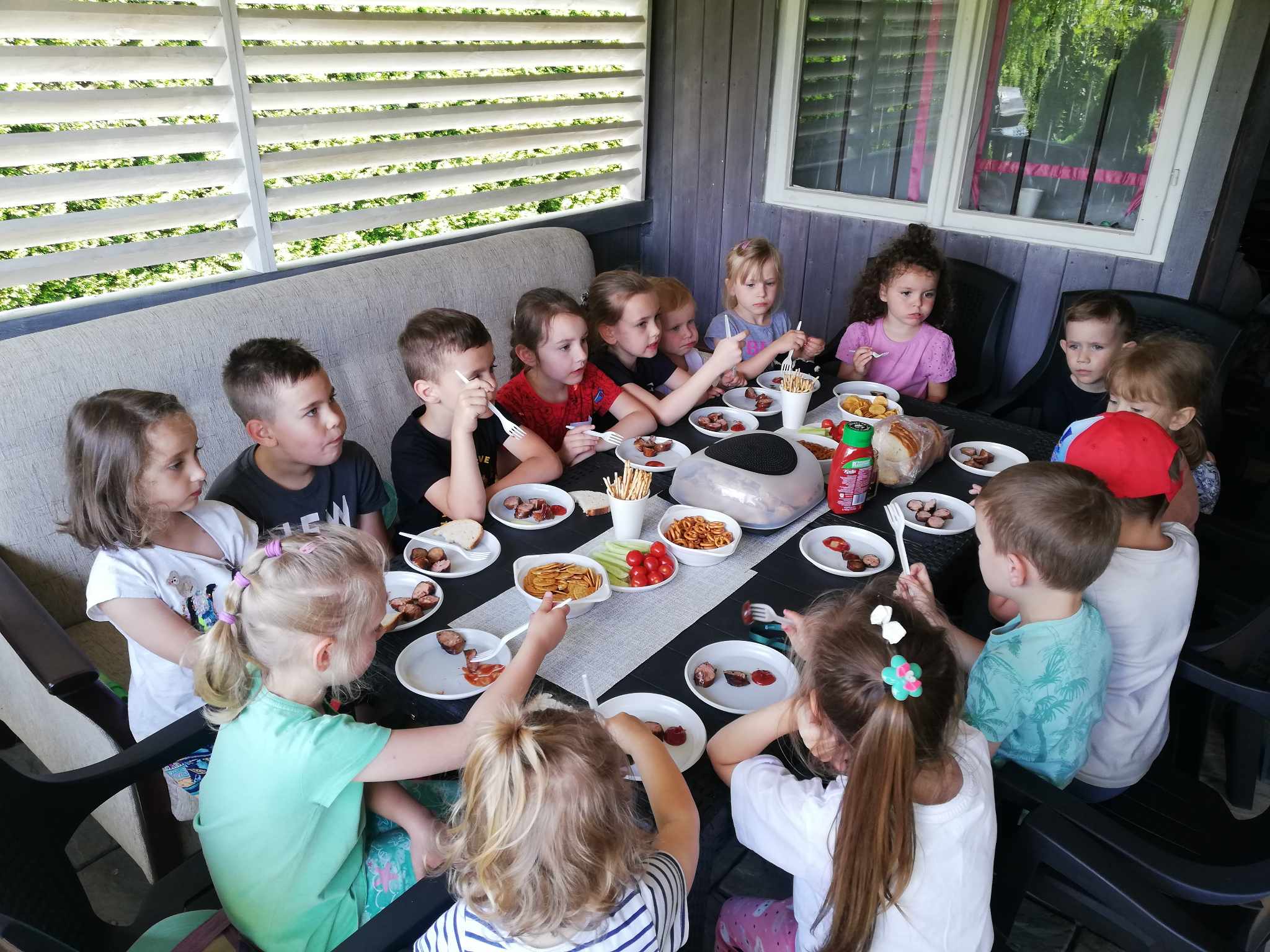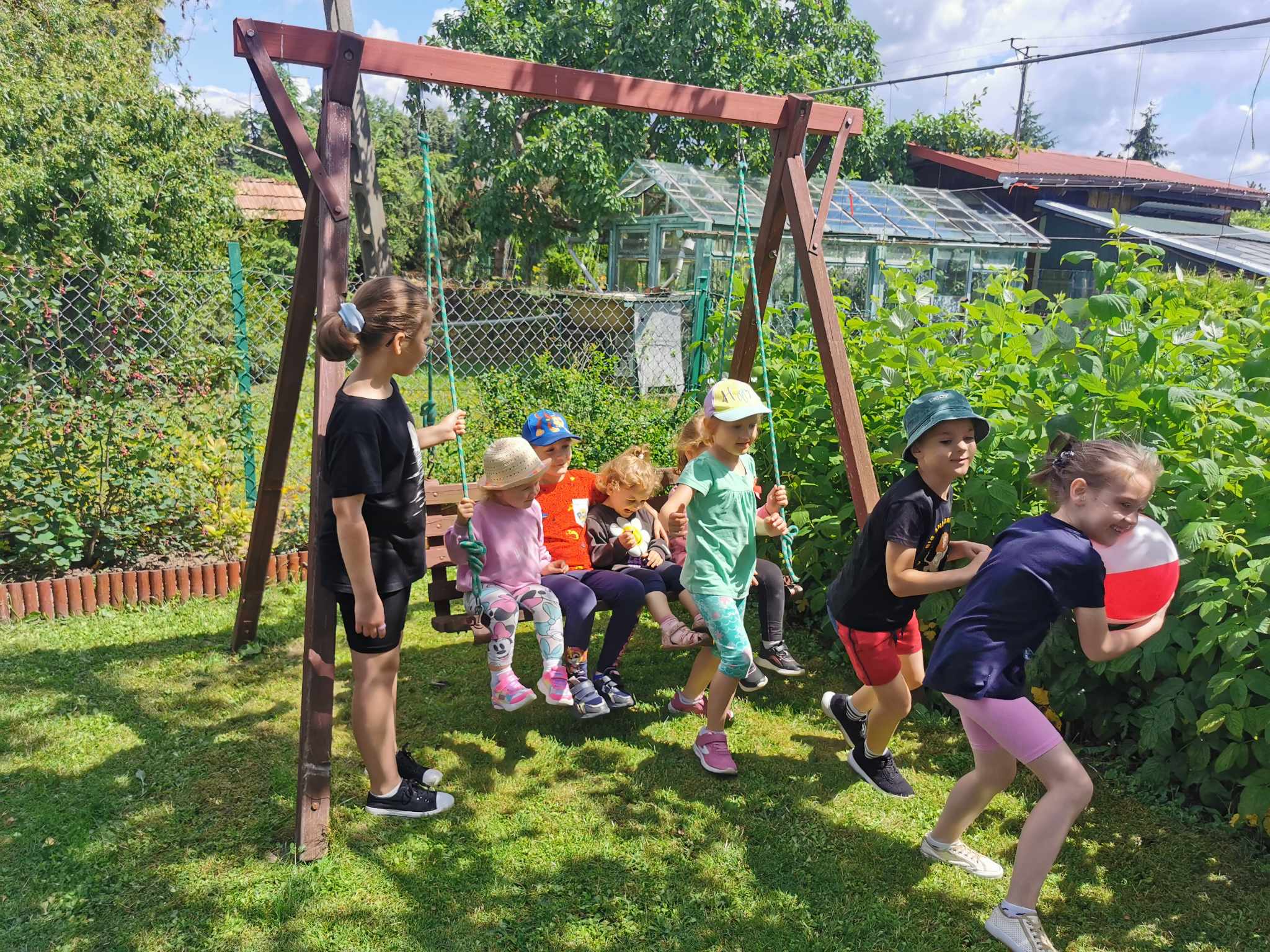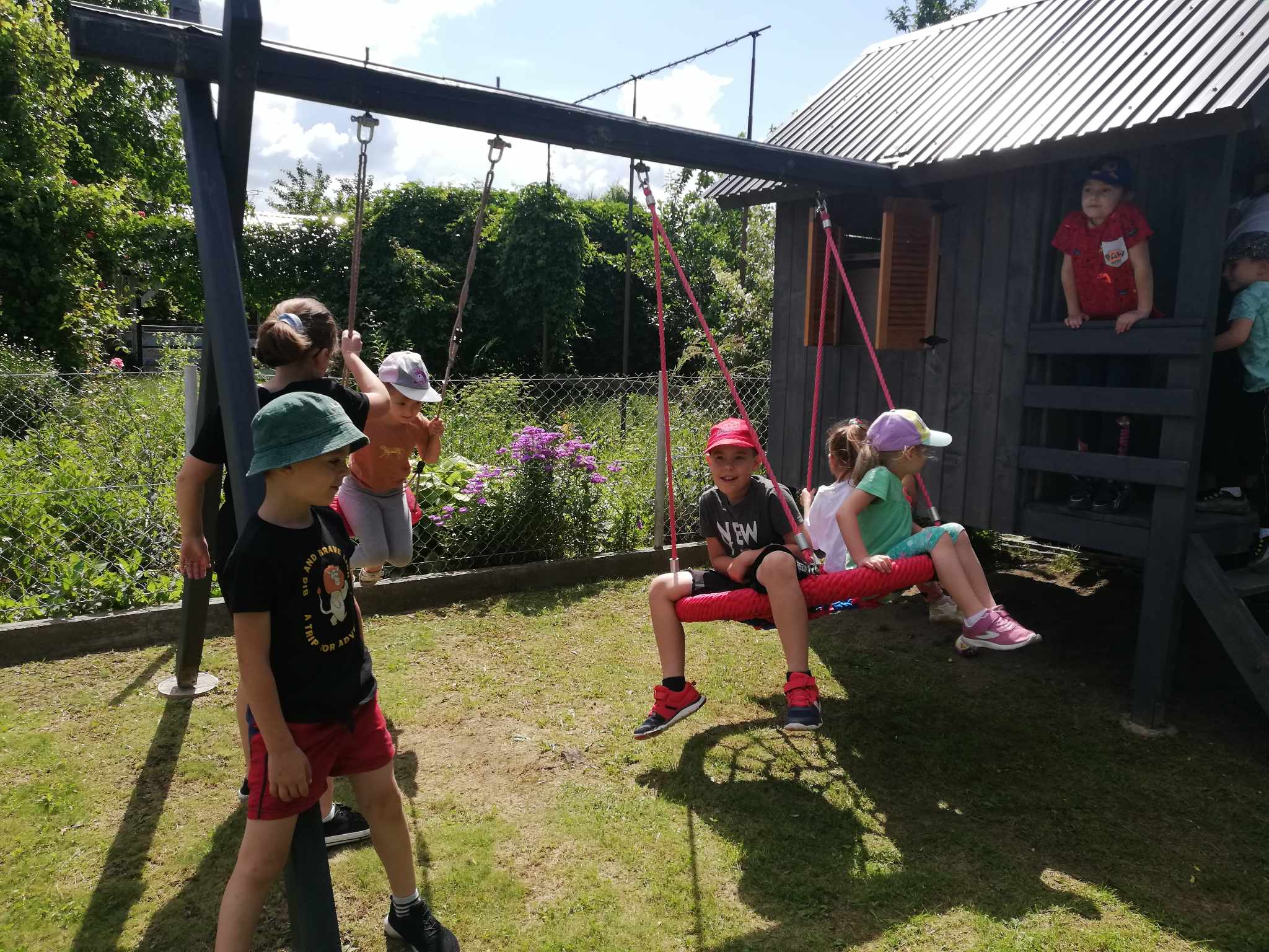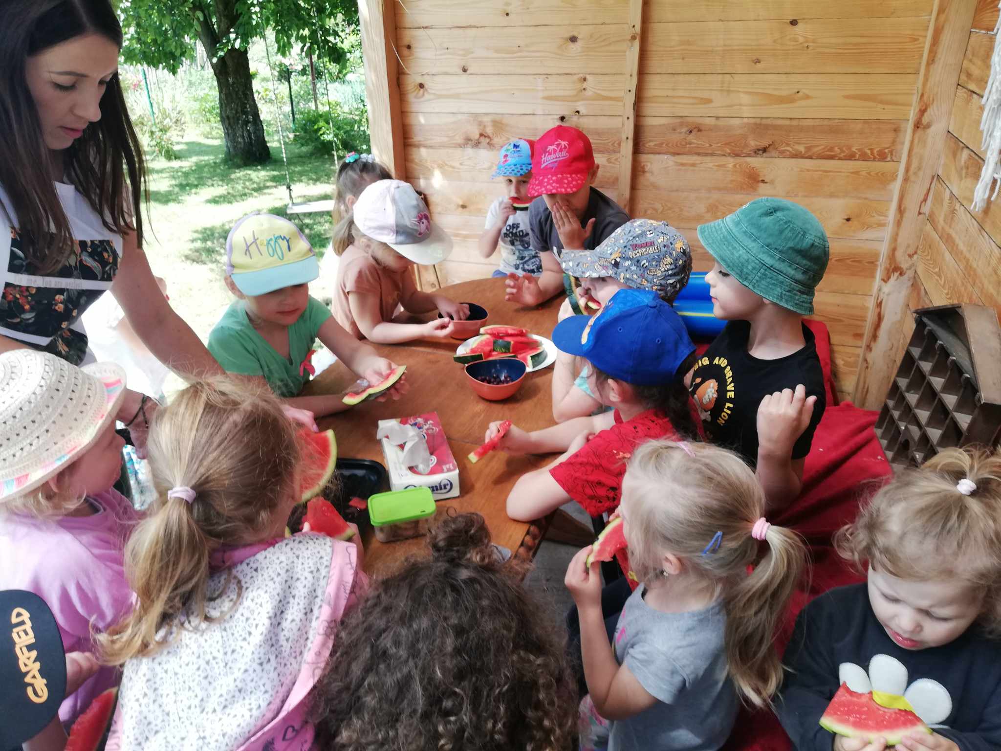 Korzystając z zaproszenia rodziców Madzi wybraliśmy się na pożegnalny piknik na działkę. Dziękujemy Pani Małgosi i Panu Maciejowi za przygotowanie wspaniałego pikniku, pyszną kiełbaskę, przekąski oraz wytworzenie wspaniałej atmosfery do wspólnej zabawy i spędzenia czasu na łonie przyrody. Dziękujemy również rodzicom i dziadkom Ninki, którzy mają po sąsiedzku swoje działki, na które nas również zaprosili. Przedszkolaki zajadały tam pyszne owoce oraz słuchały opowieści Pani Marysi na temat upraw na działce.
