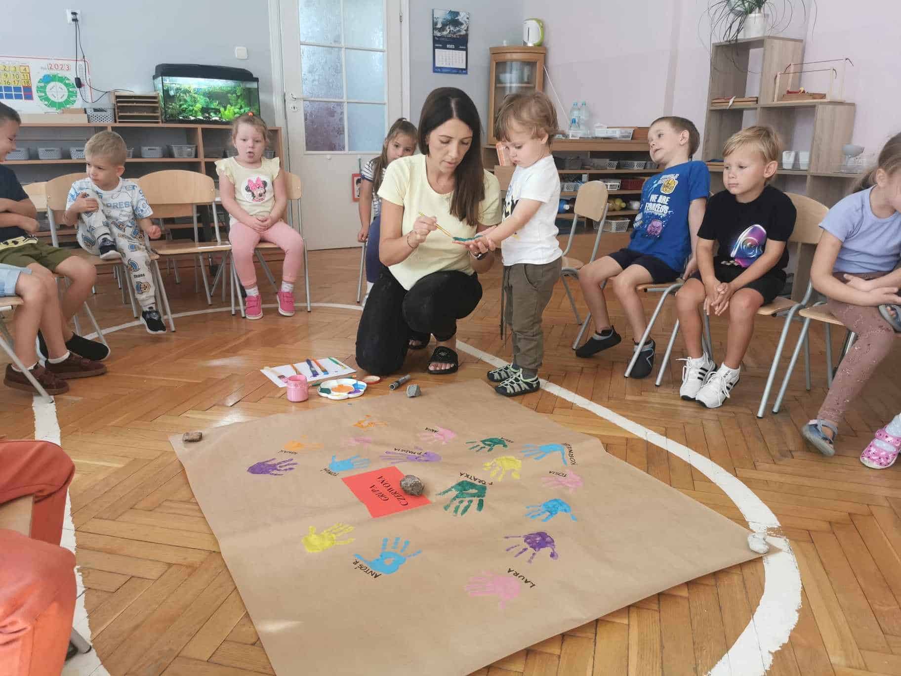 Kształtowanie w dziecku poczucia przynależności do grupy jest bardzo ważne. Daje poczucie bezpieczeństwa i stabilności. Aby to dzieciom zobrazować stworzyliśmy plakat „Serce grupy Czerwonej”. Narysowałam na dużym arkuszu szarego papieru ogromne serce. W jego wnętrzu każdy przedszkolak odbijał pomalowaną farbą dłoń. Swoje dłonie odbiły również pani Dyrektor, panie pracujące w grupie oraz pani Gosia – sekretarka, która często odwiedza naszą grupę i dzieci ją dobrze znają. Przez to działanie dzieci uświadomiły sobie, że stanowią ważną część naszej grupy i całego przedszkola.