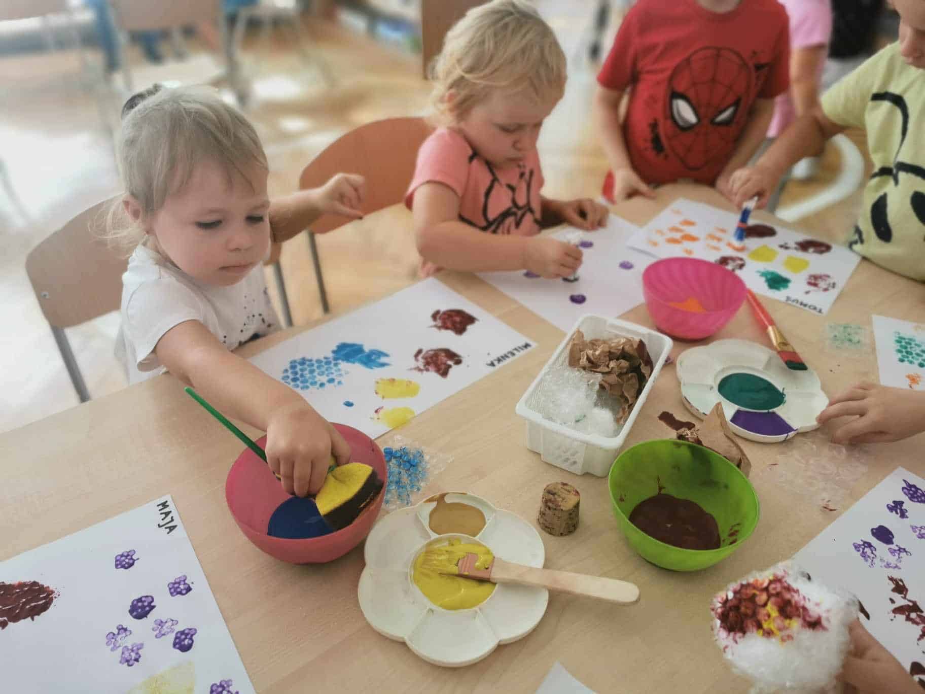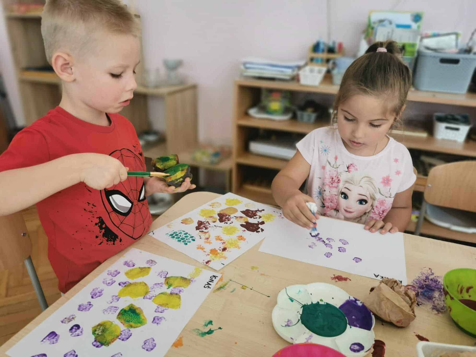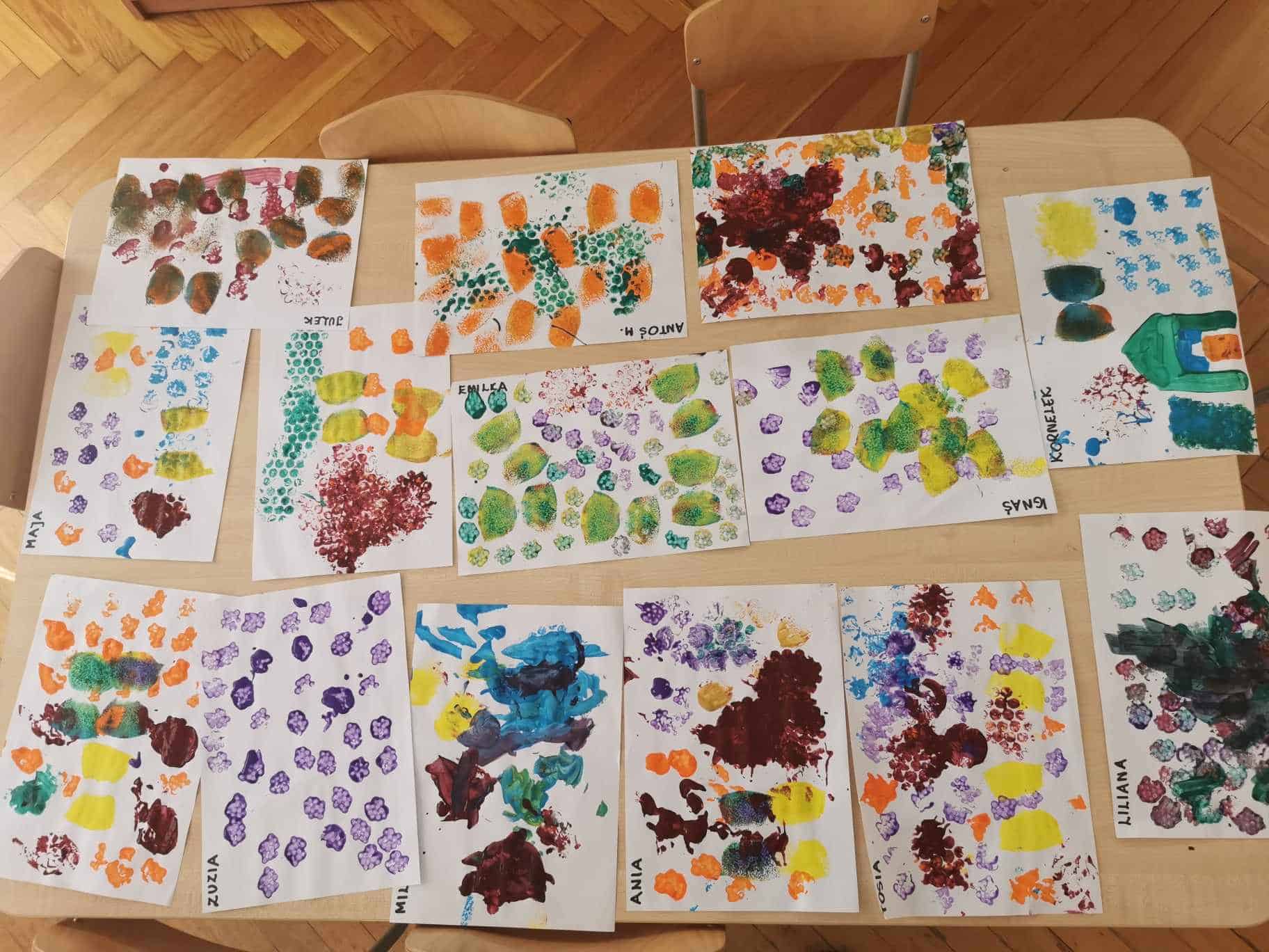Na zajęciach wykorzystaliśmy do stemplowania: korek, folię bąbelkową drobną i grubą, patyczki do uszu, szary papier oraz gąbkę. To były bardzo kreatywne zajęcia. Technikę stemplowania warto wykorzystać gdy mamy młodsze dzieci i ich umiejętności nie są na wysokim poziomie. Stemplowanie każdemu się uda, dlatego dziecko odczuwa satysfakcję z wykonanego zadania.