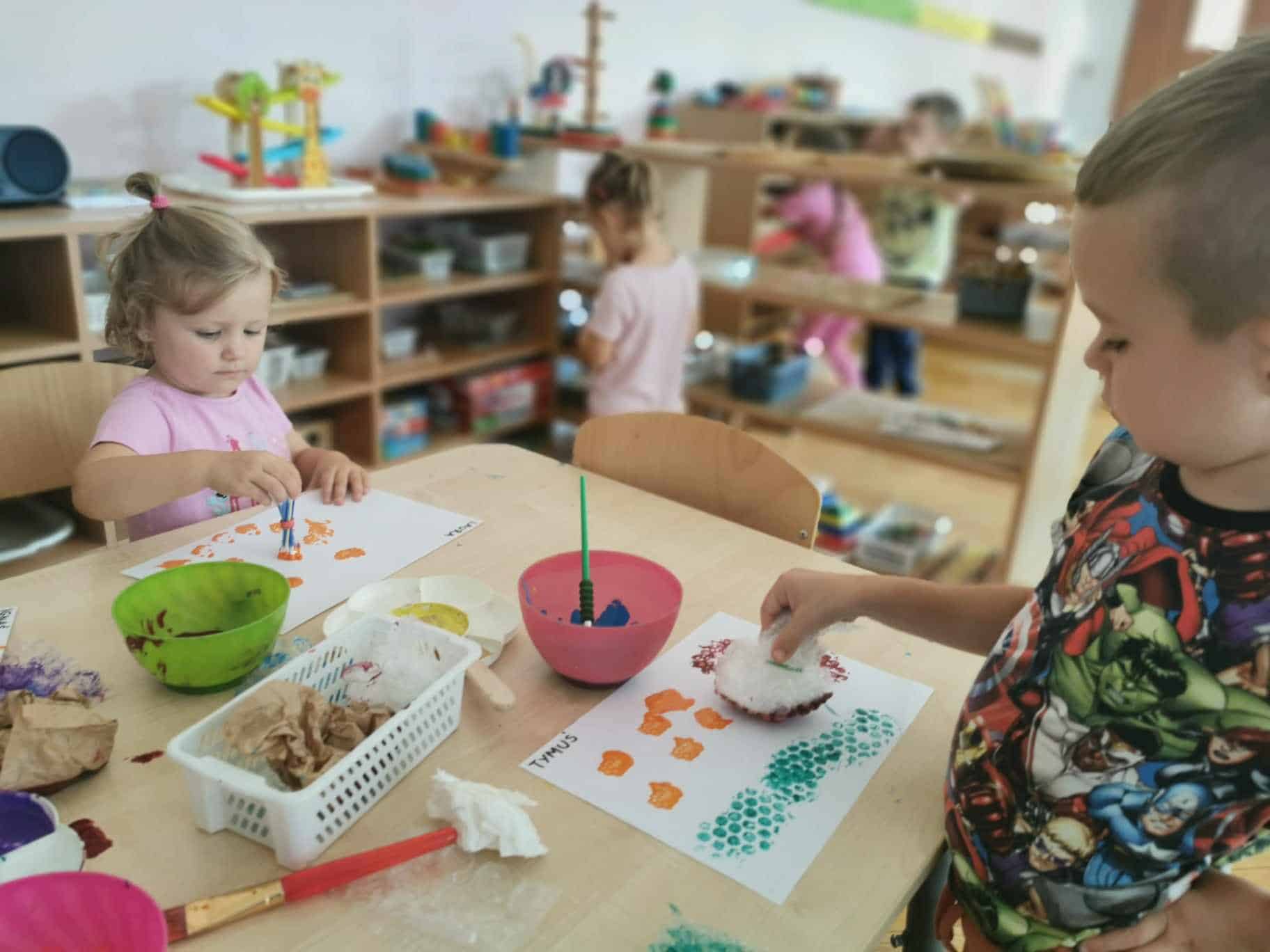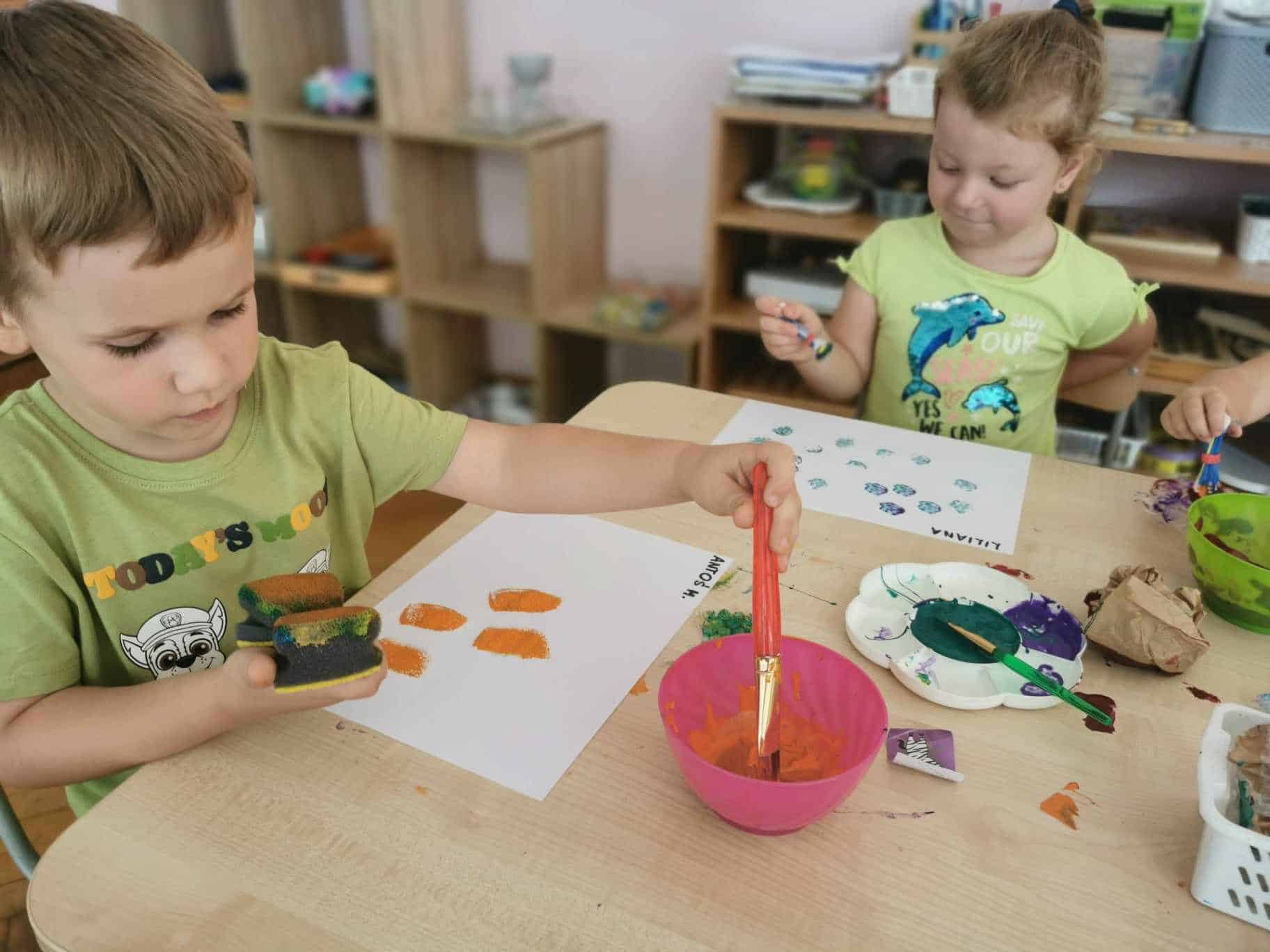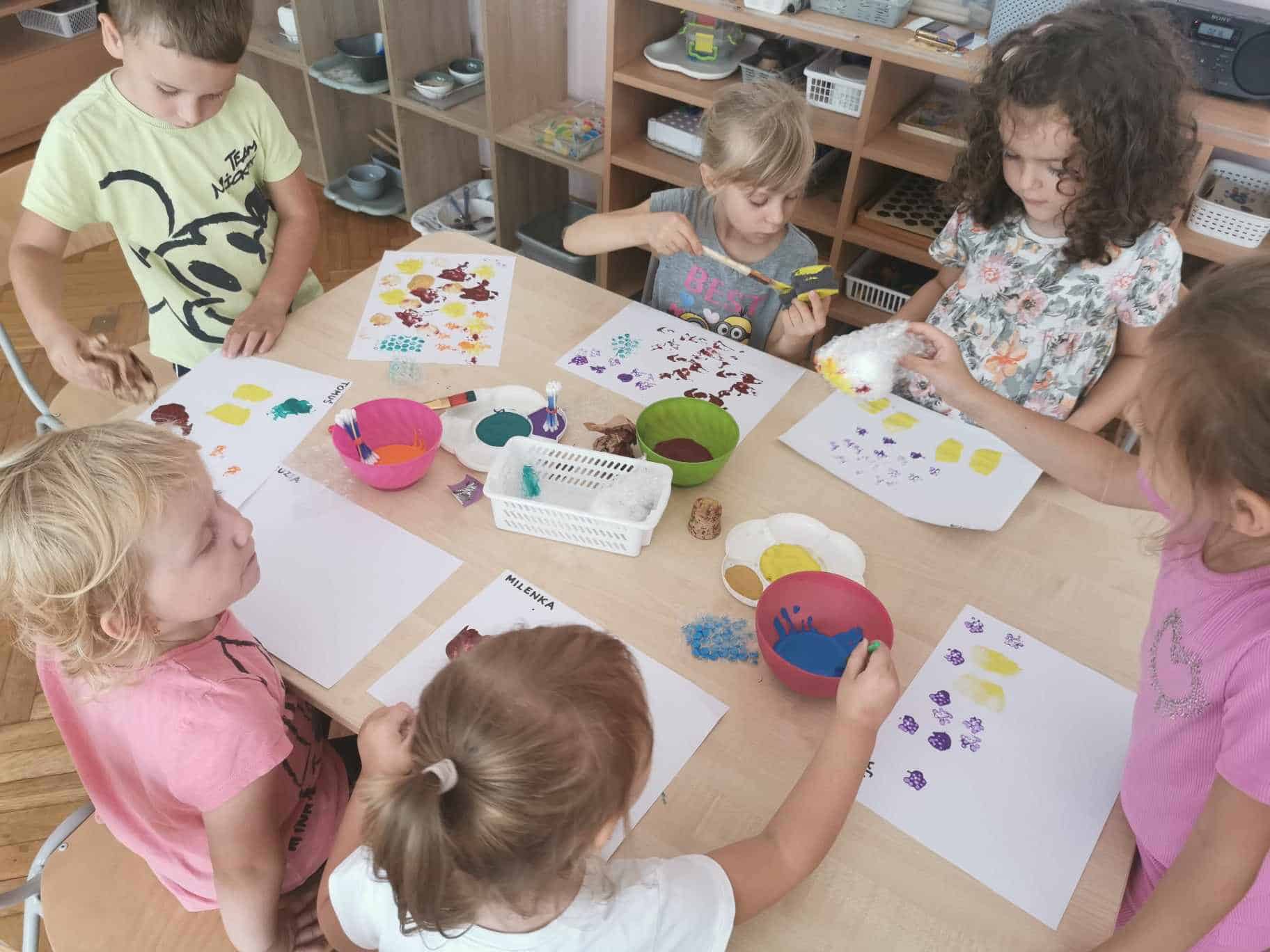 Na zajęciach wykorzystaliśmy do stemplowania: korek, folię bąbelkową drobną i grubą, patyczki do uszu, szary papier oraz gąbkę. To były bardzo kreatywne zajęcia. Technikę stemplowania warto wykorzystać gdy mamy młodsze dzieci i ich umiejętności nie są na wysokim poziomie. Stemplowanie każdemu się uda, dlatego dziecko odczuwa satysfakcję z wykonanego zadania.