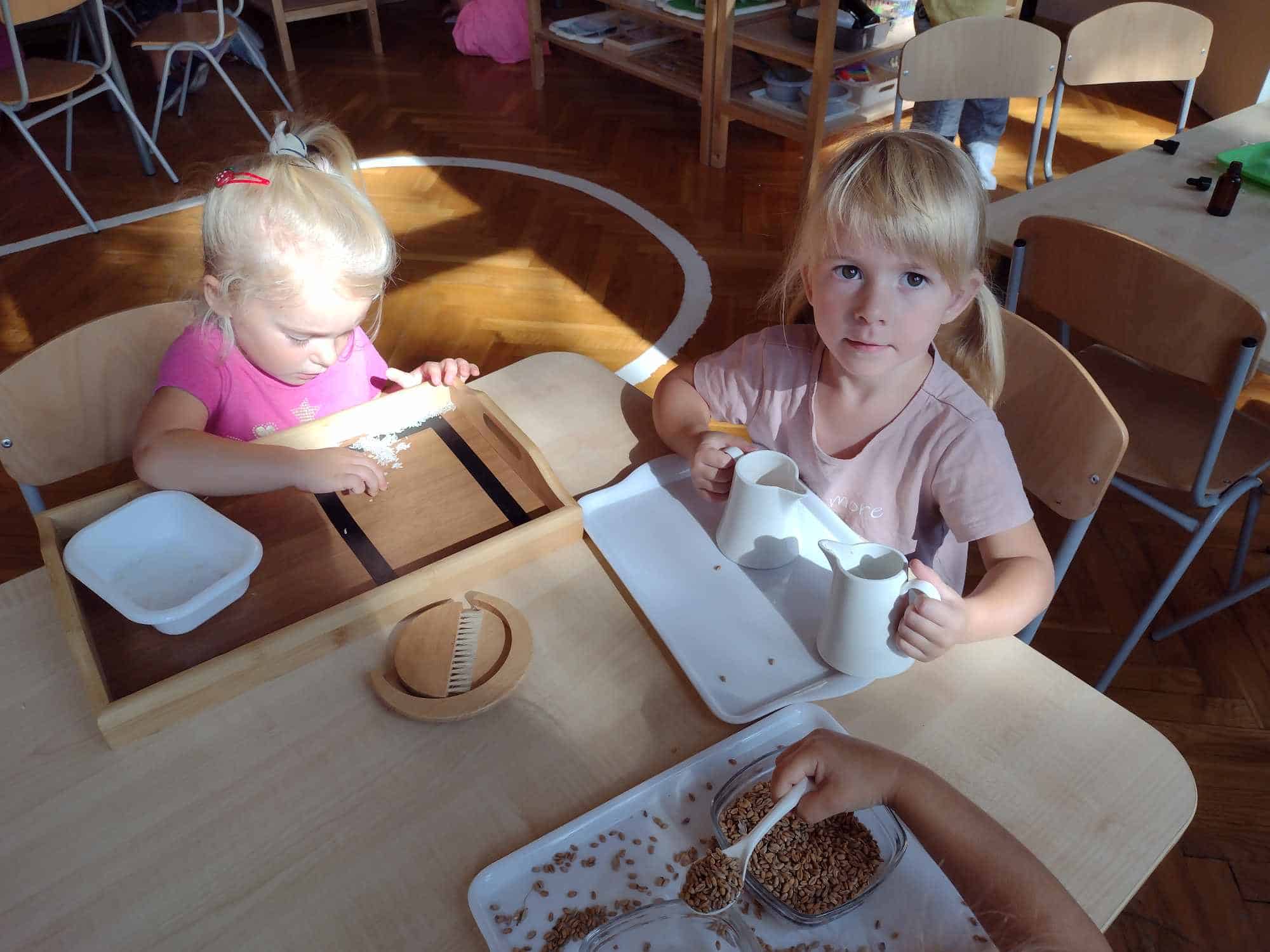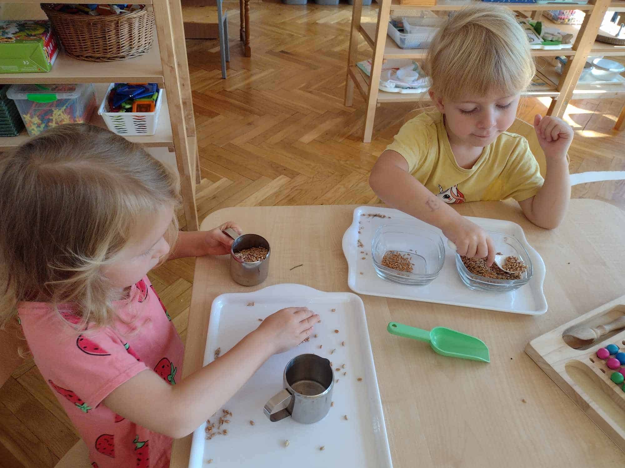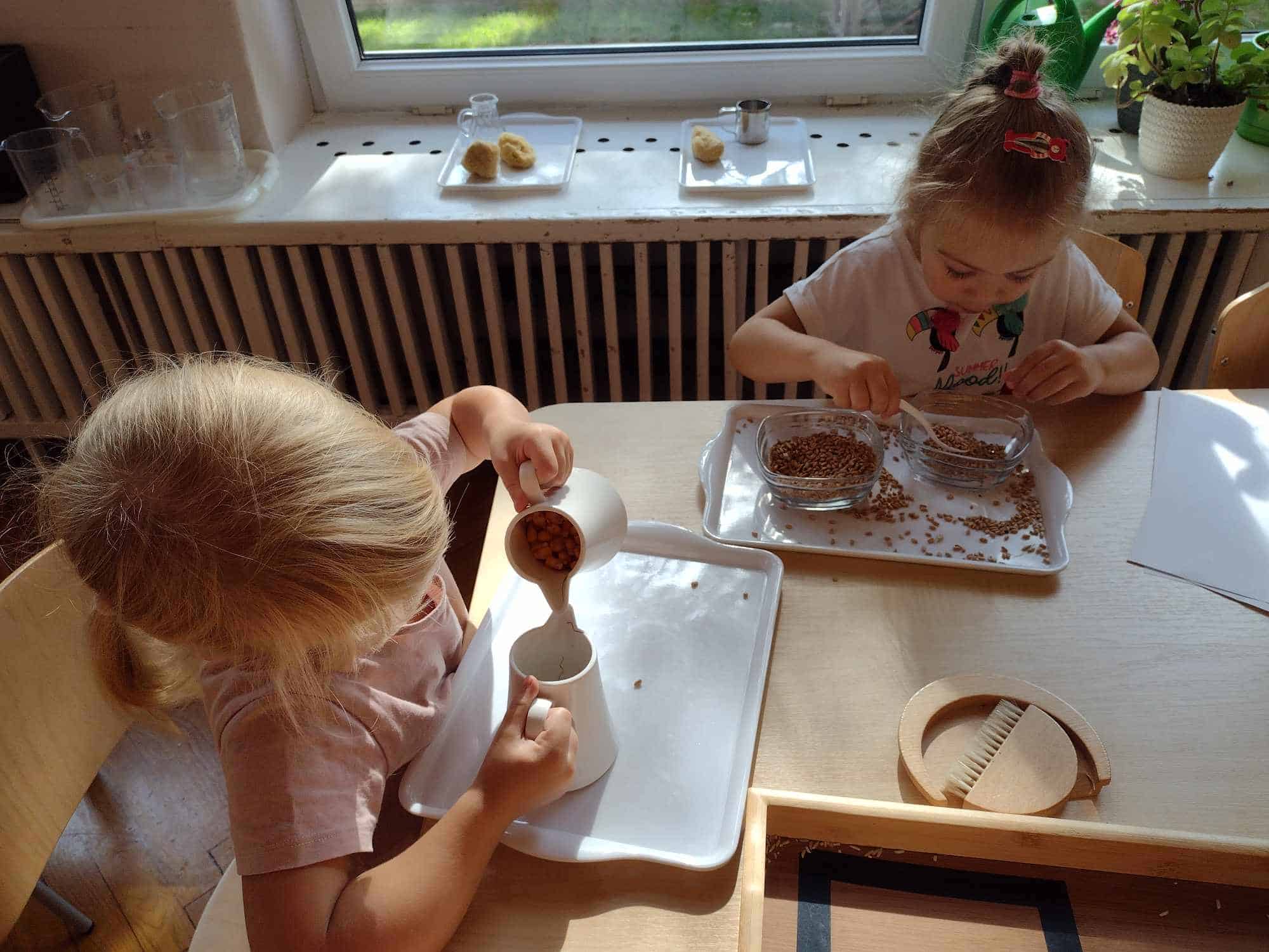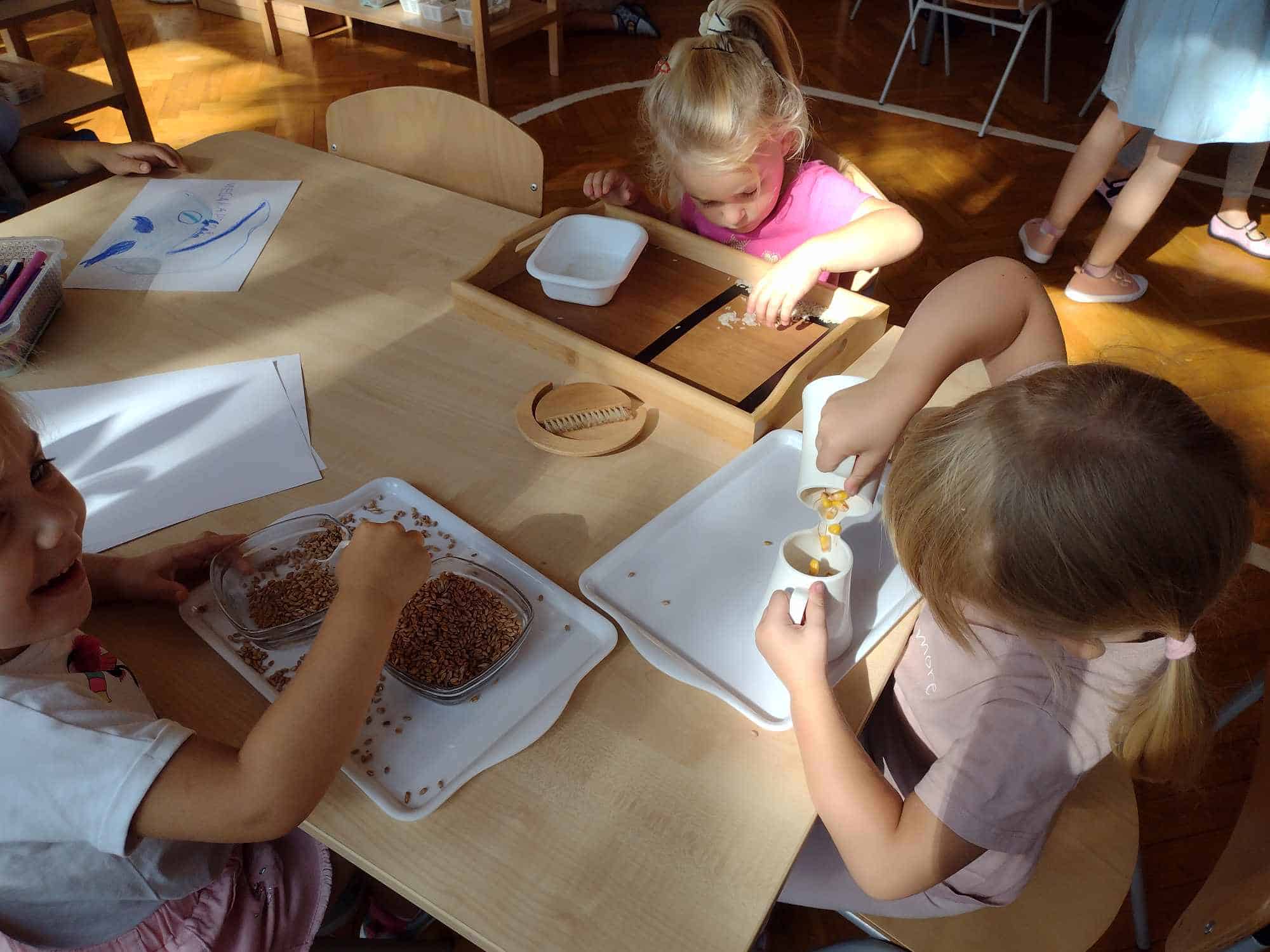 Wszelkie ziarna są doskonałym materiałem do doskonalenia czynności dnia praktycznego, które wspaniale rozwijają koordynację ruchową motoryki małej (która jest ściśle związana z przygotowaniem ręki do pisania), koncentrację uwagi, precyzję, a także pomagają osiągnąć samodzielność. Te ćwiczenia najbardziej wciągnęły najmłodszych członków naszej grupy.