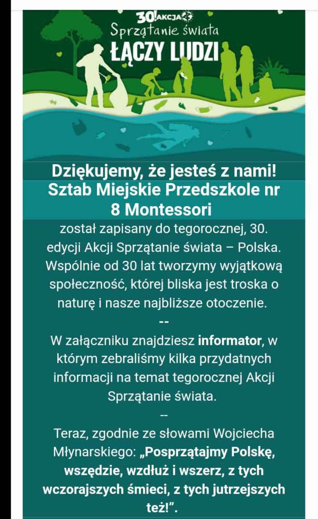 W piątek, 15 września, dzieci z naszego przedszkola wyposażone w rękawiczki oraz worki na smieci, włączyły się do tegorocznej, 30 edycji Akcji Sprzątania Świata – Polska. Wyjście na poszukiwanie śmieci w najbliższej okolicy przedszkola, poprzedzone było lekcją dotyczącą dbania o środowisko i segregacji odpadów. Bystre oczy naszych podopiecznych wytrwale wyszukiwały nawet najmniejsze kawałki odpadów, które trafiły do worków przekazanych przez Urząd Miasta Jarosławia. Sprzątanie Świata łączy ludzi! Brawo mali pomocnicy przyrody! 🏆 🌲 🌳 👍