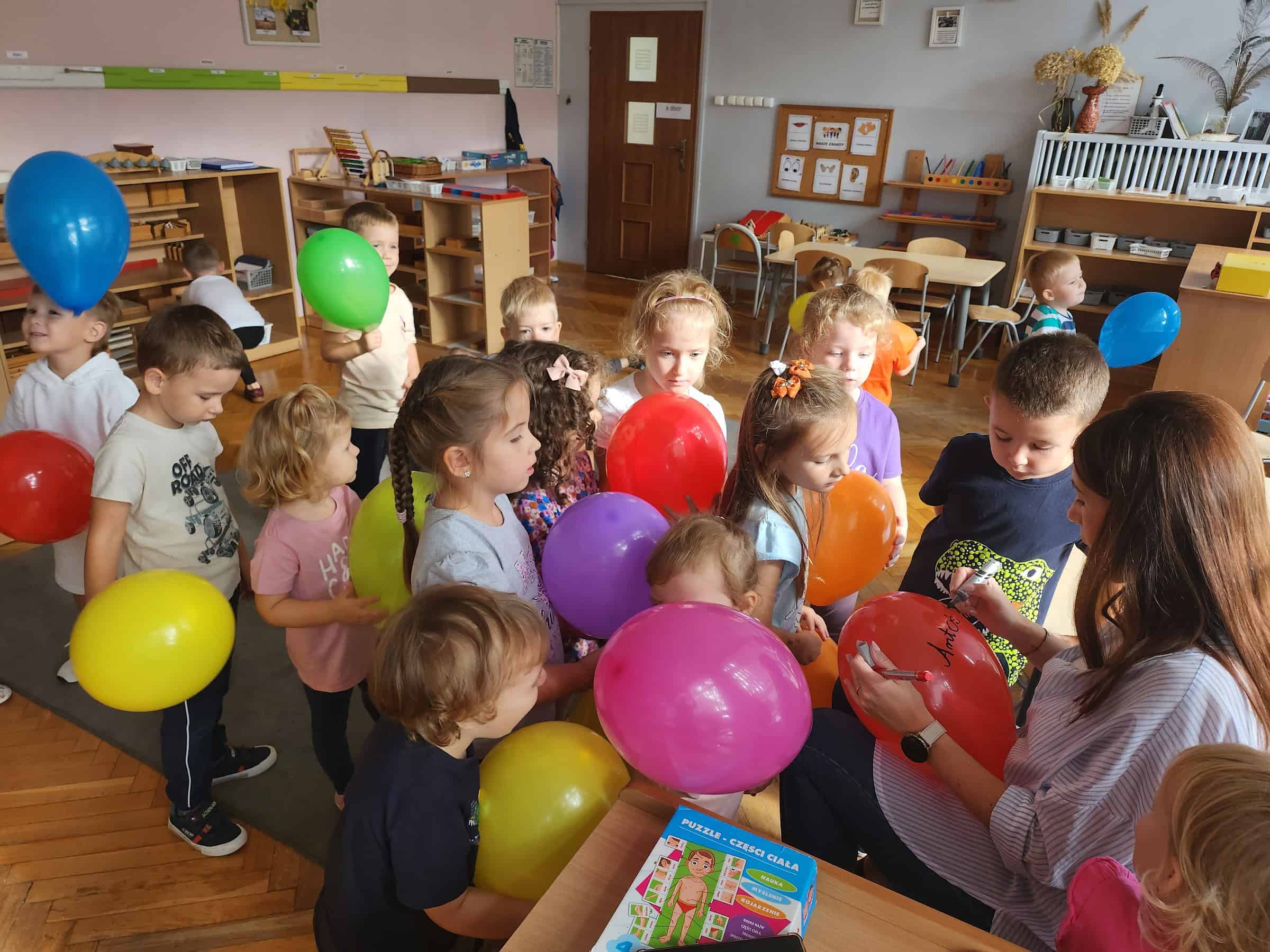 Ten dzień był dla naszych przedszkolaków pełen pozytywnych wrażeń. Tańczyliśmy do znanych dziecięcych przebojów, bawiliśmy się z chustą animacyjną, były również tańce z balonami i słodko – owocowy poczęstunek. Podpisane baloniki przedszkolaki zabrały ze sobą do domu.